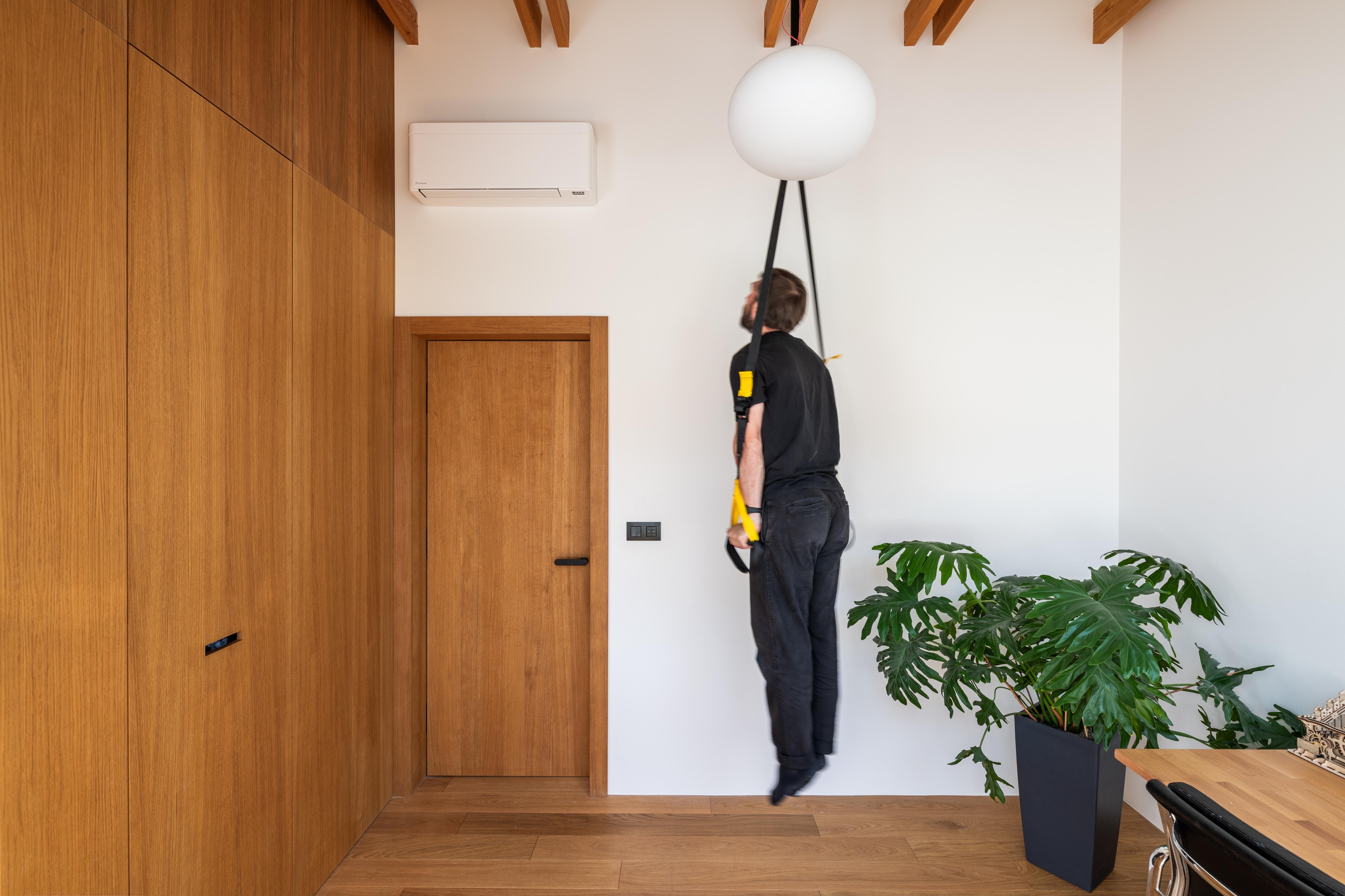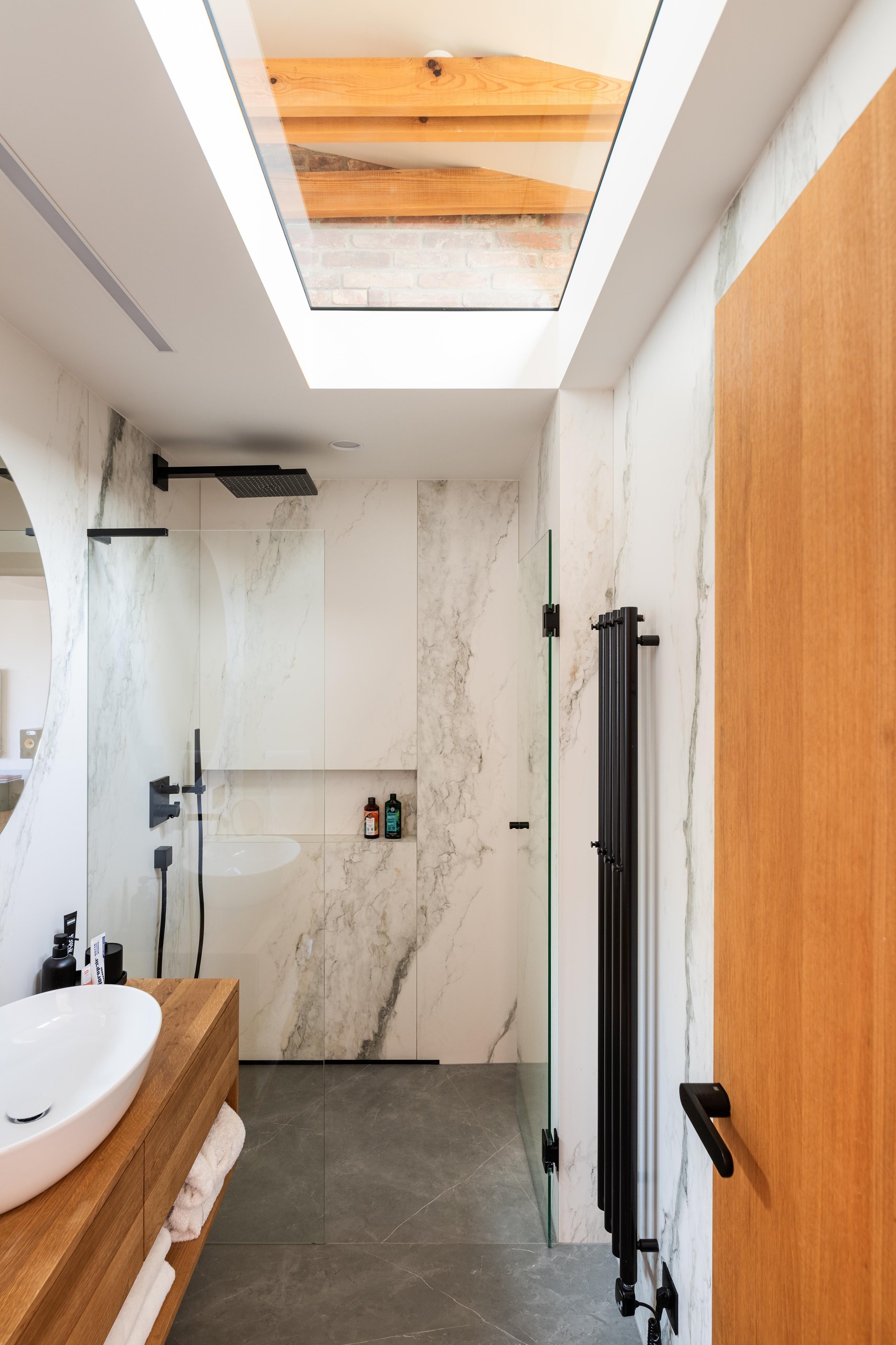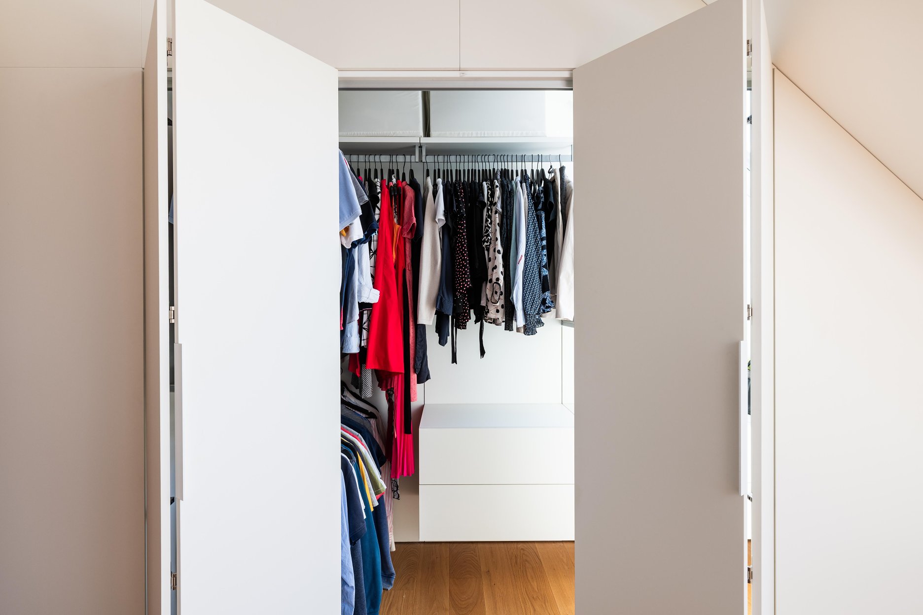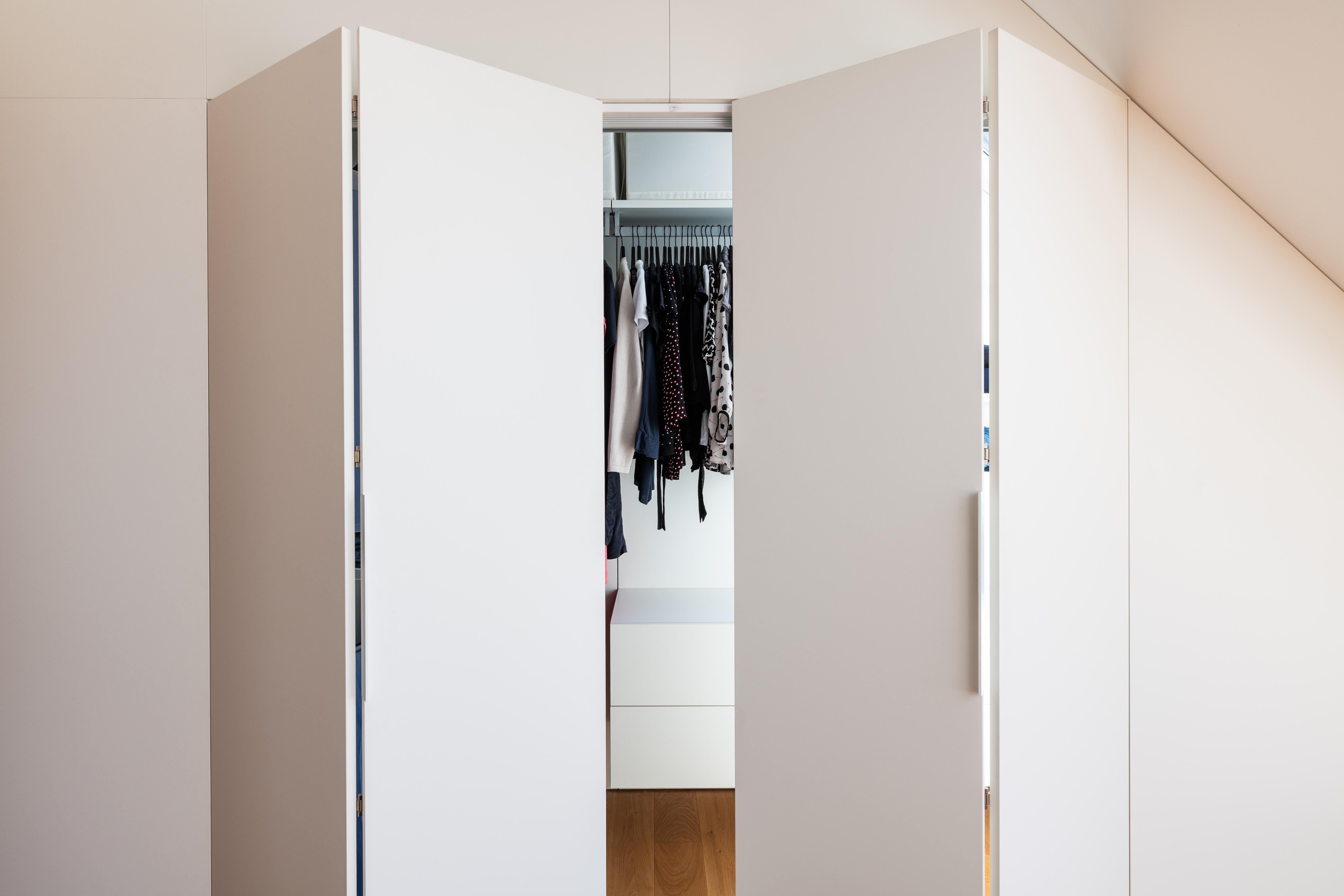 (2) Na dosiahnutie parametrov a atmosféry podkrovného bytu bolo potrebné odstrániť pôvodné sadrokartónové podhľady a odhaliť časť krovu. Železobetónový strop nad východnou časťou bytu limituje jeho svetlú výšku, ale vďaka vysokej, otvorenej centrálnej časti dostáva hlavný obytný priestor potrebný objem a optickú vzdušnosť.