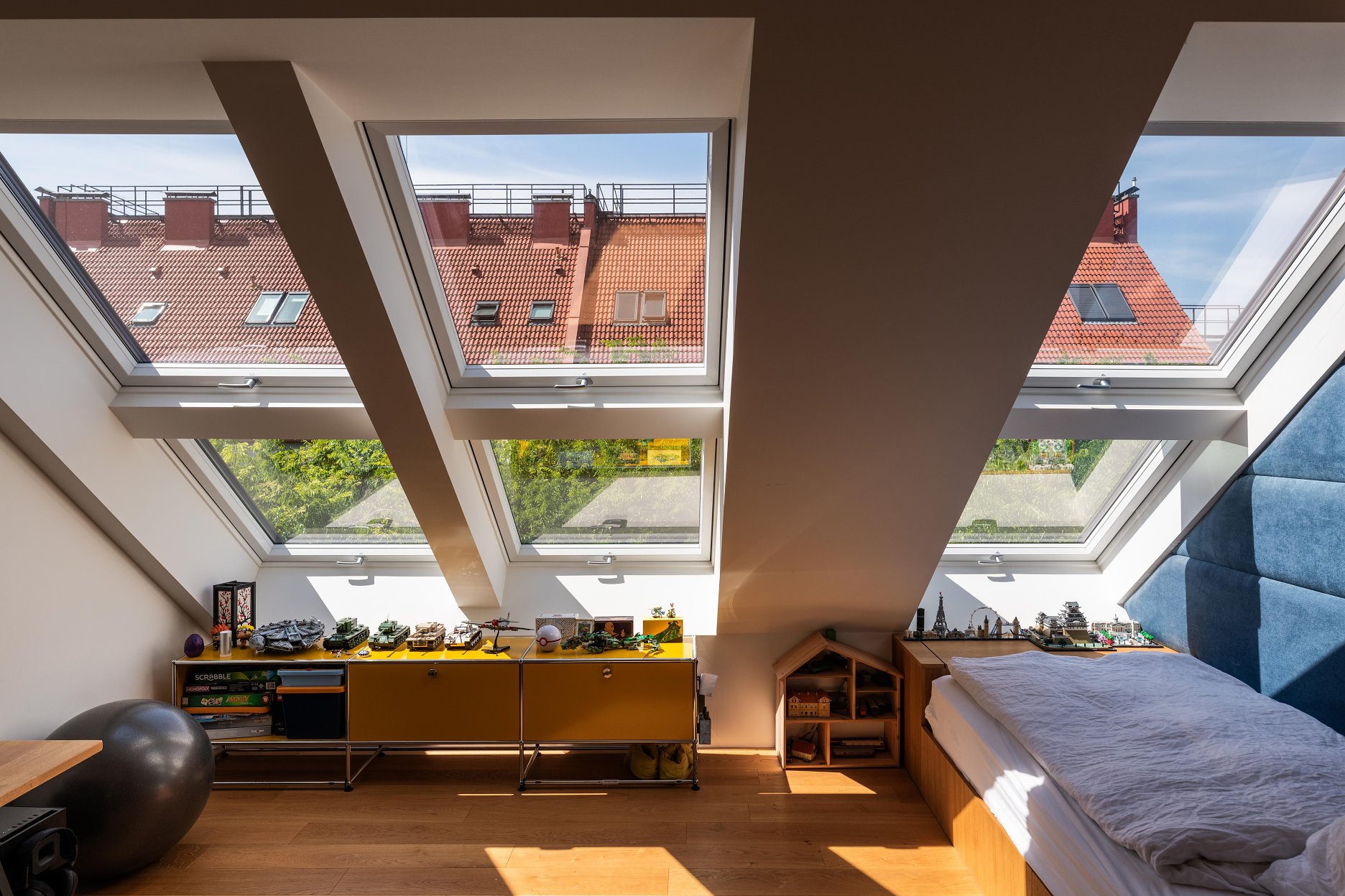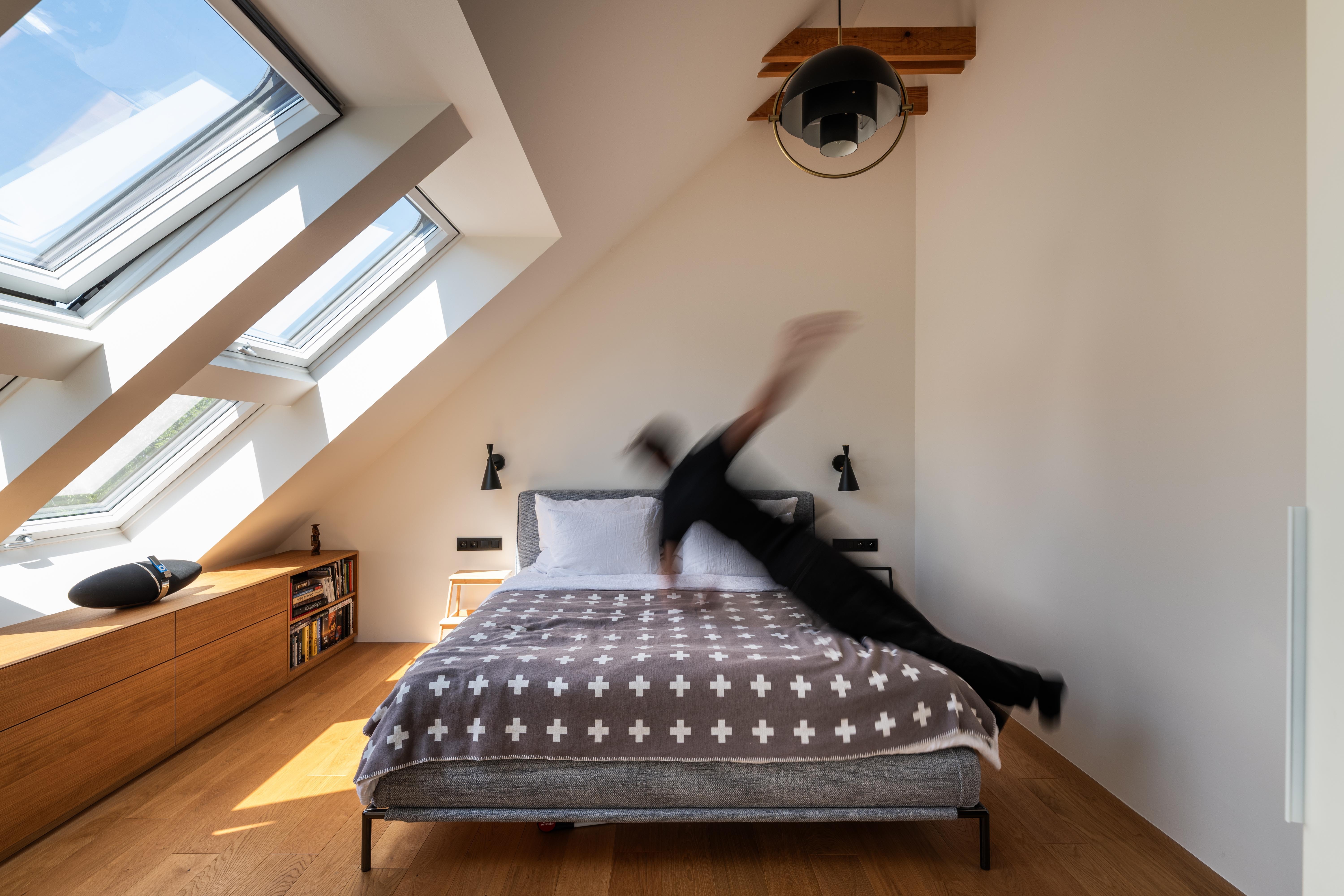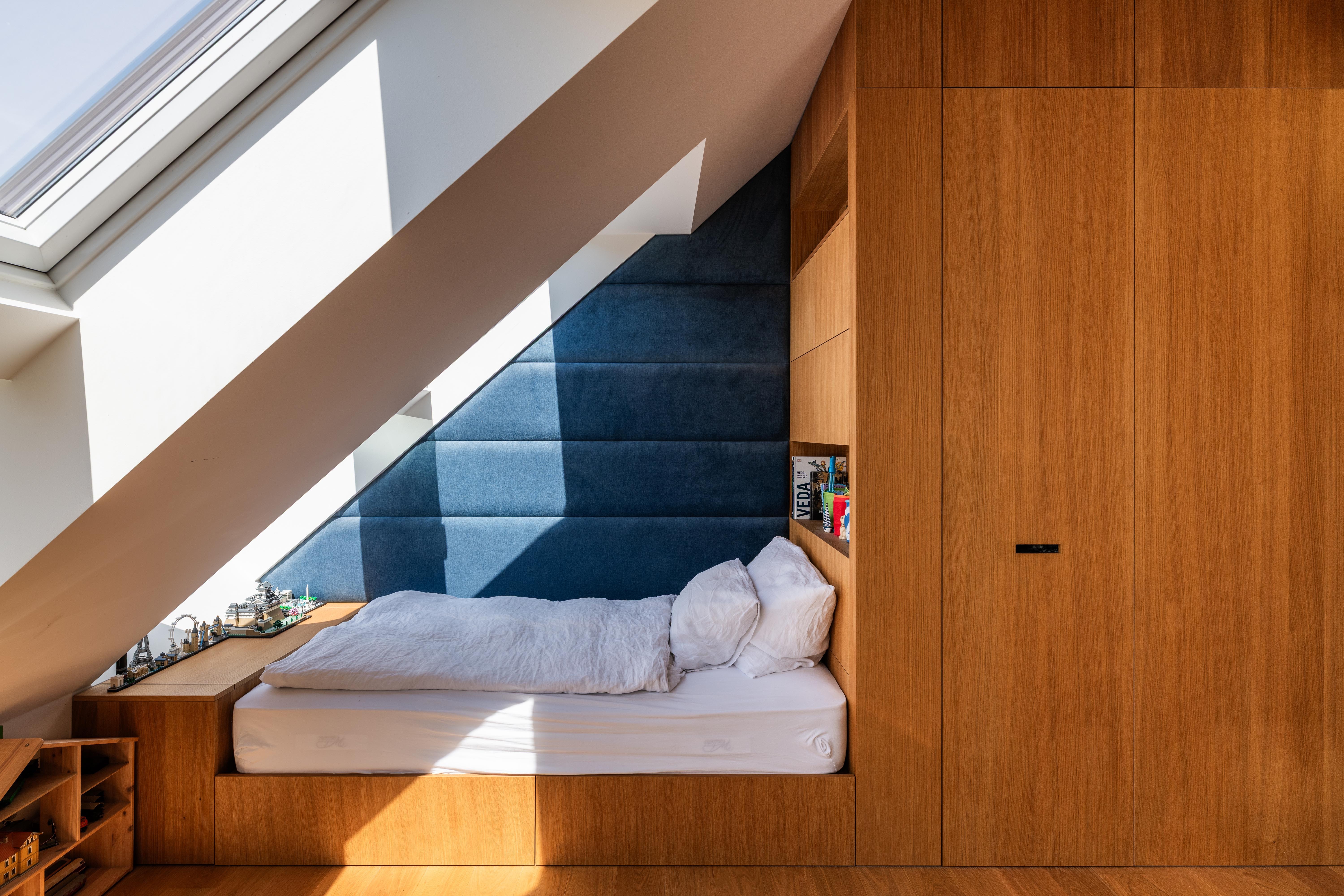 (4) Byt je počas celého dňa presvetlený prirodzeným denným svetlom. Do šikmej strechy boli doplnené strešné okná, ktoré privádzajú svetlo do hĺbky dispozície. Do stropu kúpeľne je vložený pochôdzny svetlík, ktorý do nej prepúšťa svetlo spod strechy. Svetelná atmosféra v byte sa počas roka prirodzene mení, využívajúc výhodu strešnej polohy.
