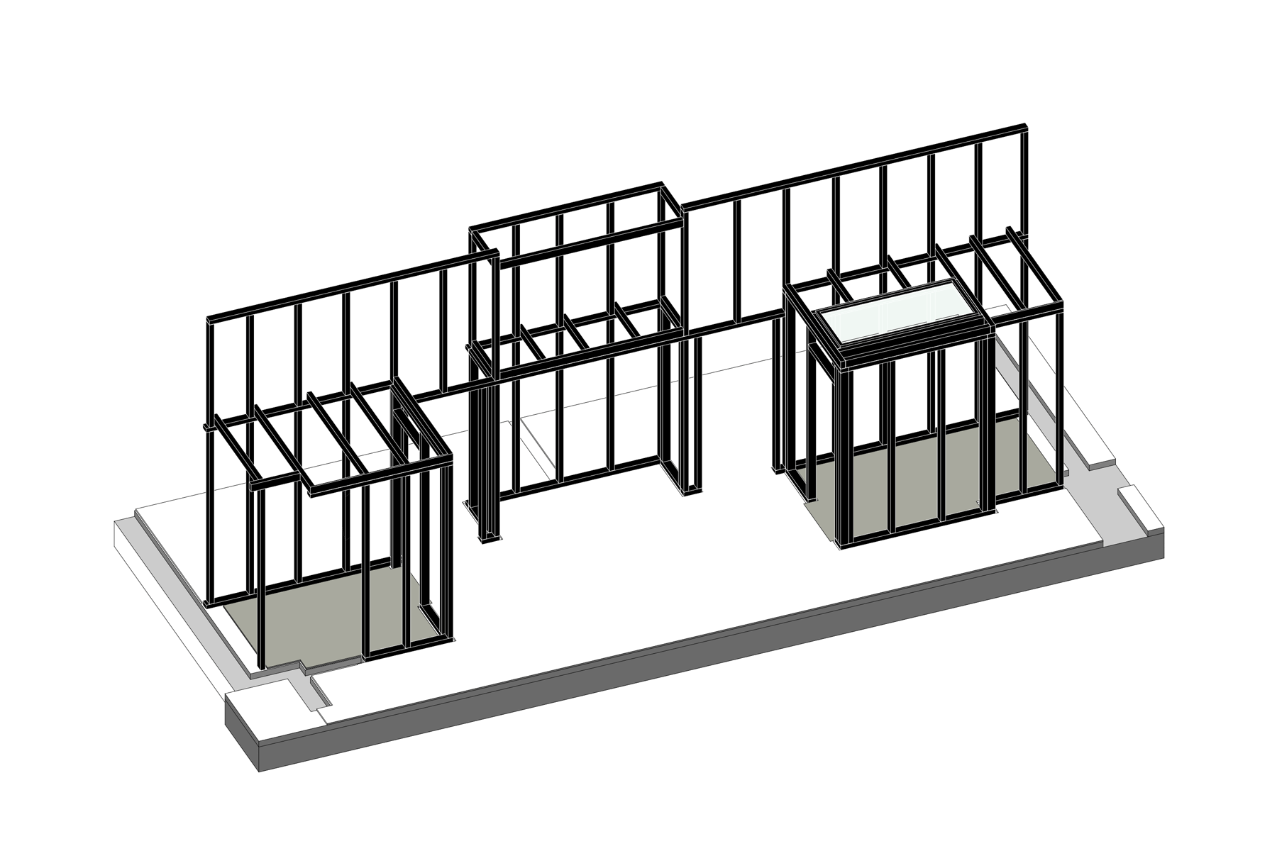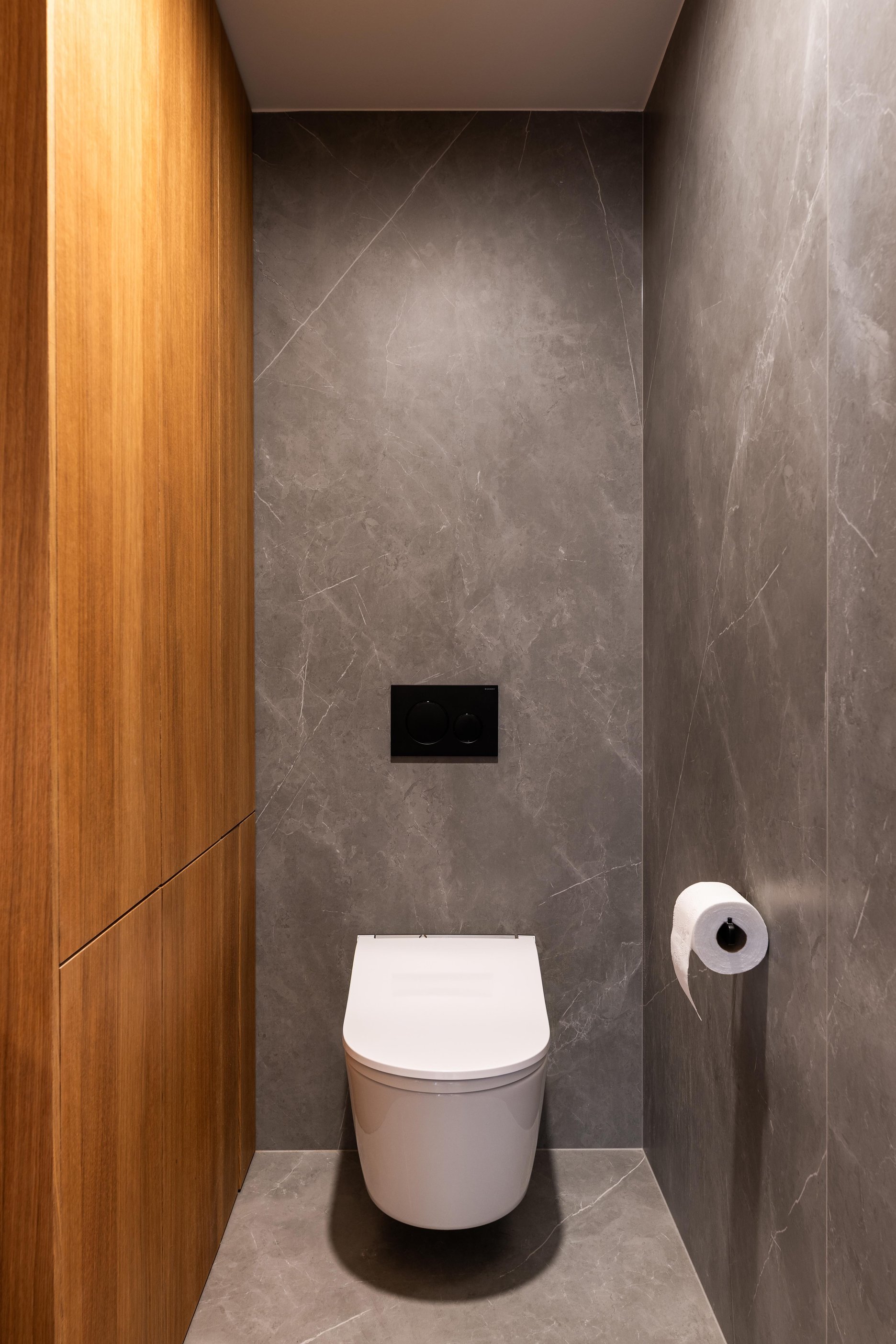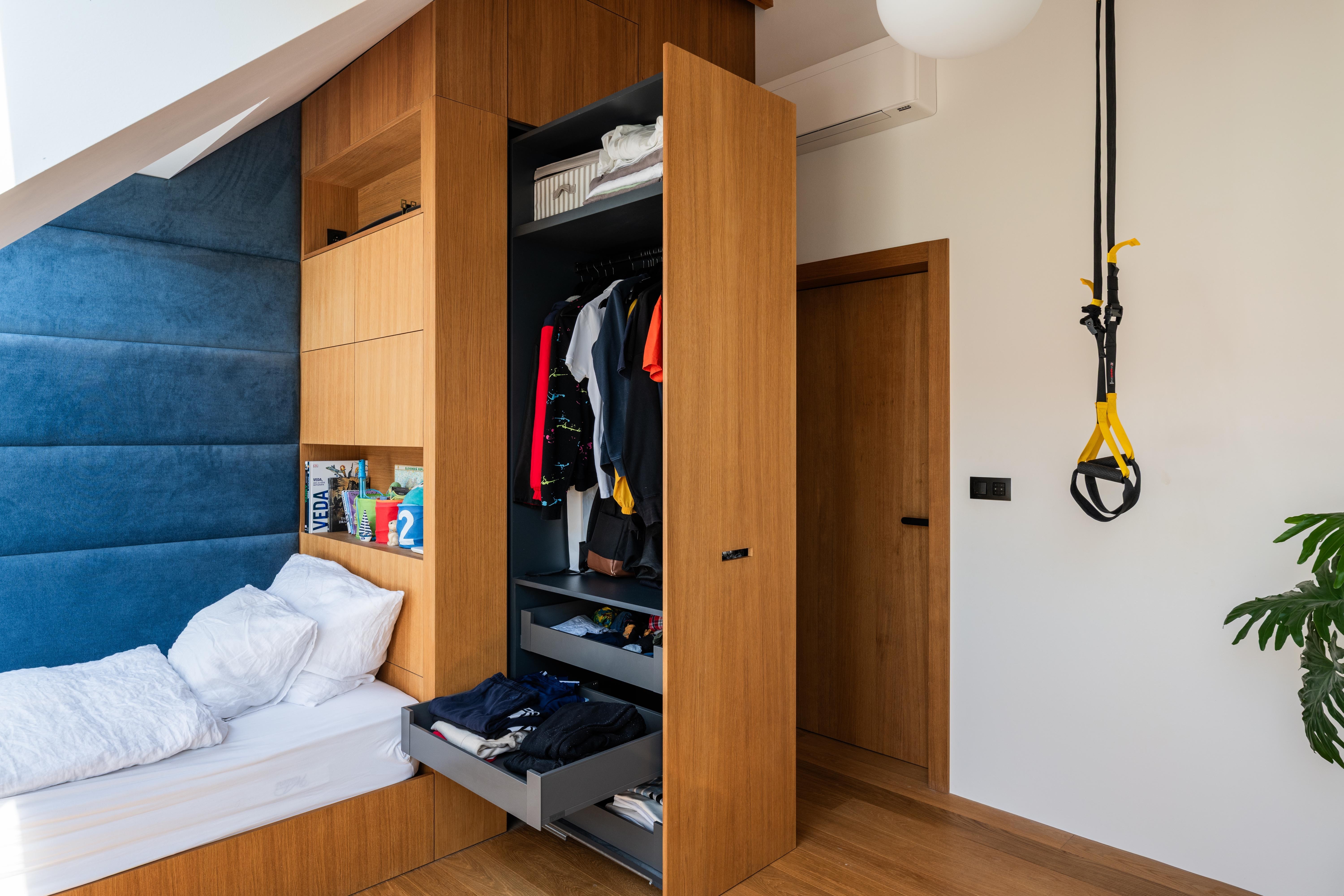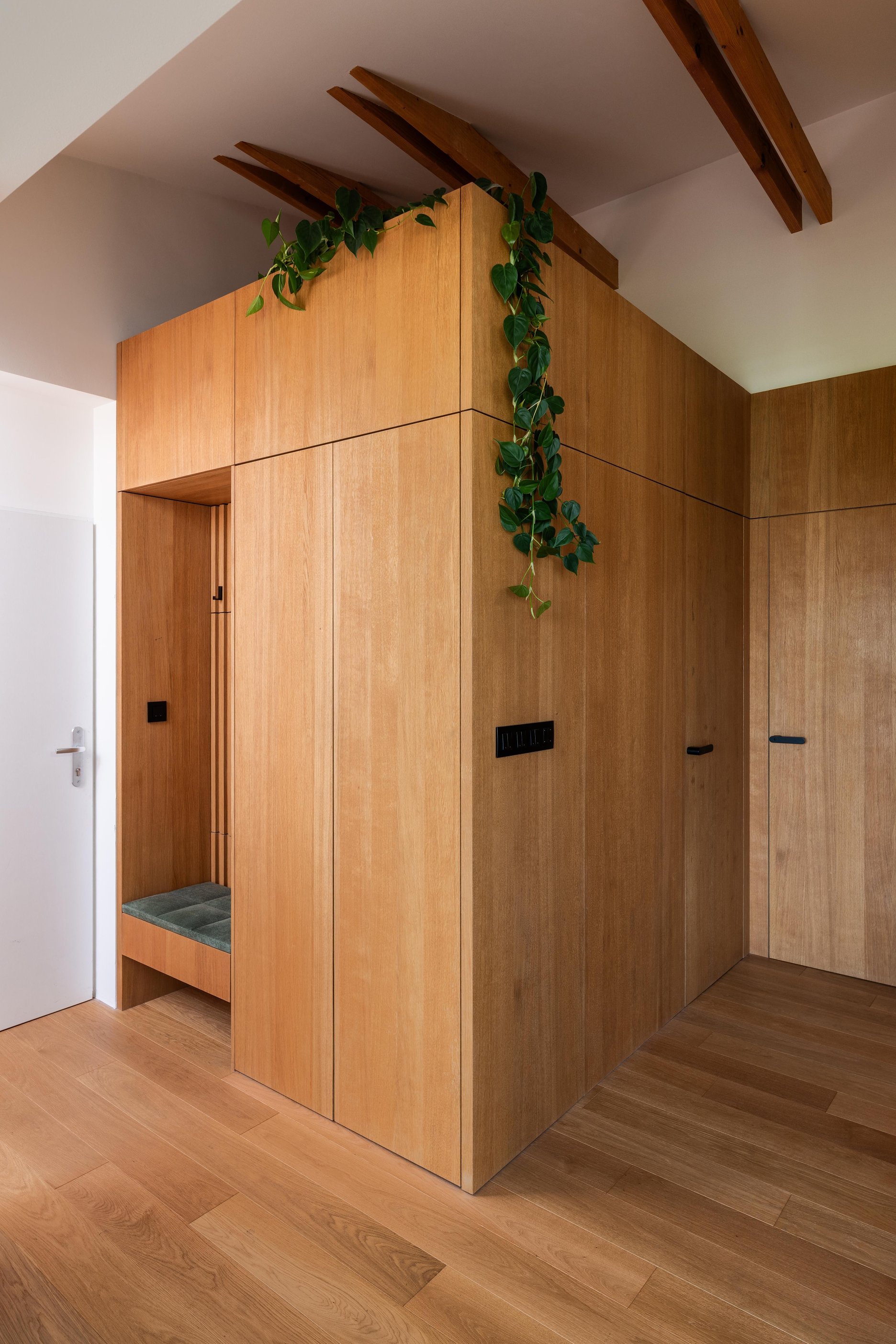 (3) Do priestoru s vyššou svetlou výškou sú vložené vstavby dvoch kúpeľní s vlastným stropom. Nad nimi je otvorený úložný priestor, prístupný cez mobilný rebrík. Vstavby sú konštrukčne navrhnuté ako opláštené drevené rámové konštrukcie. Do stien vstavieb sú integrované aj časti zariadenia bytu, ako sú vysoká časť kuchynskej linky, šatník pri vstupe alebo pracovný stôl. Všetky tieto prvky sú vizuálne zjednotené jedným súvislým, priebežným dreveným obkladom, ktorý v pôdoryse obopína komín.