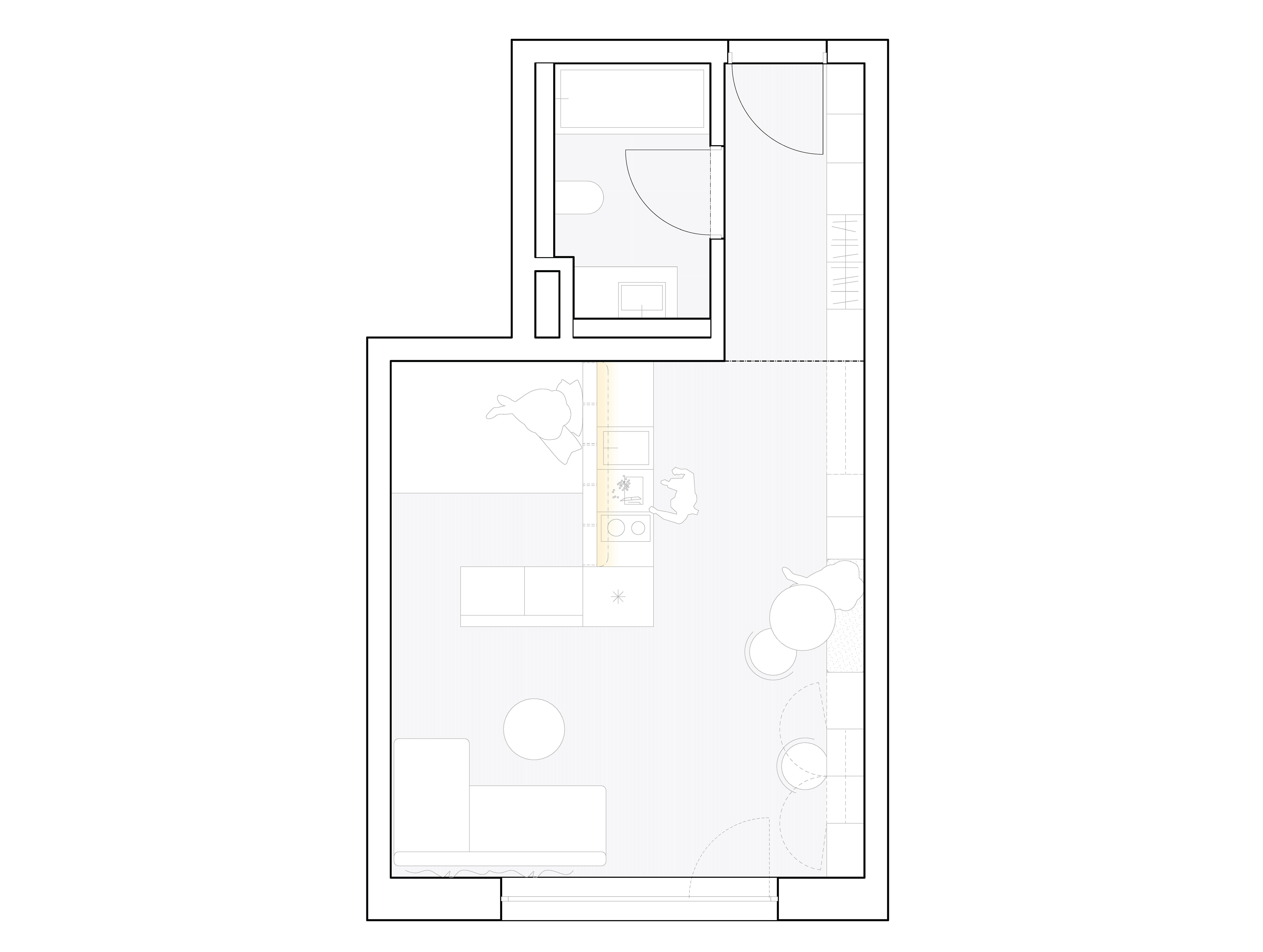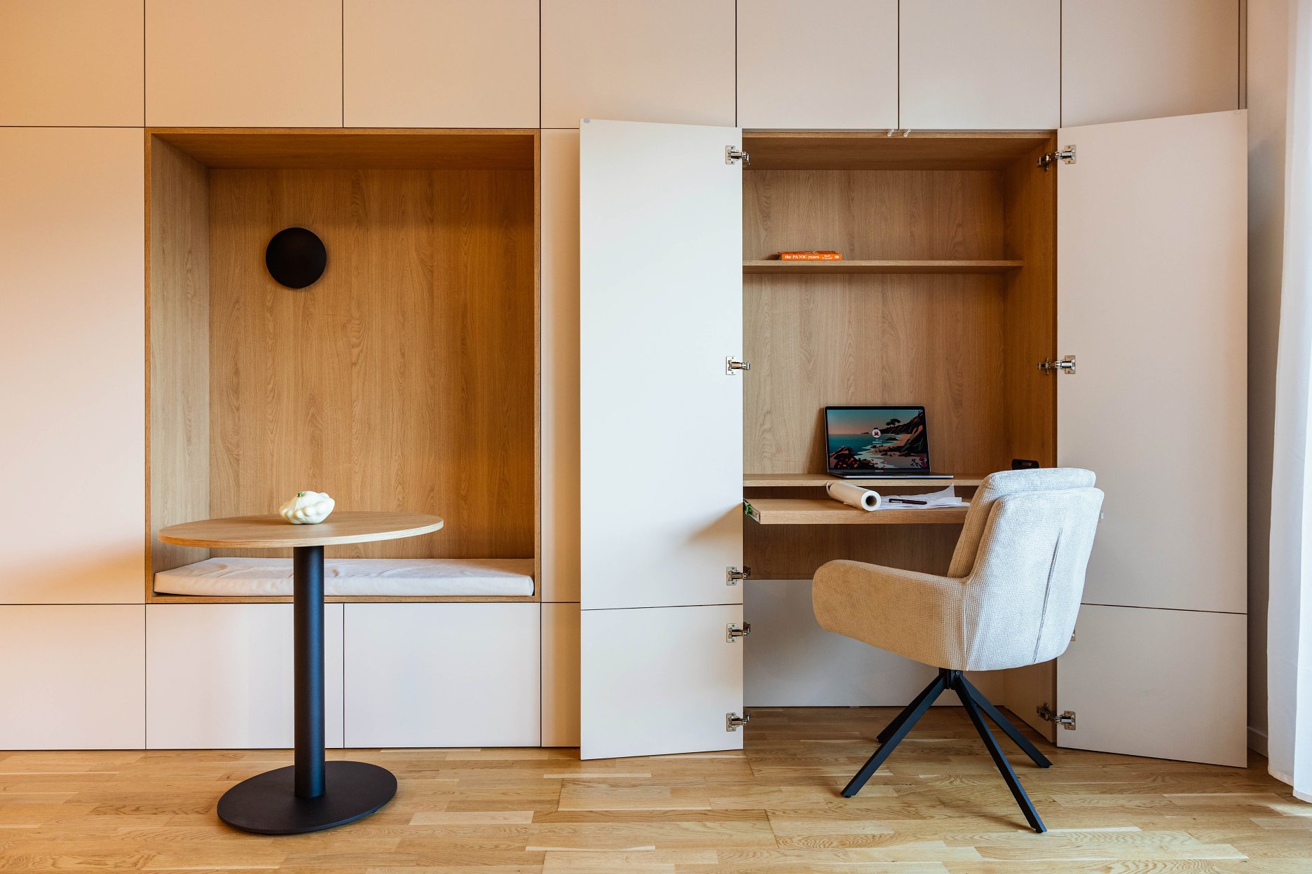 Priestor jednoizbového bytu sme prostredníctvom stolárskych prvkov funkčne rozdelili na kuchyňu, jedálenskú časť, pracovný kútik, obývačku a spálňu, pričom sme vytvorili aj množstvo úložných možností na každodenné používanie. Každá časť má svoju funkciu, no spolu vytvárajú jeden celok.