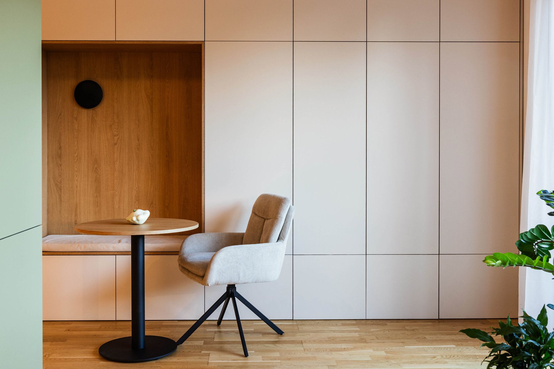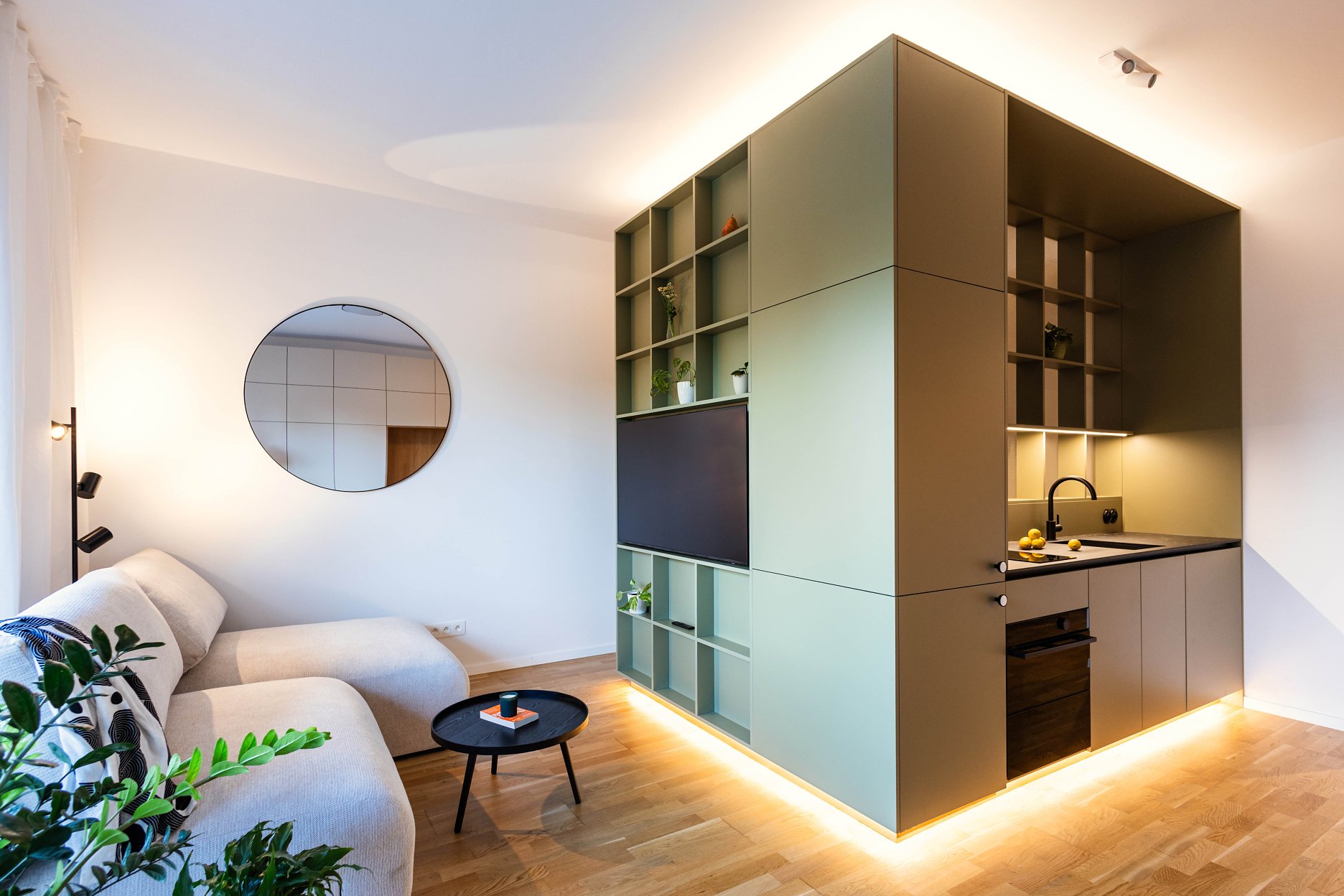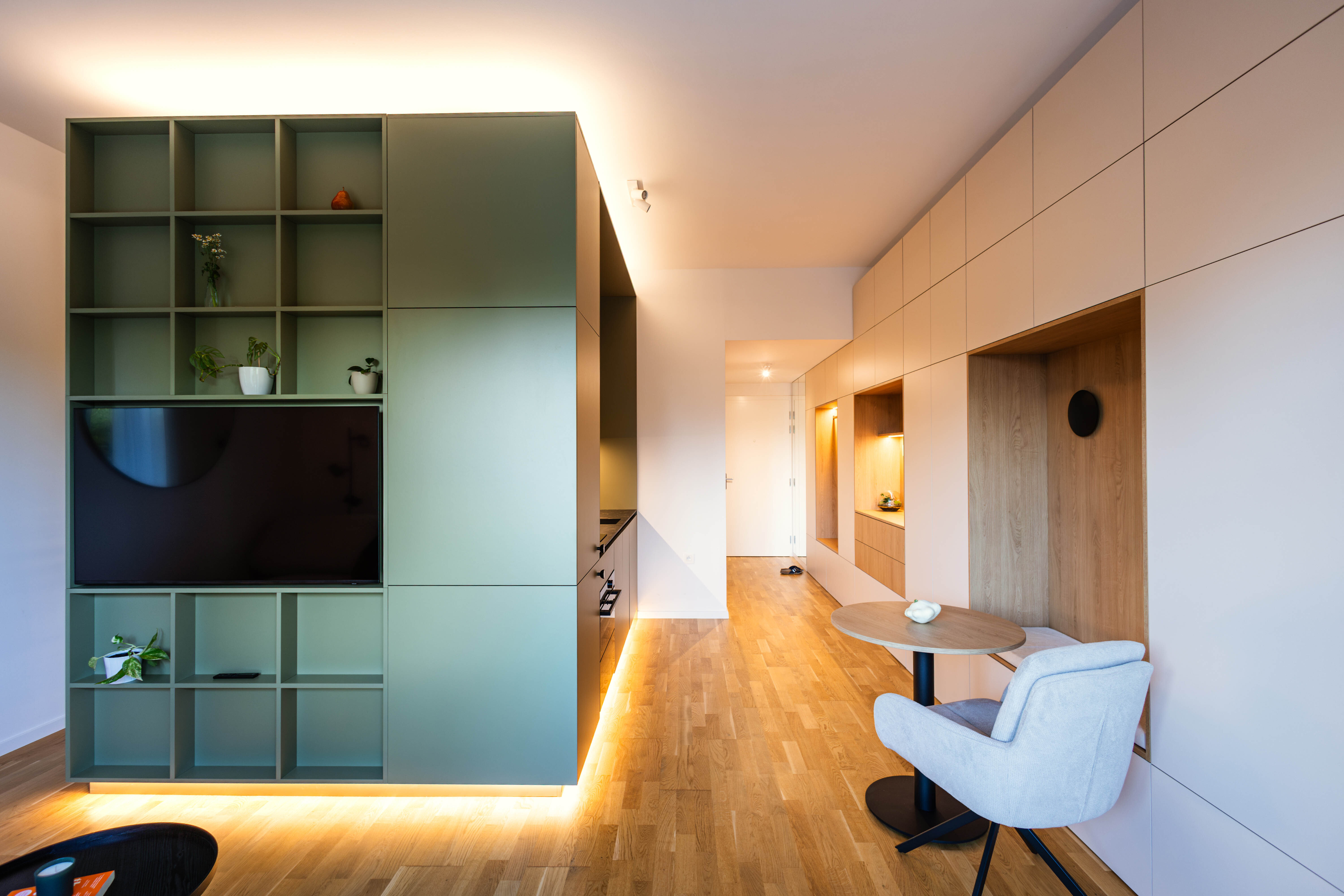Dominantným prvkom bytu je zelený multifunkčný box, ktorý prepája kuchynskú linku, TV stenu, úložný priestor a zároveň oddeľuje niku so spálňou od zvyšku bytu. Úložný systém začína už pri vstupe, kde skrine ponúkajú maximum priestoru a v každej časti dopĺňajú inú funkciu. V zádverí je integrovaná nika na vešanie kabátov so sedením pri obúvaní, v kuchyni priestor obohacuje čajový kútik, pri jedálenskom stole nika slúži ako lavica a posledná nika ukrýva kompaktné pracovné miesto pre príležitostný home office. Takto riešený blok prináša do malého bytu flexibilitu.