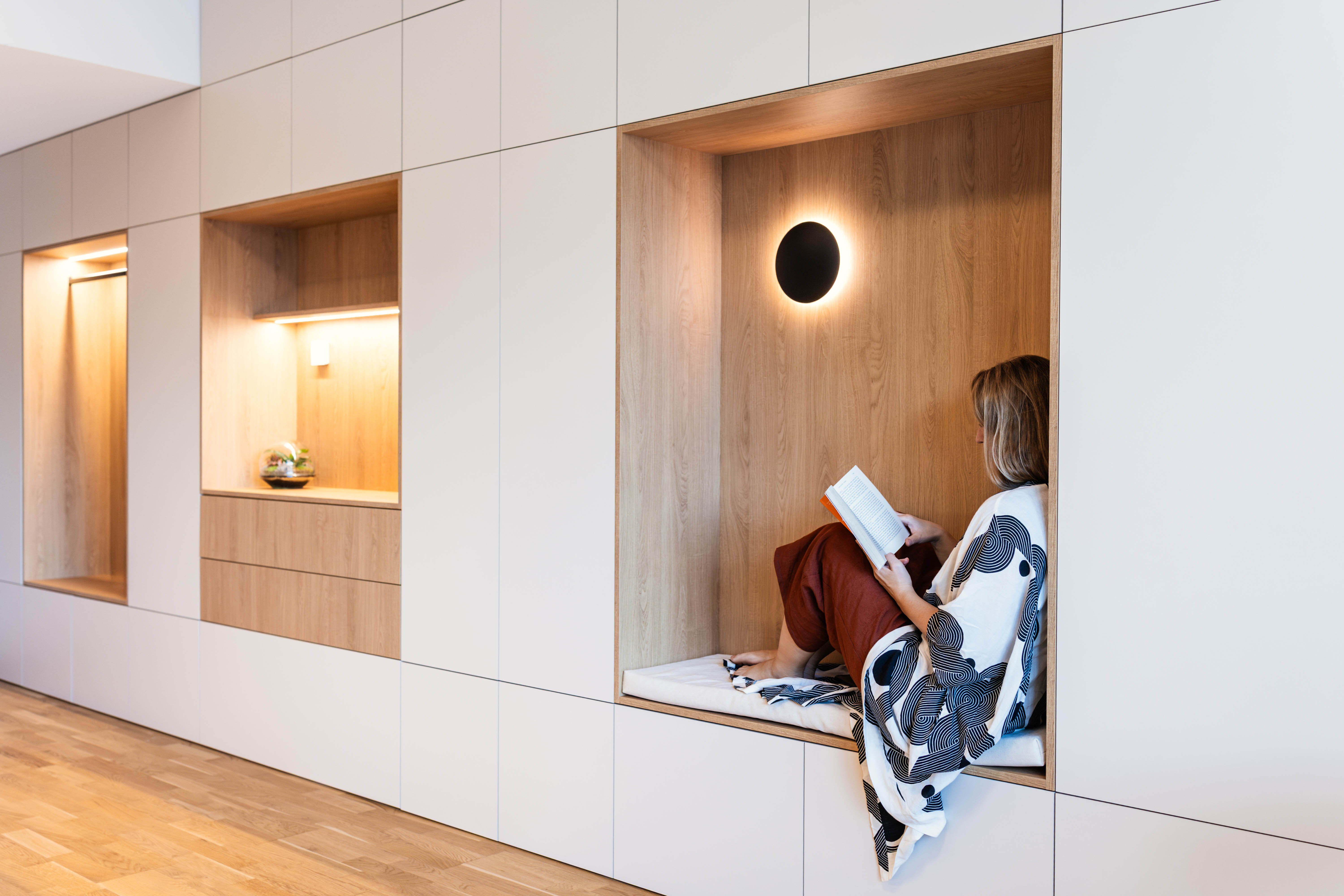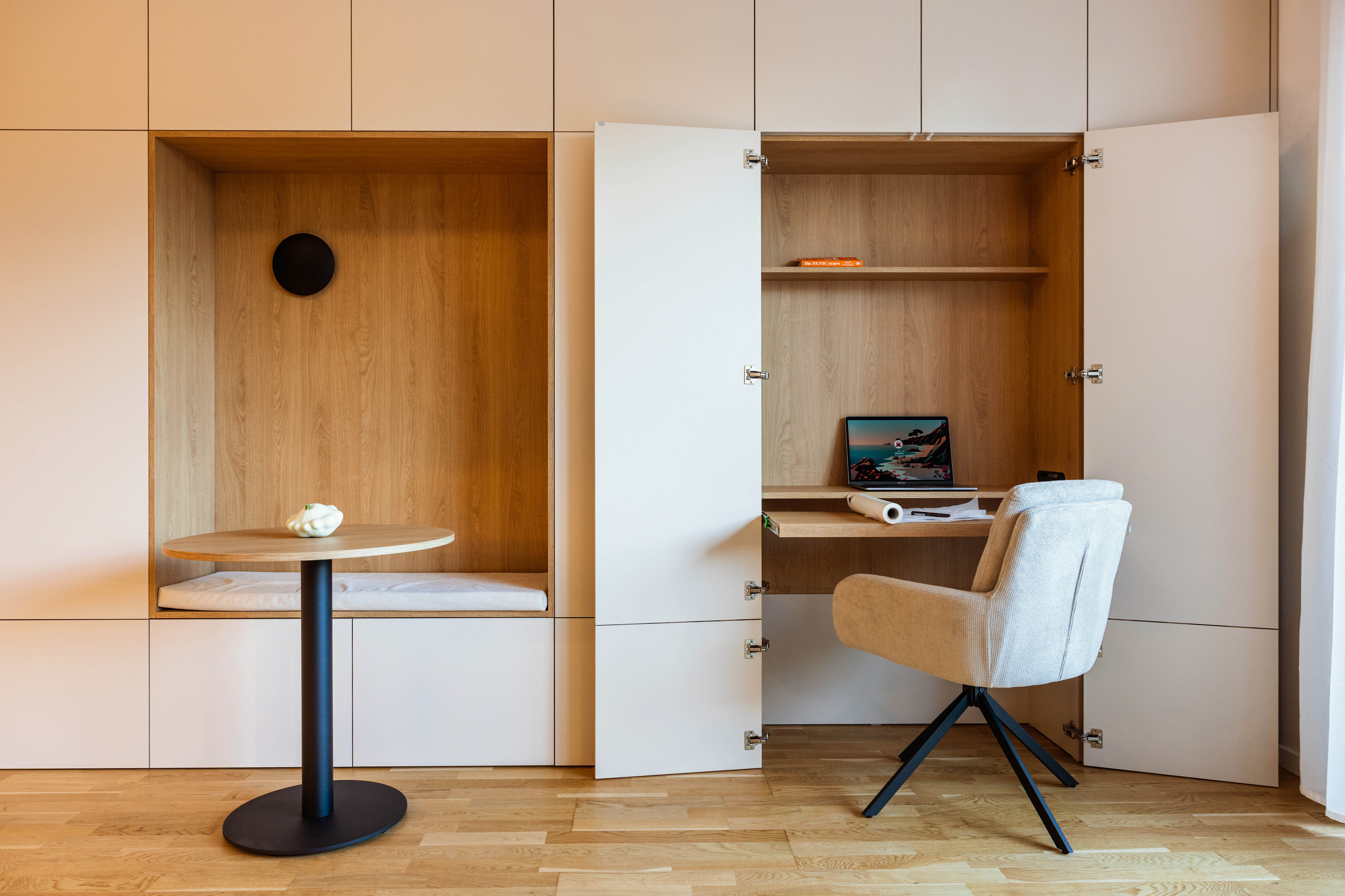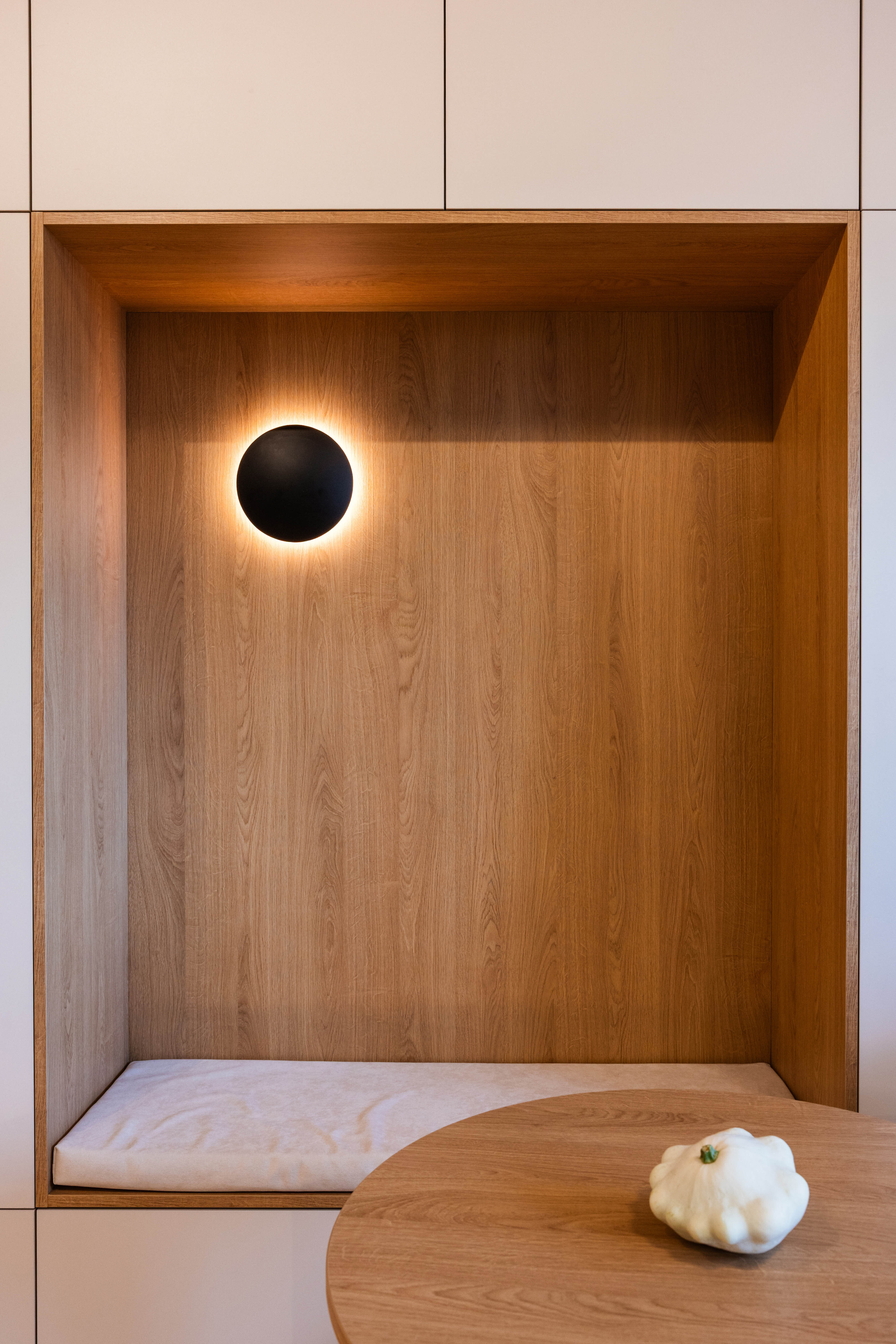 Dominantným prvkom bytu je zelený multifunkčný box, ktorý prepája kuchynskú linku, TV stenu, úložný priestor a zároveň oddeľuje niku so spálňou od zvyšku bytu. Úložný systém začína už pri vstupe, kde skrine ponúkajú maximum priestoru a v každej časti dopĺňajú inú funkciu. V zádverí je integrovaná nika na vešanie kabátov so sedením pri obúvaní, v kuchyni priestor obohacuje čajový kútik, pri jedálenskom stole nika slúži ako lavica a posledná nika ukrýva kompaktné pracovné miesto pre príležitostný home office. Takto riešený blok prináša do malého bytu flexibilitu.
