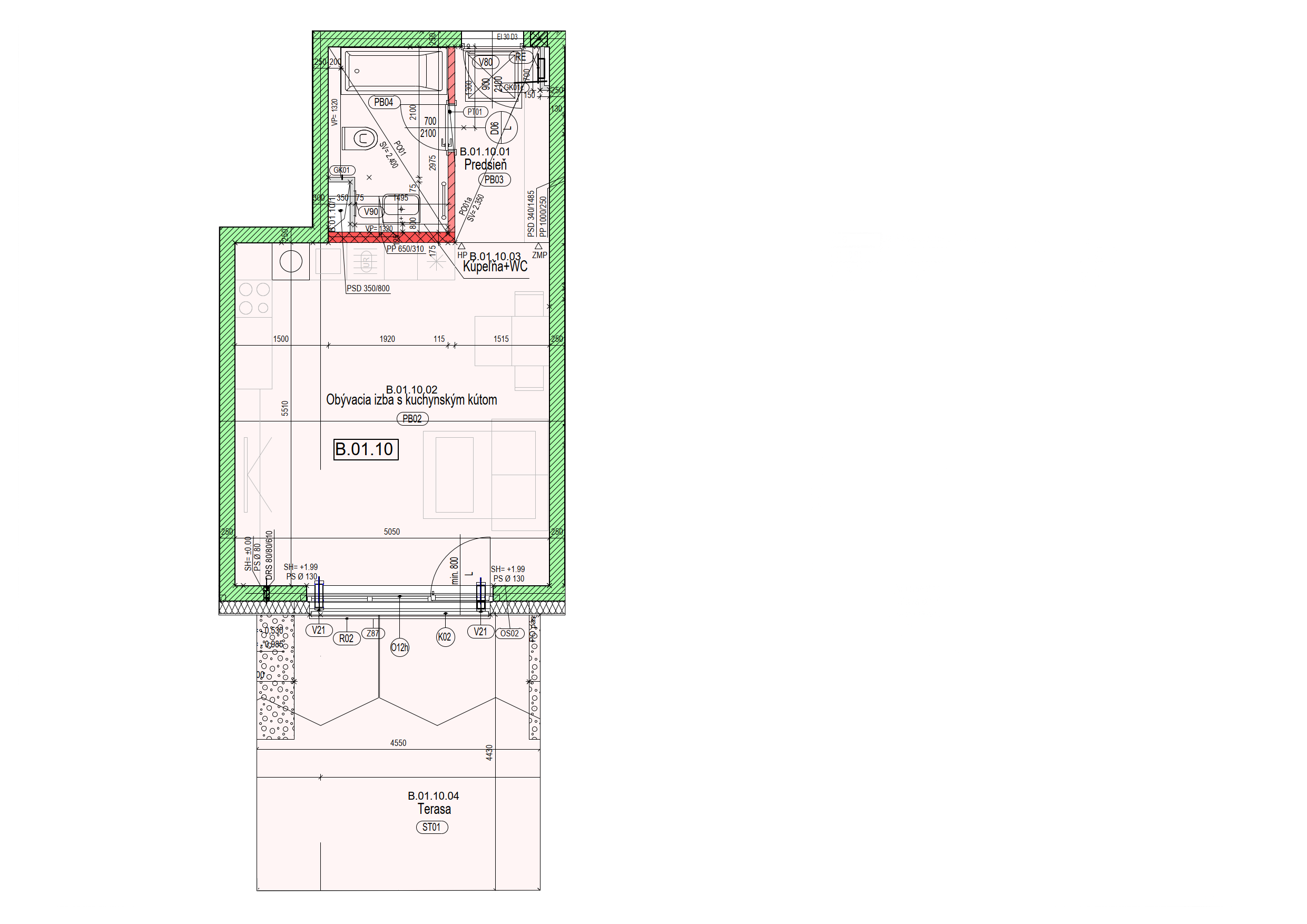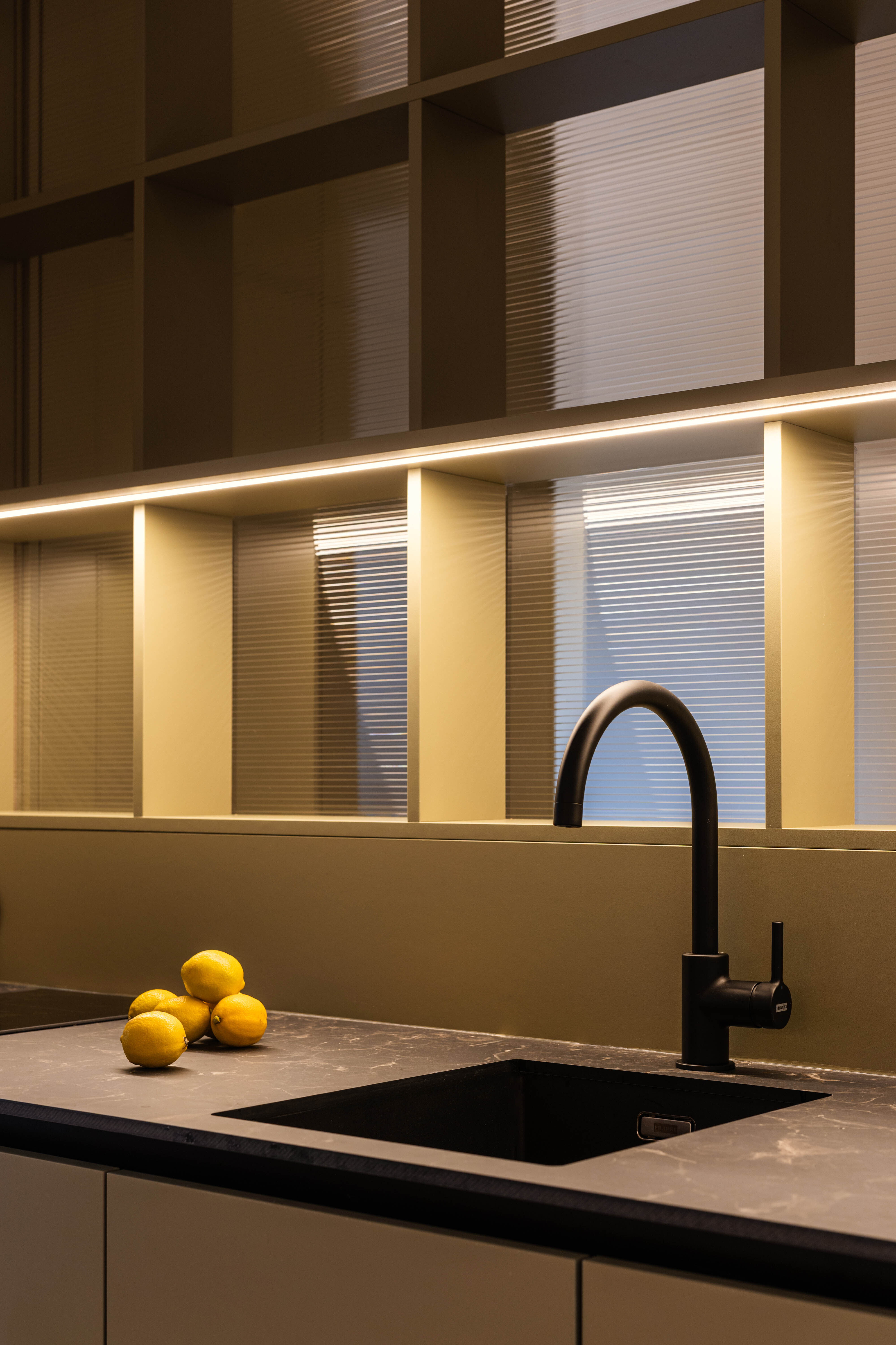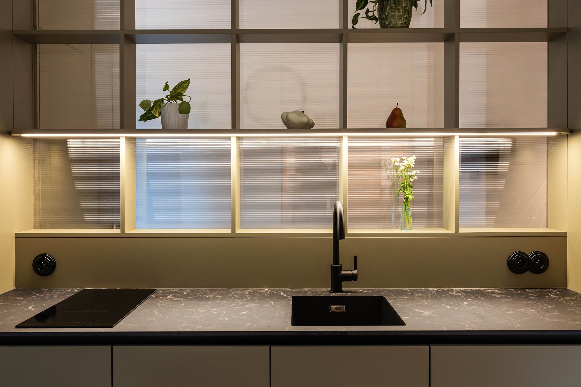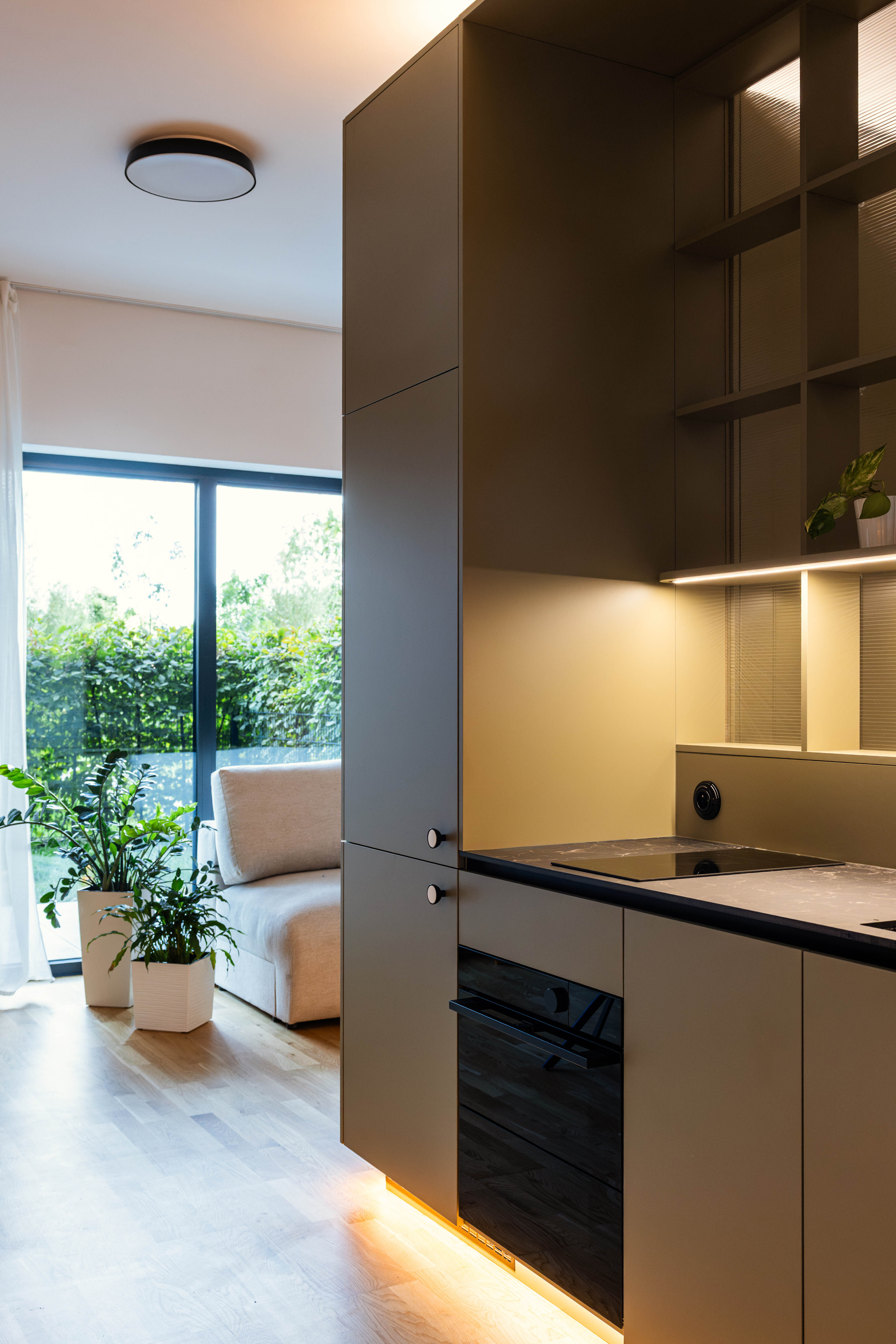 Kombinácia pieskovej sivej, dubového drevodekoru a olivovej zelene vytvára základ, ktorý dopĺňa pracovná doska s kresbou čierneho mramoru a tmavé akcenty. Kuchyňa a spálňa sú oddelené policou s chrbtom z lexanu, ktorá prepúšťa svetlo do priestoru. Spálňová nika v jemných béžových tónoch, pôsobí ako oddelené miesto odpočinku.