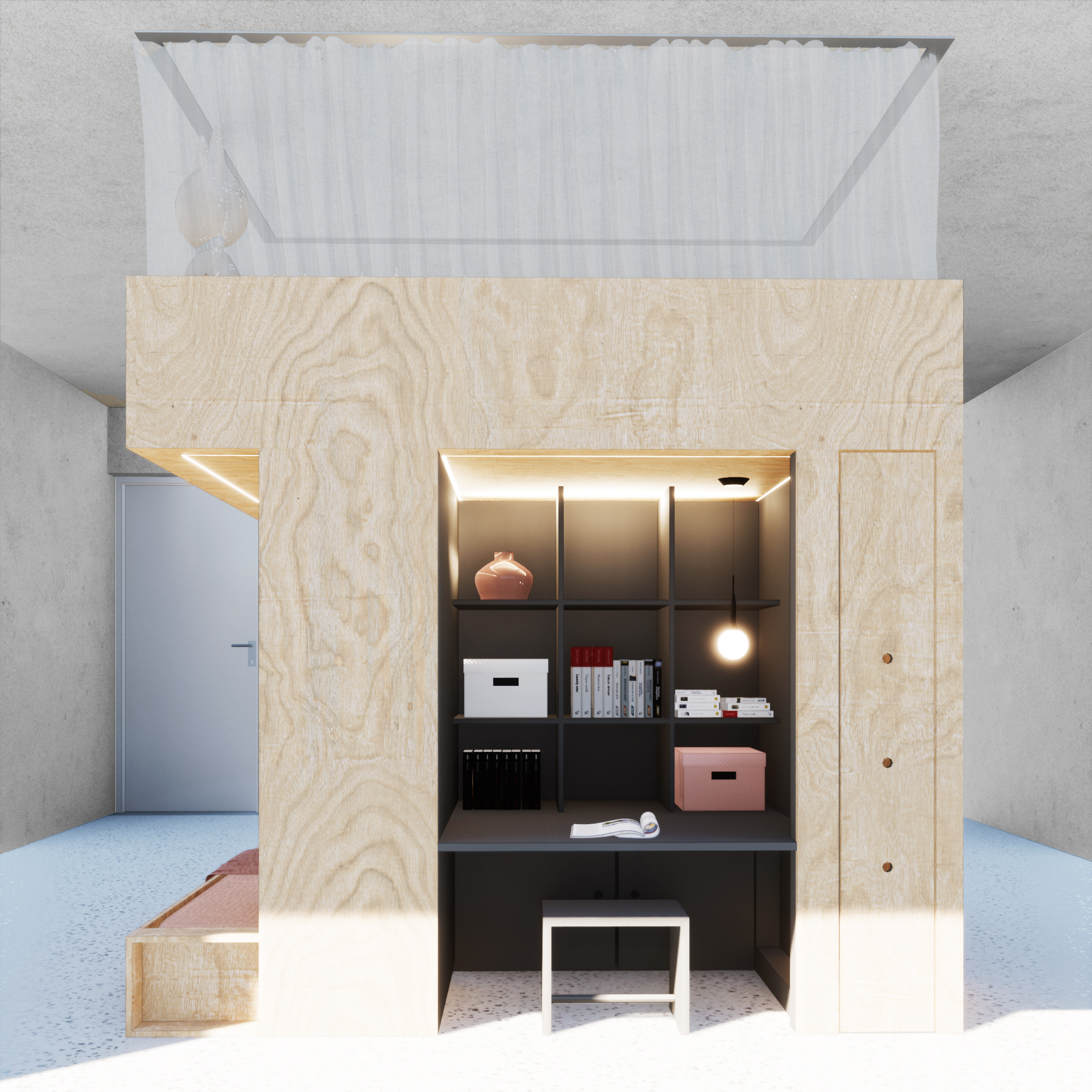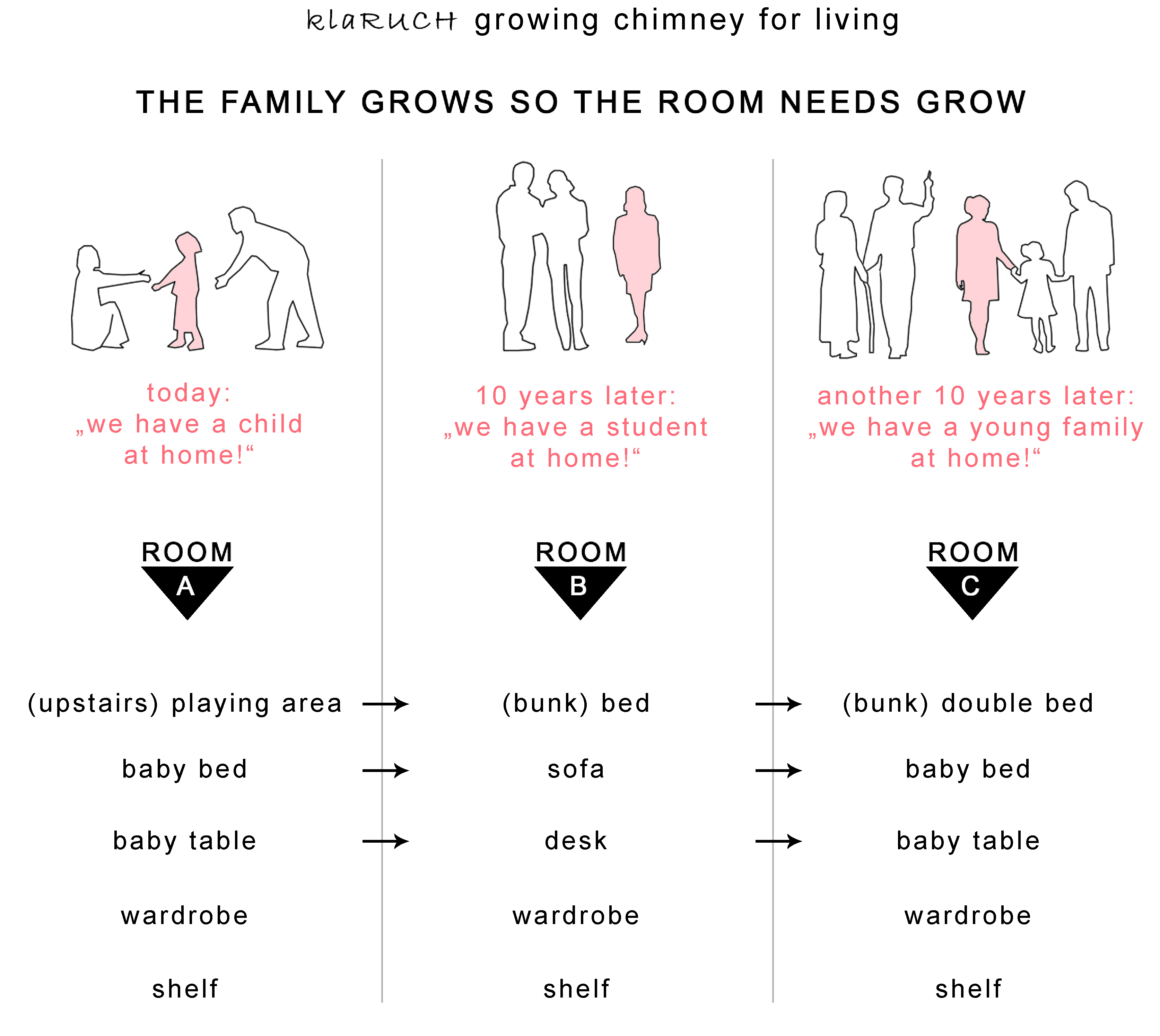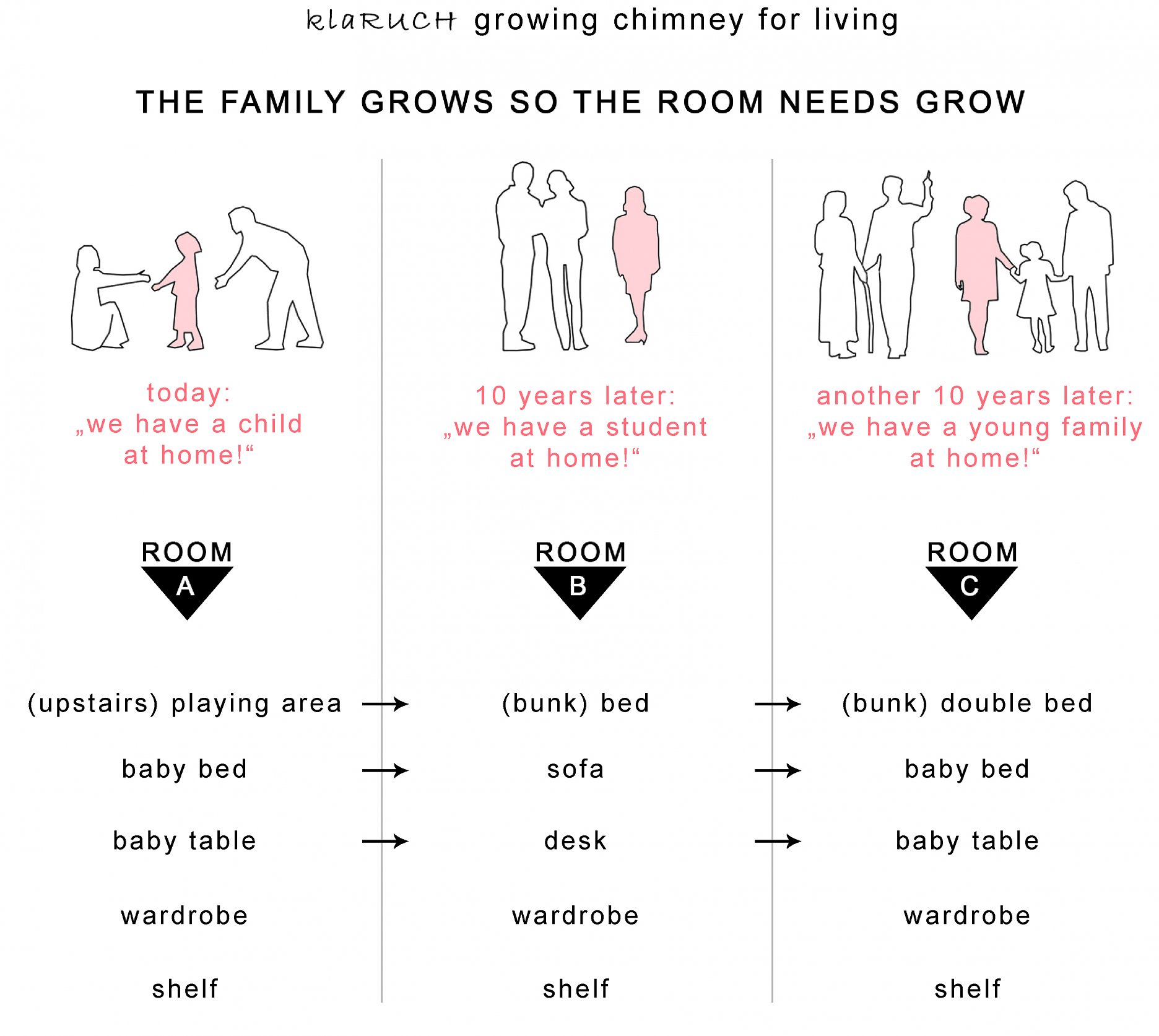 Hlavným zámerom pri návrhu obytného komína bolo splnenie požiadavky na variabilnosť umiestenia. Vďaka svojmu kompaktnému tvaru môže byť tento nábytok umiestnený k stene, ako aj vo voľnom priestore, čím získa navyše možnosť aplikácie lezeckej steny. Jednotlivé segmetny, z ktorých sa skladá, predstaujú kompletné zariadenie izby pre jedného člena domácnosti, s ktorým dokáže rásť. Vďaka jednoduchým a vratným modifikáciám je možné vyskladať tri varianty využívania : A - izba pre batoľa a predškolský vek, B - izba pre študetnský vek, C – izba, ktorá jemu a aj jeho rodine vytvorí dostatočné zázemie pri návšteve rodičovského domu. Priestor nízkej postele pre malé dieťa vie byť jednoducho zmenený na pobytový priestor tíneďžera na oddych a relax vo forme gauča. Pracovný stôl má rovnako dve výškové možnosti osadenia, takže môže slúžiť ako detský stolík na kreatívne práce, ako aj plnohodnotný pracovný písací stôl. Vyvýšený priestor slúžiaci ako (manželská) posteľ v neskoršom veku môže byť v detsve využívaný ako prídavná bezpečná hracia plocha, takže z pohľadu dieťaťa a jeho požiadaviek na dostatočný hrací priestor nezaberá v izbe žiadne metre štvorcové. Samozrejmosťou sú aj otvorené a zatvorené úložné priestory prítomné vo všetkyćh variantoch obytného komína. Zásadnou ideou pri navrhovaní zároveň bolo zabezpečenie montessori požiadaviek pre zdravý psychomotorický vývoj jeho obyvateľa. Tomu bol prispôsobený dizajn úchytov a patentov na otváranie úložného priestoru, ako aj výšková dostupnosť detskej postieľky. Táto idea je podporená aj hravosťou celého konceptu - lezeckou stenou a rebríkom vedúcim do vyvýšenej platformy. Samotný obytný komín tak v izbe vytvára rôzne zákutia a privátne zóny – či už v jeho samotnom kubuse, alebo v jeho okolitom priestore.