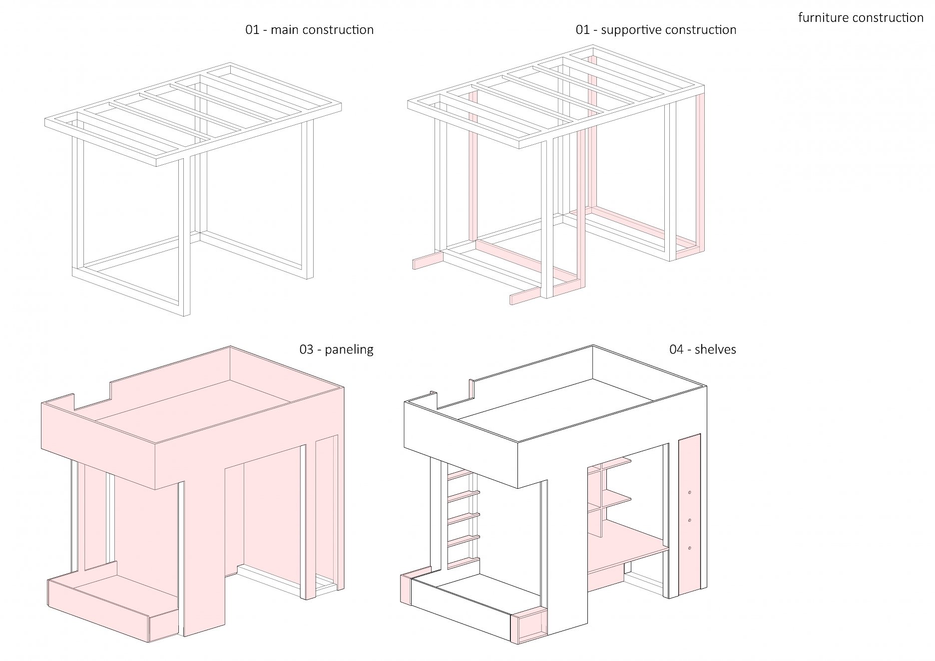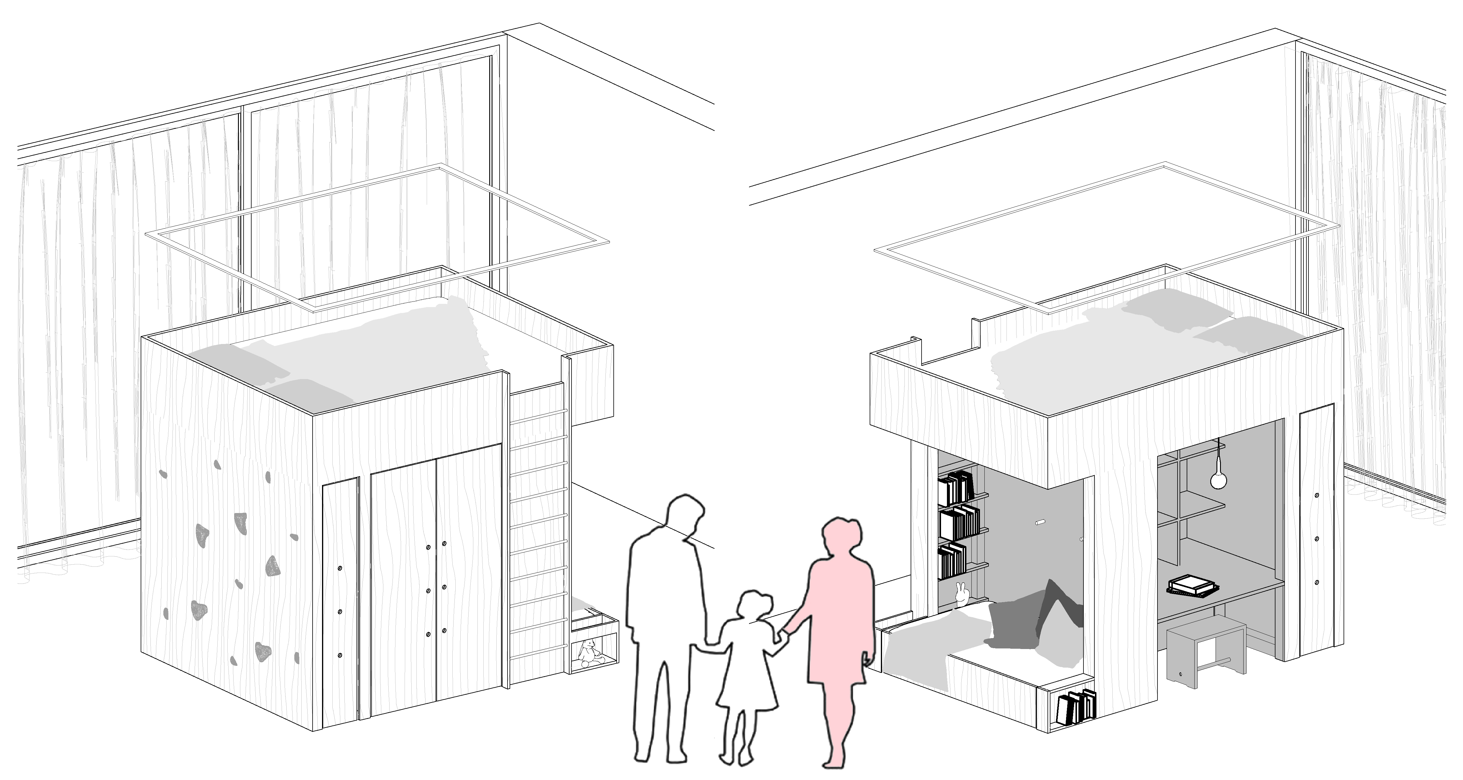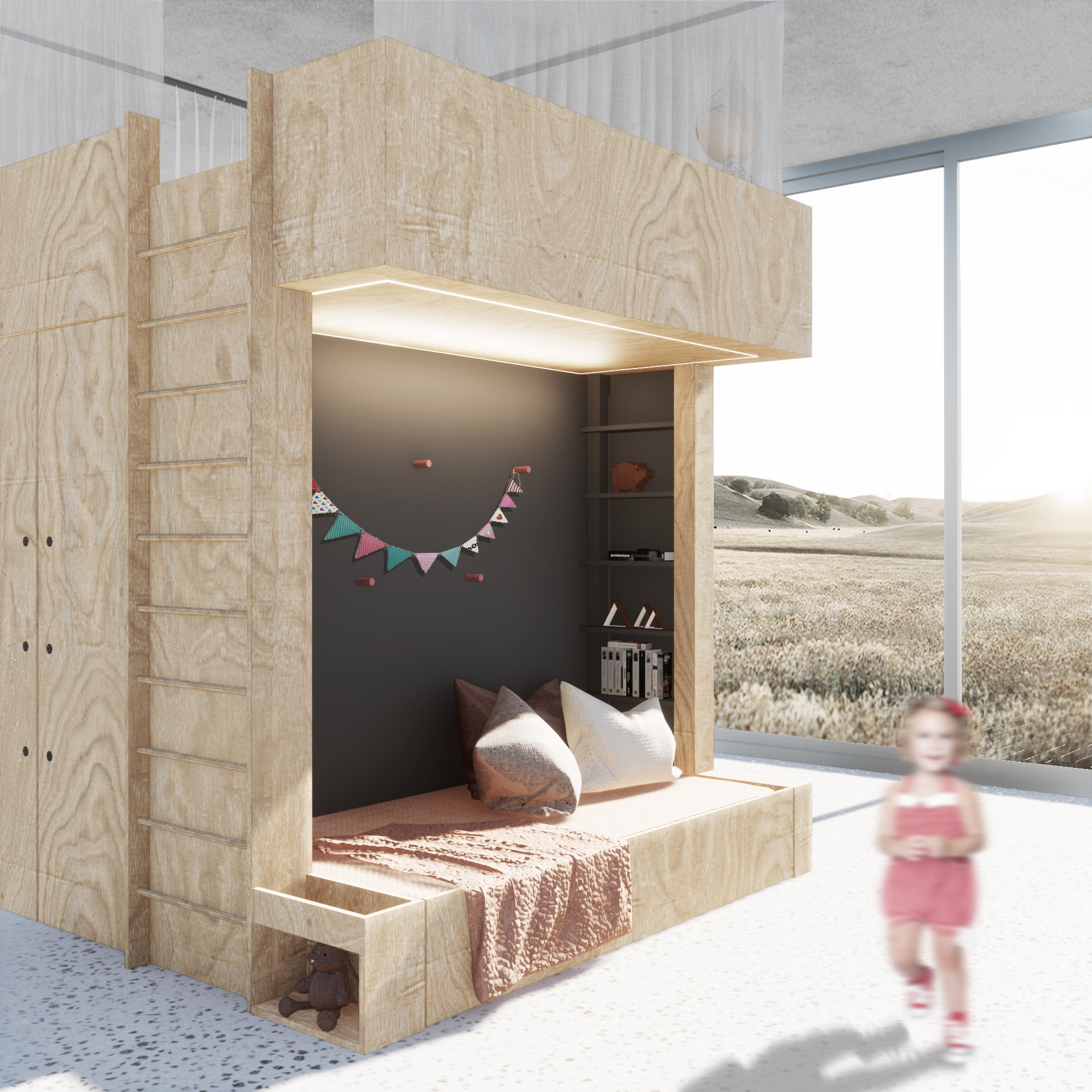 Hlavným zámerom pri návrhu obytného komína bolo splnenie požiadavky na variabilnosť umiestenia. Vďaka svojmu kompaktnému tvaru môže byť tento nábytok umiestnený k stene, ako aj vo voľnom priestore, čím získa navyše možnosť aplikácie lezeckej steny. Jednotlivé segmetny, z ktorých sa skladá, predstaujú kompletné zariadenie izby pre jedného člena domácnosti, s ktorým dokáže rásť. Vďaka jednoduchým a vratným modifikáciám je možné vyskladať tri varianty využívania : A - izba pre batoľa a predškolský vek, B - izba pre študetnský vek, C – izba, ktorá jemu a aj jeho rodine vytvorí dostatočné zázemie pri návšteve rodičovského domu. Priestor nízkej postele pre malé dieťa vie byť jednoducho zmenený na pobytový priestor tíneďžera na oddych a relax vo forme gauča. Pracovný stôl má rovnako dve výškové možnosti osadenia, takže môže slúžiť ako detský stolík na kreatívne práce, ako aj plnohodnotný pracovný písací stôl. Vyvýšený priestor slúžiaci ako (manželská) posteľ v neskoršom veku môže byť v detsve využívaný ako prídavná bezpečná hracia plocha, takže z pohľadu dieťaťa a jeho požiadaviek na dostatočný hrací priestor nezaberá v izbe žiadne metre štvorcové. Samozrejmosťou sú aj otvorené a zatvorené úložné priestory prítomné vo všetkyćh variantoch obytného komína. Zásadnou ideou pri navrhovaní zároveň bolo zabezpečenie montessori požiadaviek pre zdravý psychomotorický vývoj jeho obyvateľa. Tomu bol prispôsobený dizajn úchytov a patentov na otváranie úložného priestoru, ako aj výšková dostupnosť detskej postieľky. Táto idea je podporená aj hravosťou celého konceptu - lezeckou stenou a rebríkom vedúcim do vyvýšenej platformy. Samotný obytný komín tak v izbe vytvára rôzne zákutia a privátne zóny – či už v jeho samotnom kubuse, alebo v jeho okolitom priestore.