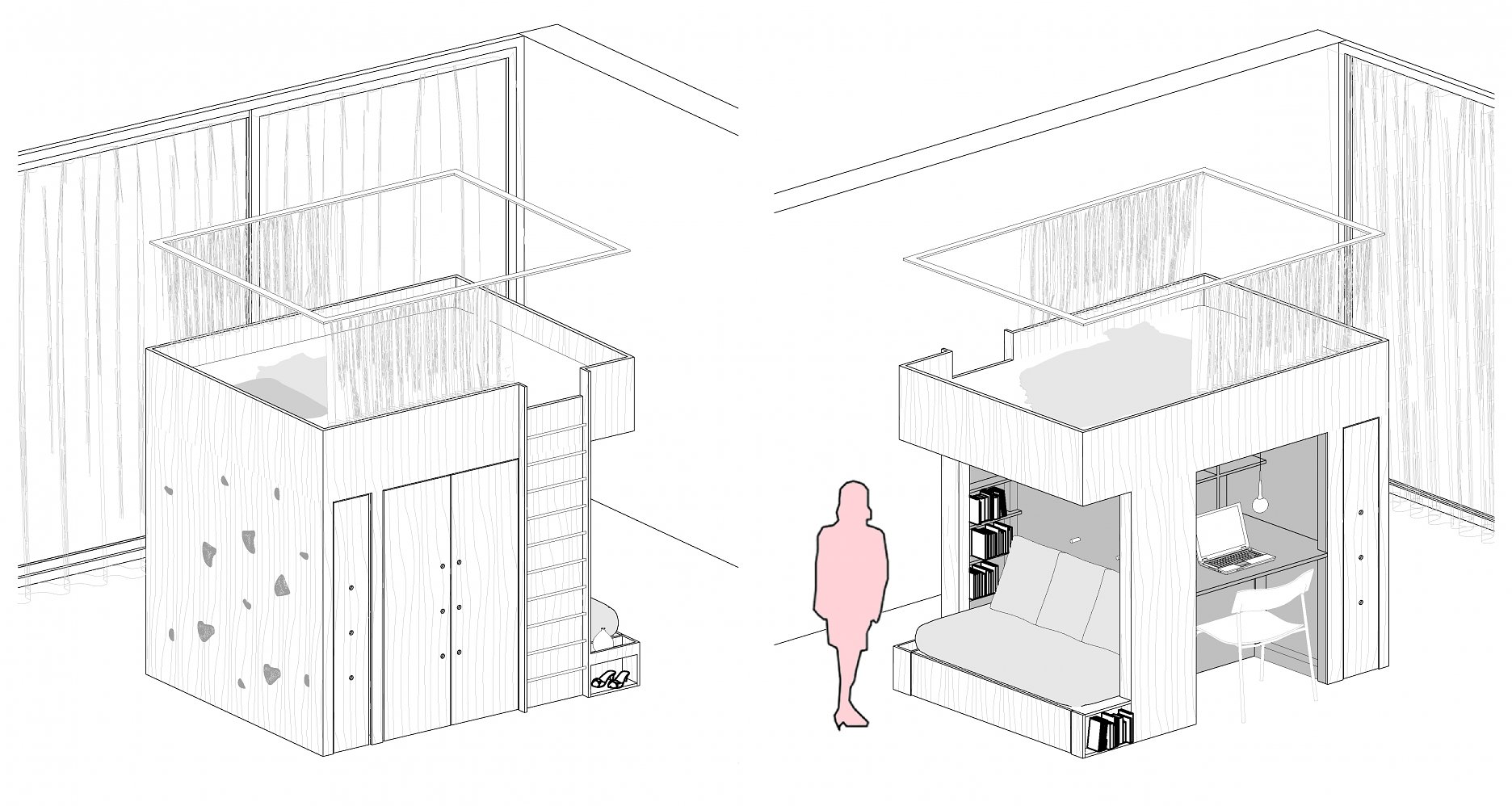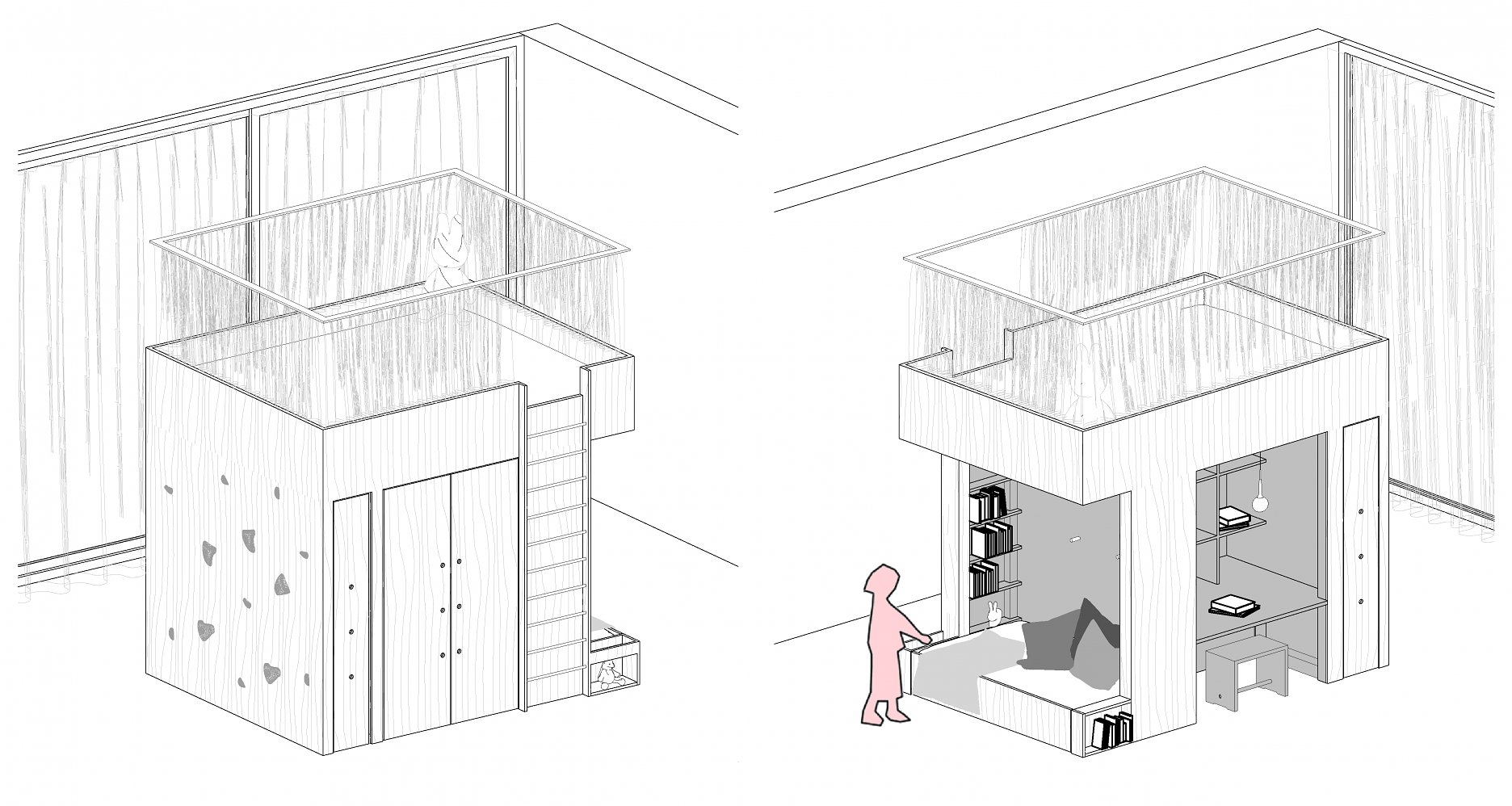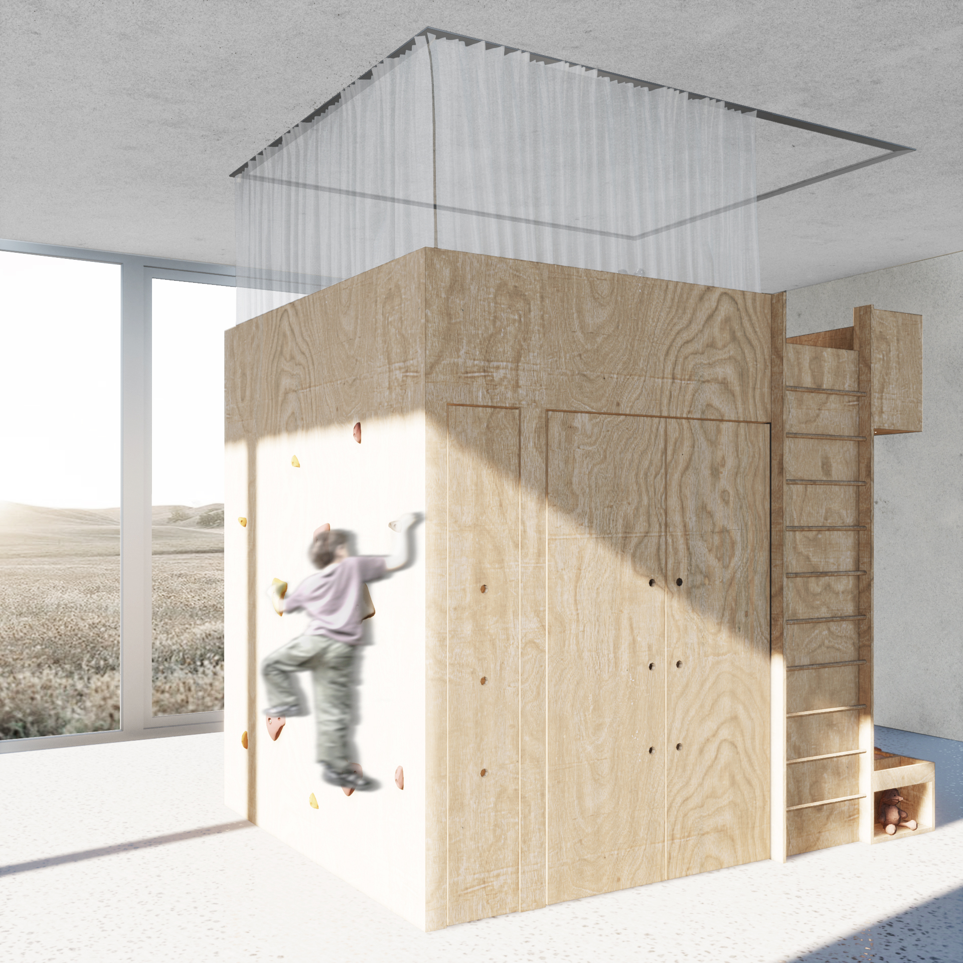 Zásadným prínosom tohto nábytkového kusu je aj jeho ucelený tvar a objem, vďaka ktorému vynikne rovnako v menšej izbe sídliskového bytu v polohe prisadenej k stene, ako aj vo väčšej izbe rodinného domu v centrálnej polohe, kedy je pridanou hodnotou možnosť osadenia lezeckých chytov na voľnú bočnú stenu.
