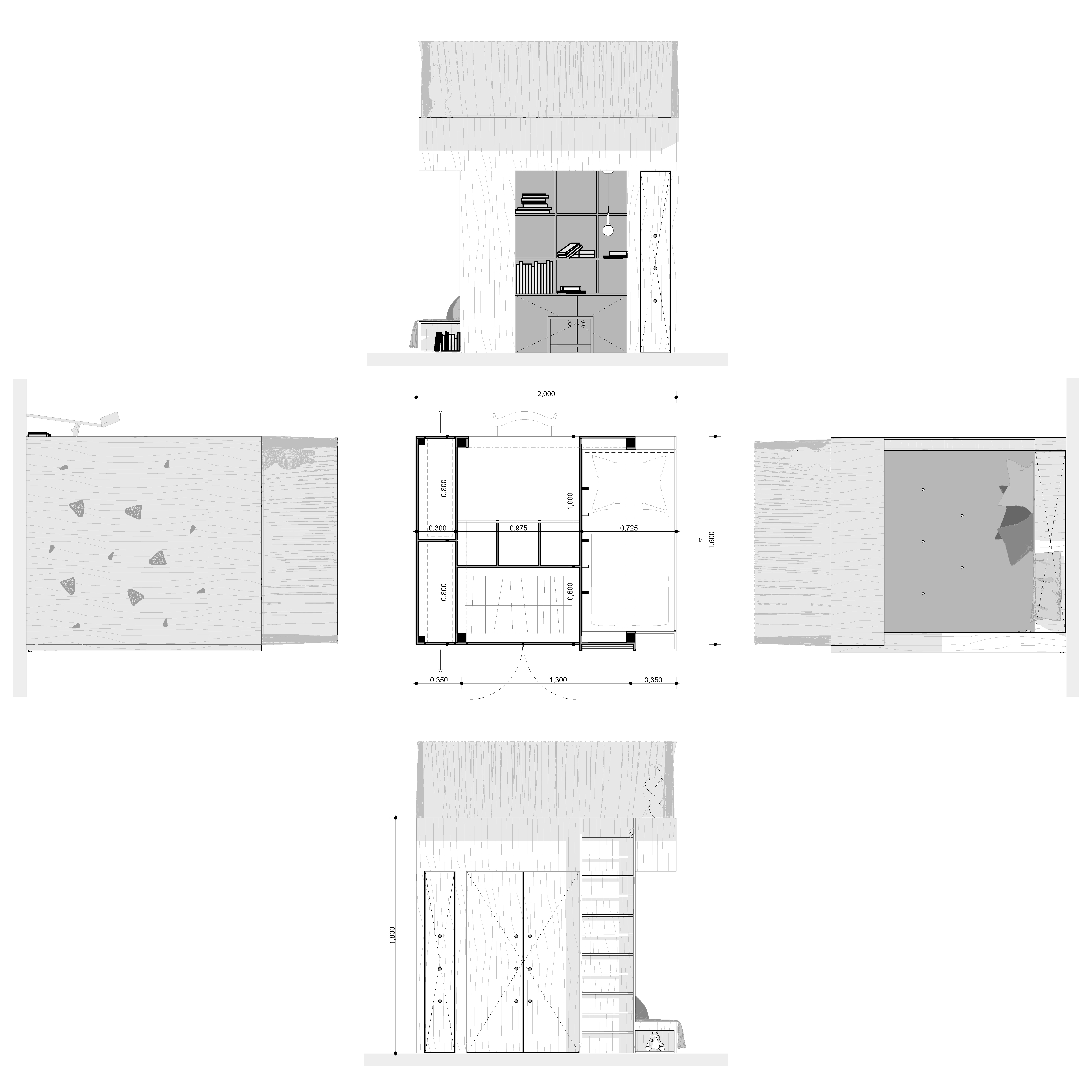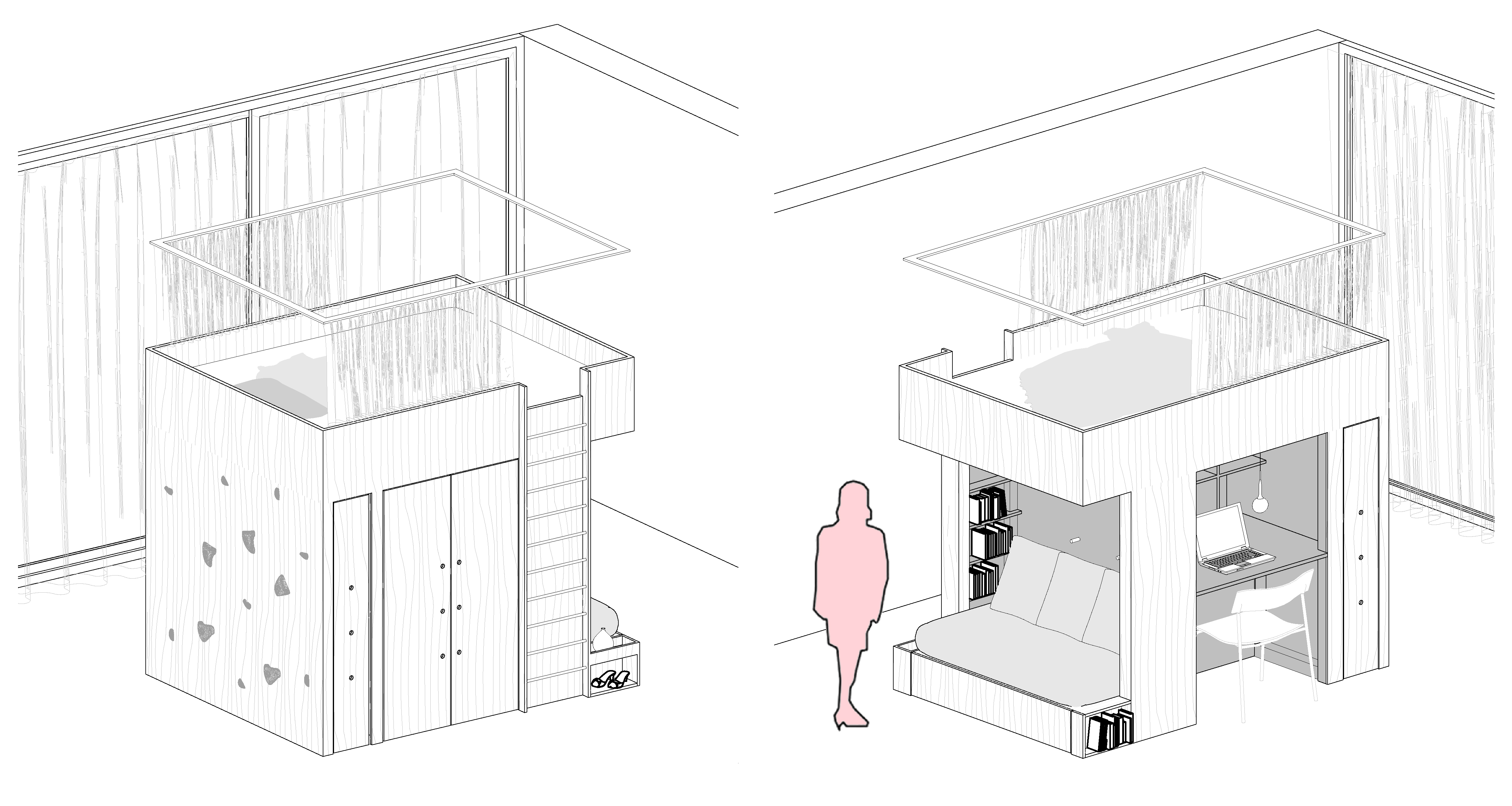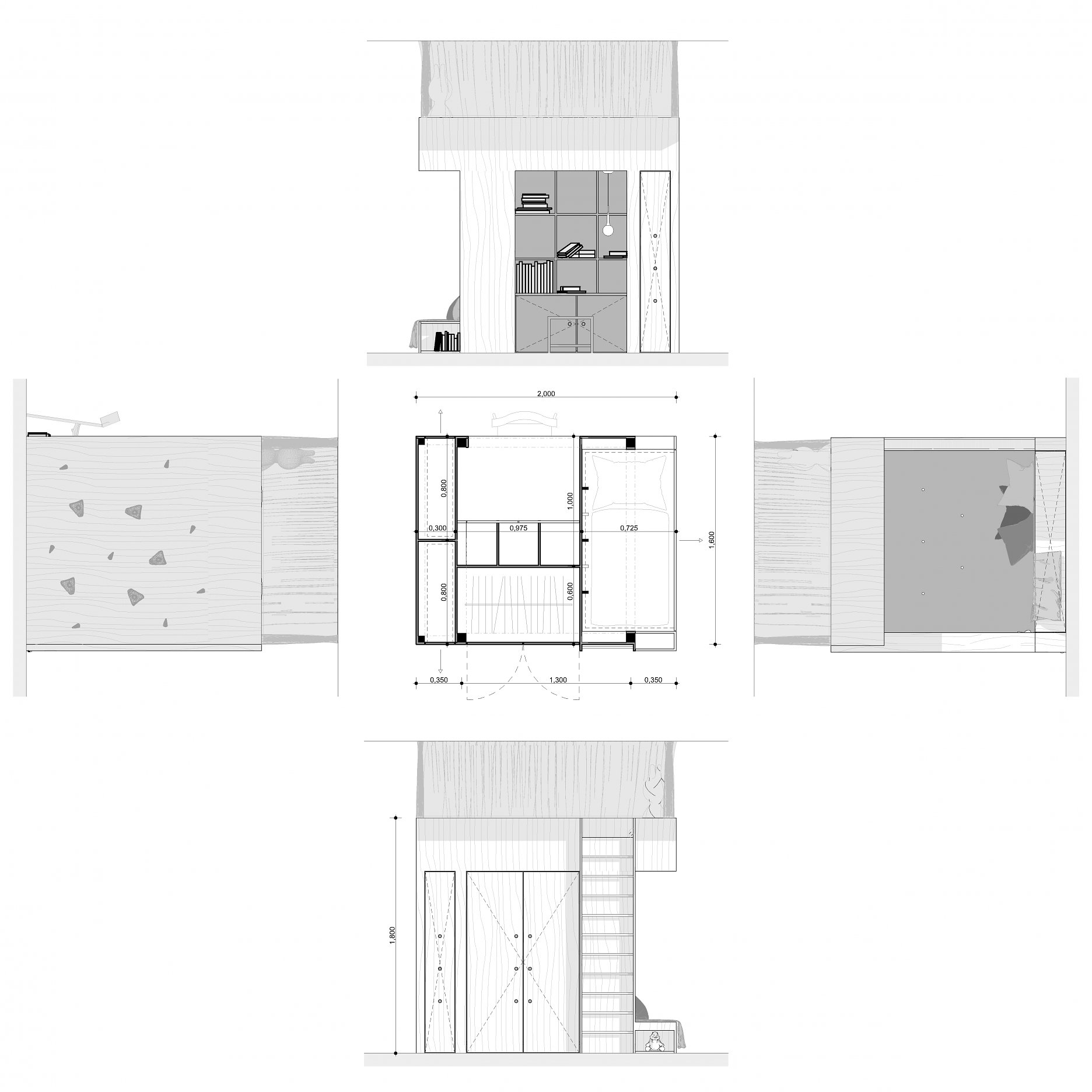 Zásadným prínosom tohto nábytkového kusu je aj jeho ucelený tvar a objem, vďaka ktorému vynikne rovnako v menšej izbe sídliskového bytu v polohe prisadenej k stene, ako aj vo väčšej izbe rodinného domu v centrálnej polohe, kedy je pridanou hodnotou možnosť osadenia lezeckých chytov na voľnú bočnú stenu.