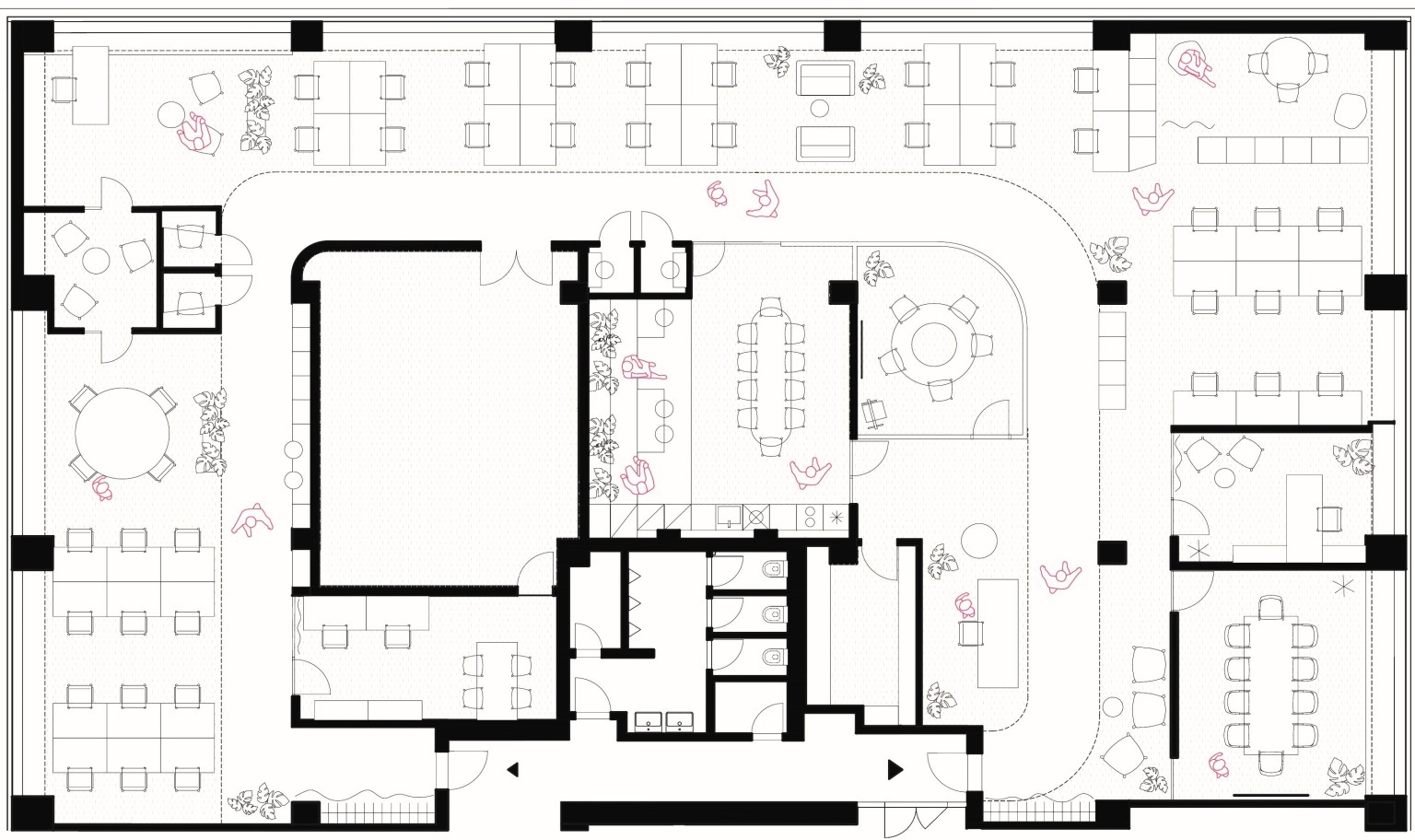 Samotná dispozícia je vyriešená okruhovo. Limitujúca veľkosť priestoru a zároveň požiadavky klienta na dostatočnú zvukovú izoláciu predurčili umiestnenie priestorov kuchynky a zasadačky striktne na vnútornú stranu okruhu, teda do stredu dispozície. Chýbajúce primárne osvetlenie sme vyvážili sekundárnym, cez translucentné obvodové konštrukcie. Na vonkrajšej strane okruhu, pri fasáde, sú umiestnené pracovné miesta a veľká zasadačka