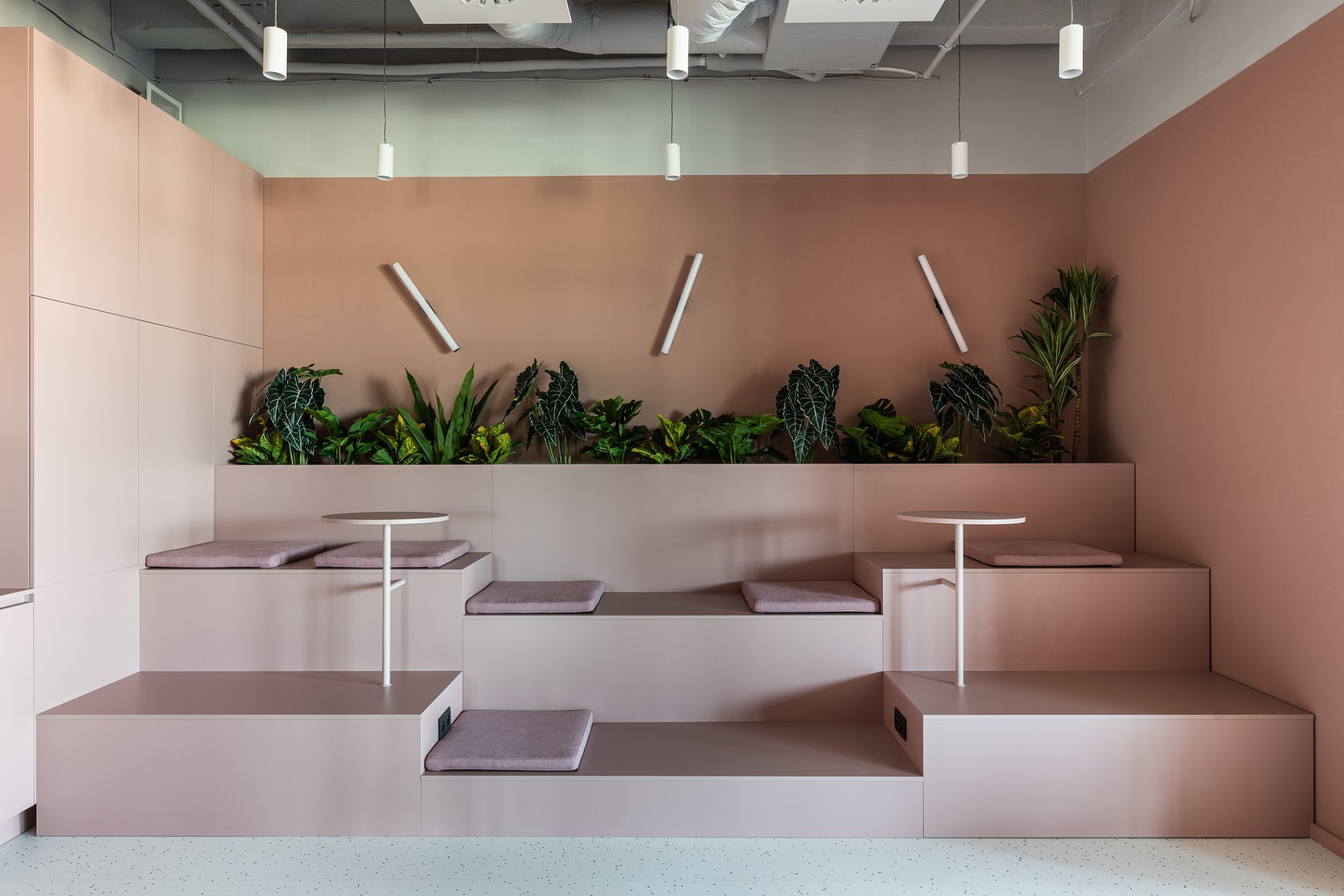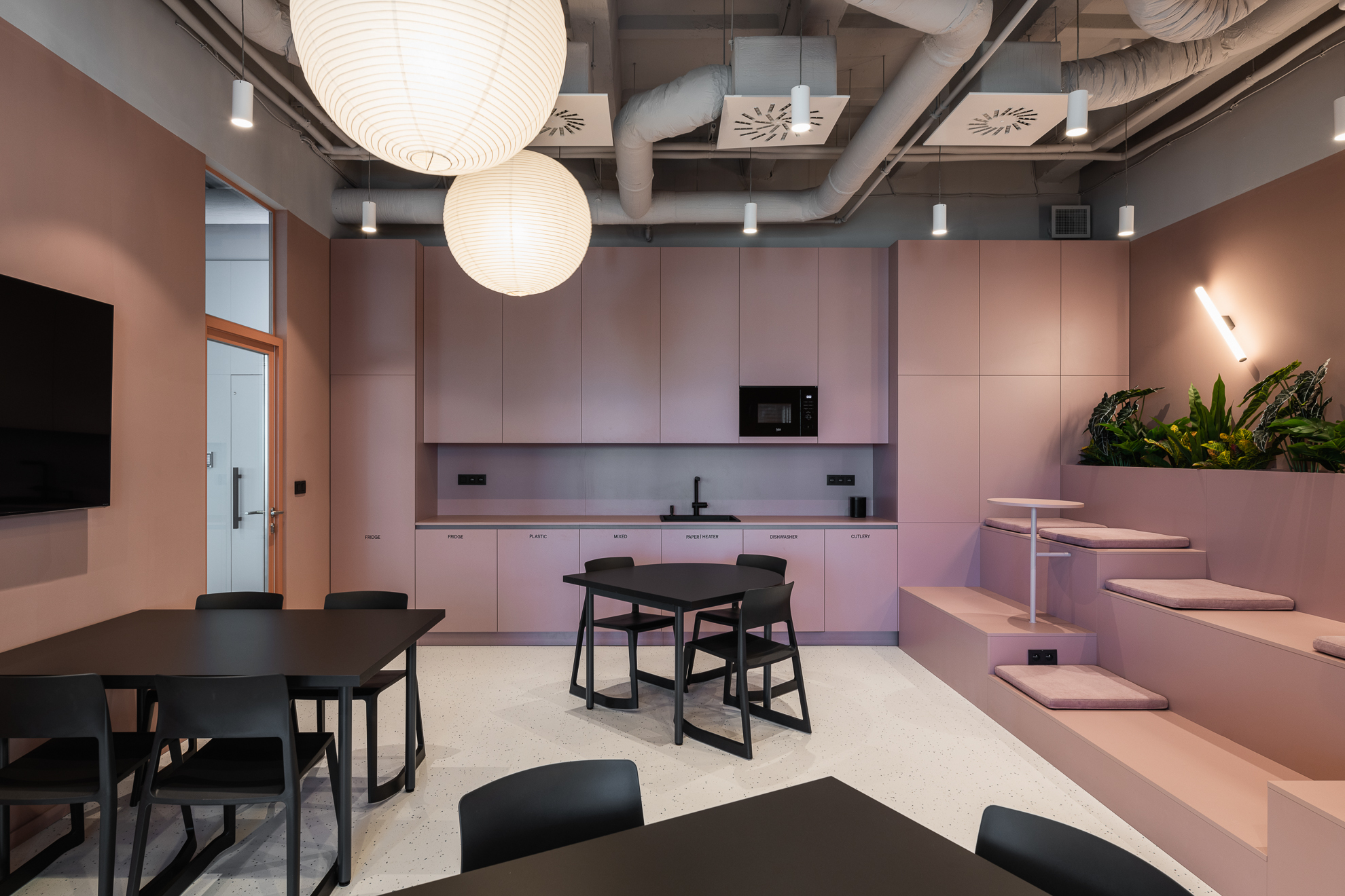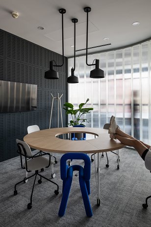 Neutrálne koncipovaná farebnosť open spaceu je v kontrastne s priestormi, ktoré majú komunitný charakter. Tichá zóna, kuchynka aj kreatívna zasadačka majú každá svoju dominantnú farbu resp. materiál. Napriek veľkým jednoliatym plochám, ktoré v priestore prevažujú, kancelárie pôsobia útulne vďaka použitiu mäkkých, akustických materiálov a prvkov.