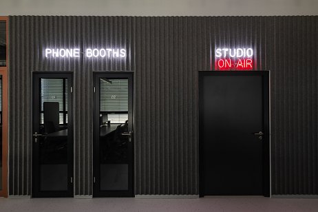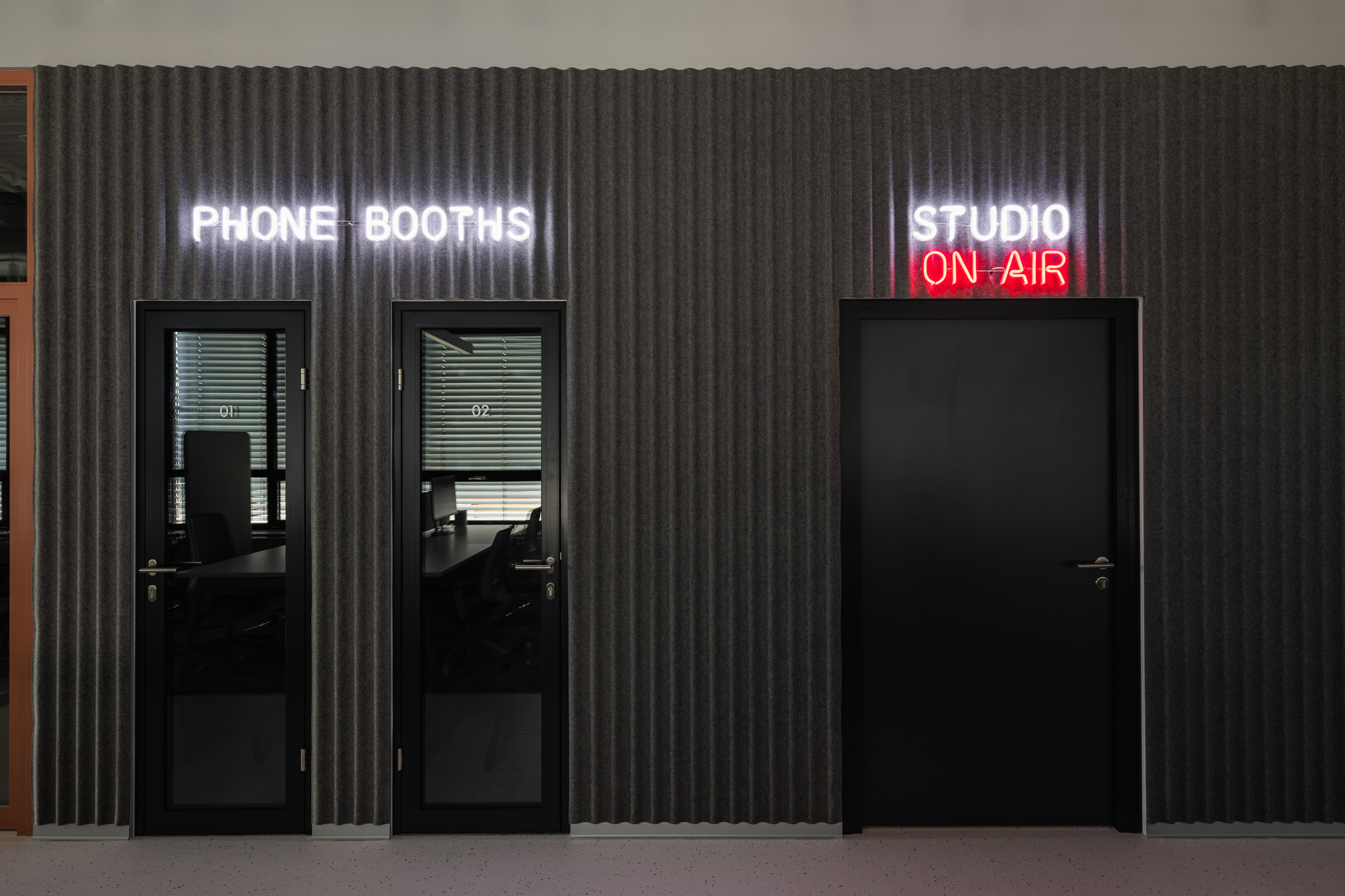 Box okolo jadra ukrýva zasadačku s obvodovým plášťom z kopilitu, ktorý prechádza až do časti kuchynky. Naň nadväzuje vlnitý obklad z merino vlny, za ktorým sa nachádzajú telefónne búdky a tiež štúdio.
