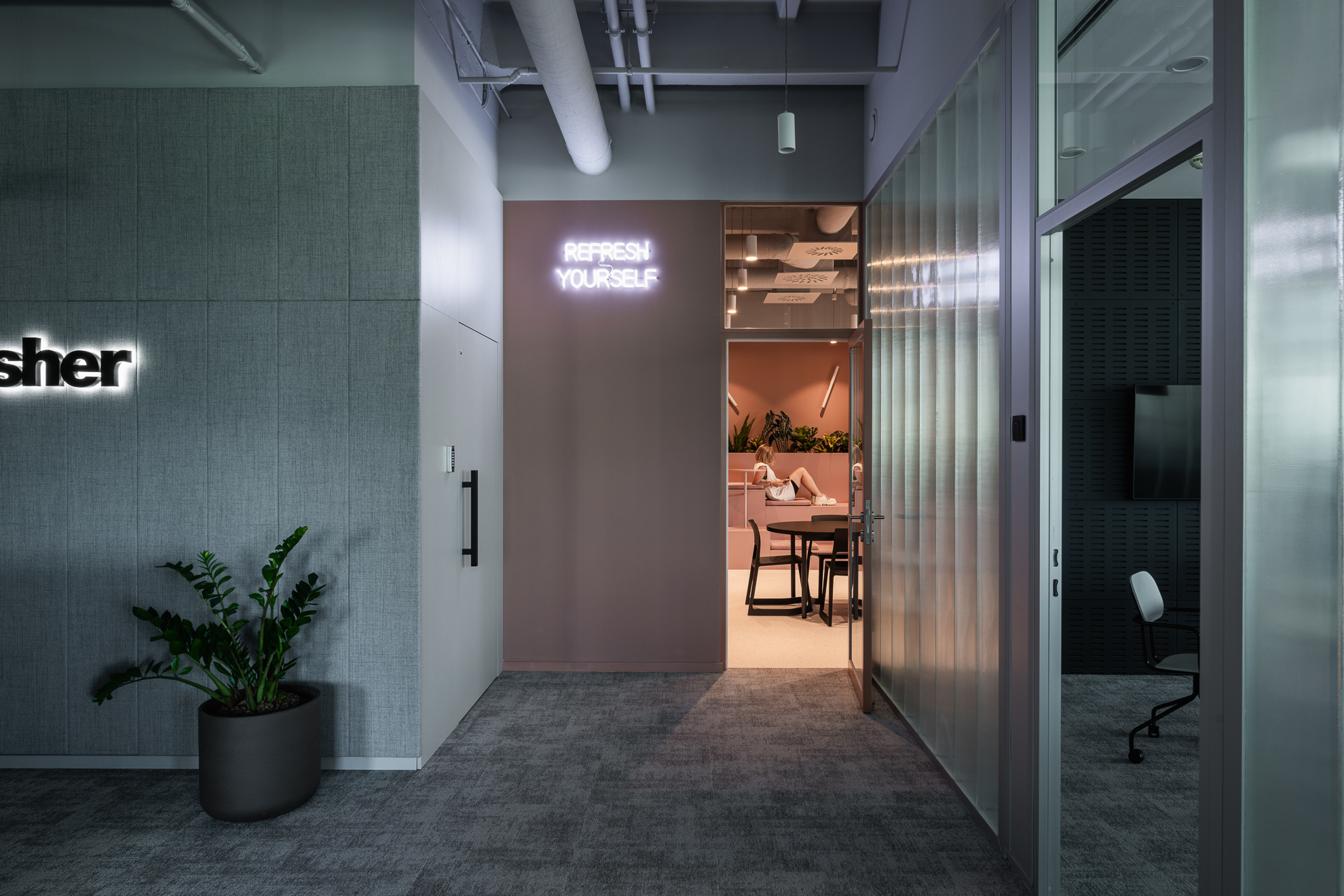 Projekt kancelárií pre Refresher odzrkadľuje identitu firmy, ktorej náplň práce je kreatívna s dôrazom na súčasné trendy a lifestyle.