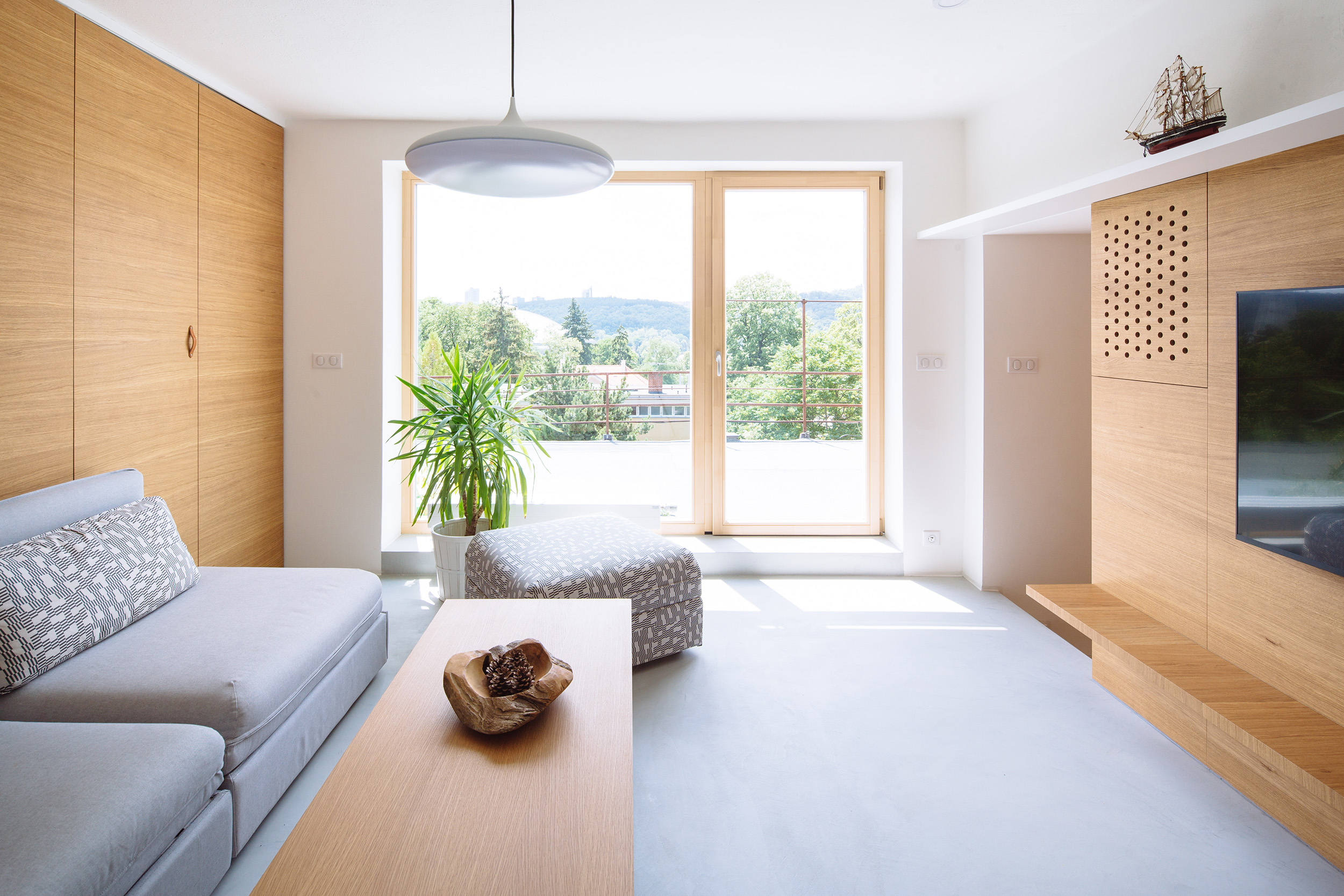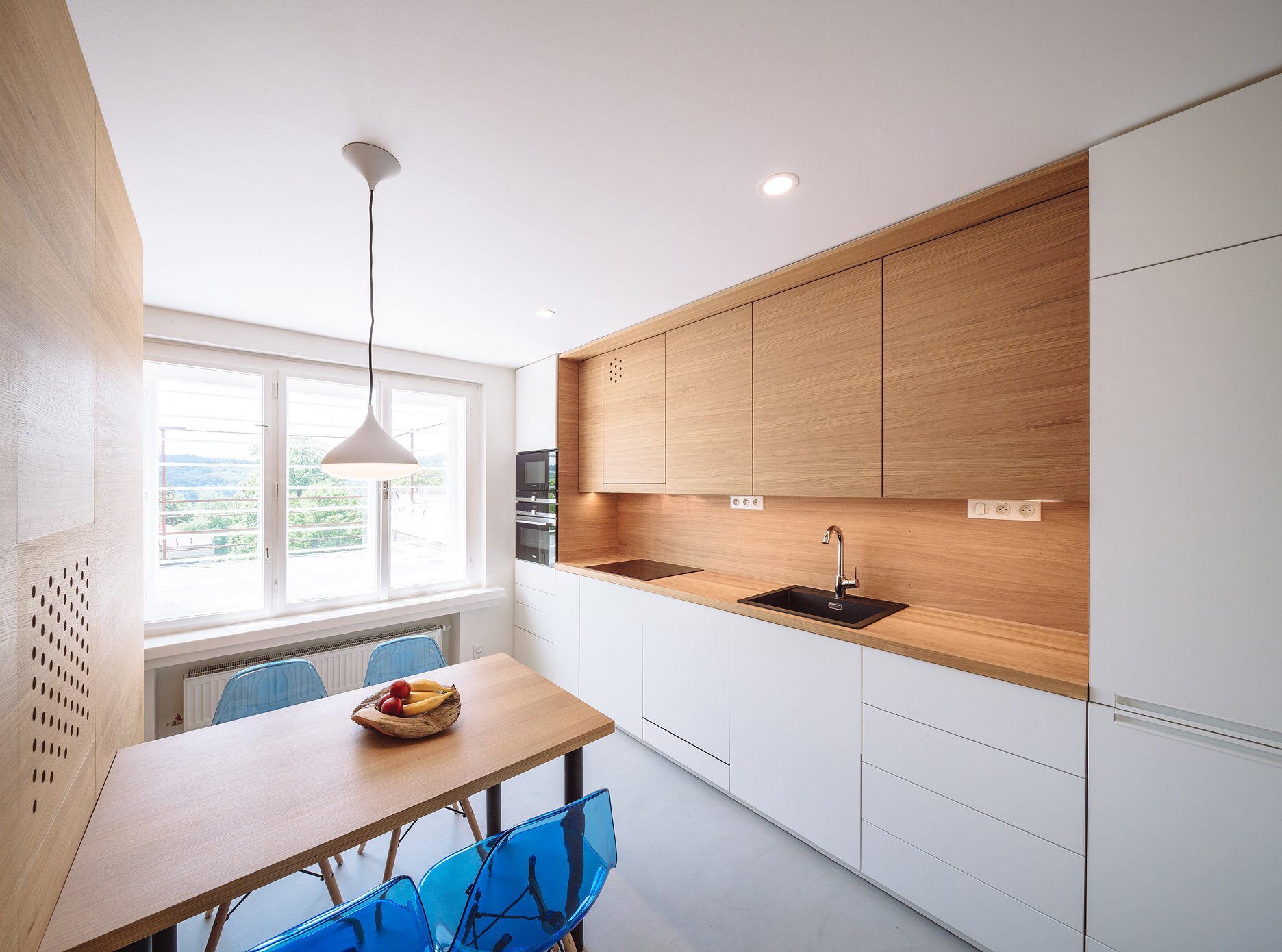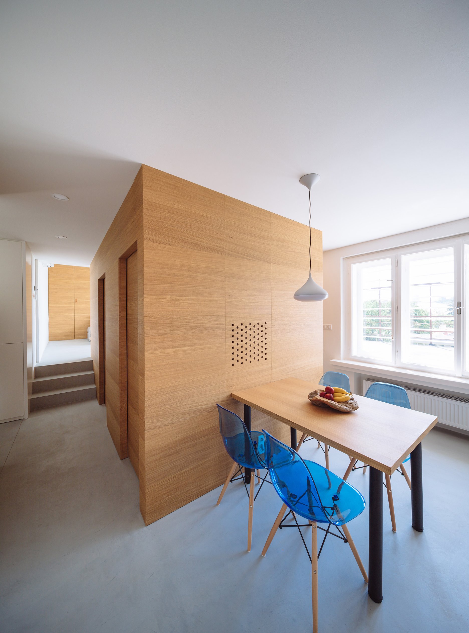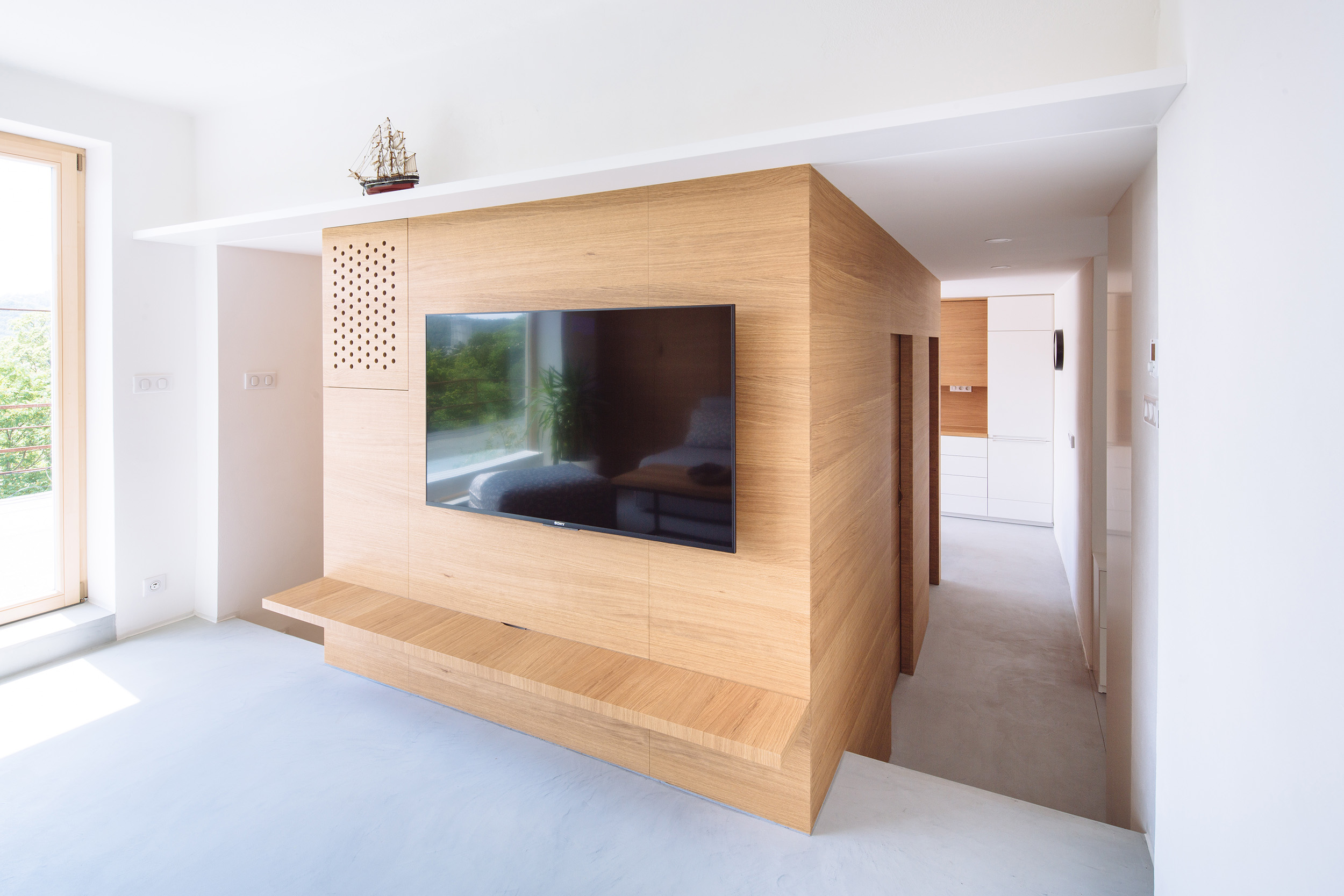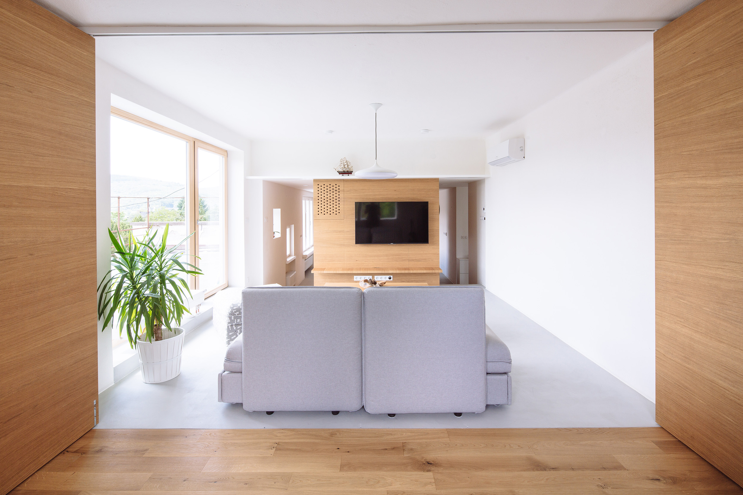 Stavebné úpravy riešili maximálne využitie priestoru vzhľadom na požiadavky investora. Boli odstránené nenosné priečky, v centre dispozície pribudol vložený drevený box s hygienickým zázemím. Vybúraním časti nosnej steny došlo k prepojeniu kuchyne s jedálňou a obývačkou, vznikol vzdušnejší a svetlejší priestor. Obývacia izba je navyše s terasou prepojená novým francúzskym oknom, umiestneným na južnej fasáde.