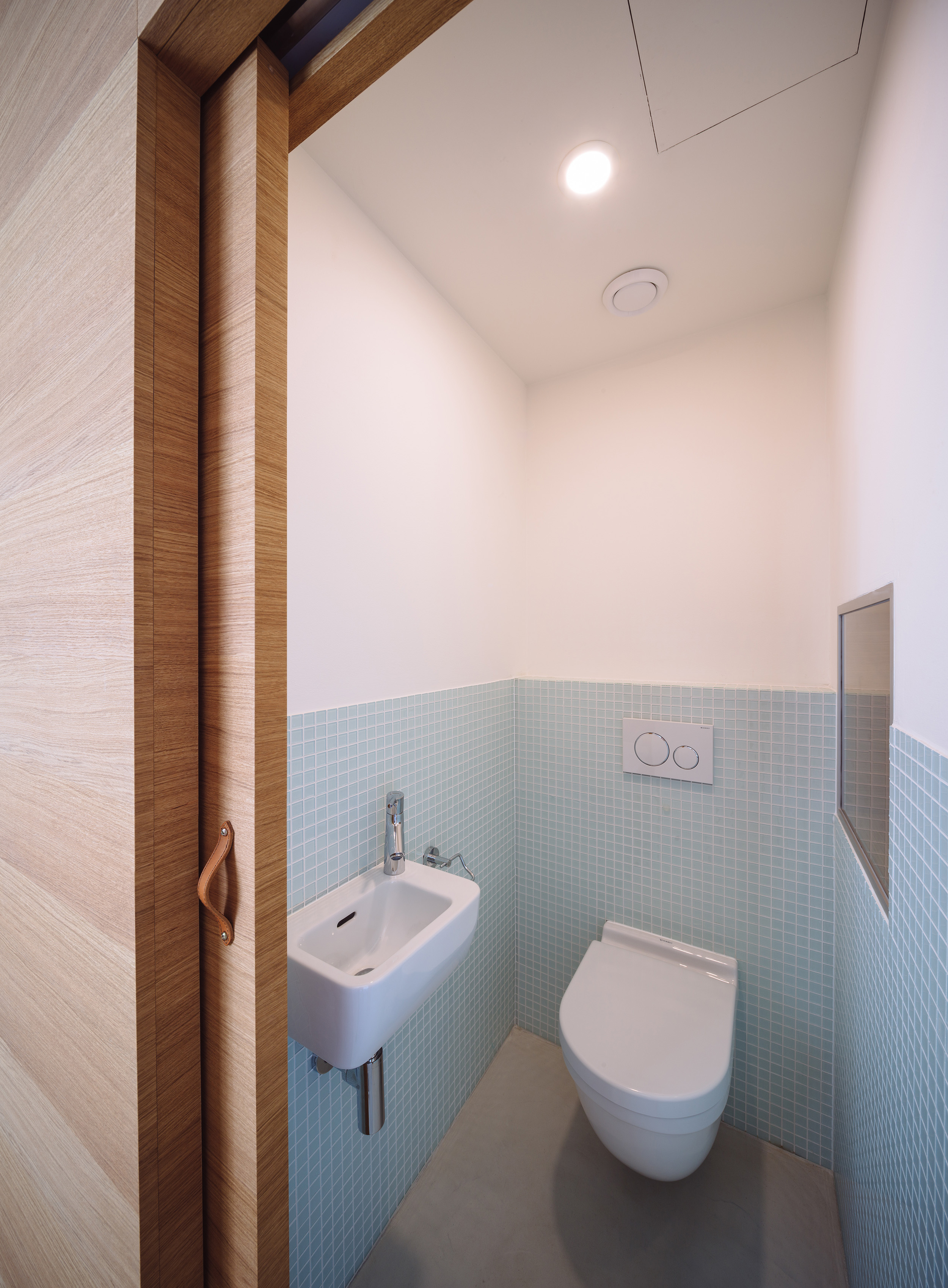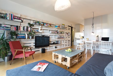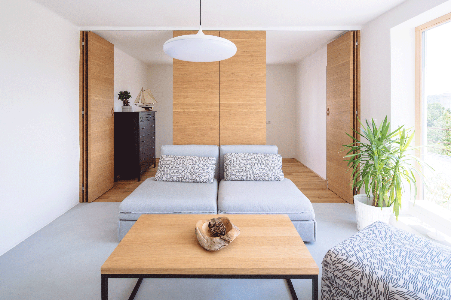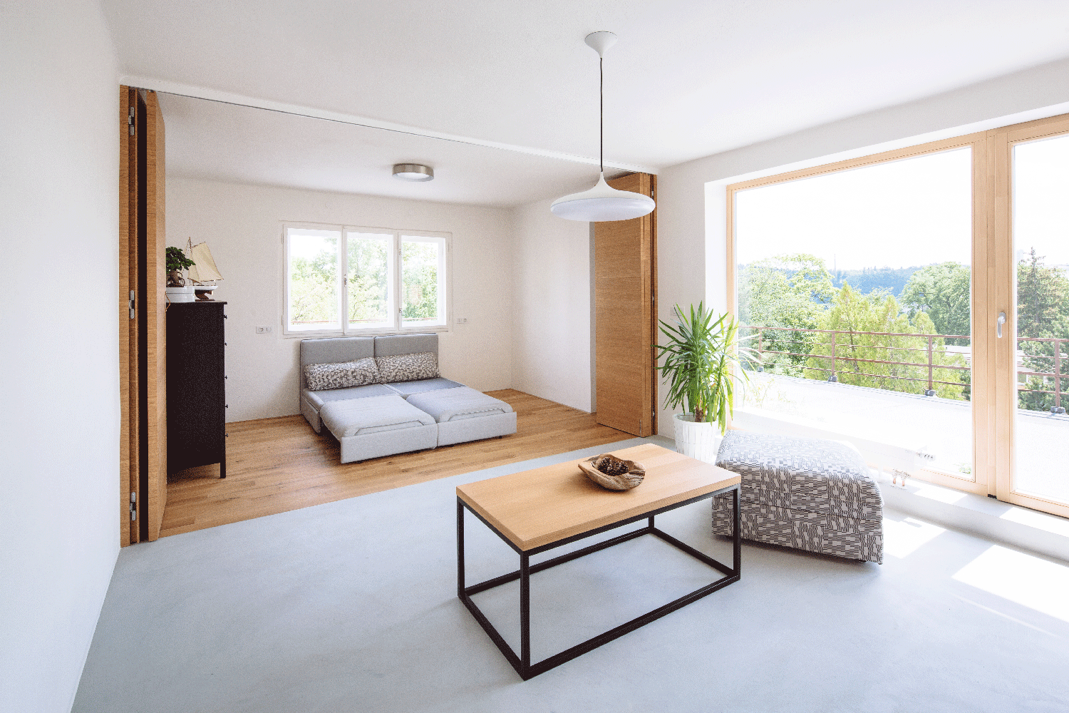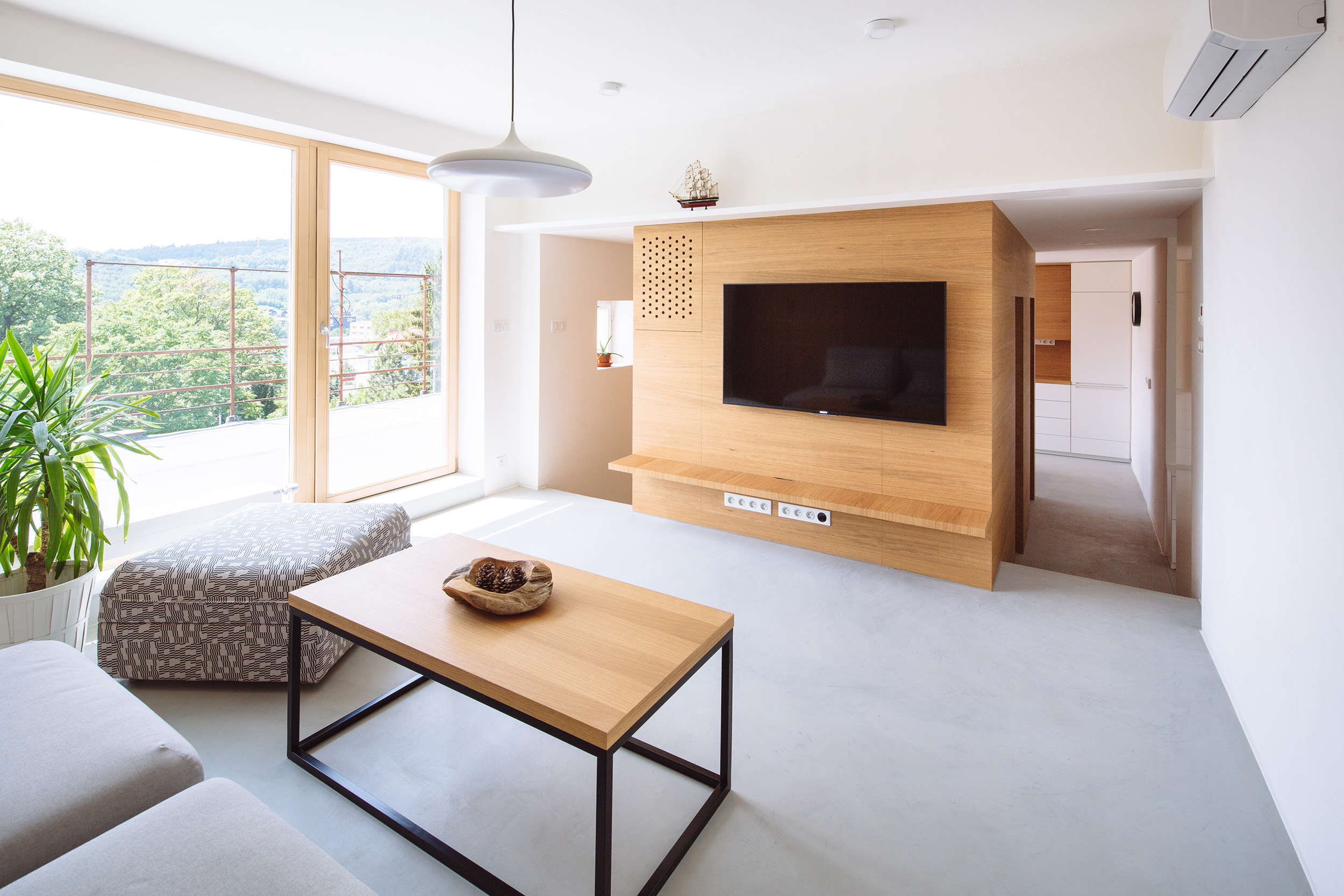 Stavebné úpravy riešili maximálne využitie priestoru vzhľadom na požiadavky investora. Boli odstránené nenosné priečky, v centre dispozície pribudol vložený drevený box s hygienickým zázemím. Vybúraním časti nosnej steny došlo k prepojeniu kuchyne s jedálňou a obývačkou, vznikol vzdušnejší a svetlejší priestor. Obývacia izba je navyše s terasou prepojená novým francúzskym oknom, umiestneným na južnej fasáde.