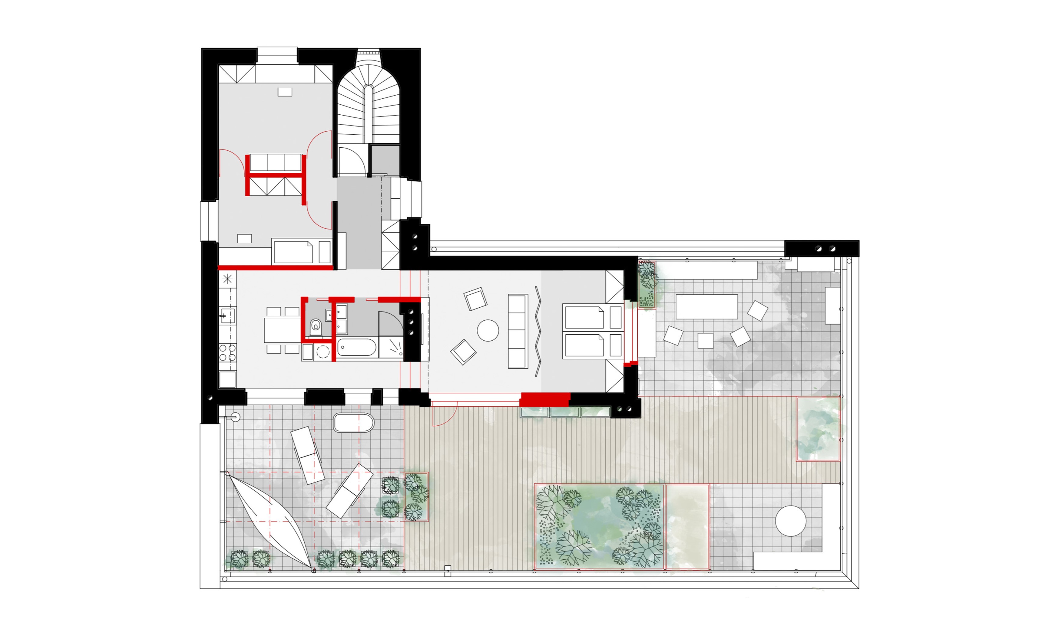 V ďaľšej etape je plánovaná rekonštrukcia rozsiahlej strešnej terasy, ako odkaz na pôvodný Wiesnerov zámer. Realizovať by sa mali slnečné kúpeľe, záhony s extenzívnou a intenzívnou zeleňou, posedenie s grilom a detský kútik. V ďalšej fáze bude hmota prístavby zvýraznená popínavými rastlinami. Podtrhnú tak historickú premenu domu s vrstvením dielčích zásahov. Hlavnou myšlienkou bolo navrhnúť „dom so záhradou na streche".