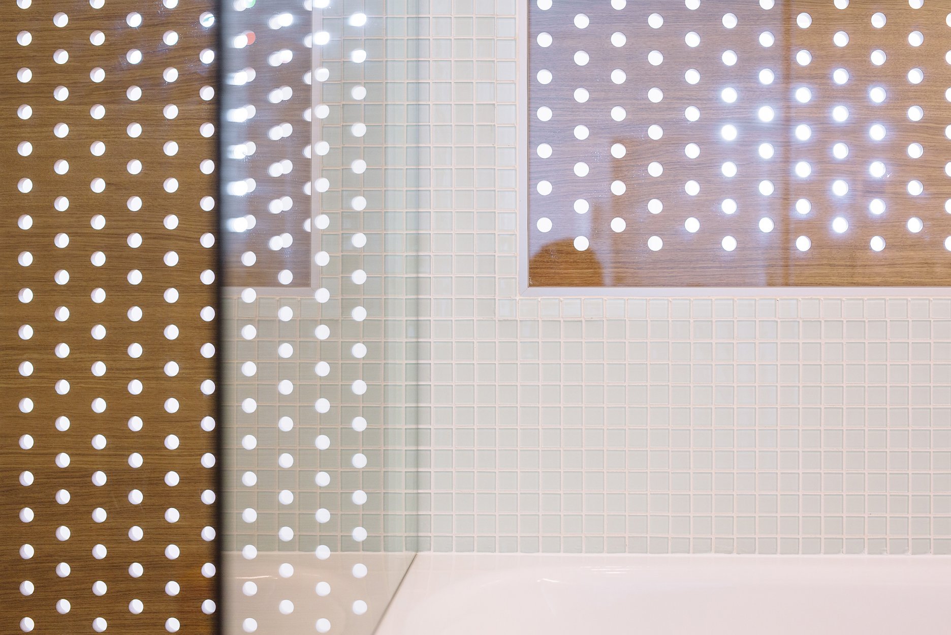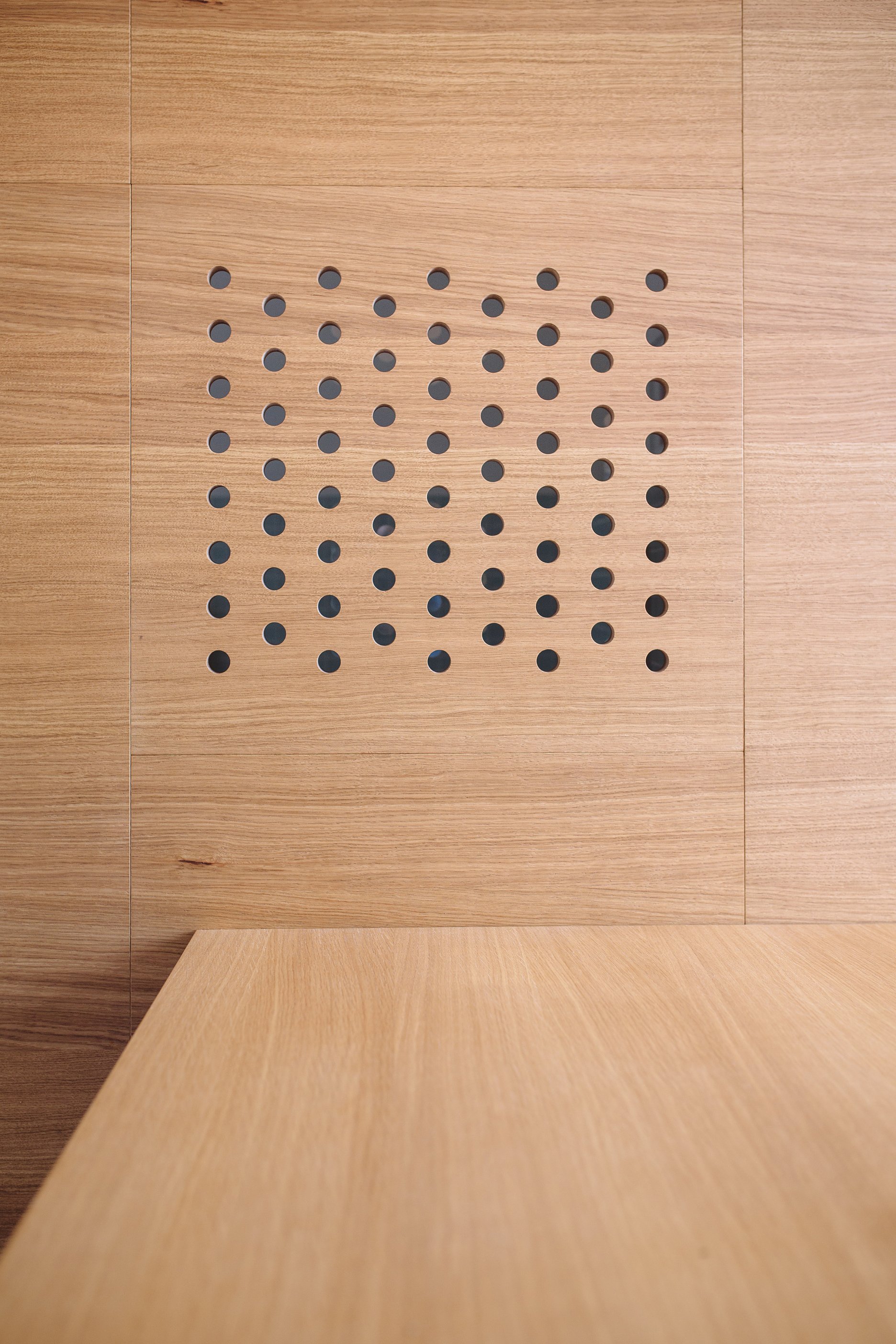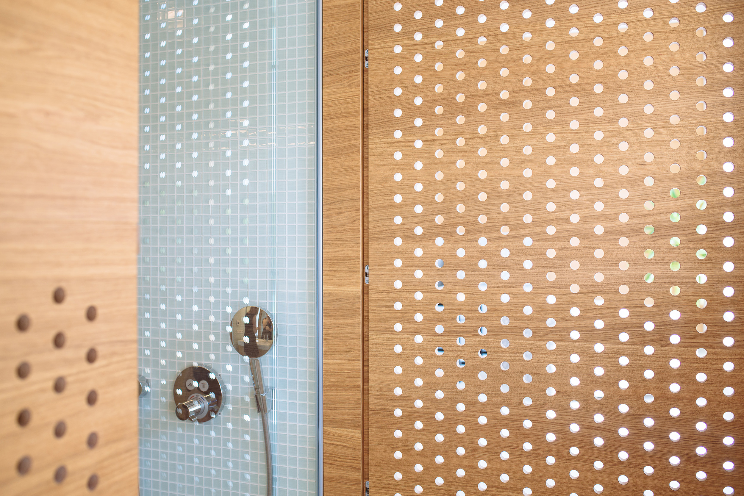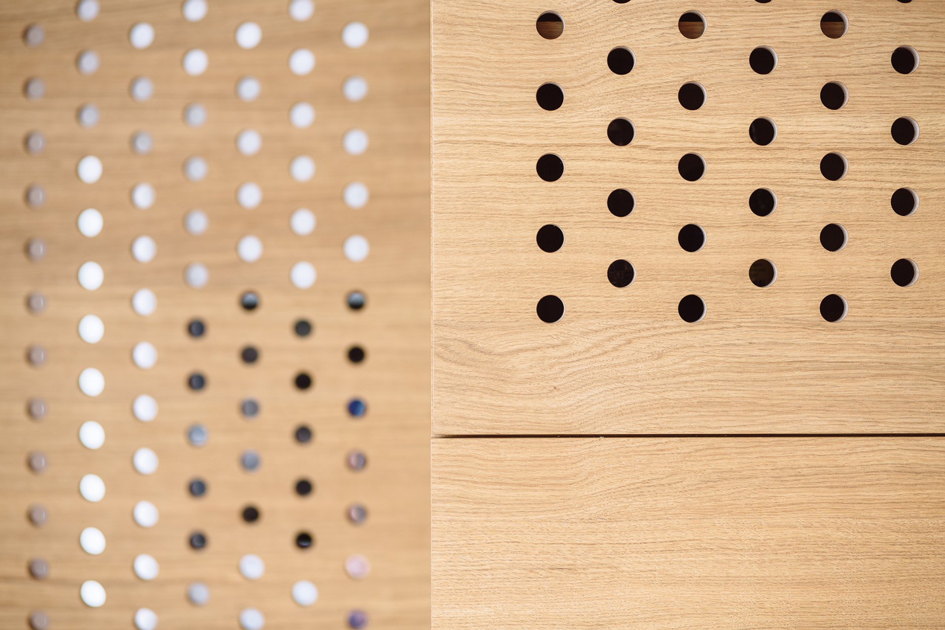 Ústredným motívom, opakujúcim sa v celom byte, je systém drevených obkladov s čiastočnou perforáciou. Umožňuje decentné presvetlenie interiéru, bez toho aby bol narušený pocit súkromia.