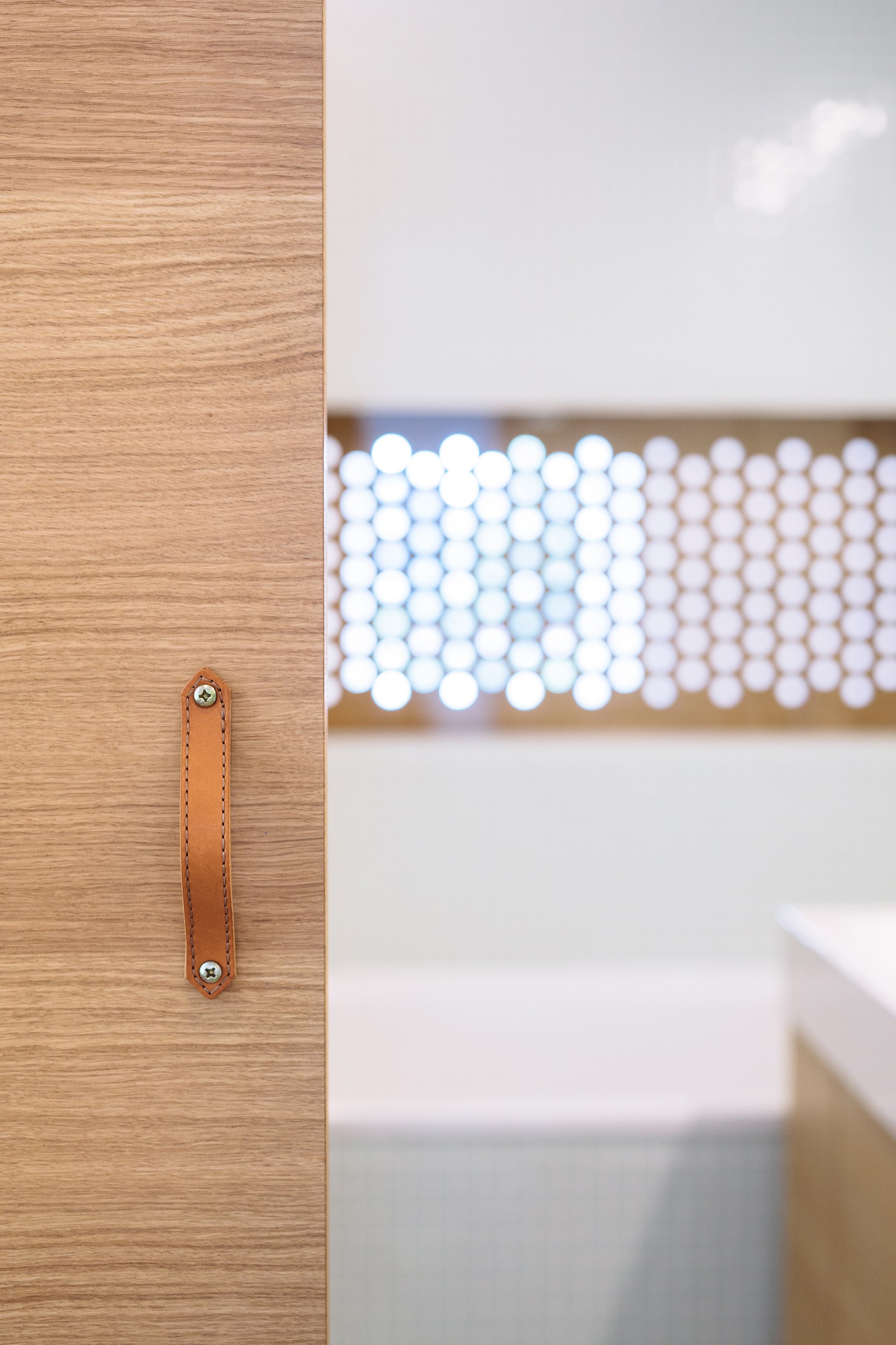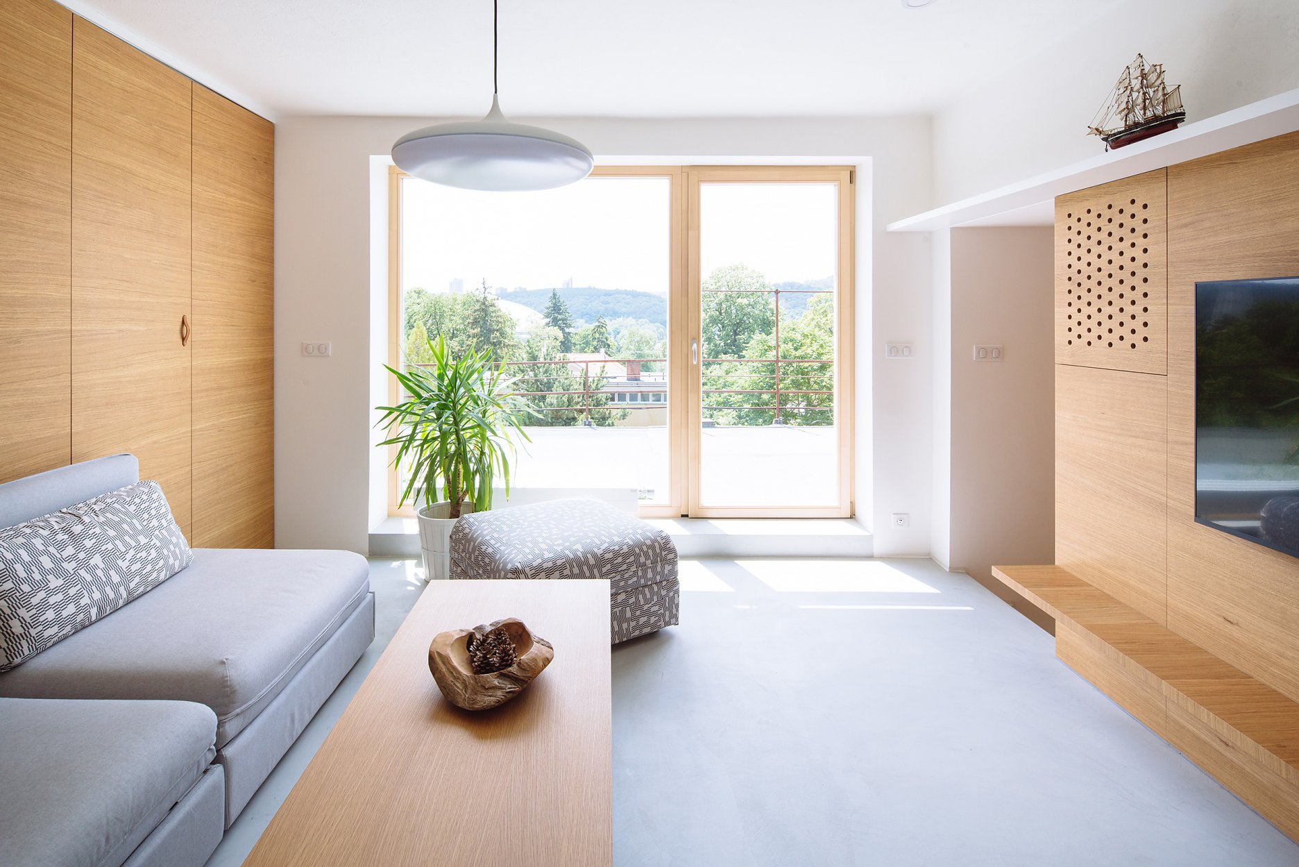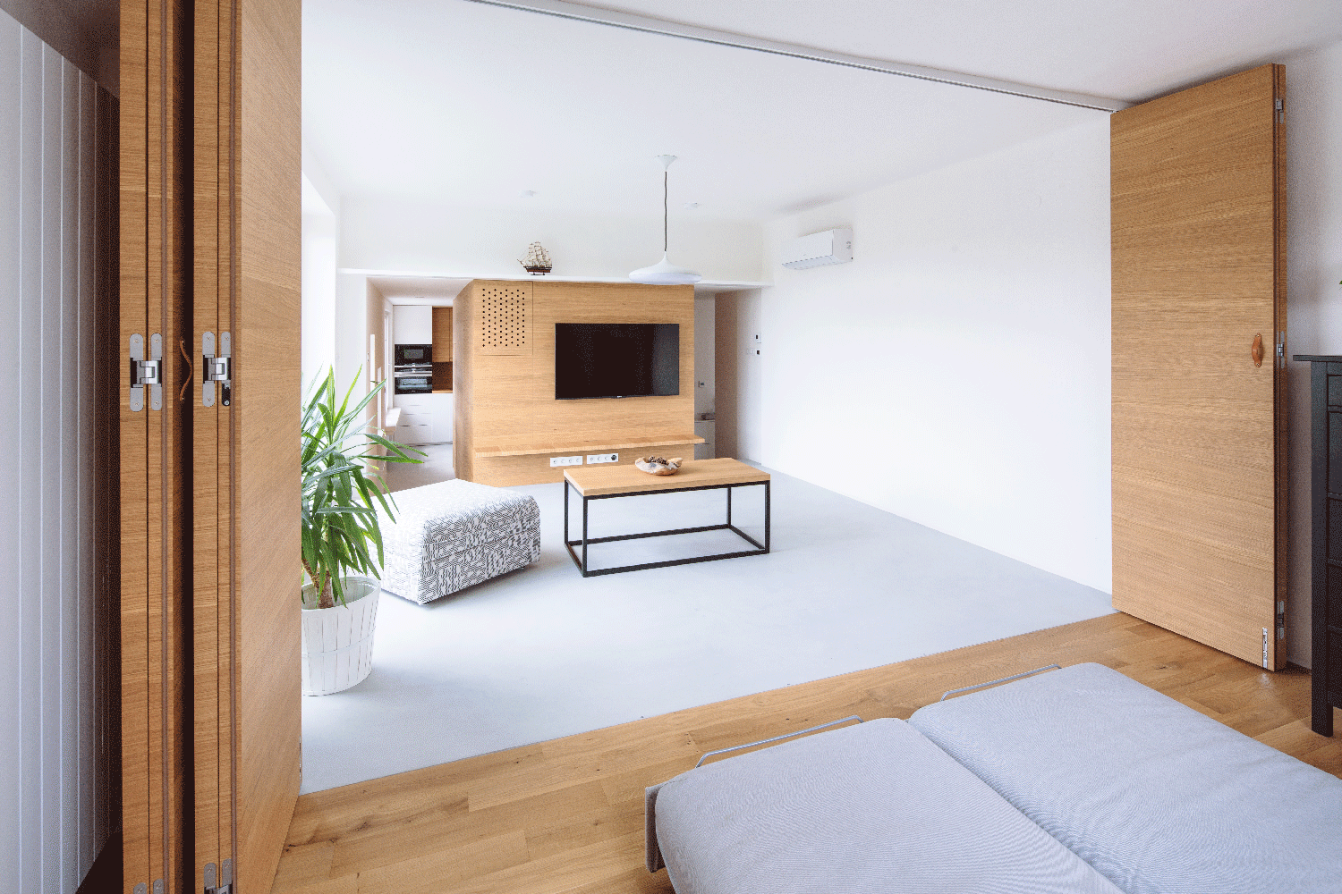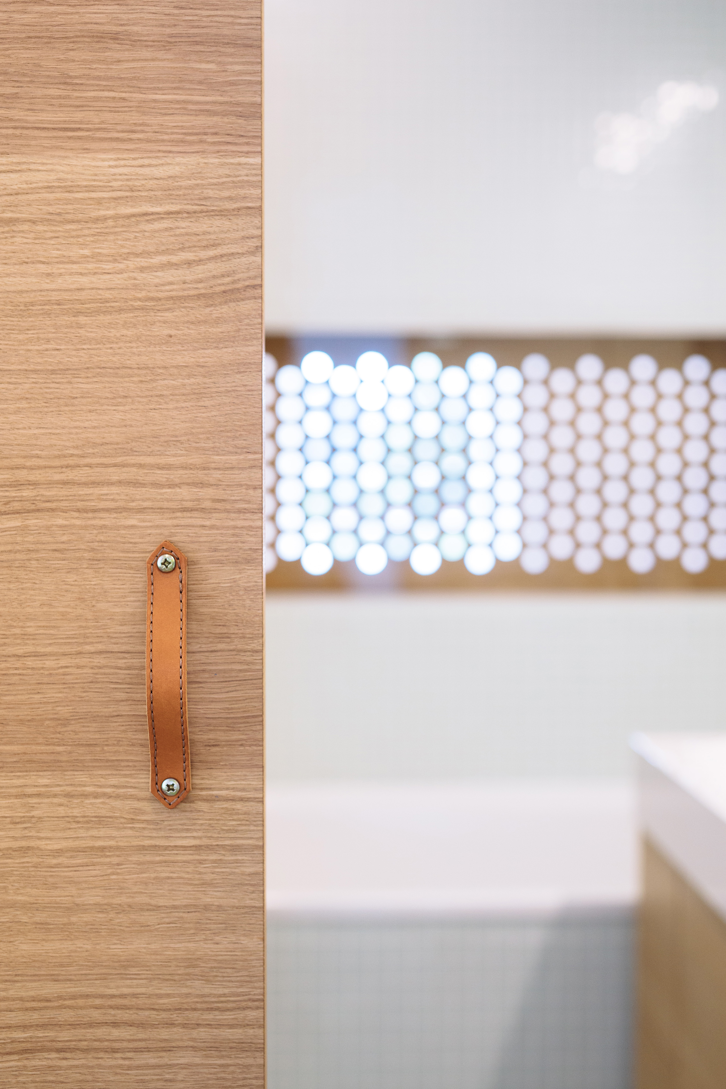 Ústredným motívom, opakujúcim sa v celom byte, je systém drevených obkladov s čiastočnou perforáciou. Umožňuje decentné presvetlenie interiéru, bez toho aby bol narušený pocit súkromia.