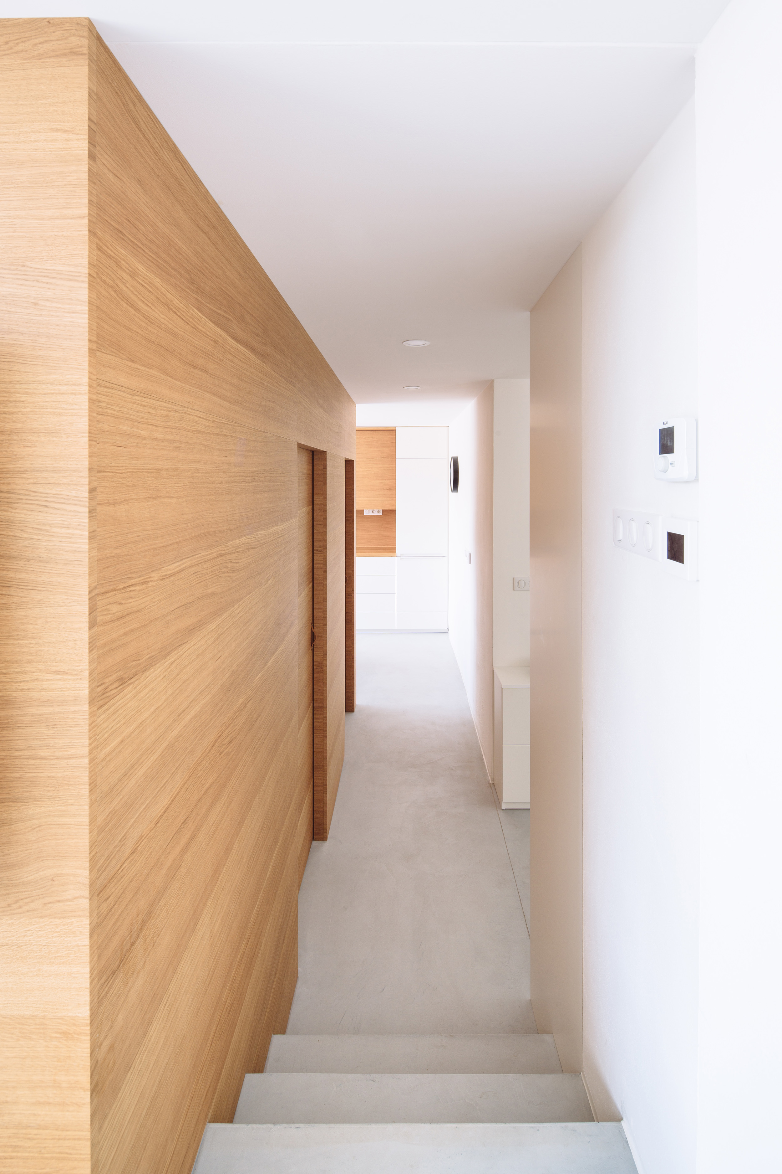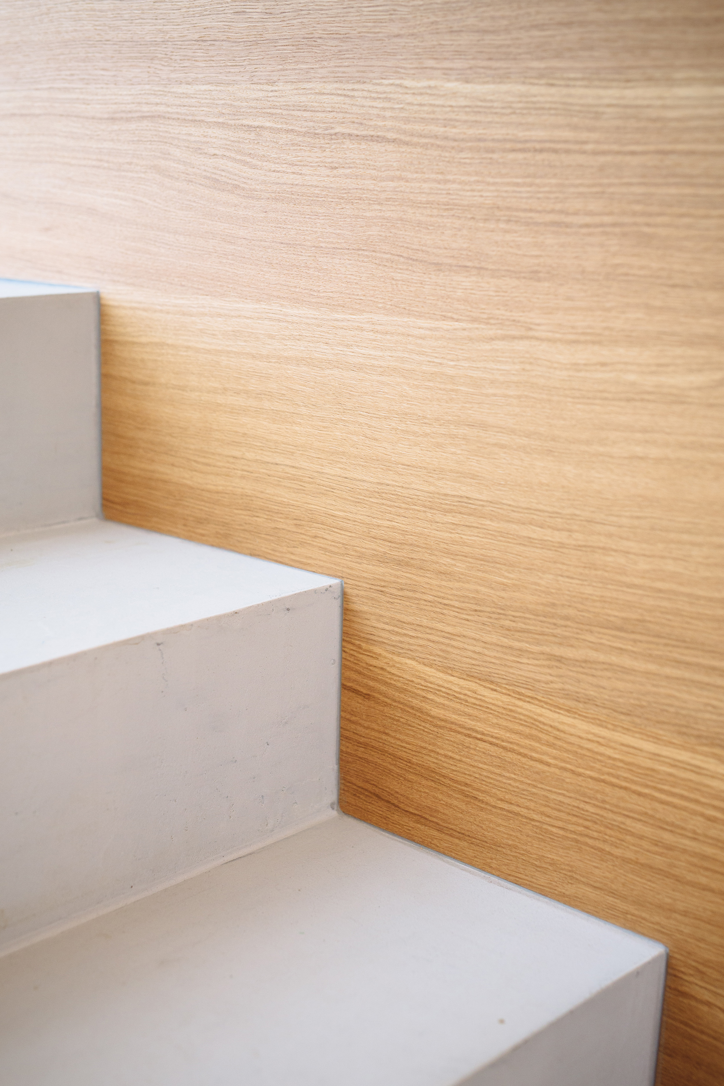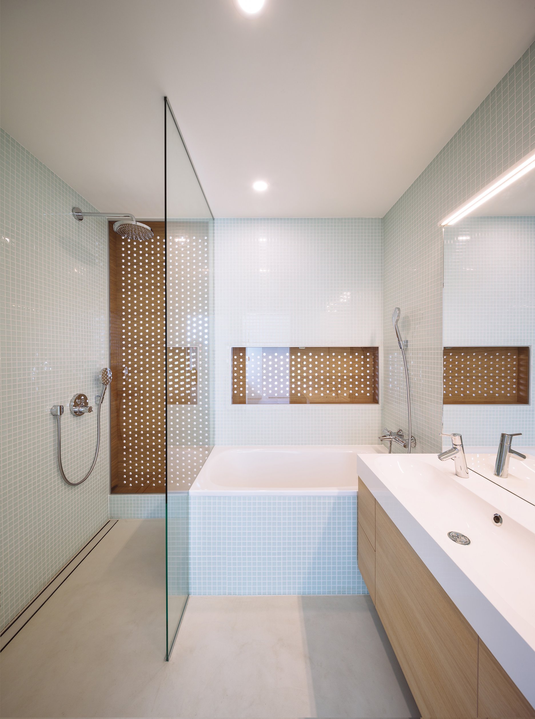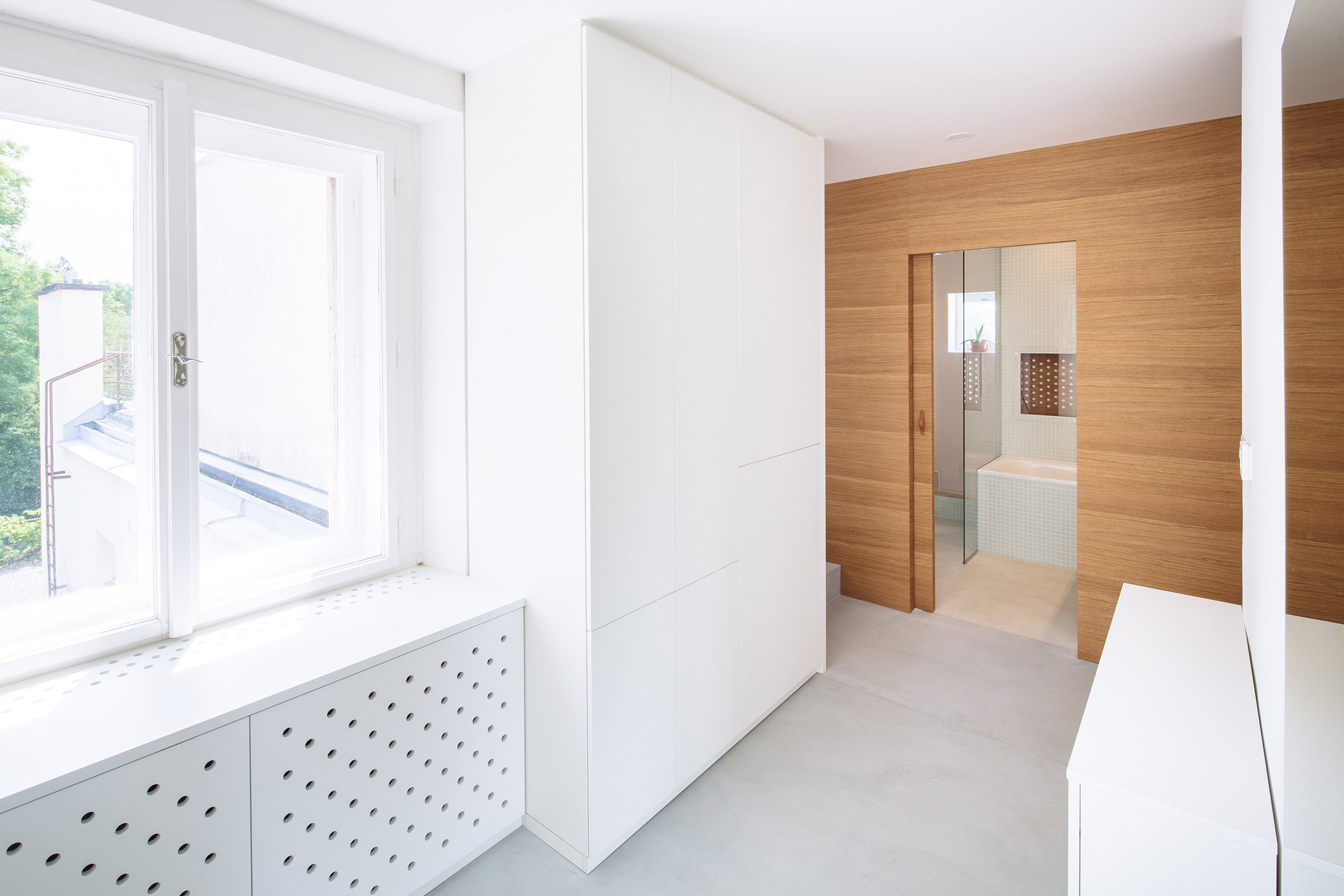 Ústredným motívom, opakujúcim sa v celom byte, je systém drevených obkladov s čiastočnou perforáciou. Umožňuje decentné presvetlenie interiéru, bez toho aby bol narušený pocit súkromia.