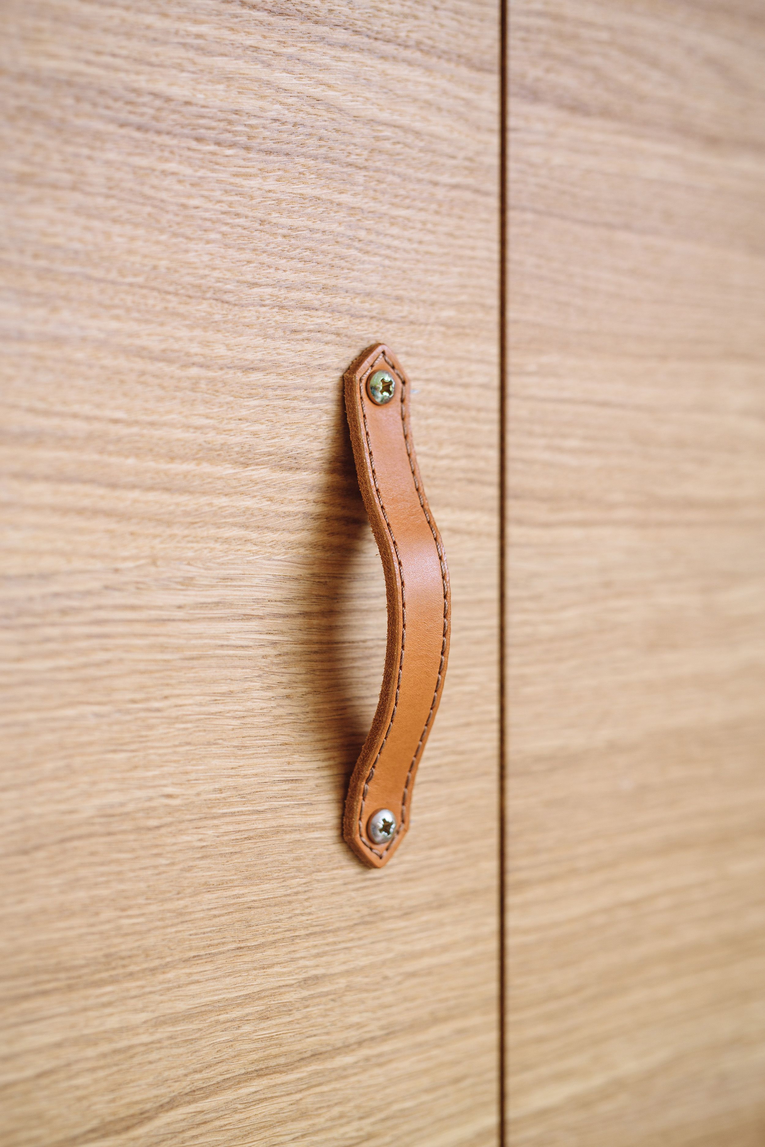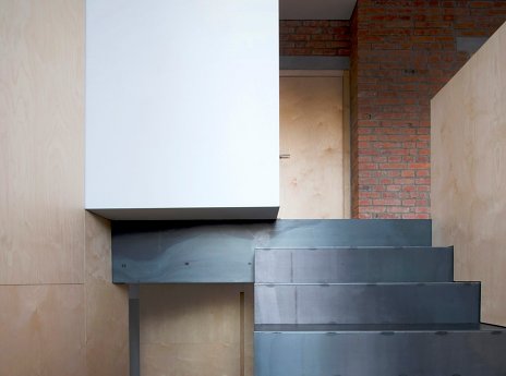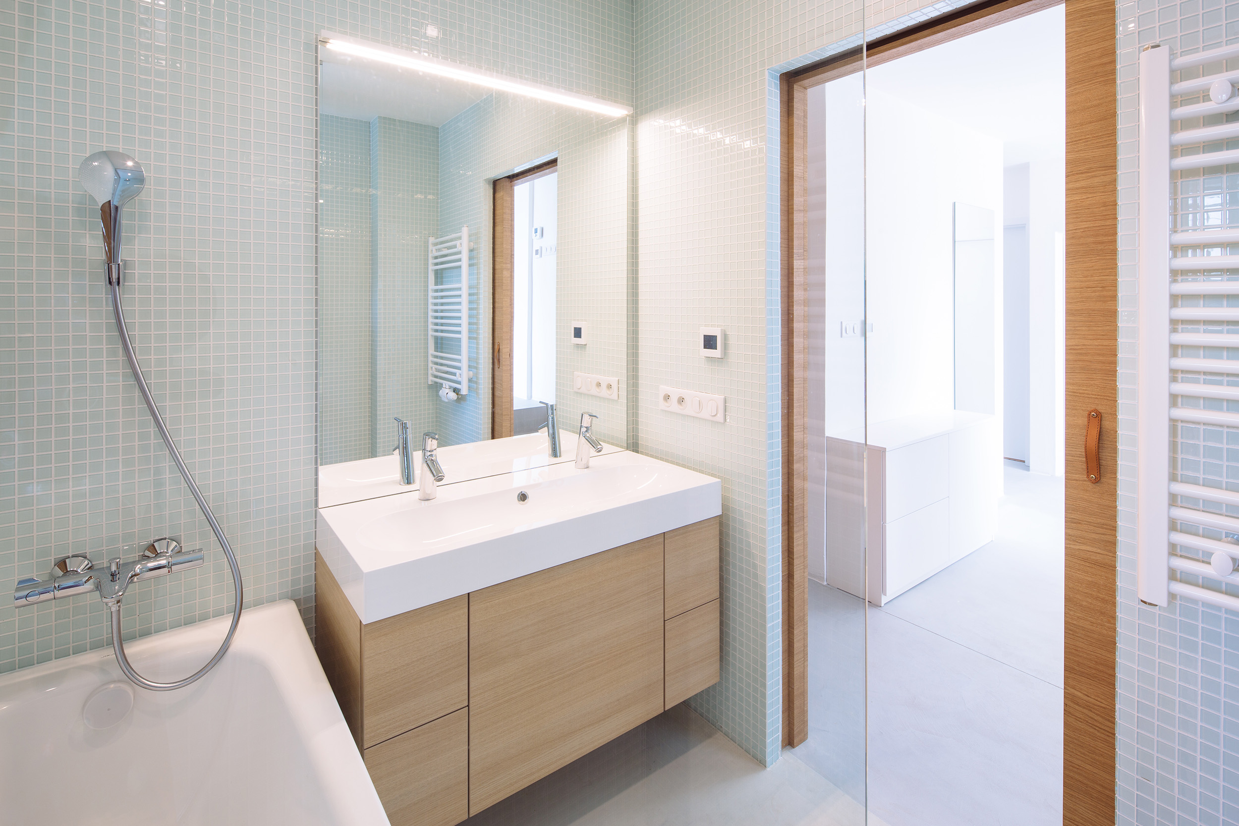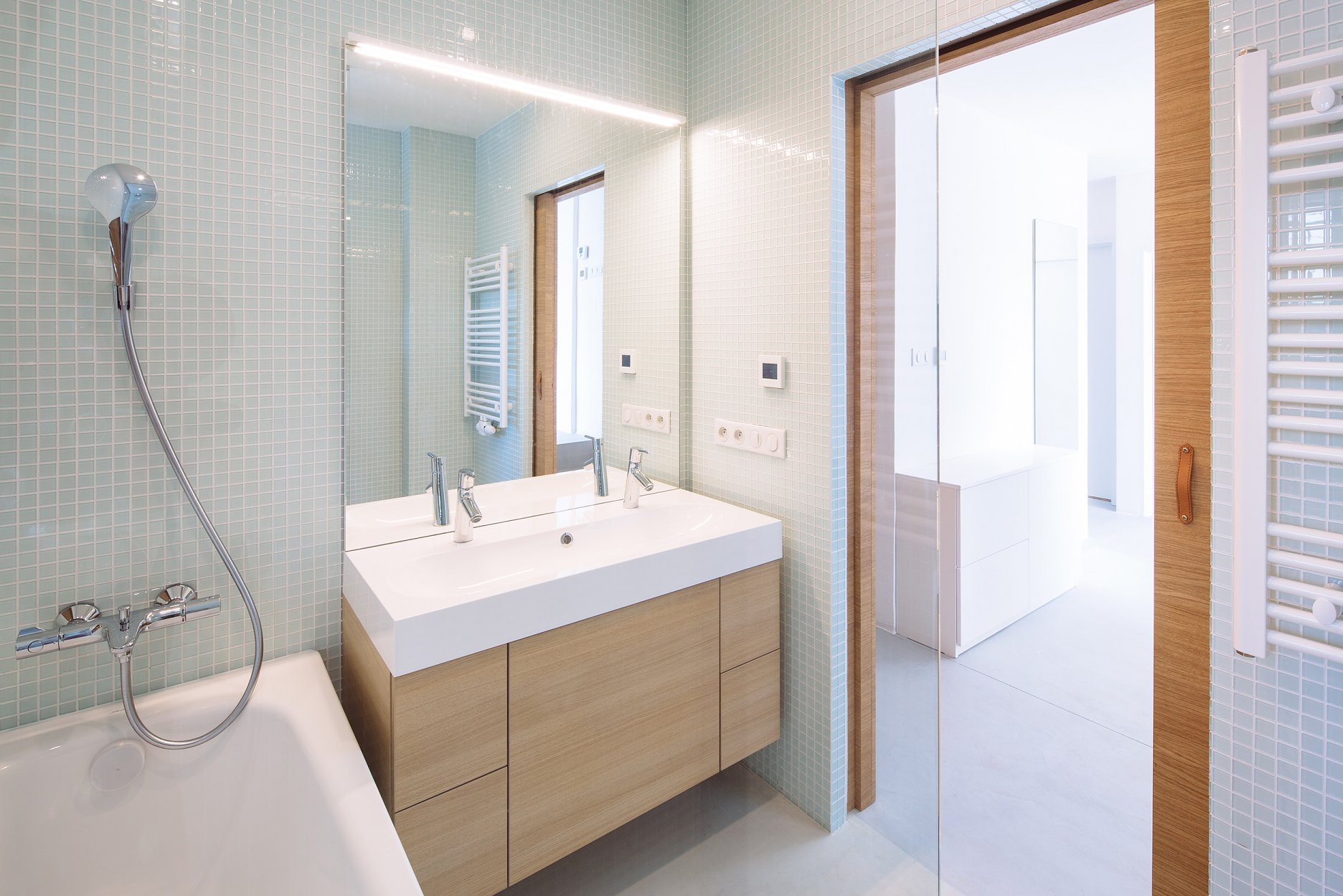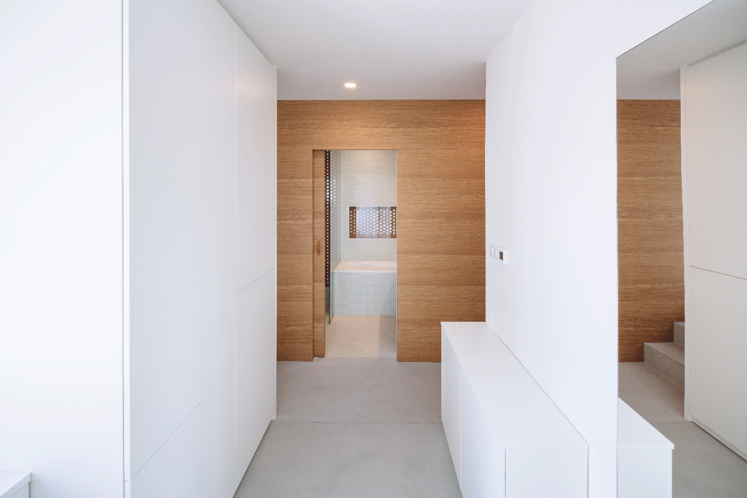 Ústredným motívom, opakujúcim sa v celom byte, je systém drevených obkladov s čiastočnou perforáciou. Umožňuje decentné presvetlenie interiéru, bez toho aby bol narušený pocit súkromia.