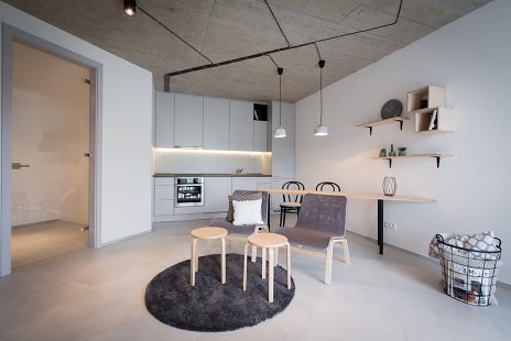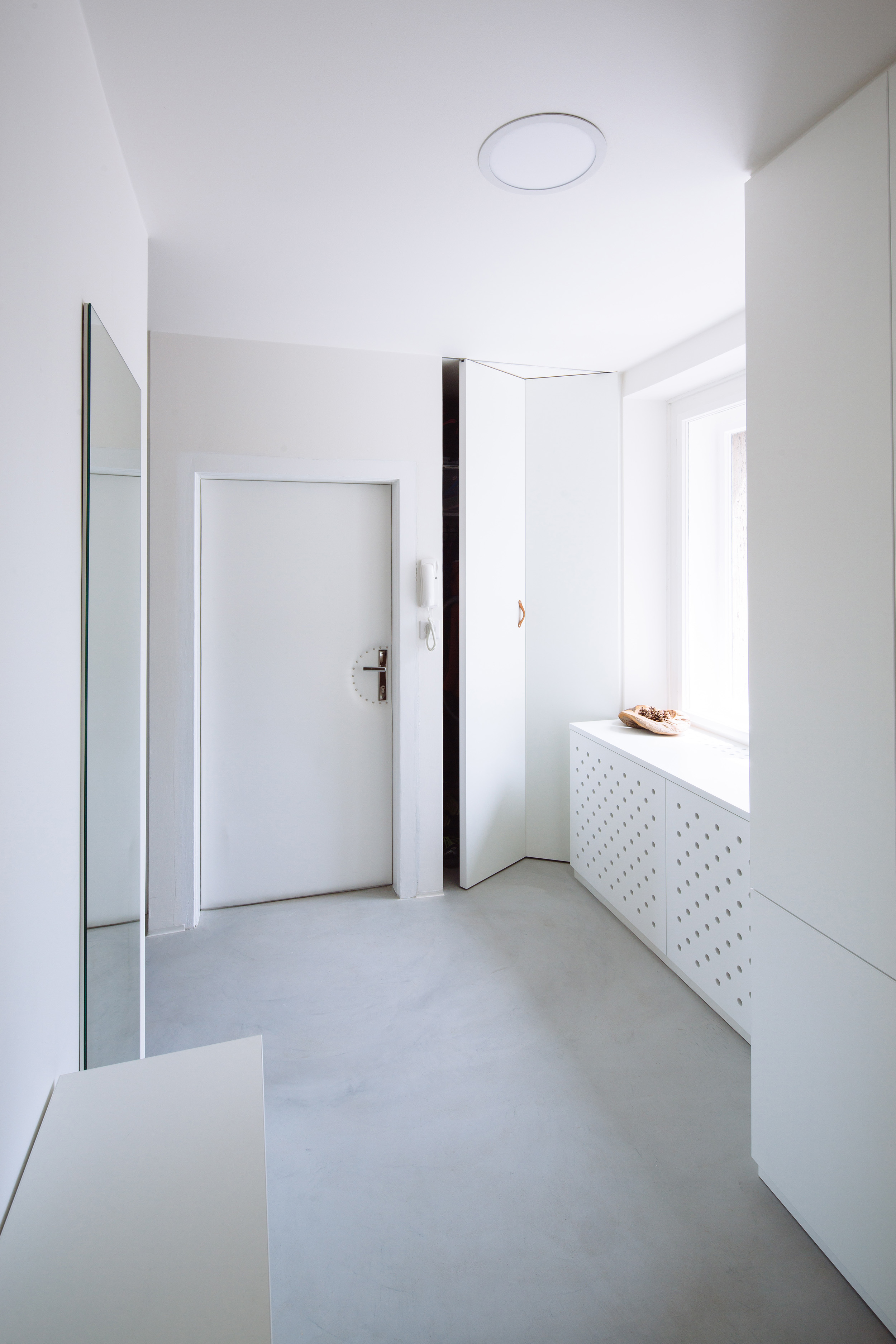 Pôvodný byt mal dve malé izby, hygienické zázemie, kuchyňu a obývačku. Požiadavkou klienta bola zmena dispozície na 4+KK. Preto koncept v mnohých častiach pracuje s variáciou dispozície. Predovšetkým vo východnom krídle, v ktorom je možné drevenou skladacou stenou rozdeliť miestnosť na obývačku a spálňu. V Južnejužnej chodbe medzi kuchyňou a obývacou miestnosťou je možné otvorením perforovaných kúpeľňových dverí vytvoriť miestnosť pre domáce práce. Každá pôvodná nika a voľné miesto boli využité ako úložné priestory.