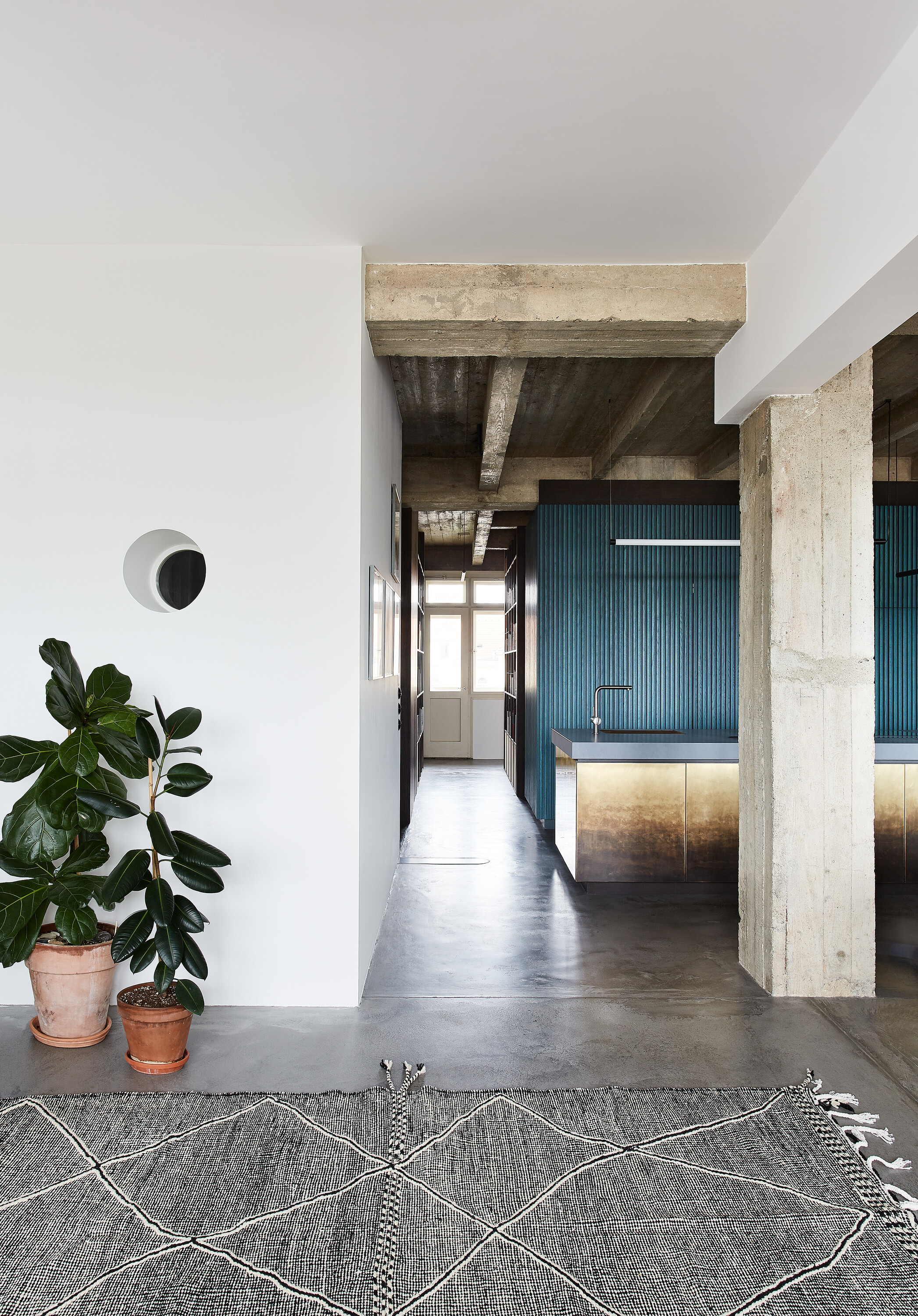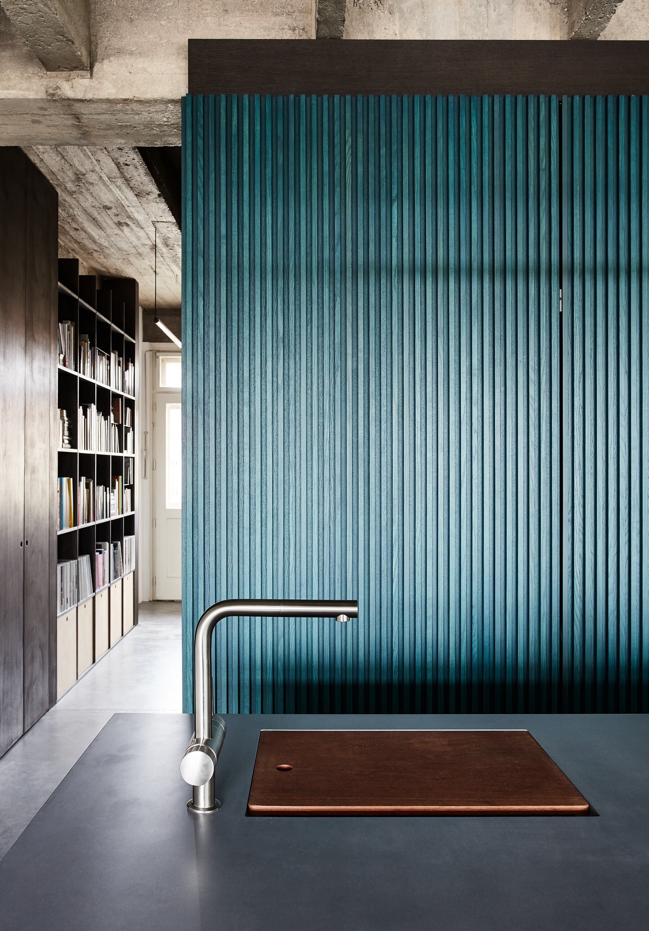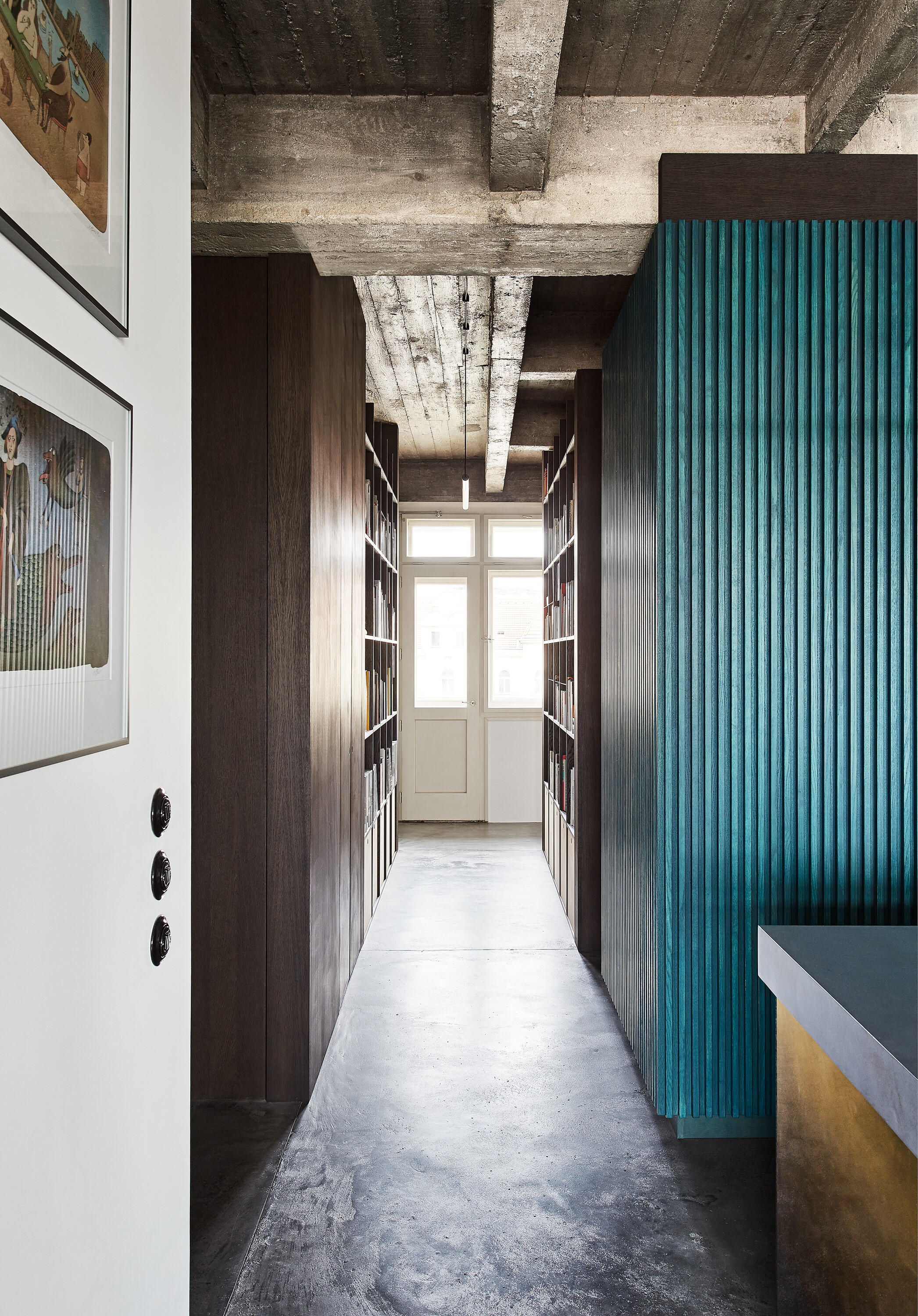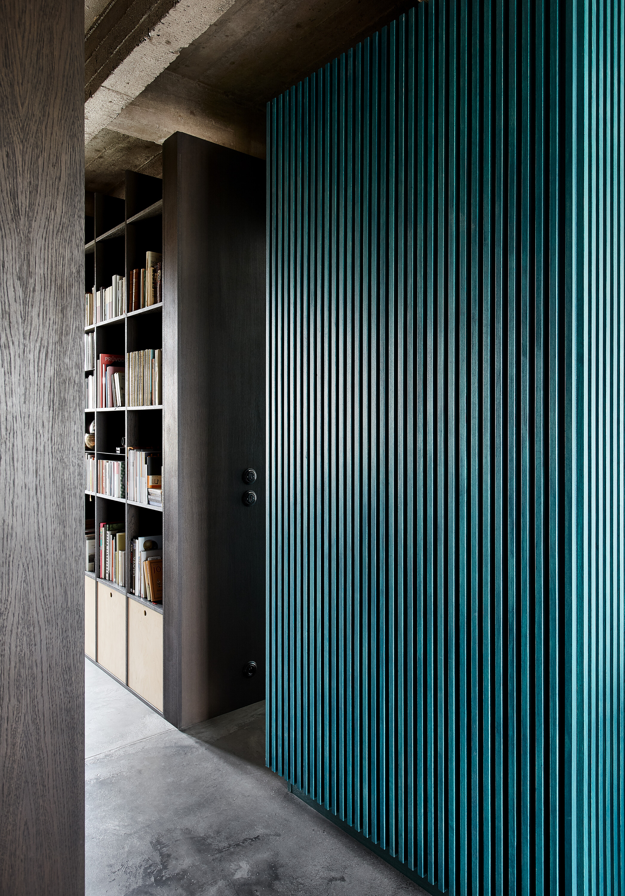 Zo vstupných priestorov je priamo prístupná malá technická miestnosť, rovnako ako dvojica vstavaných šatníkových skríň. Jedna je zakomponovaná v tmavom obložení, ktoré za rohom prechádza do knižnice. Druhá tvorí súčasť spomínaného zeleného boxu. Centrom bytu je kuchyňa, s ostrovom obloženým patinovanými mosadznými panelmi a pracovnou plochou z betónu. V doske ostrovu sú dômyselne schované prestupy k nádobám triedeného odpadu. Spálňa sa nachádza za zeleným boxom. Má tri vstupy. Čelo postele je prisadené k pôvodnému mohutnému komínovému telesu. Spálňu a hlavnú kúpeľňu oddeľuje priechodná knižnica.