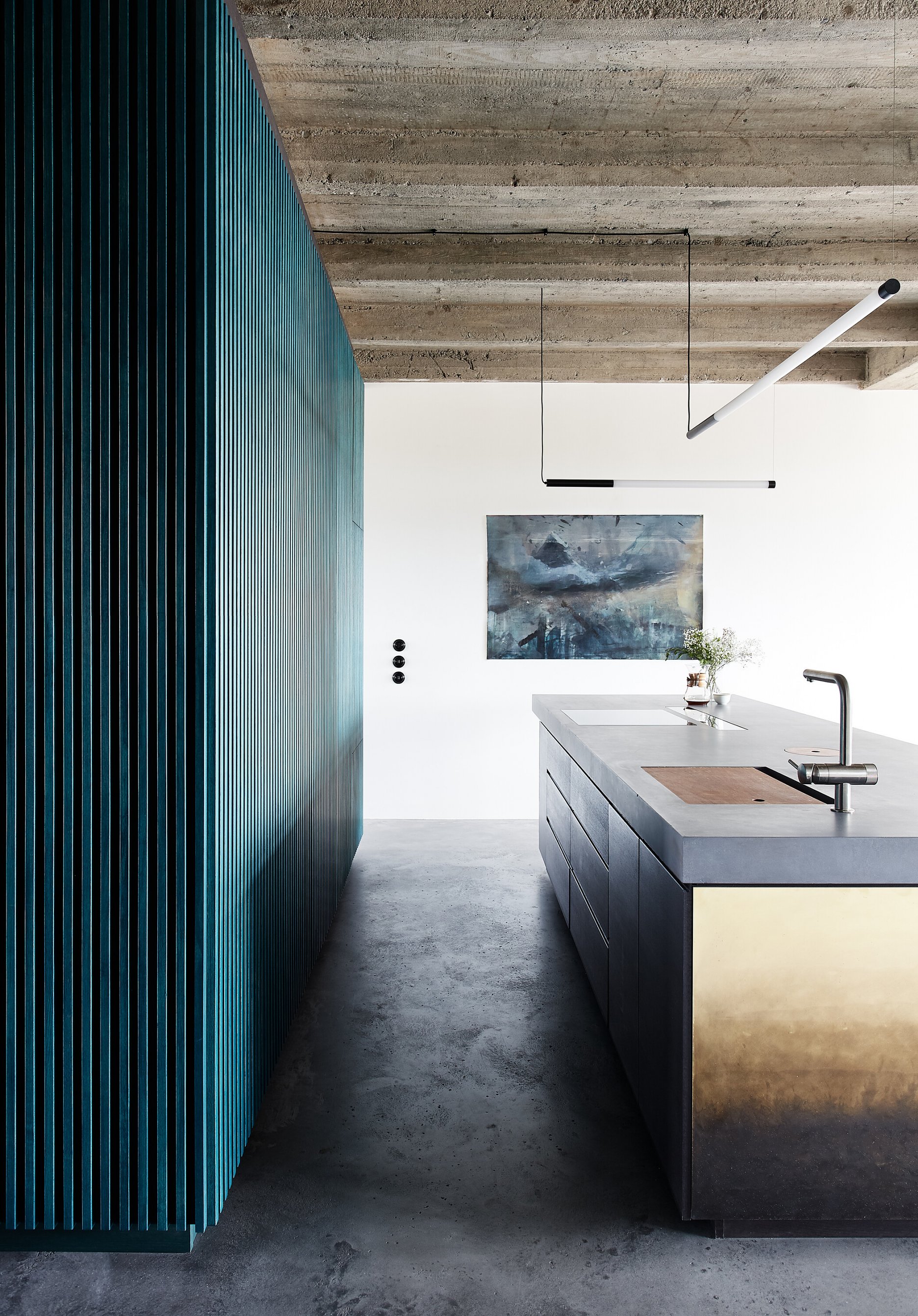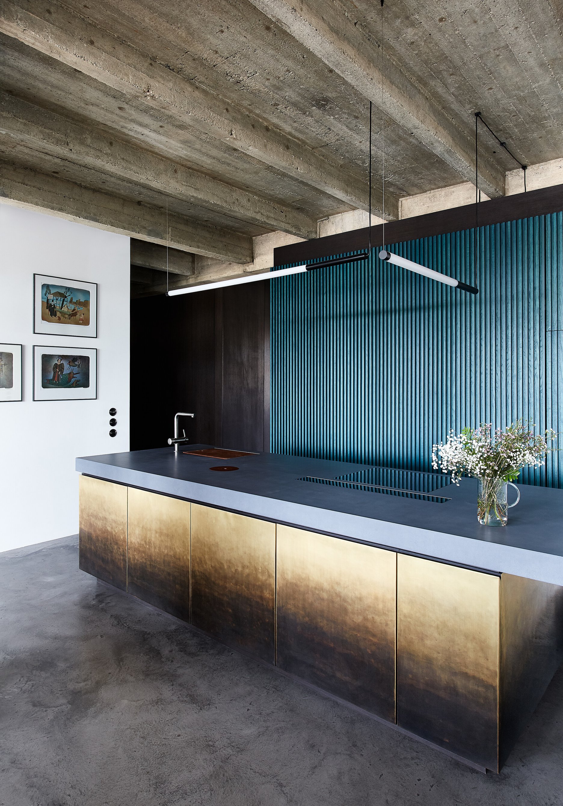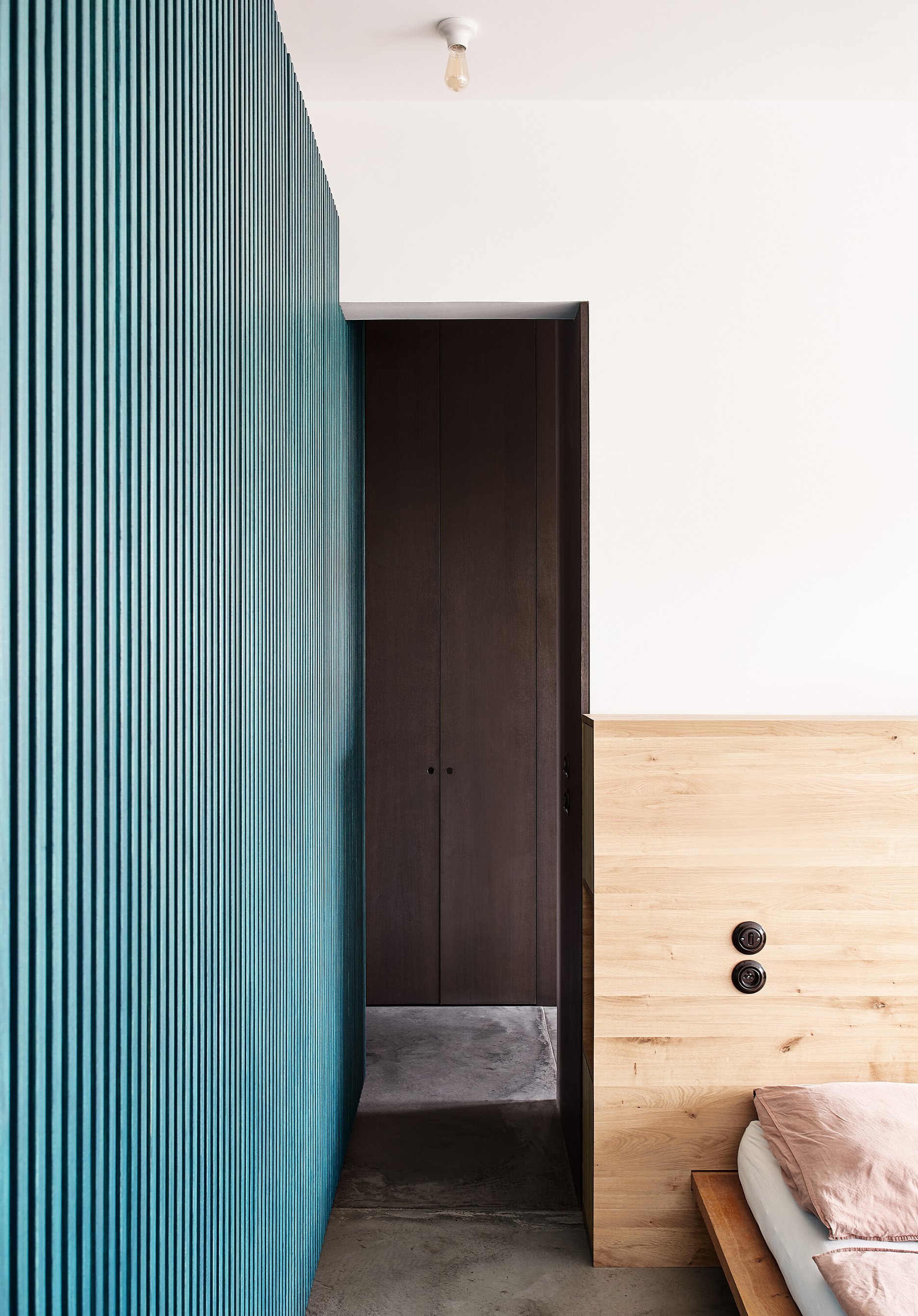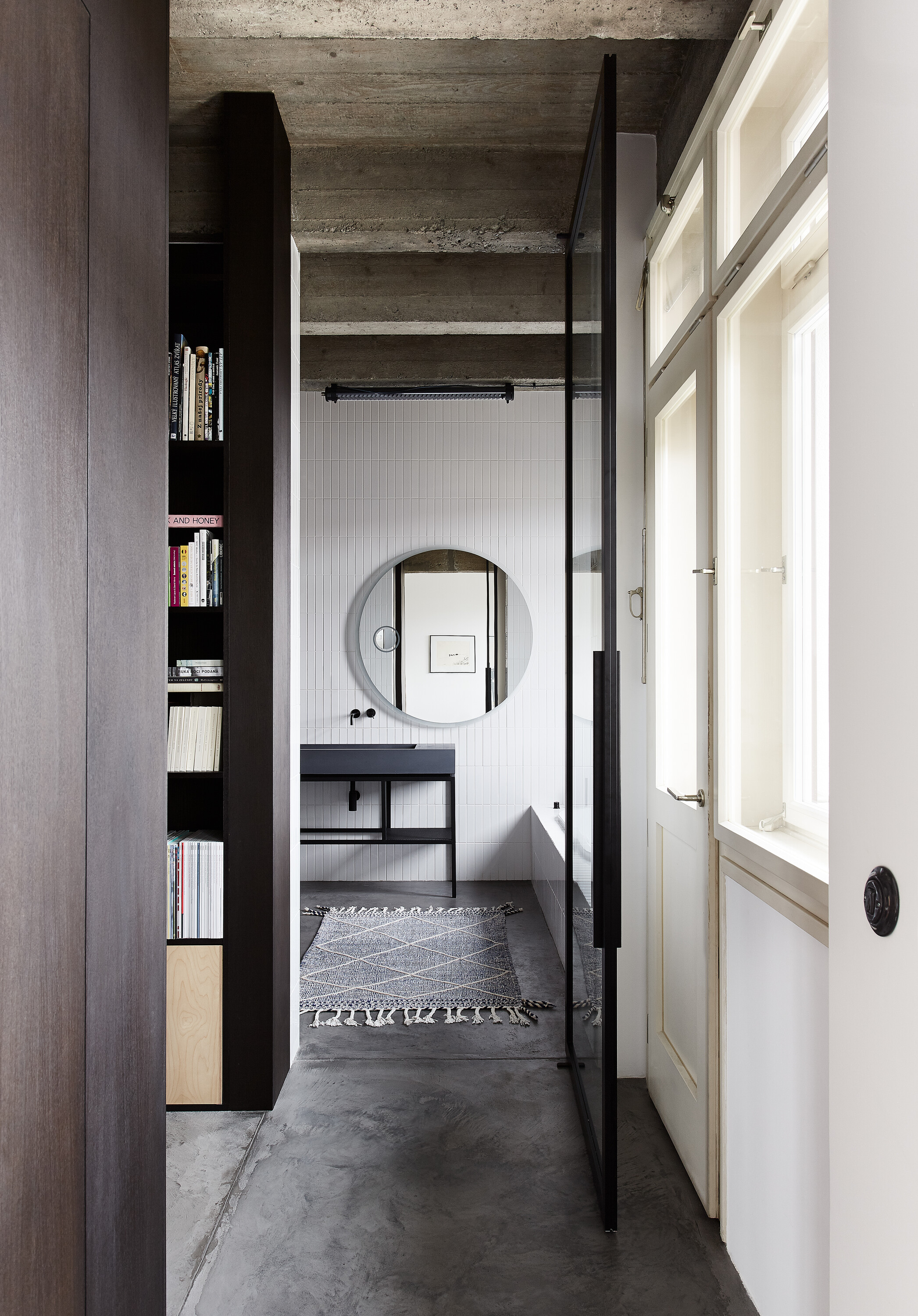 Zo vstupných priestorov je priamo prístupná malá technická miestnosť, rovnako ako dvojica vstavaných šatníkových skríň. Jedna je zakomponovaná v tmavom obložení, ktoré za rohom prechádza do knižnice. Druhá tvorí súčasť spomínaného zeleného boxu. Centrom bytu je kuchyňa, s ostrovom obloženým patinovanými mosadznými panelmi a pracovnou plochou z betónu. V doske ostrovu sú dômyselne schované prestupy k nádobám triedeného odpadu. Spálňa sa nachádza za zeleným boxom. Má tri vstupy. Čelo postele je prisadené k pôvodnému mohutnému komínovému telesu. Spálňu a hlavnú kúpeľňu oddeľuje priechodná knižnica.
