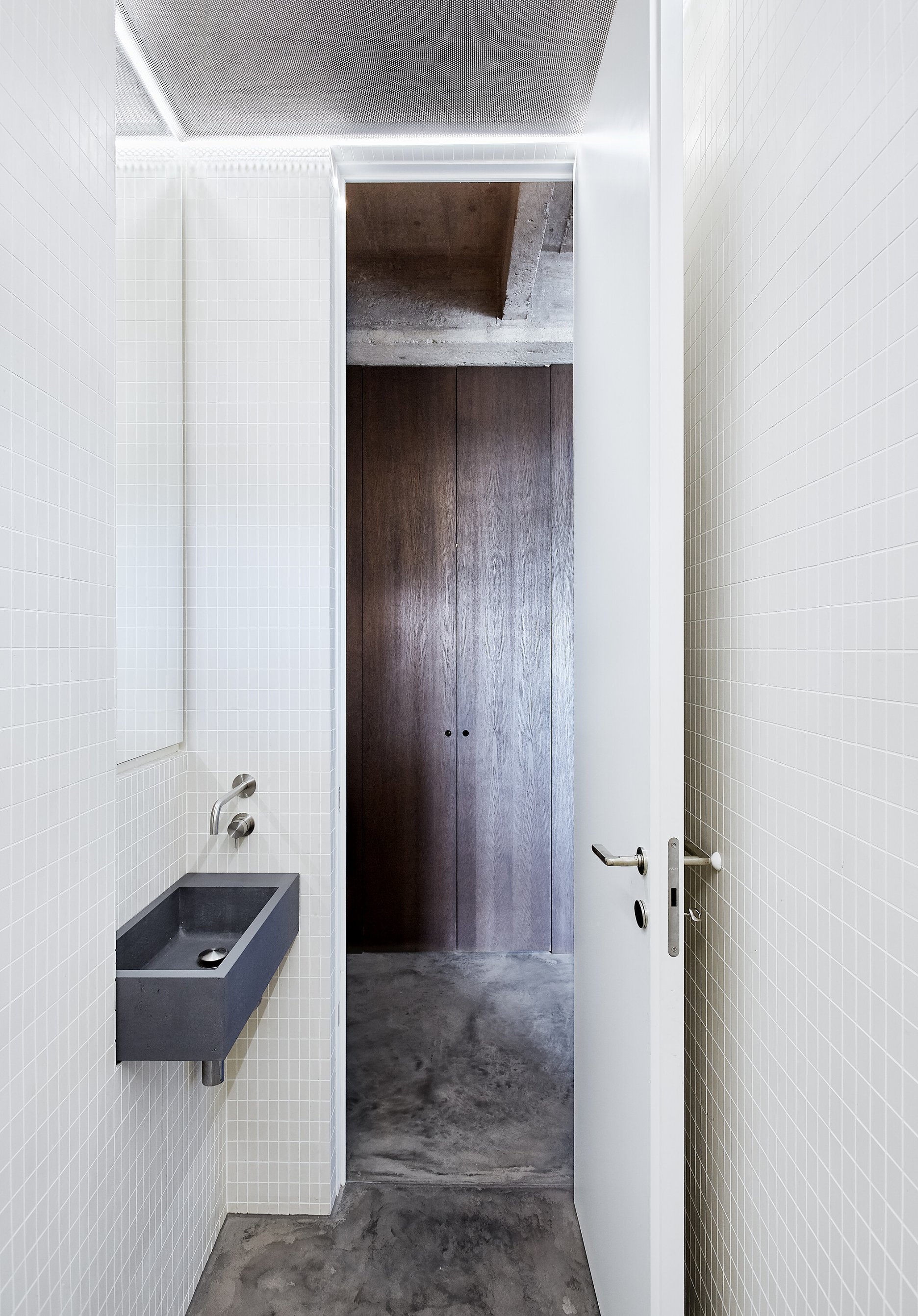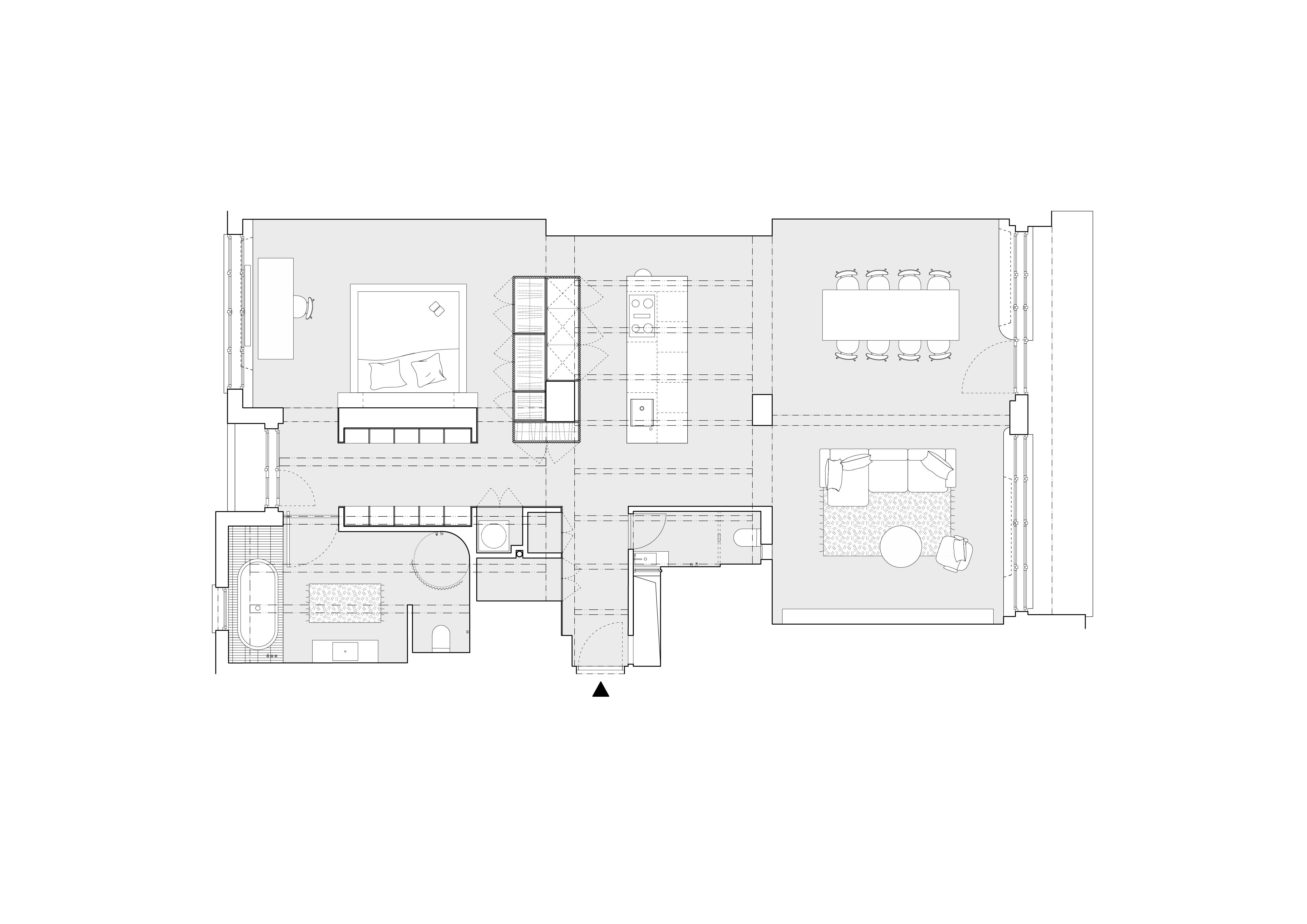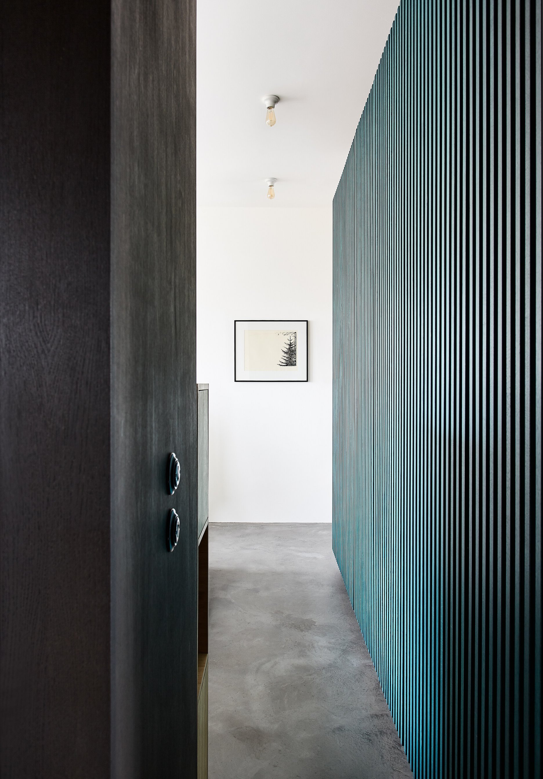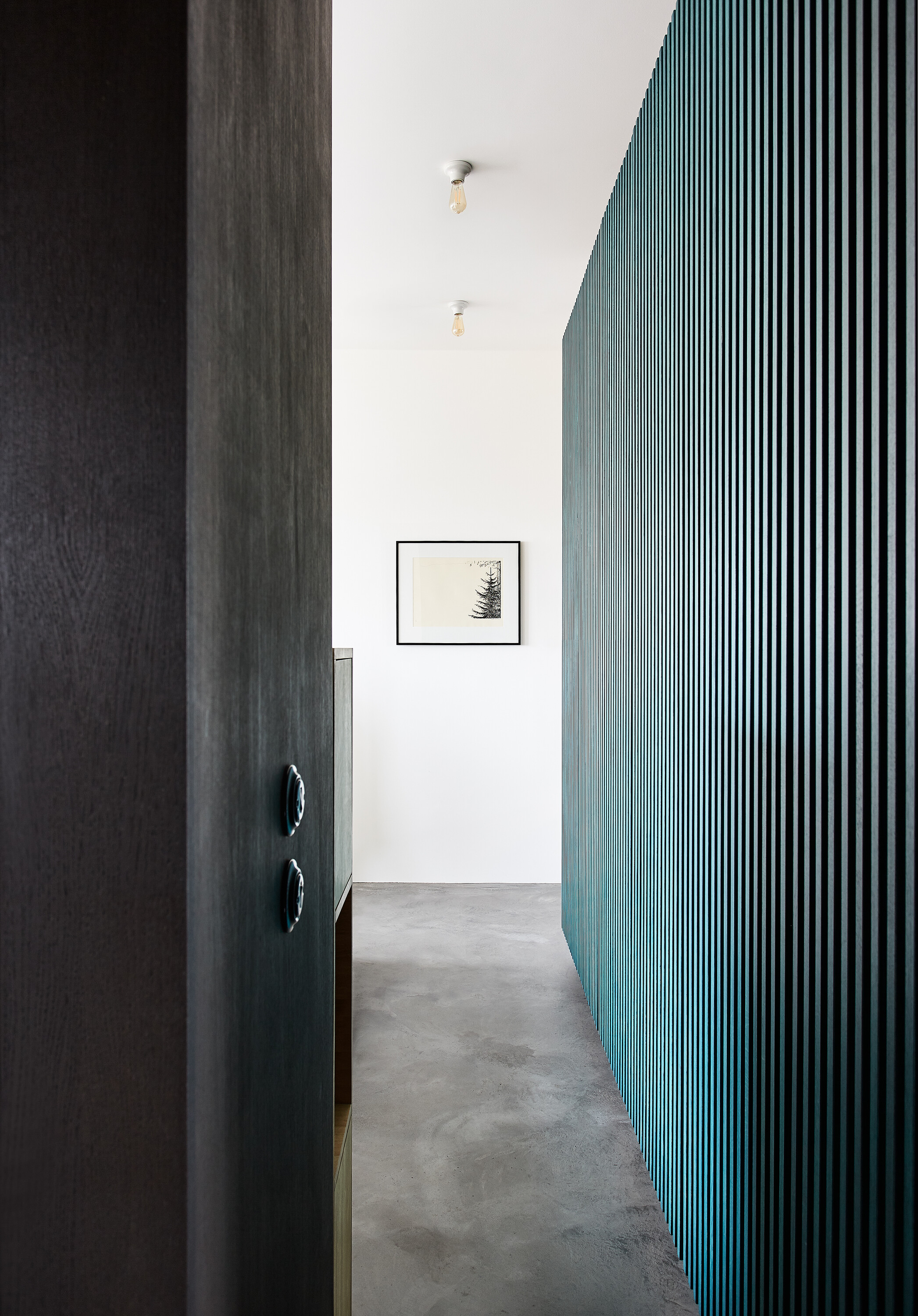 Zo vstupných priestorov je priamo prístupná malá technická miestnosť, rovnako ako dvojica vstavaných šatníkových skríň. Jedna je zakomponovaná v tmavom obložení, ktoré za rohom prechádza do knižnice. Druhá tvorí súčasť spomínaného zeleného boxu. Centrom bytu je kuchyňa, s ostrovom obloženým patinovanými mosadznými panelmi a pracovnou plochou z betónu. V doske ostrovu sú dômyselne schované prestupy k nádobám triedeného odpadu. Spálňa sa nachádza za zeleným boxom. Má tri vstupy. Čelo postele je prisadené k pôvodnému mohutnému komínovému telesu. Spálňu a hlavnú kúpeľňu oddeľuje priechodná knižnica.