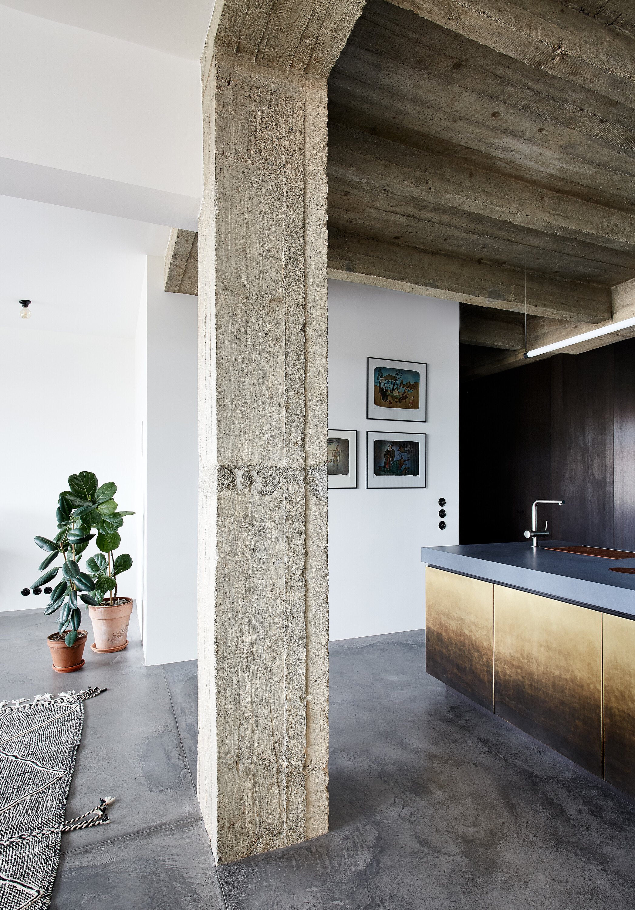 Celý interiér prešiel dôkladnou očistou, ktorá odhalila surové povrchy železobetónového skeletu stavby a odstránila prebytočné priečky. Priznanie stropnej konštrukcie s monolitickými prievlakmi zdôraznilo výšku priestoru a jeho surový charakter.