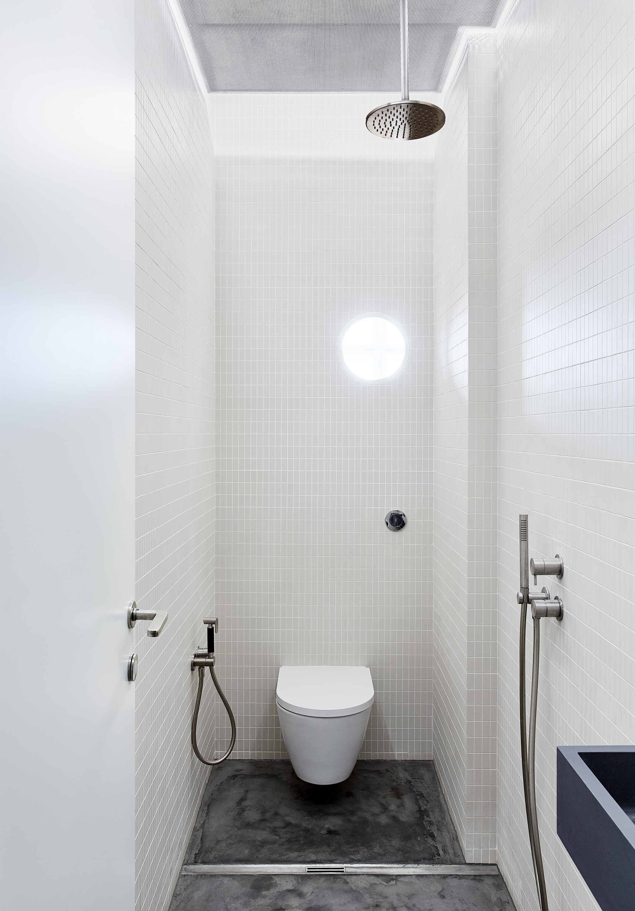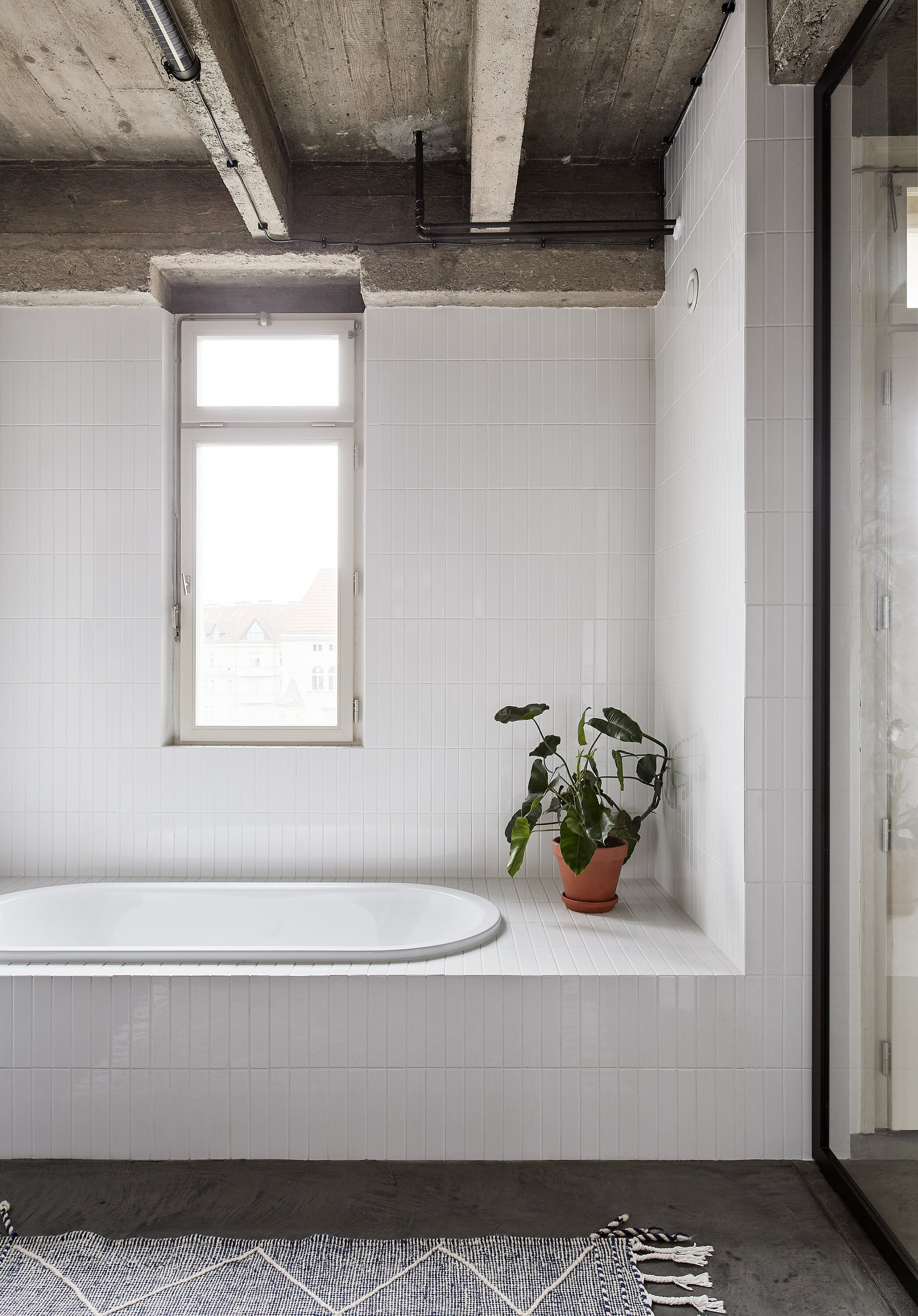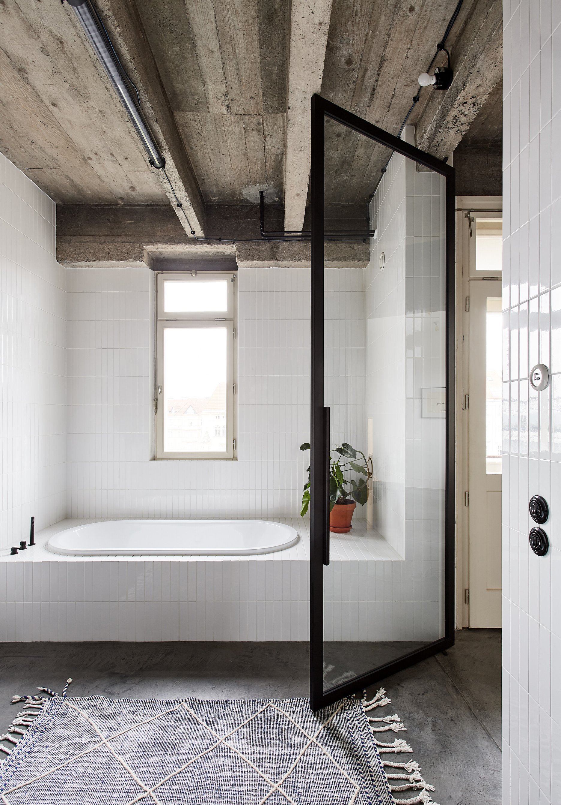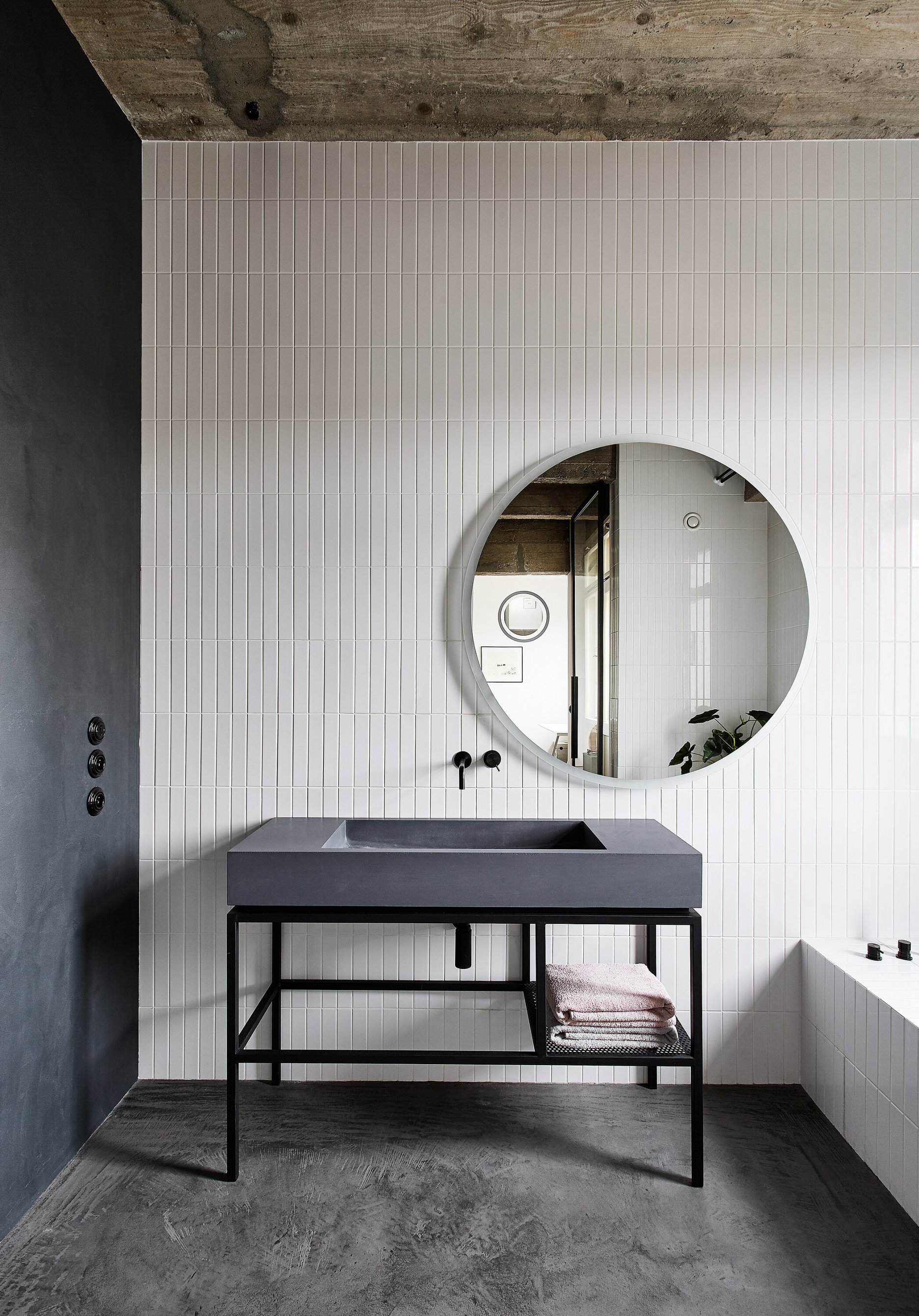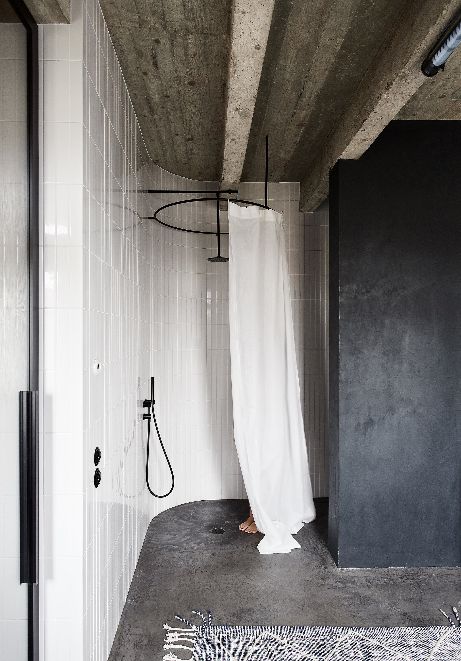 Nosnou témou architektonického konceptu bol výber podlahy, ktorá mala byť jednotná v celom byte, teda aj v kúpeľniach a sprchových kútoch. Ako jednu z možností zvažovali autorky terazzo, ale po statickom posúdení a konzultácii s klientom zvolili brúsenú betónovú stierku.