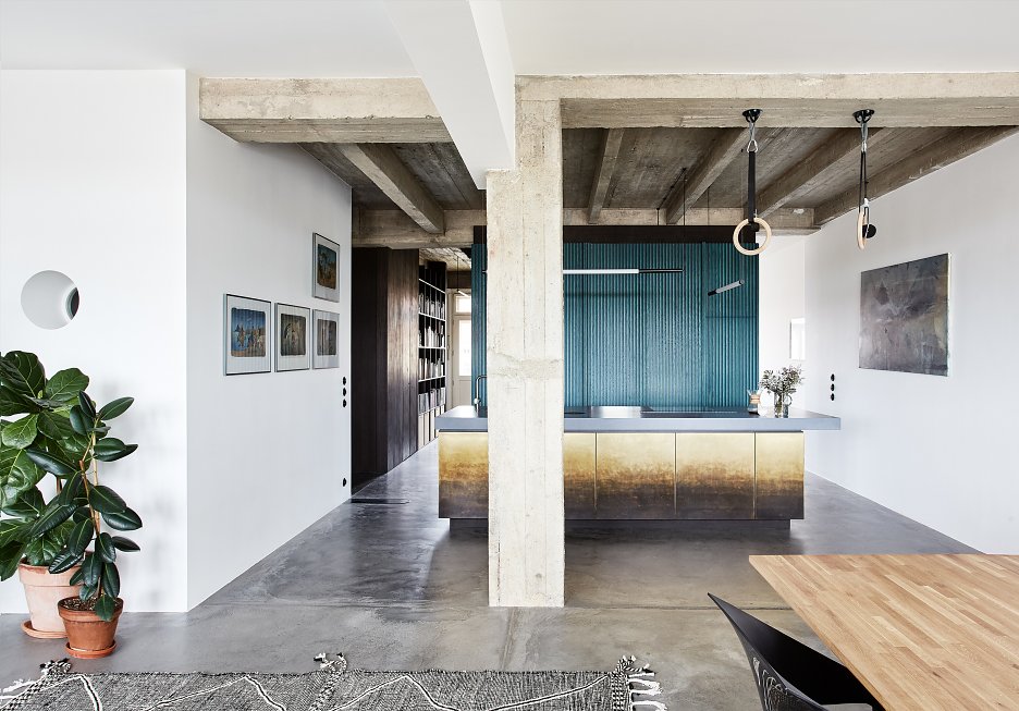 Otvorené priehľady bytom, ktoré vznikli odstránením väčšiny priečok odhaľujú hravý vnútorný svet s často prekvapivými kombináciami materiálov.