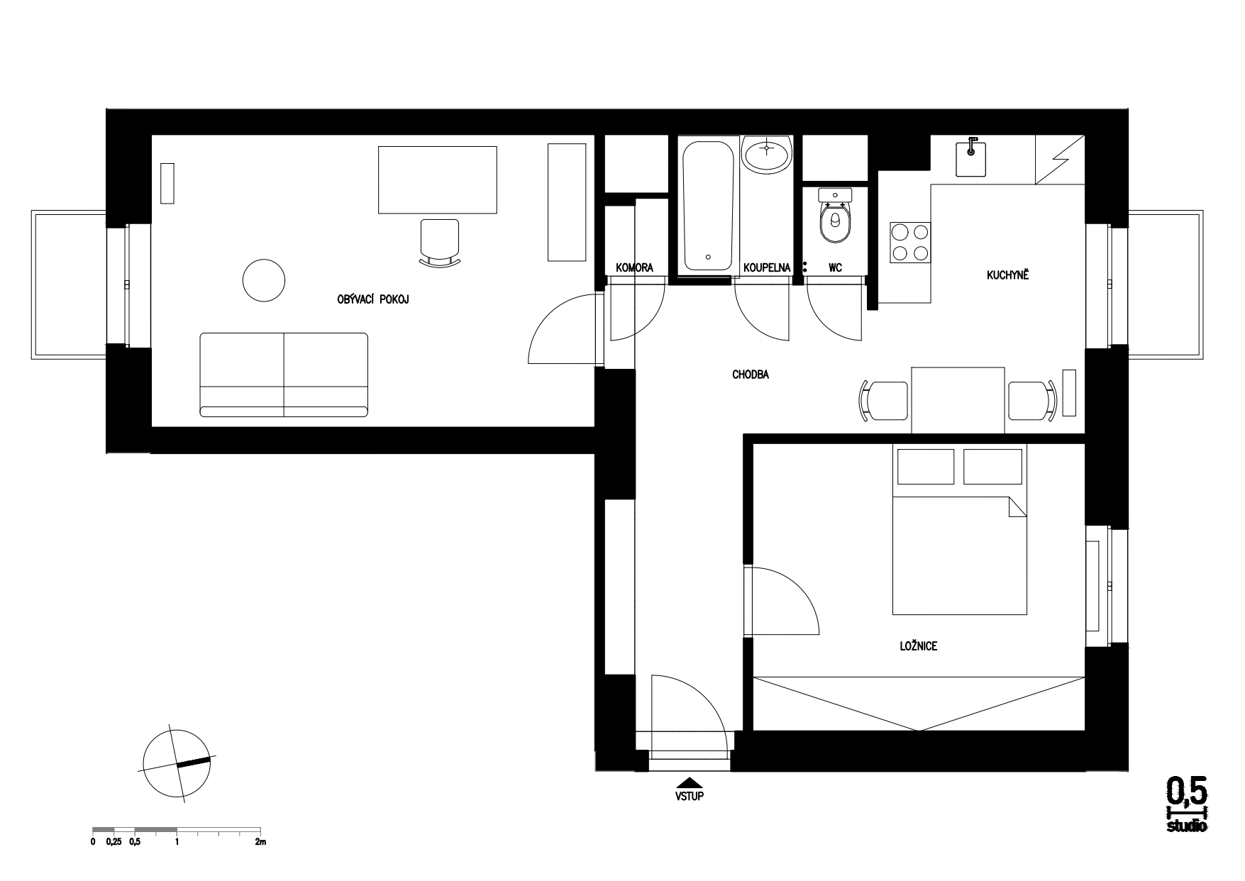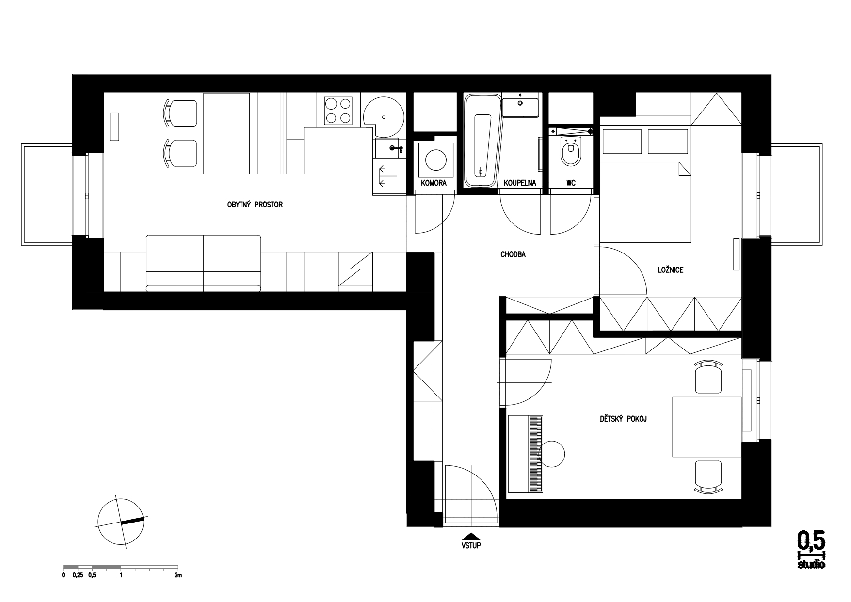Úlohou architektov z ateliéru 0,5 Studio bolo overiť možnosť zmeny dispozície staršieho bytu z usporiadania 2 + 1 na 3 + kk. Bývanie s výmerou necelých 55 m2 je súčasťou zástavby v pražskej časti Vokovice, ktorá vznikla v 50. rokoch v duchu socialistického realizmu. S podobnými projektmi má pražský ateliér početné skúsenosti (viď. súvisiace články pod textom). V prípade tomto patrilo medzi priority najmä efektívne využitie skromného obytného priesoru. “Cílem bylo zachovat komfort a vytvořit dostatek úložných prostorů pro čtyřčlennou rodinu. Podstatné pro návrh bylo pochopení kontextu domu, místa a měřítka,” vysvetľujú autori.