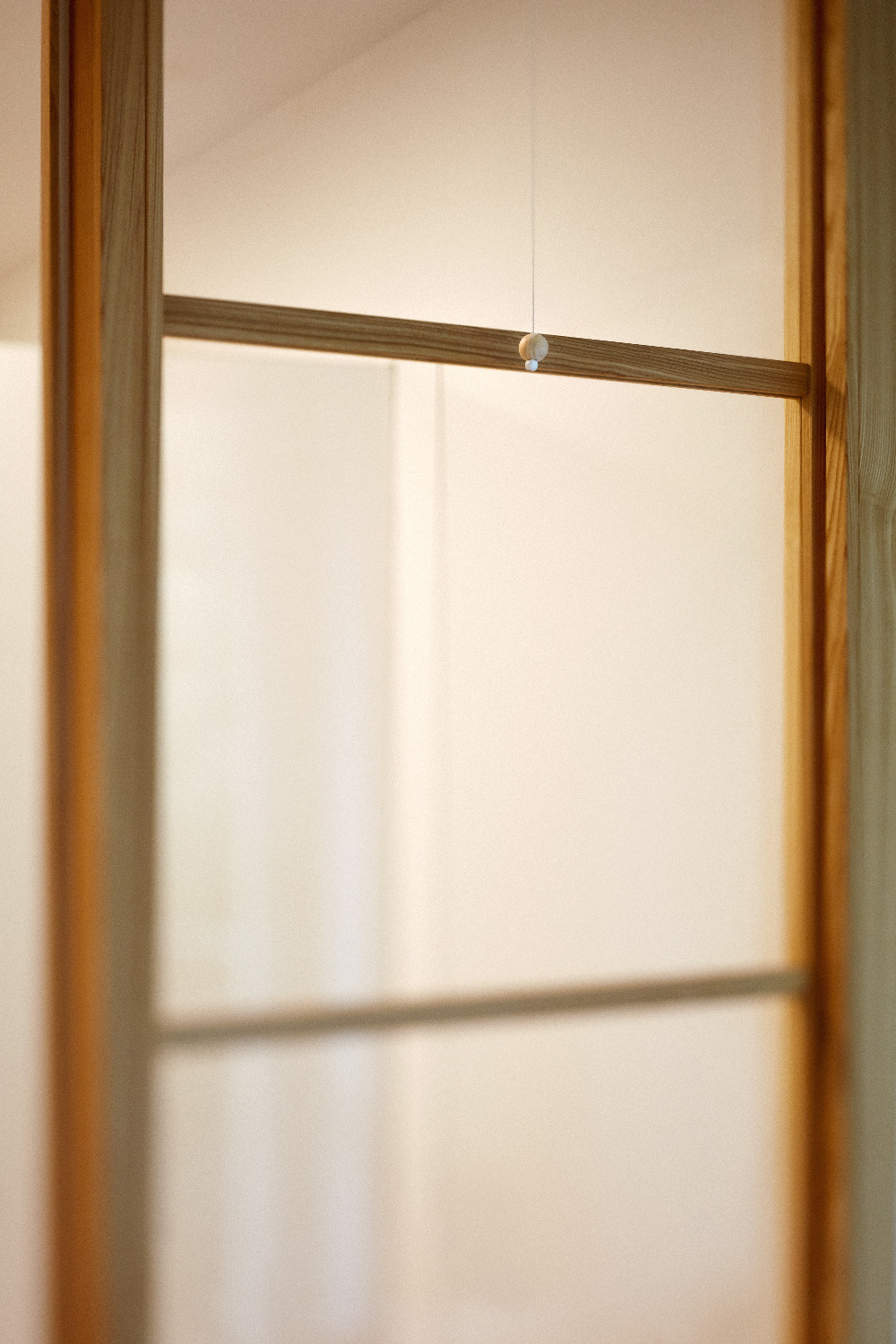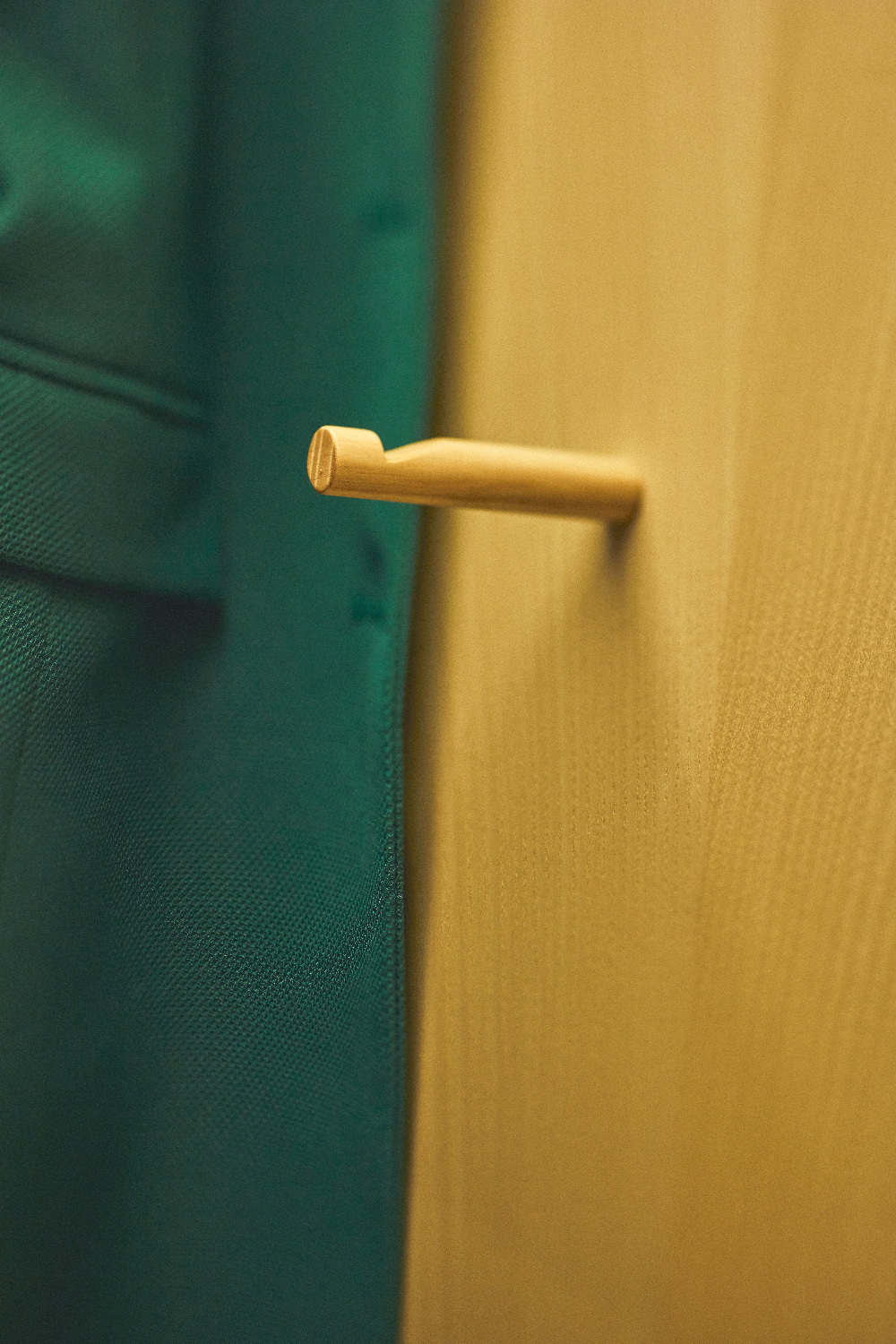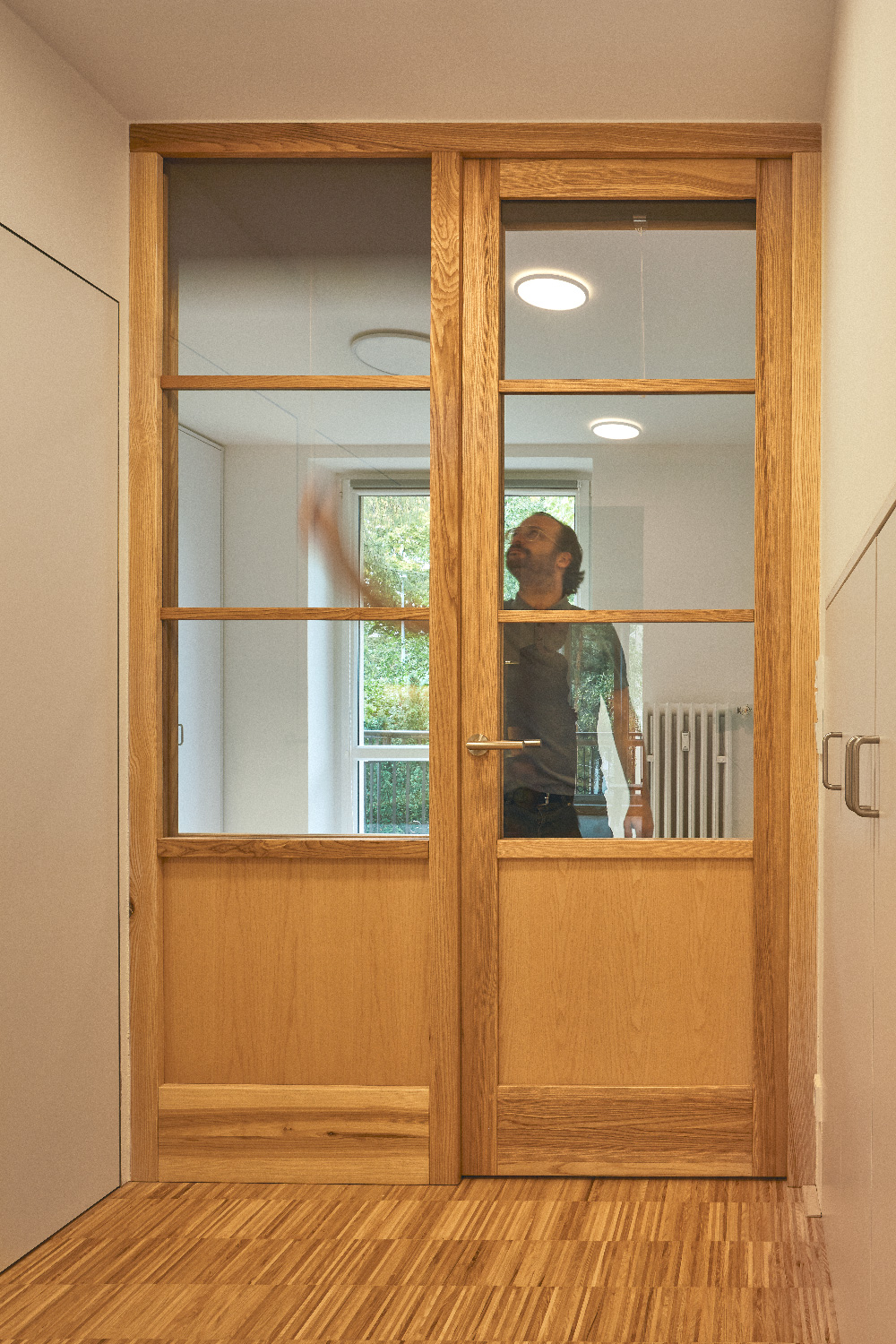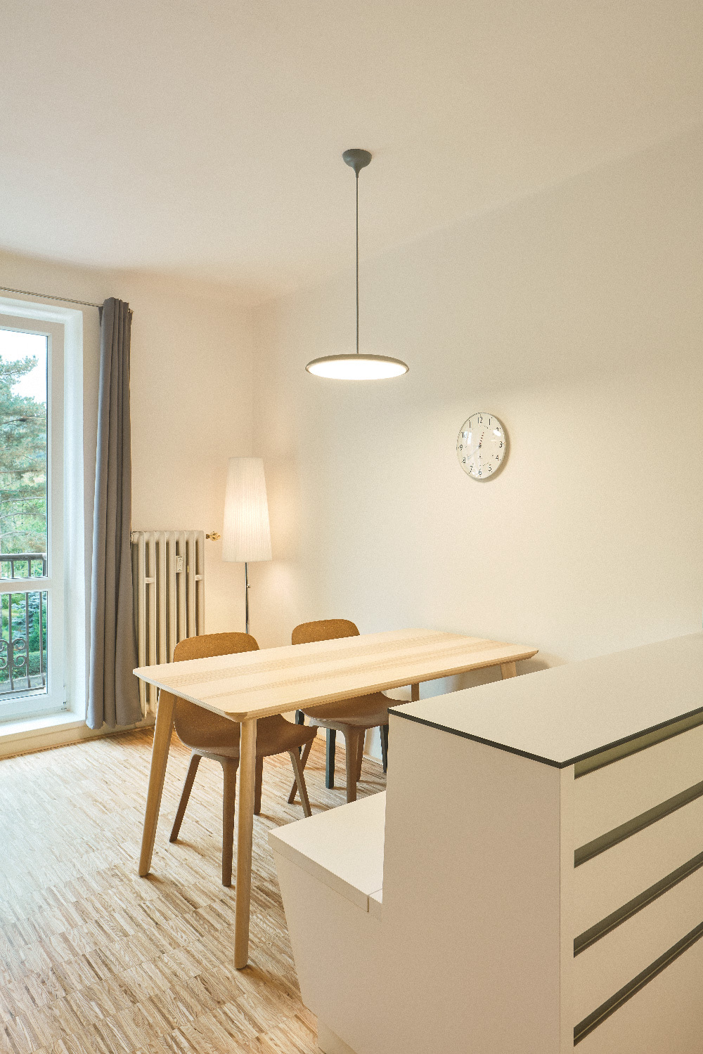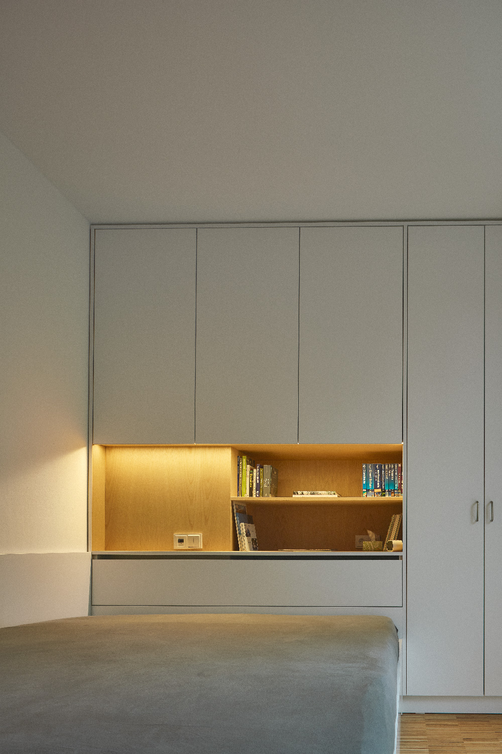 Priestor zjednocuje podlaha z jaseňovej kantovky, ktorá prechádza takmer celým bytom. Biela farba opticky prepája vstavaný nábytok so stenami bytu, akcenty tvorí jaseňová dyha. Bezrámové dvere, zalícovane so stenou, nechávajú vyniknúť jednoliate farebné plochy bytu.