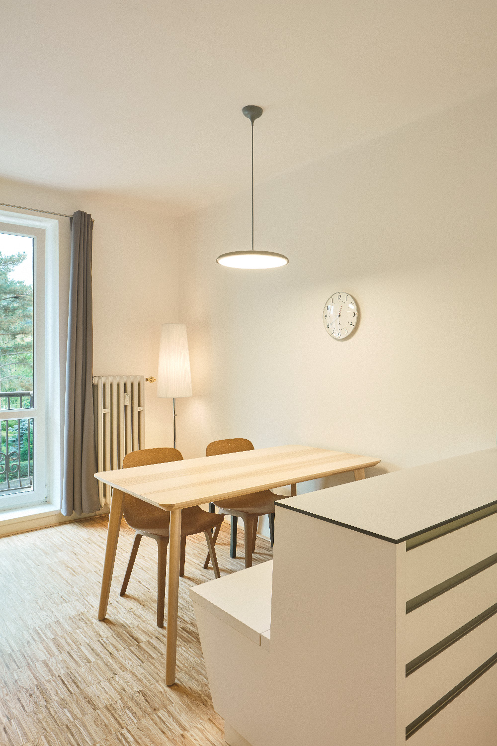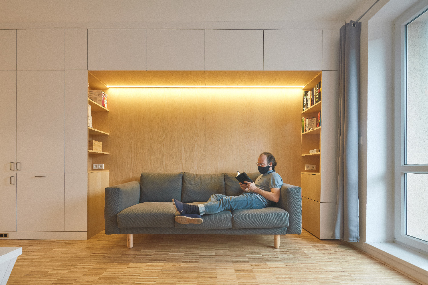 Jadro bytu tvorí obývačka s kuchynským kútom. Vstavaná stena, s odkladacími priestormi plynulo prechádza do obytnej polovice miestnosti. Sedenie a knižnicu, integrované do nábytkového prvku, zvýrazňuje jaseňová dyha.