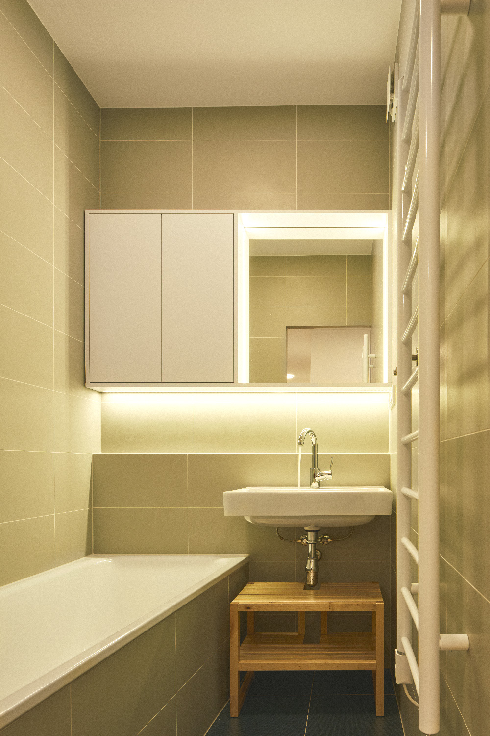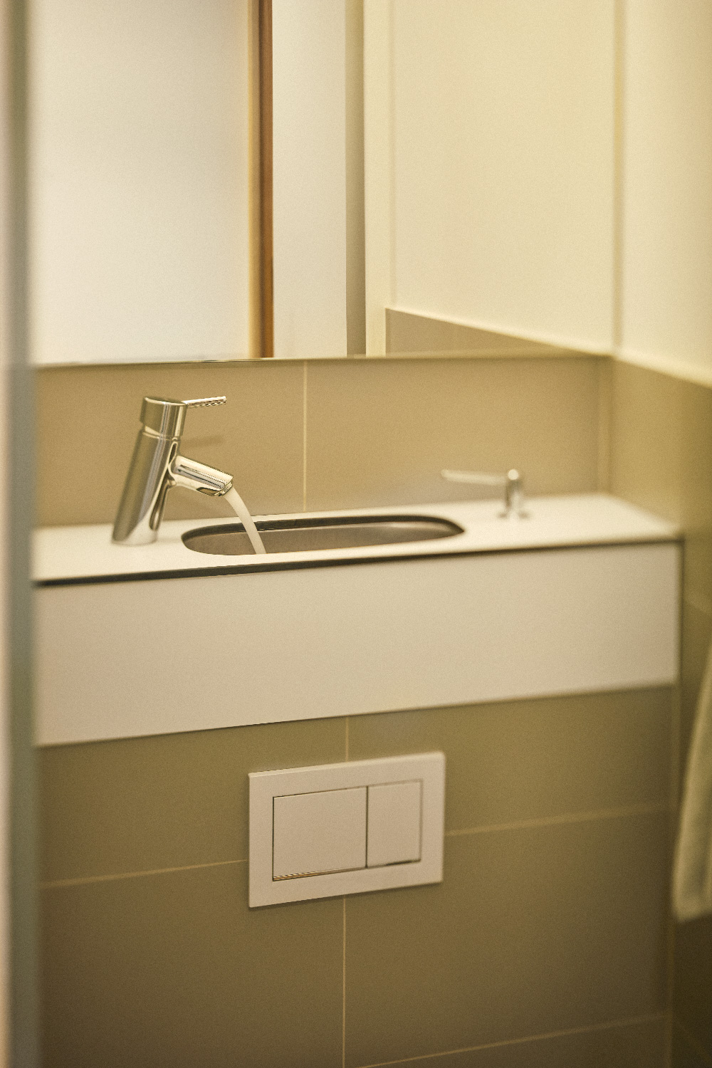 Kúpeľňa a WC sú zariadené nábytkom na mieru. Medzi zaujímavé riešenia patrí atypické umývadlo nad splachovacou nádržkou.