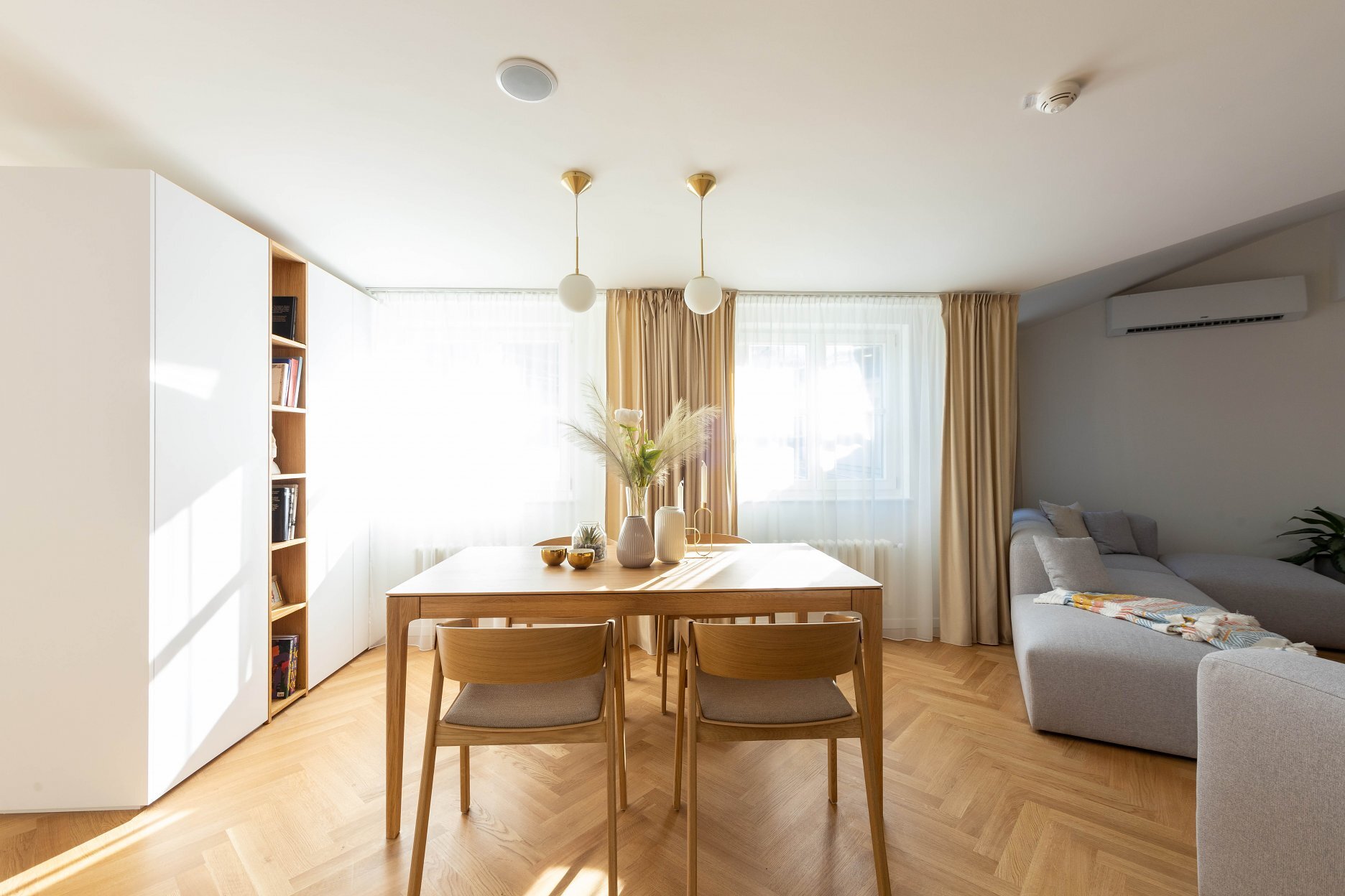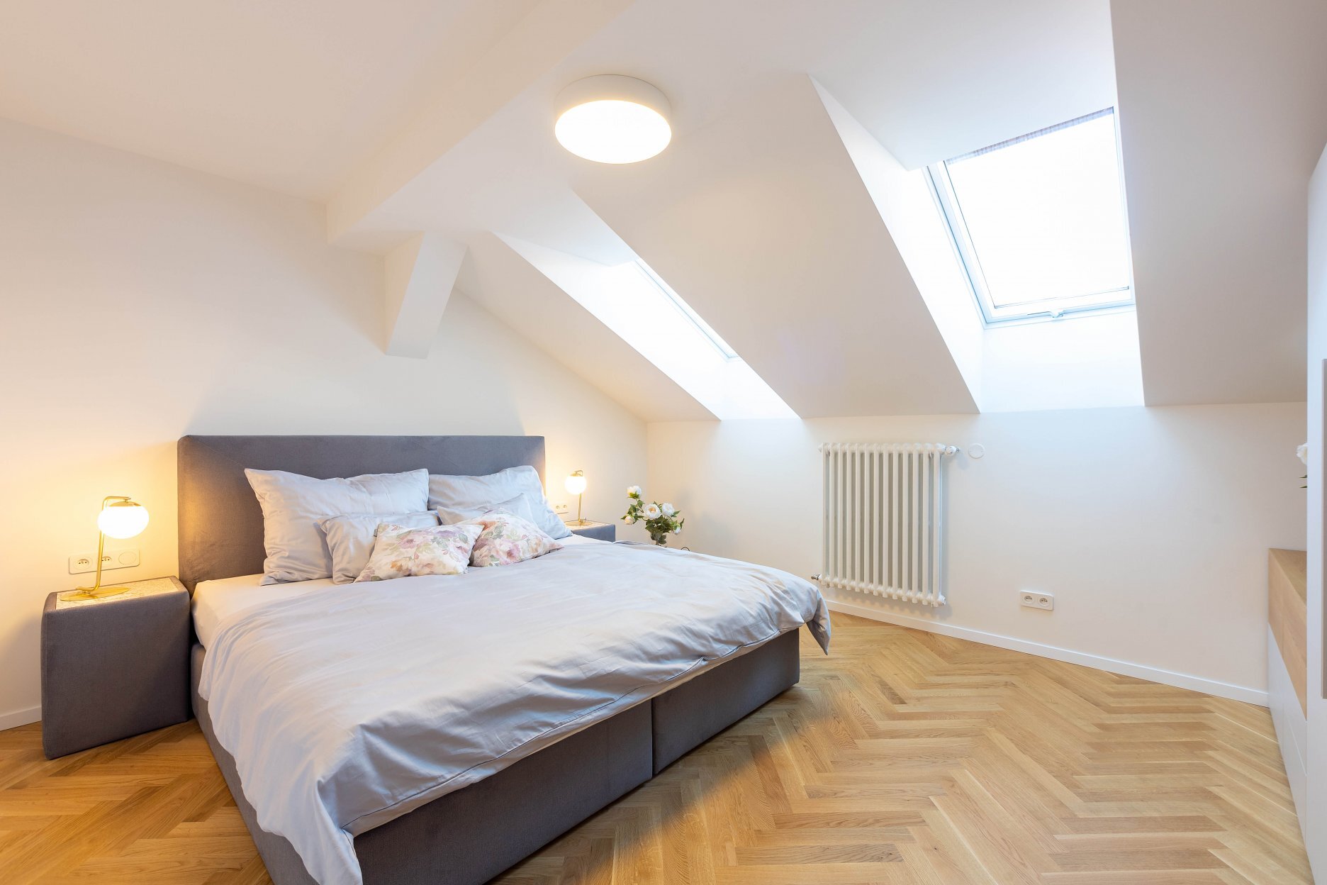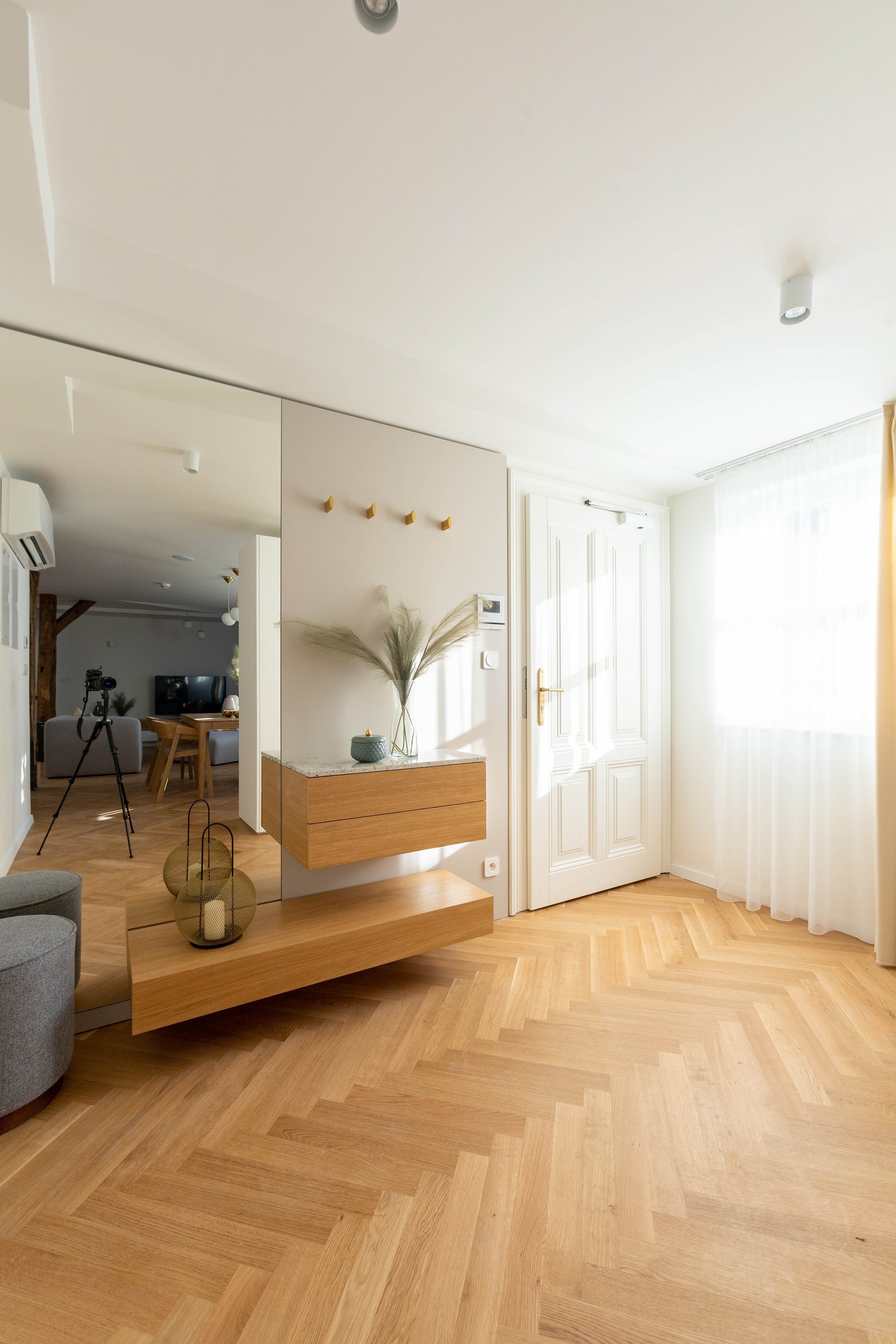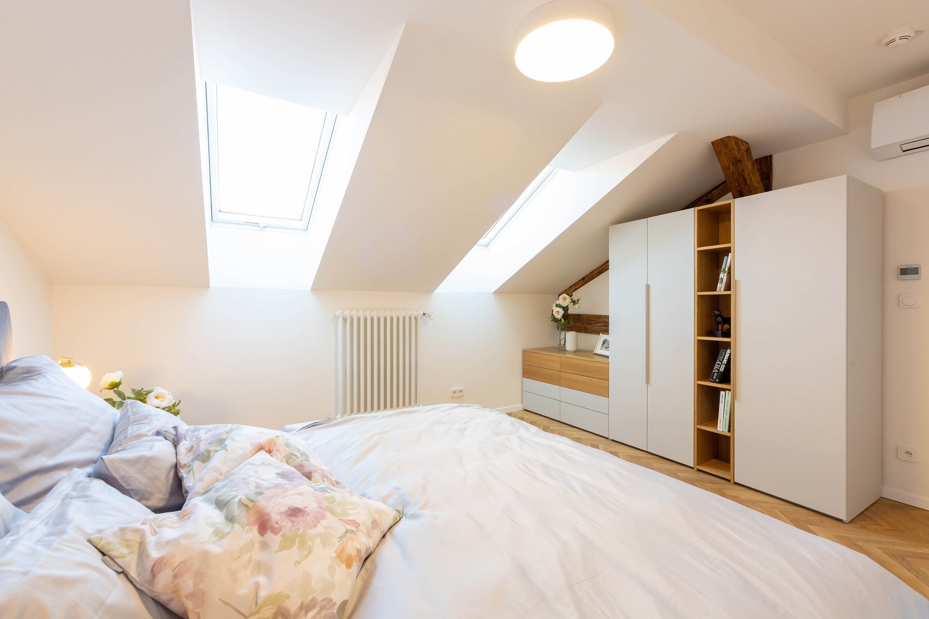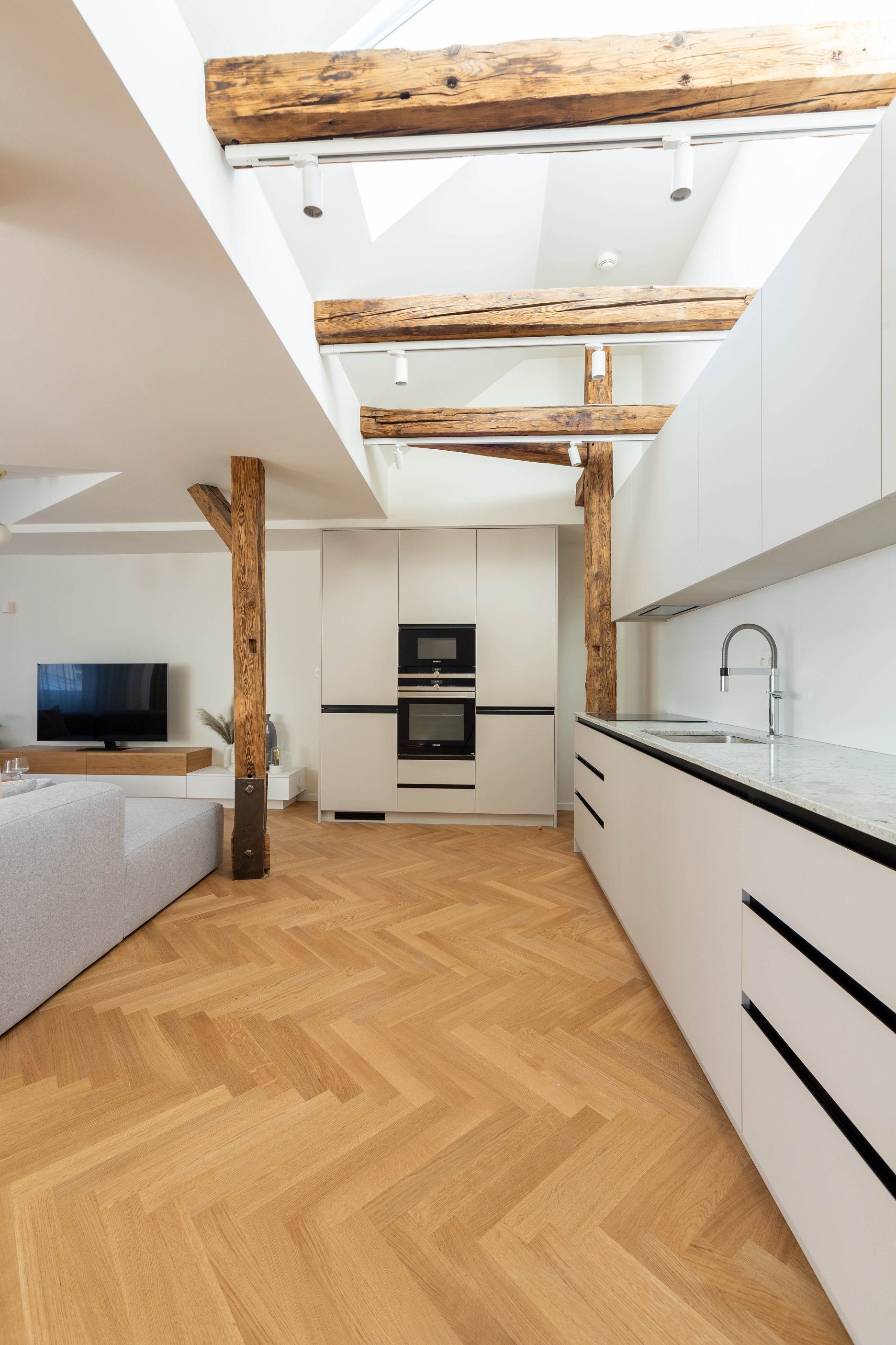 Dispozícia bytu vychádza z princípu otvorenosti a maximálneho využitia prirodzeného svetla. Veľké strešné okná prepúšťajú denné svetlo hlboko do interiéru, čím zdôrazňujú hru materiálov a textúr. Svetlo odhaľuje kresbu drevených parkiet, matný povrch dyhovaného nábytku a subtílnu eleganciu kuchynskej linky. Priestor tak dýcha vzdušnosťou a vizuálnou ľahkosťou, no zároveň si zachováva intimitu podkrovného bývania.