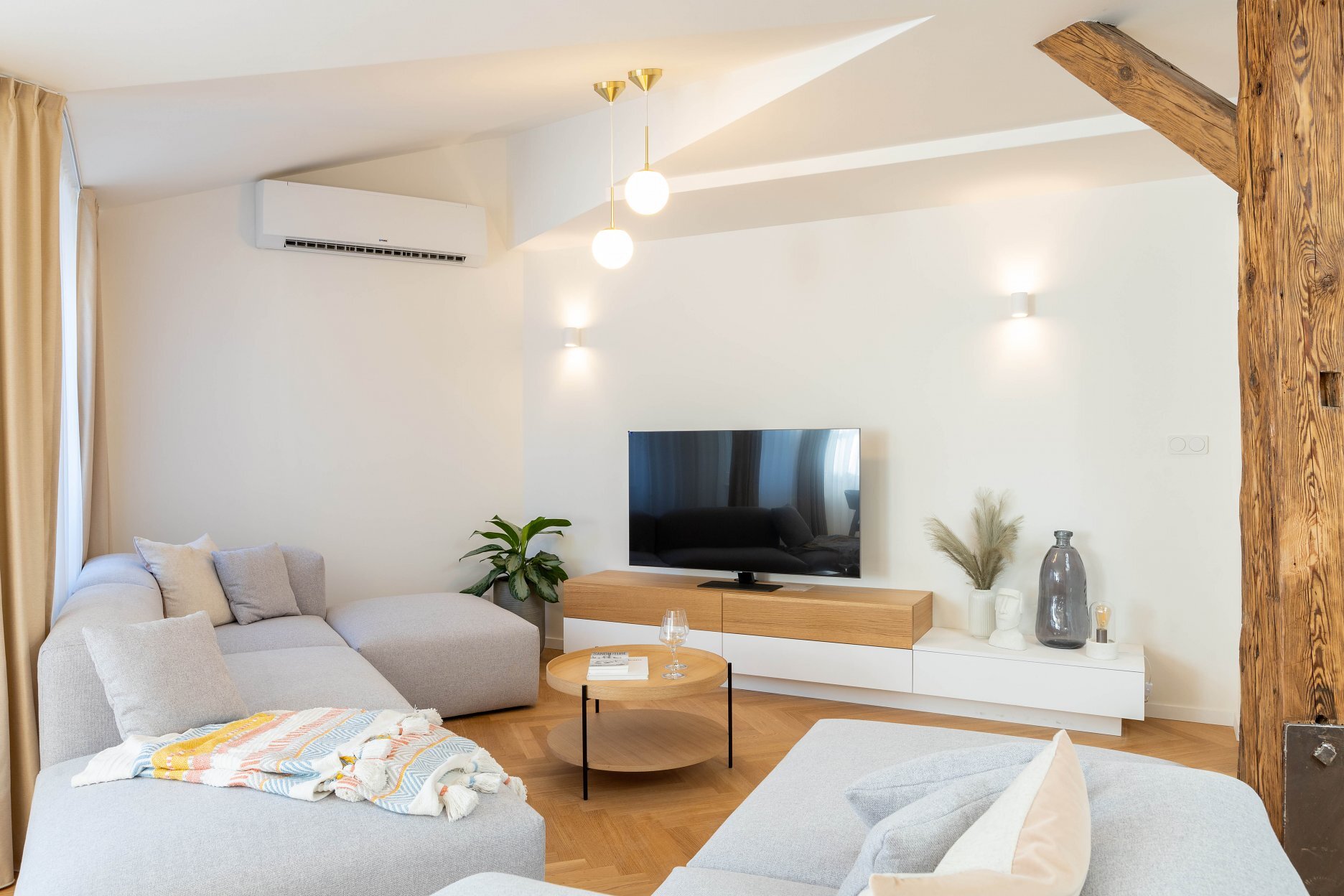 Základnou charakteristikou interiéru sú pôvodné drevené trámy, ktoré ostali priznané a formujú identitu priestoru. Ich surovosť a prirodzené nedokonalosti sú zámerným kontrapunktom k čistým líniám súčasného nábytku a architektonického riešenia. Trámy nevnímame iba ako dekoratívny prvok – ich historická hodnota sa premieta aj do materiálovej skladby interiéru, v ktorom dominuje drevo, kameň, dyha a jemná neutralita odtieňov.