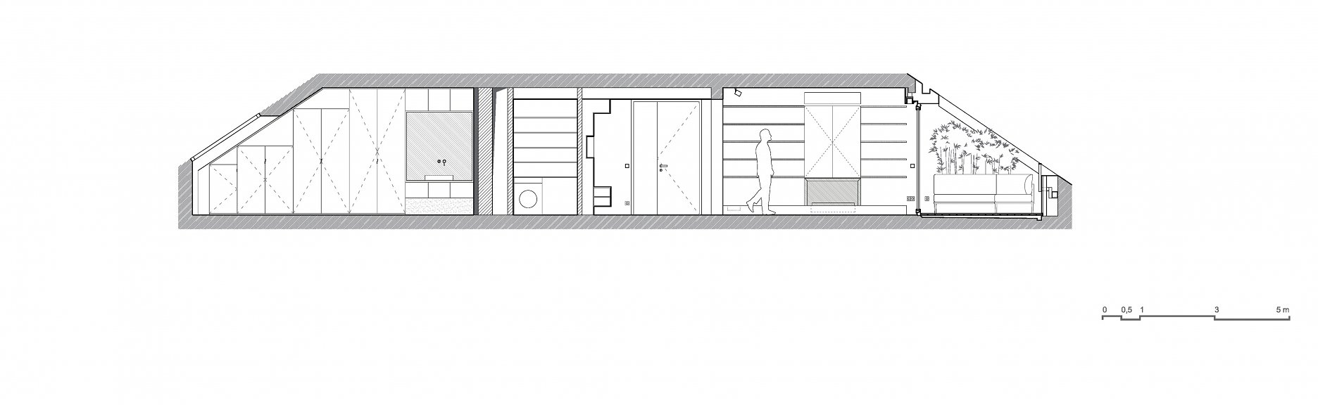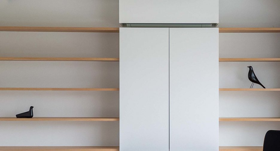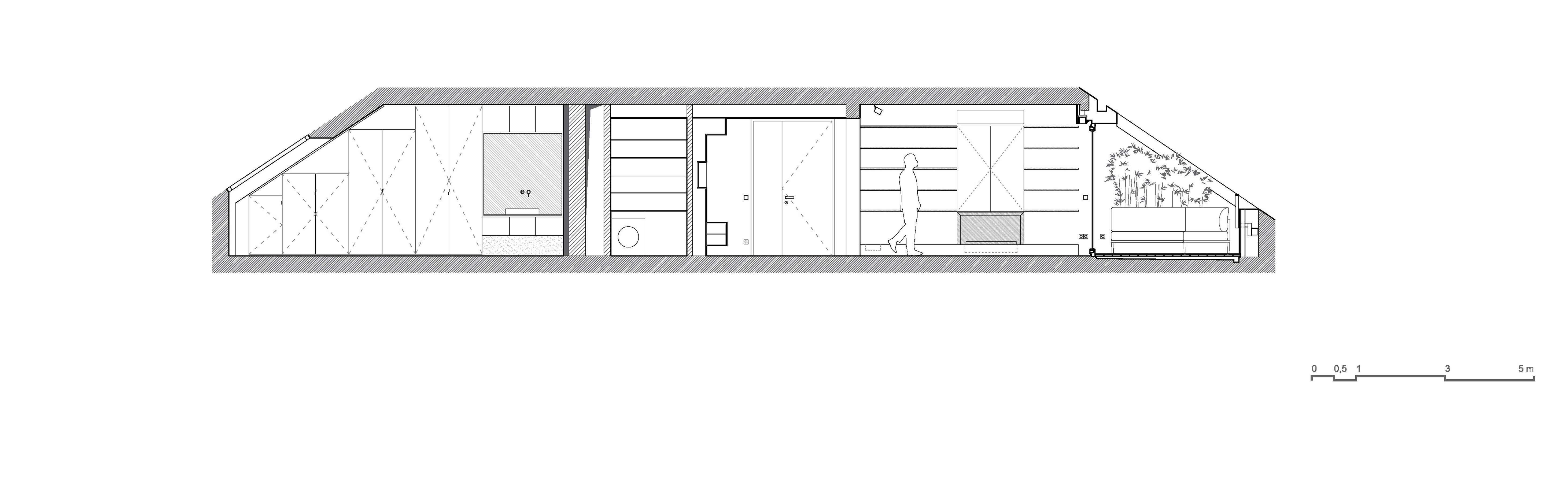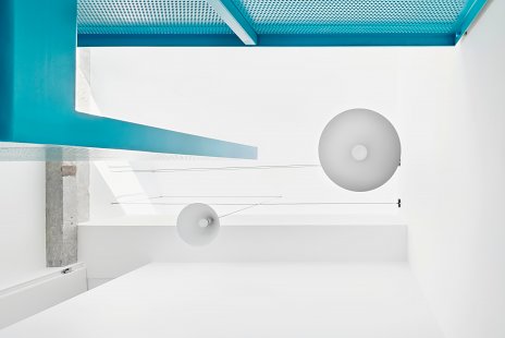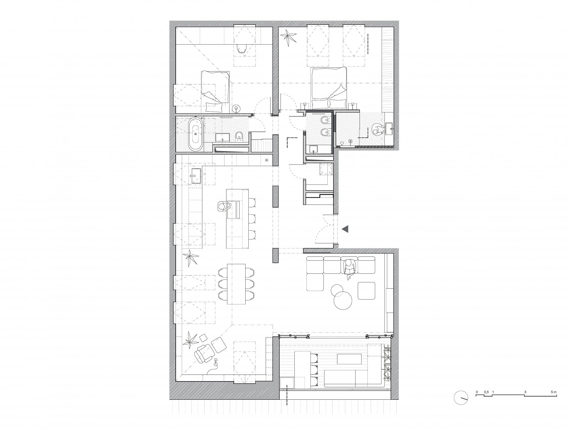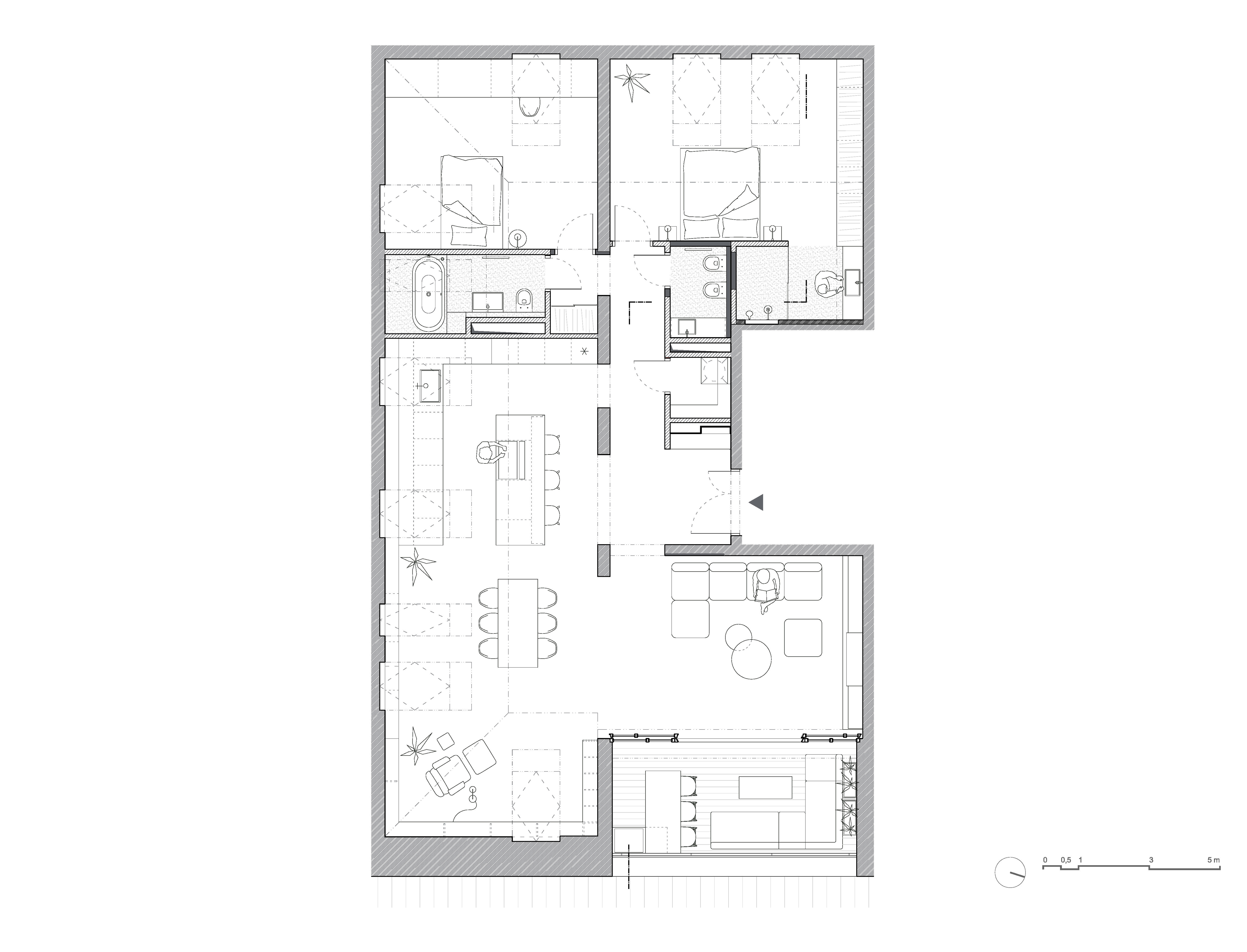 Prepojením obývacej izby, kuchyne a jedálne vznikol otvorený obytný priestor, cez ktorý vniká svetlo aj do nanovo otvorenej chodby. Nepravidelný rytmus plných segmentov a dverí na celú výšku miestnosti oddeľuje spoločenskú a súkromnú časť bytu. Obe spálne majú vlastnú kúpeľňu.