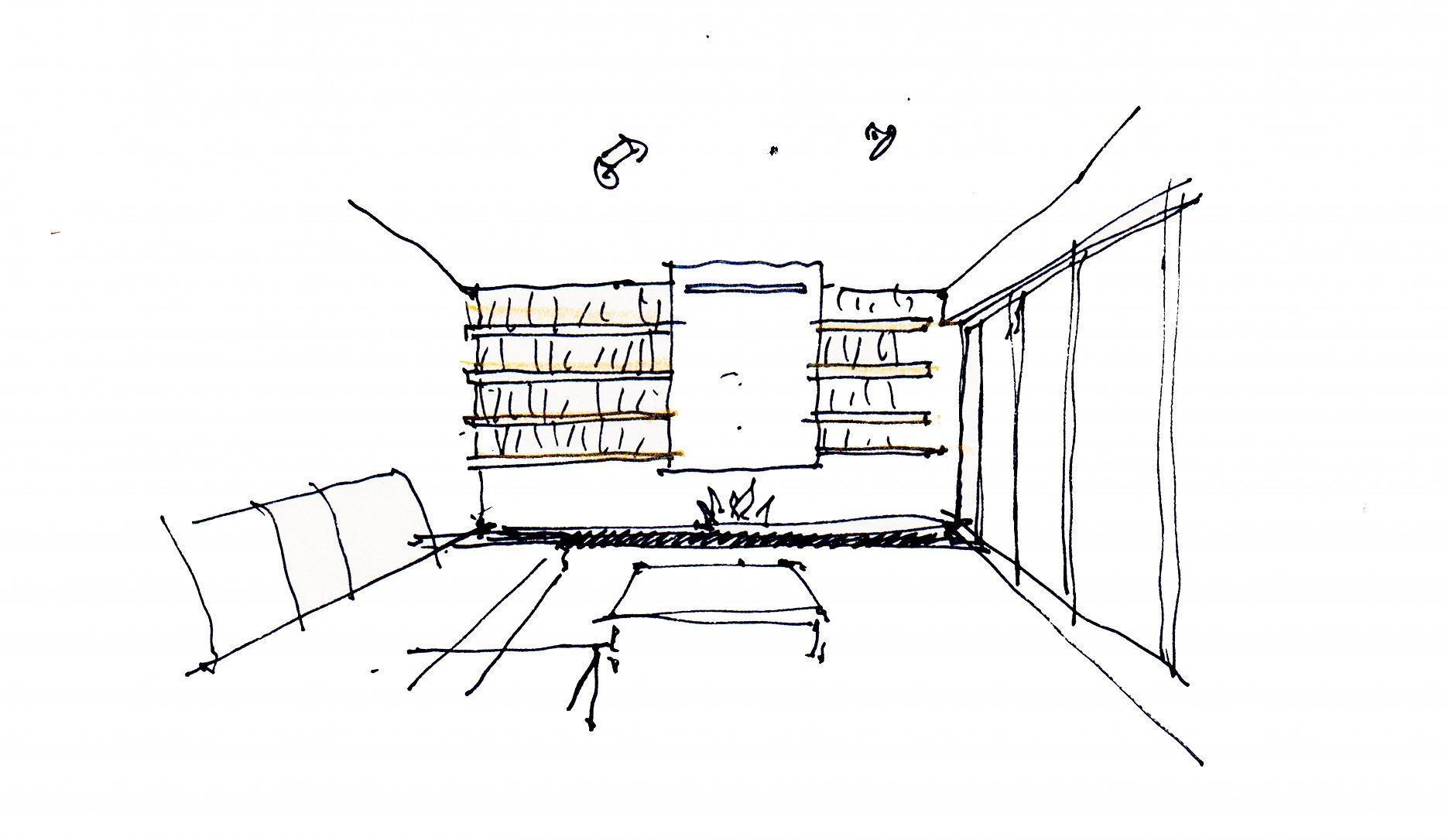 Obývacia izba s krbom a vinotékou je cez široké francúzske okná prepojená s terasou a výhľadom na Villu Baincu. V nábytkovom kuse nad krbom je skrytý bar, pred francúzskym oknom, medzi závesmi, zas integrované projekčné plátno.