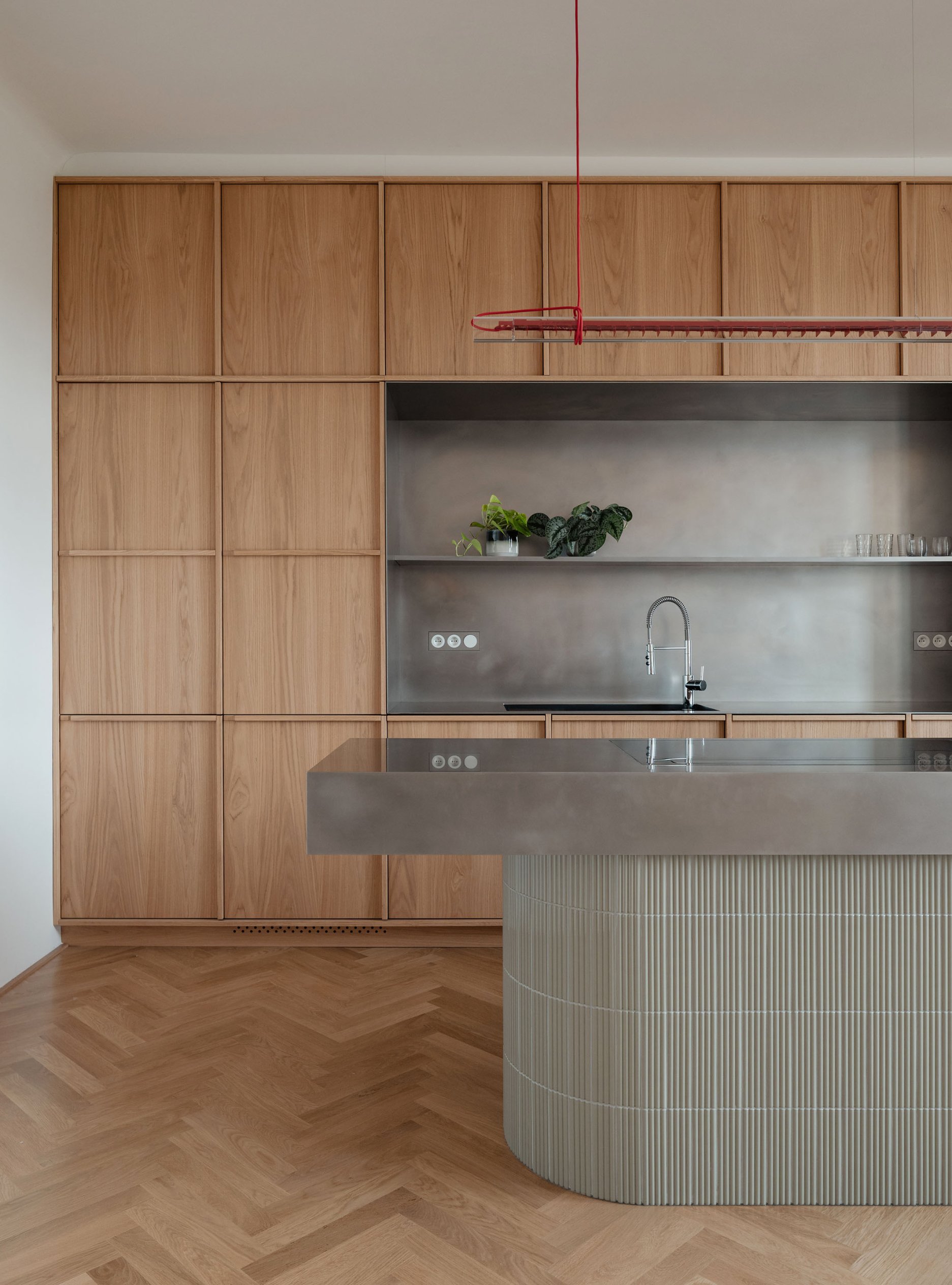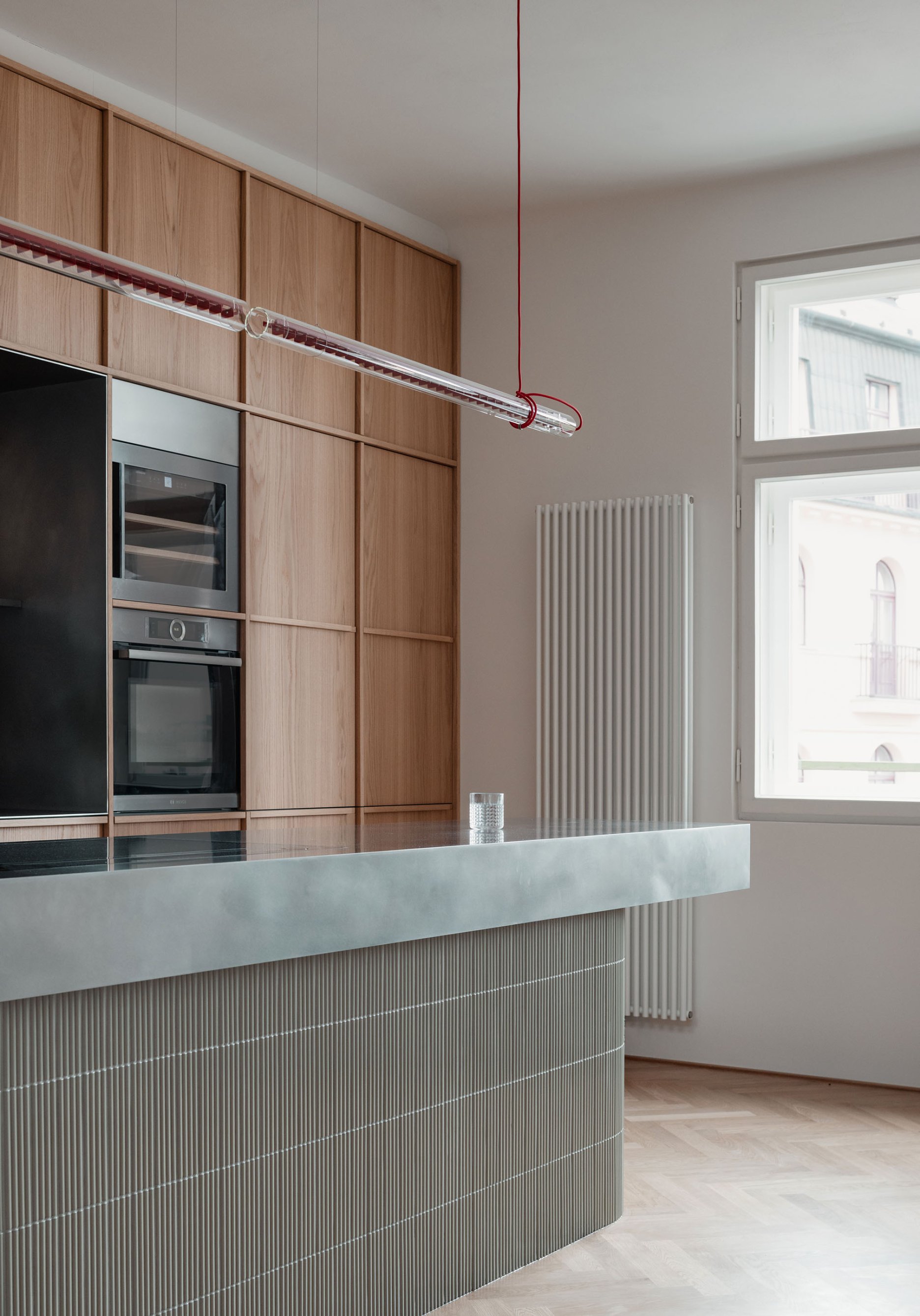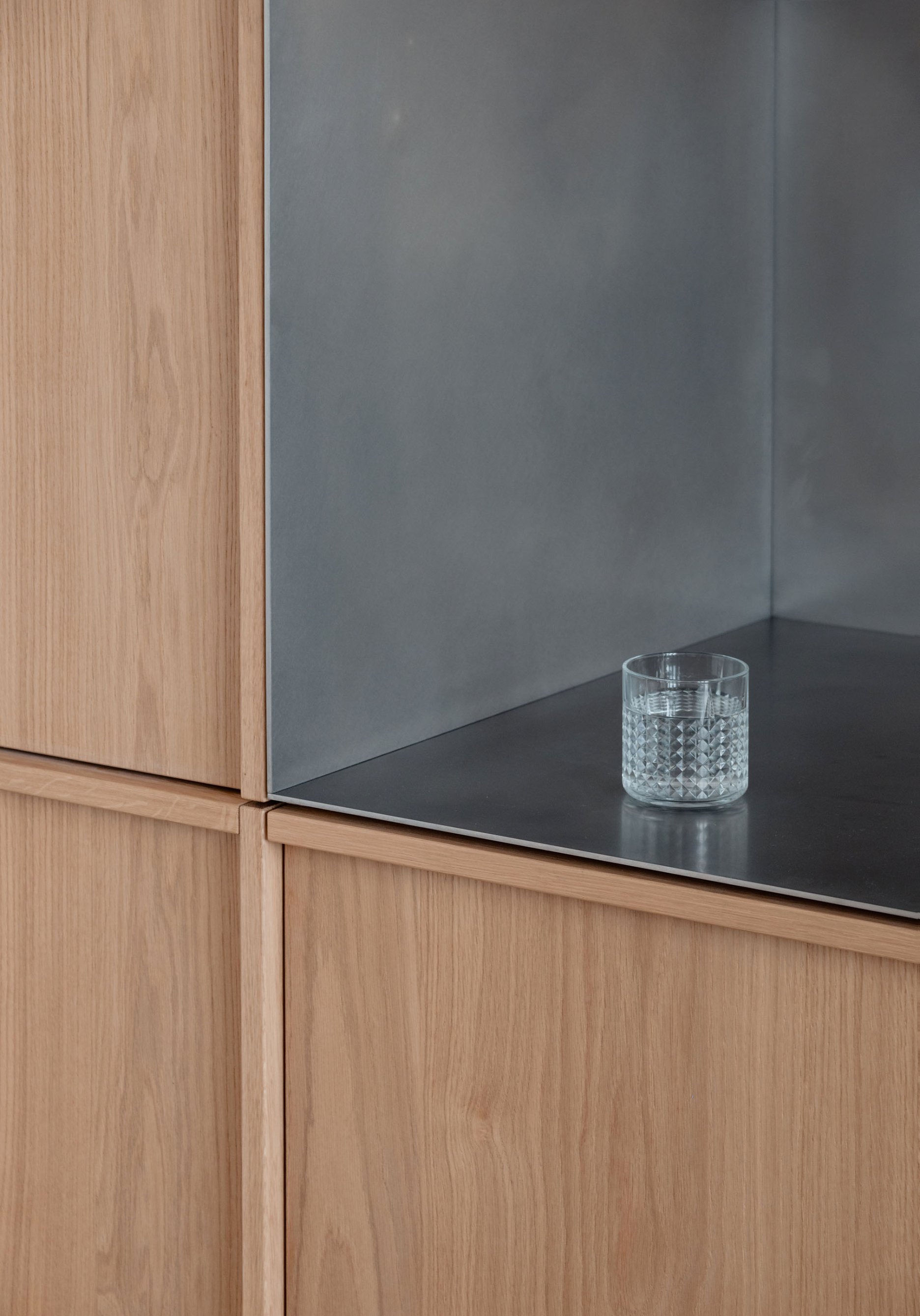 Návrh pracuje s konceptom priestoru, ktorý možno v priebehu času jednoducho prispôsobovať. Všetky vstavané prvky sú preto riešené čo najneutrálnejšie, aby umožnili doplnenie interiéru výraznejším mobiliárom. Materialita nábytku korešponduje s odtieňom vlysovej podlahy. Dominantné drevo dopĺňajú nerezové detaily.