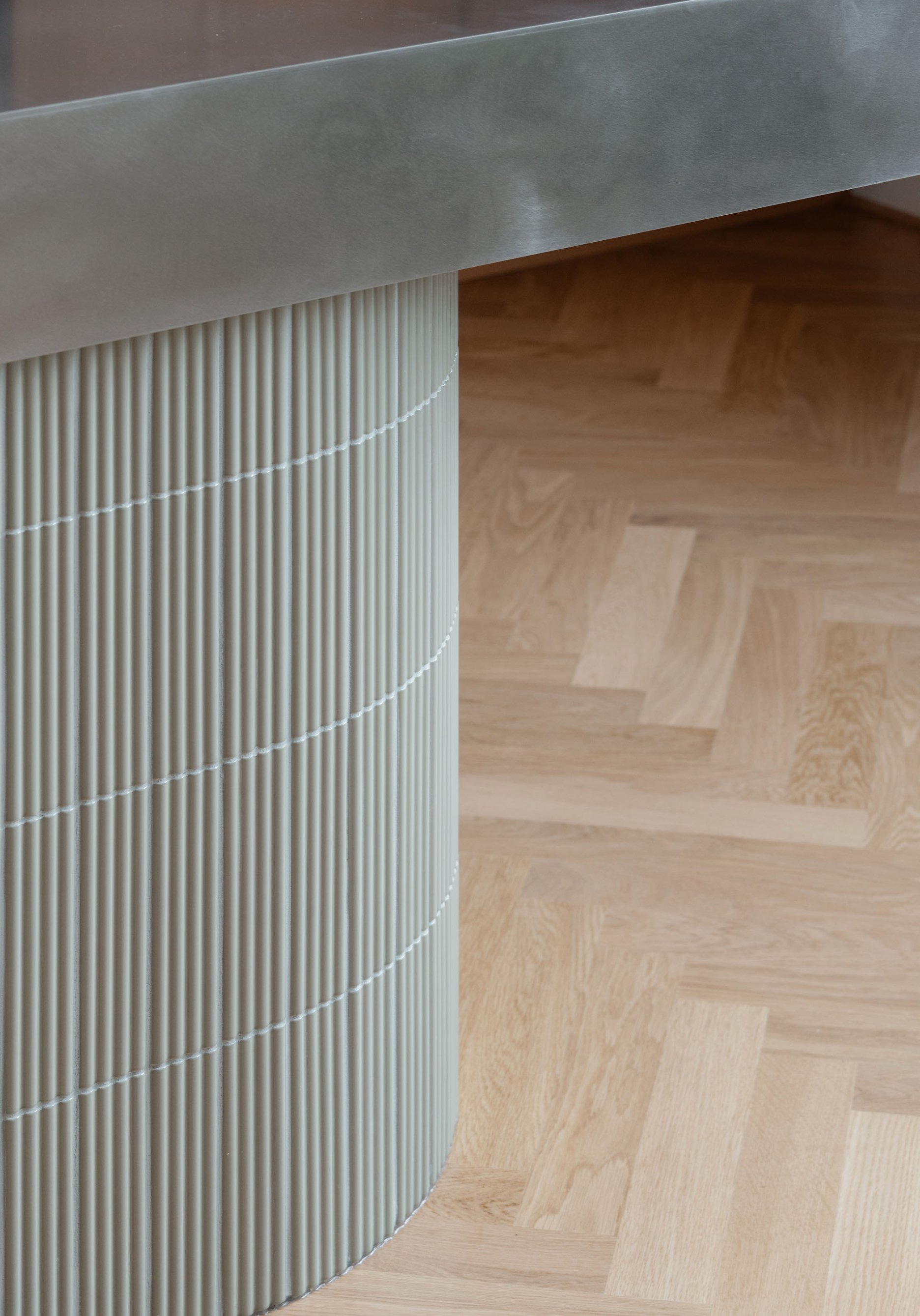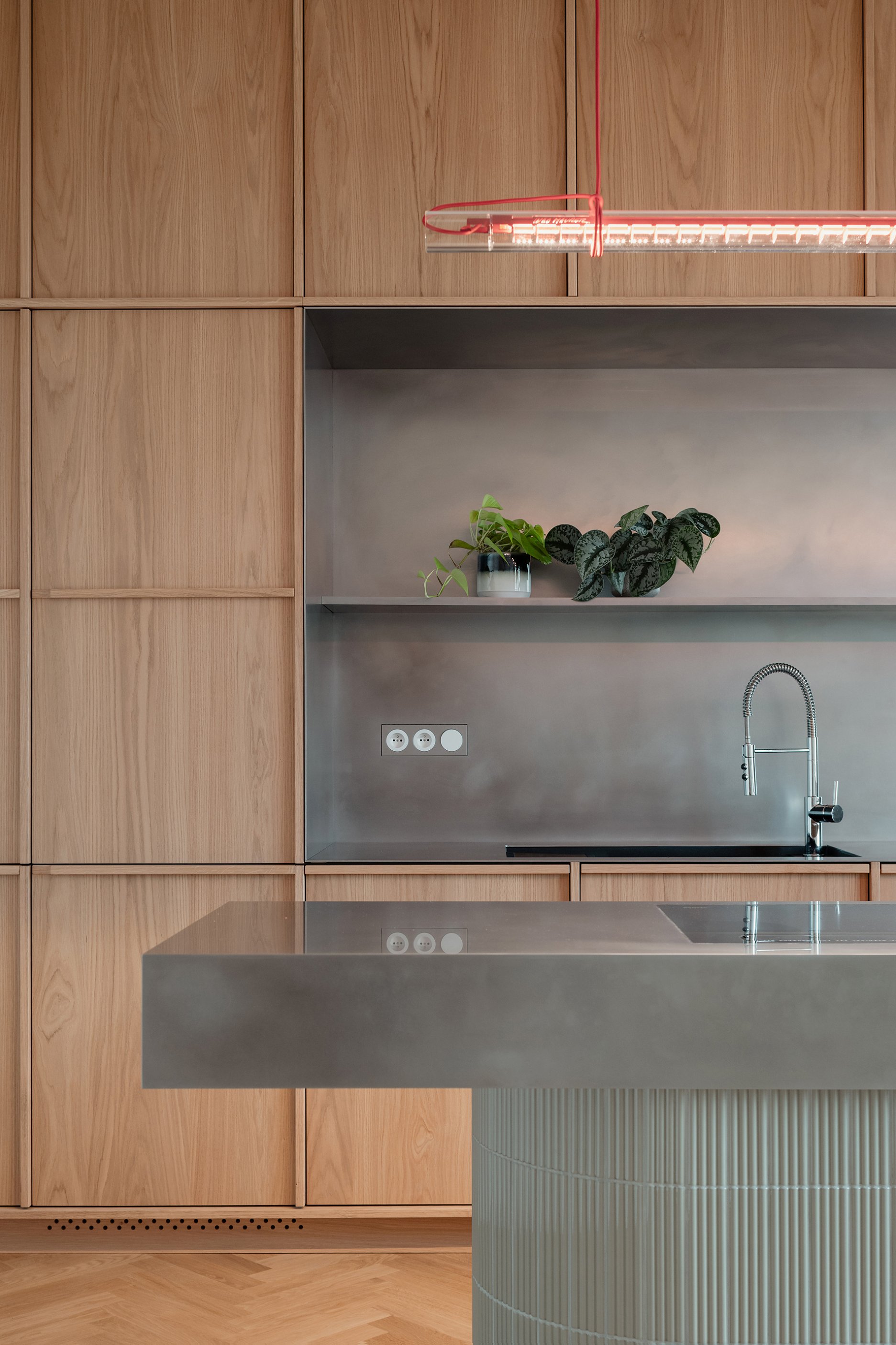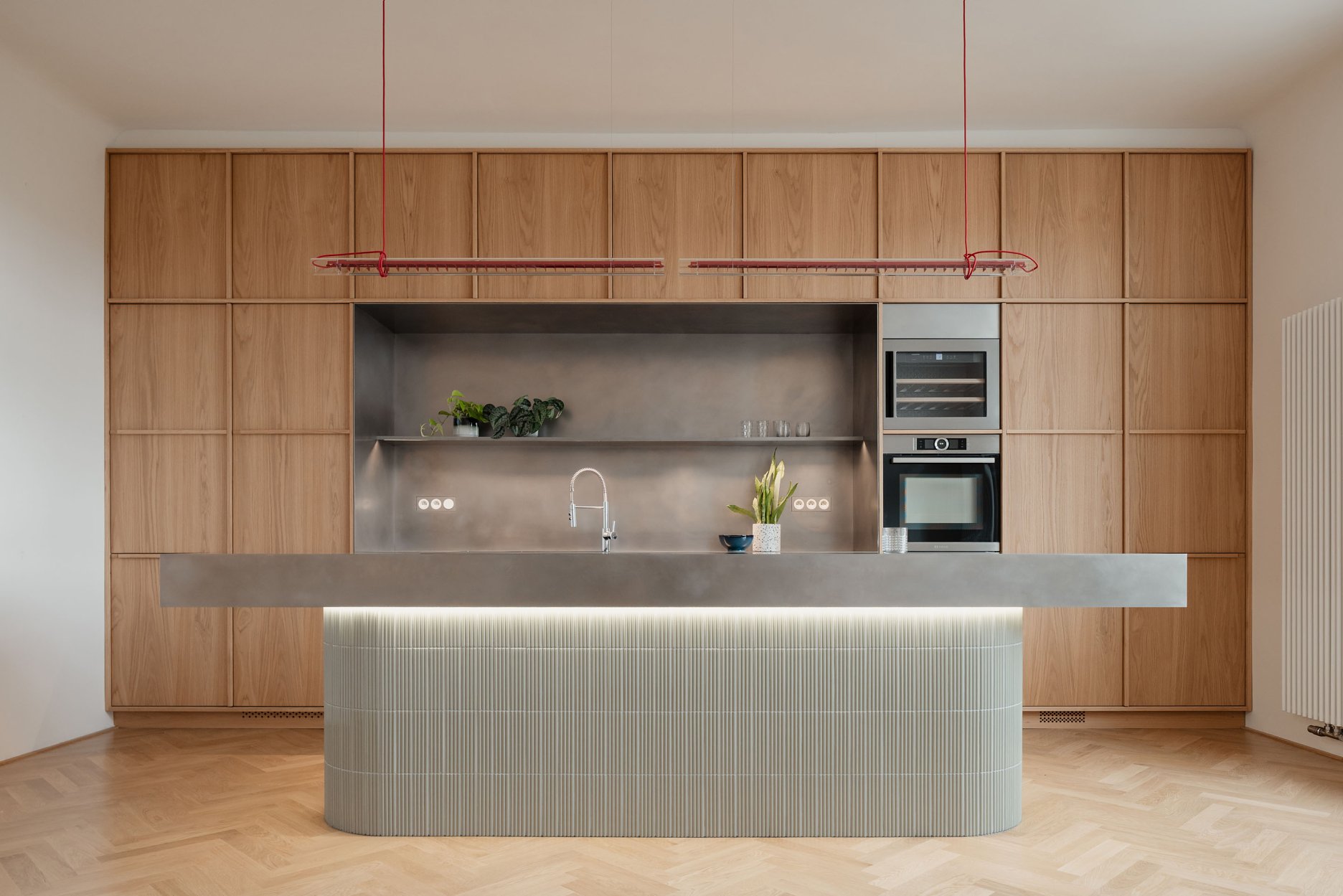 Návrh pracuje s konceptom priestoru, ktorý možno v priebehu času jednoducho prispôsobovať. Všetky vstavané prvky sú preto riešené čo najneutrálnejšie, aby umožnili doplnenie interiéru výraznejším mobiliárom. Materialita nábytku korešponduje s odtieňom vlysovej podlahy. Dominantné drevo dopĺňajú nerezové detaily.