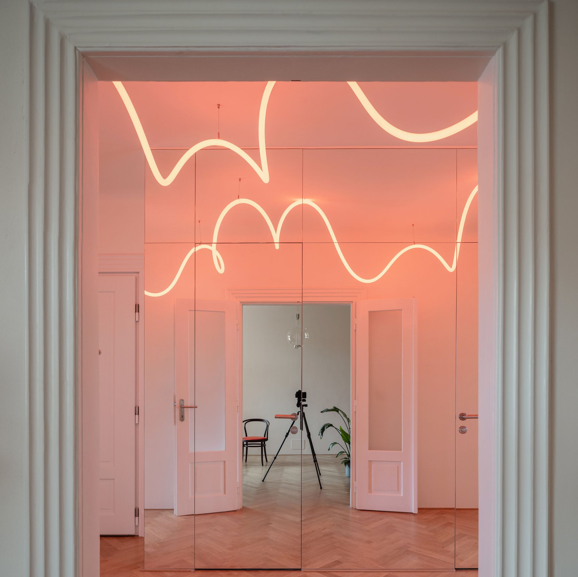 Pôvodné usporiadanie kúpeľne a toalety nevyhovovalo požadovaným rozmerom, preto ich architekti rozšírili do časti chodby. Zrkadlová stena iluzívne skrýva vložený objem kúpeľne. V kúpeľni a na sokli barového pultu je použitý plastický oblúkový obklad, ktorý nadväzuje na reliéf pôvodných kanelovaných zárubní.