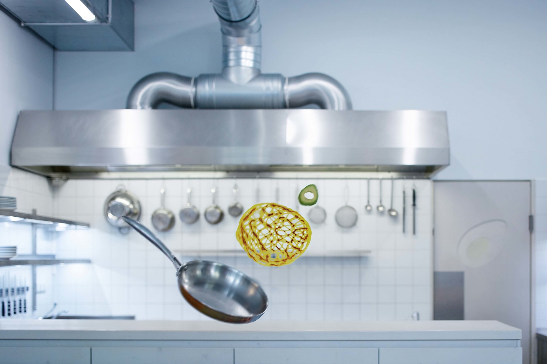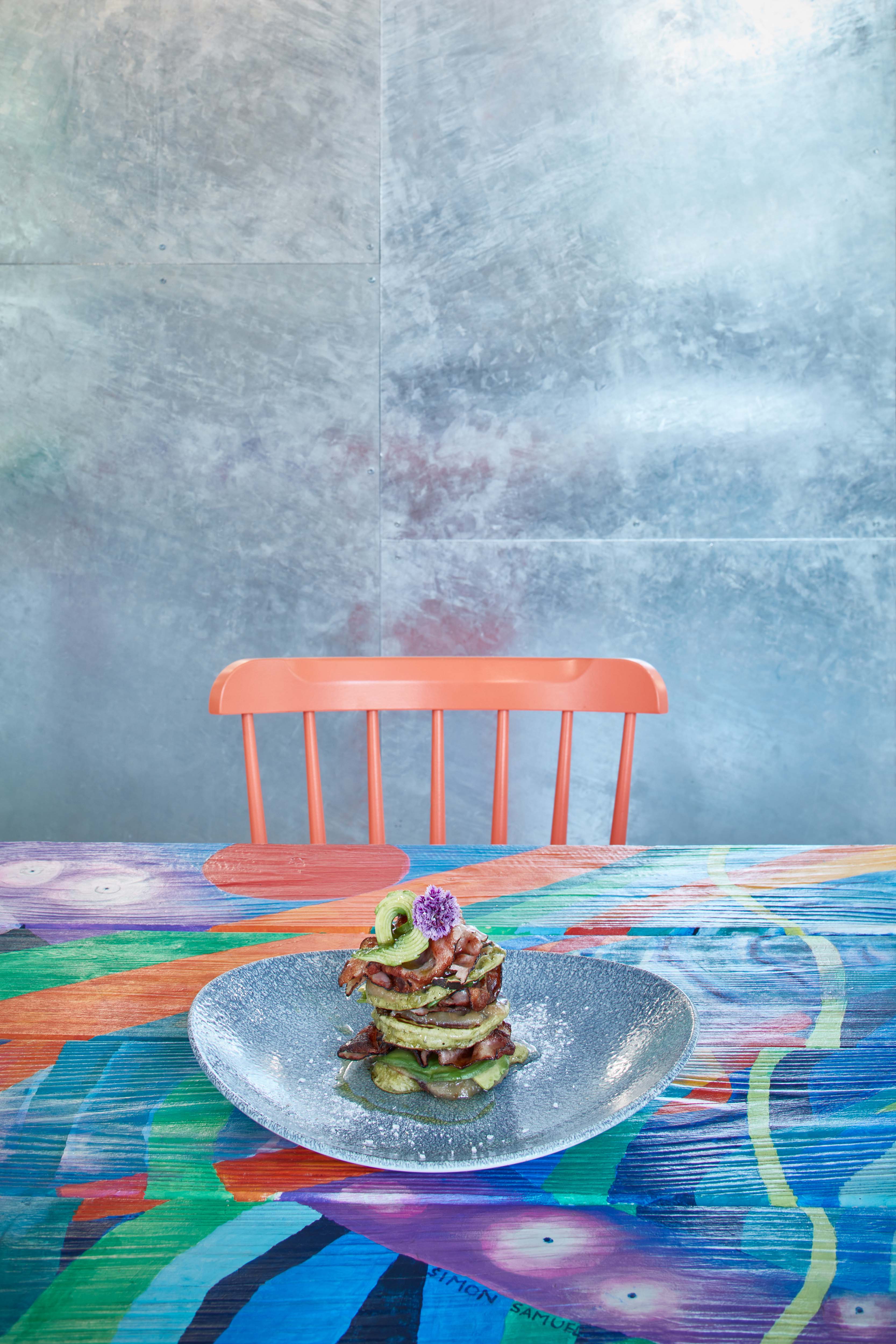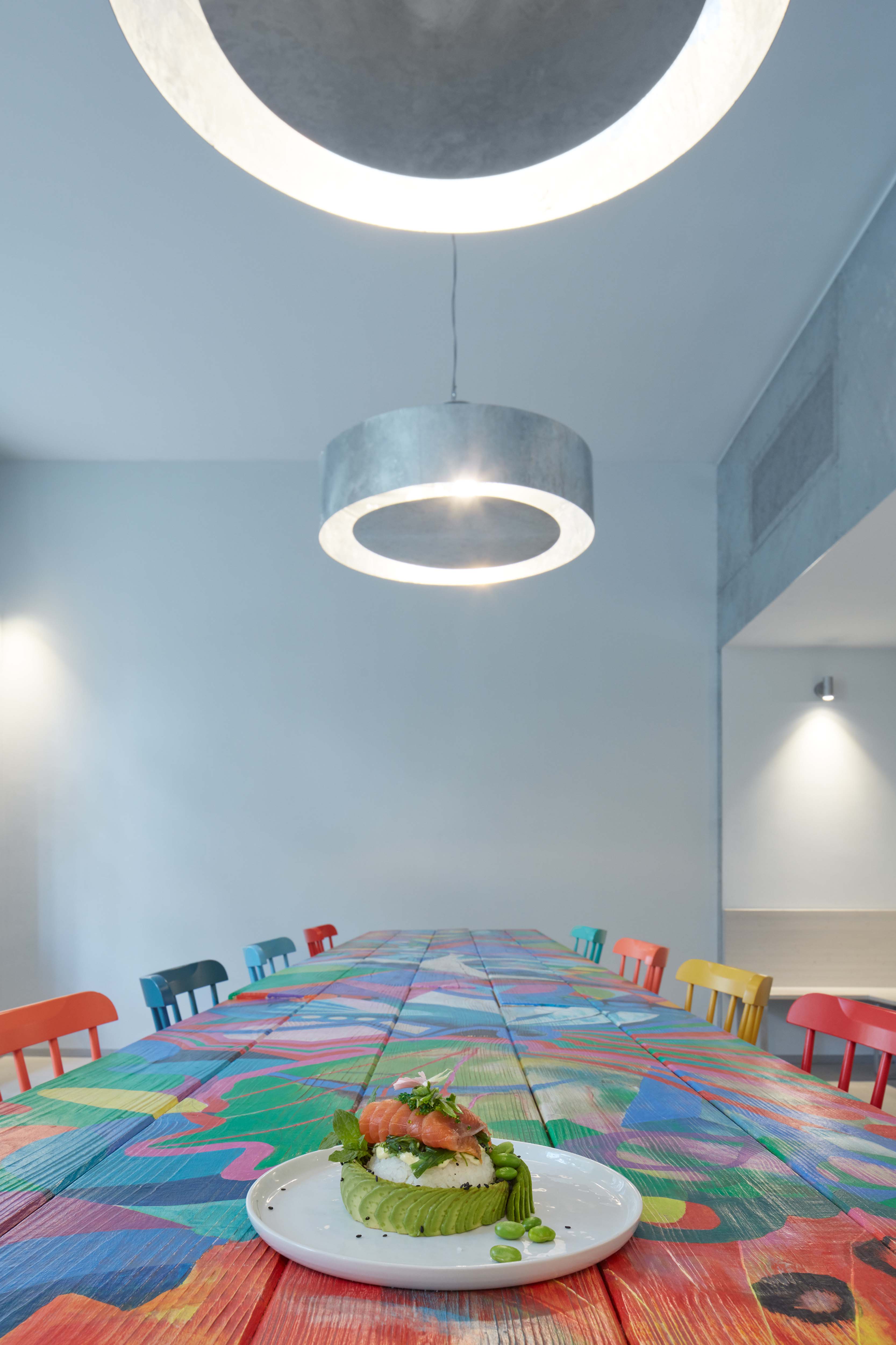 Otvorená kuchyňa umožňuje hosťom pohľad na prípravu čerstvých porcií. “Pestré barvy stolu jsou odvozené od výrazné barevnosti avokáda a jídel z něj připravených,” vysvetľujú autori. "Nefarby" v škále odtieňov sivej tvoria neutrálne pozadie pre pestré ústredné prvky - stôl, stoličky a v prvom rade servírované porcie.
