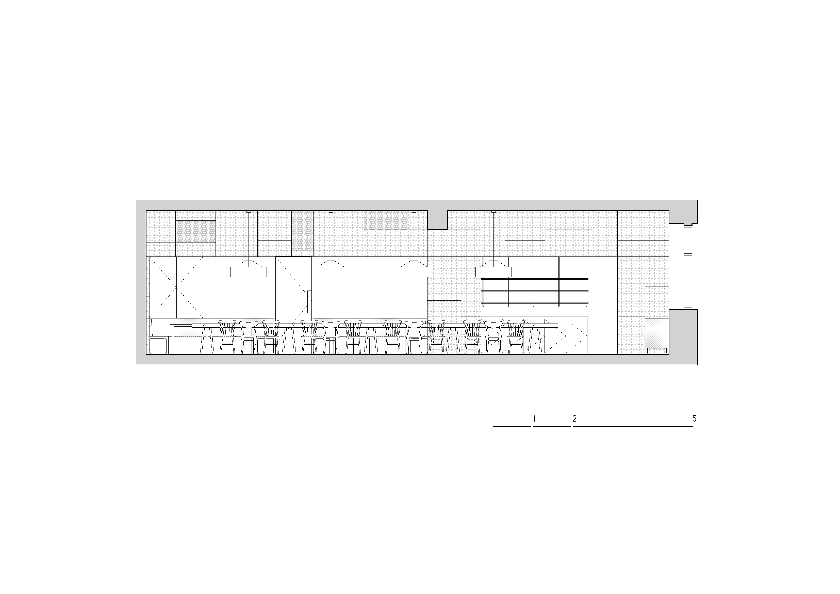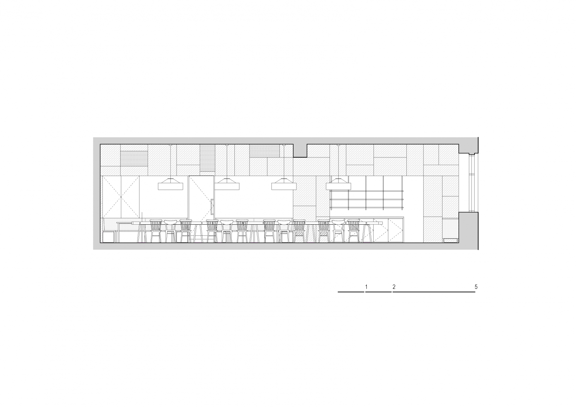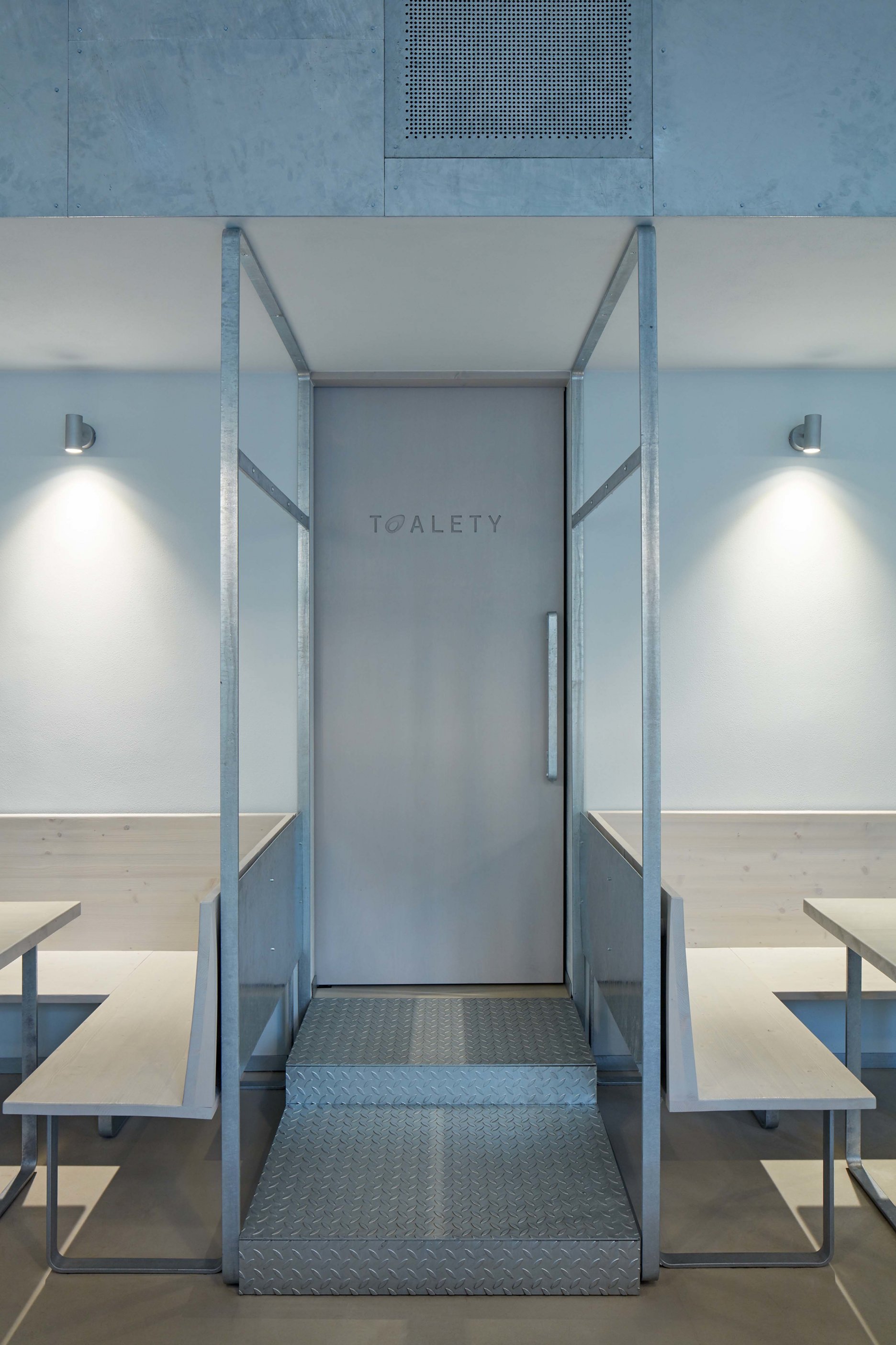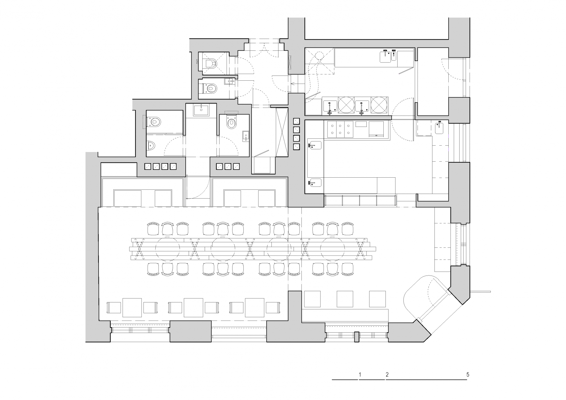 Doska stola je vyskladaná z masívnych smrekových hranolov s prierezom 160 x 100mm, ktoré nesie podnož zvarená z pozinkovaných oceľových profilov. Smrekové drevo sa v interiéri objavuje aj v podobe lazúrovanej biodosky, pozinkovanú oceľ nájdeme aj na rámoch ďalších stolov a stoličiek, na svietidlách, umývadlách, alebo obklade steny oddeľujúcej odbytovú časť a zázemie reštaurácie. Celok dopĺňa cementová podlahová stierka a jemná svetlosivá grafika. "Dost prostoru každopádně zůstává pro avokádo samotné - ať už v očekávatelné podobě guacamole nebo avokádových lívanců se slaninou," dodávajú s nadhľadom autori.