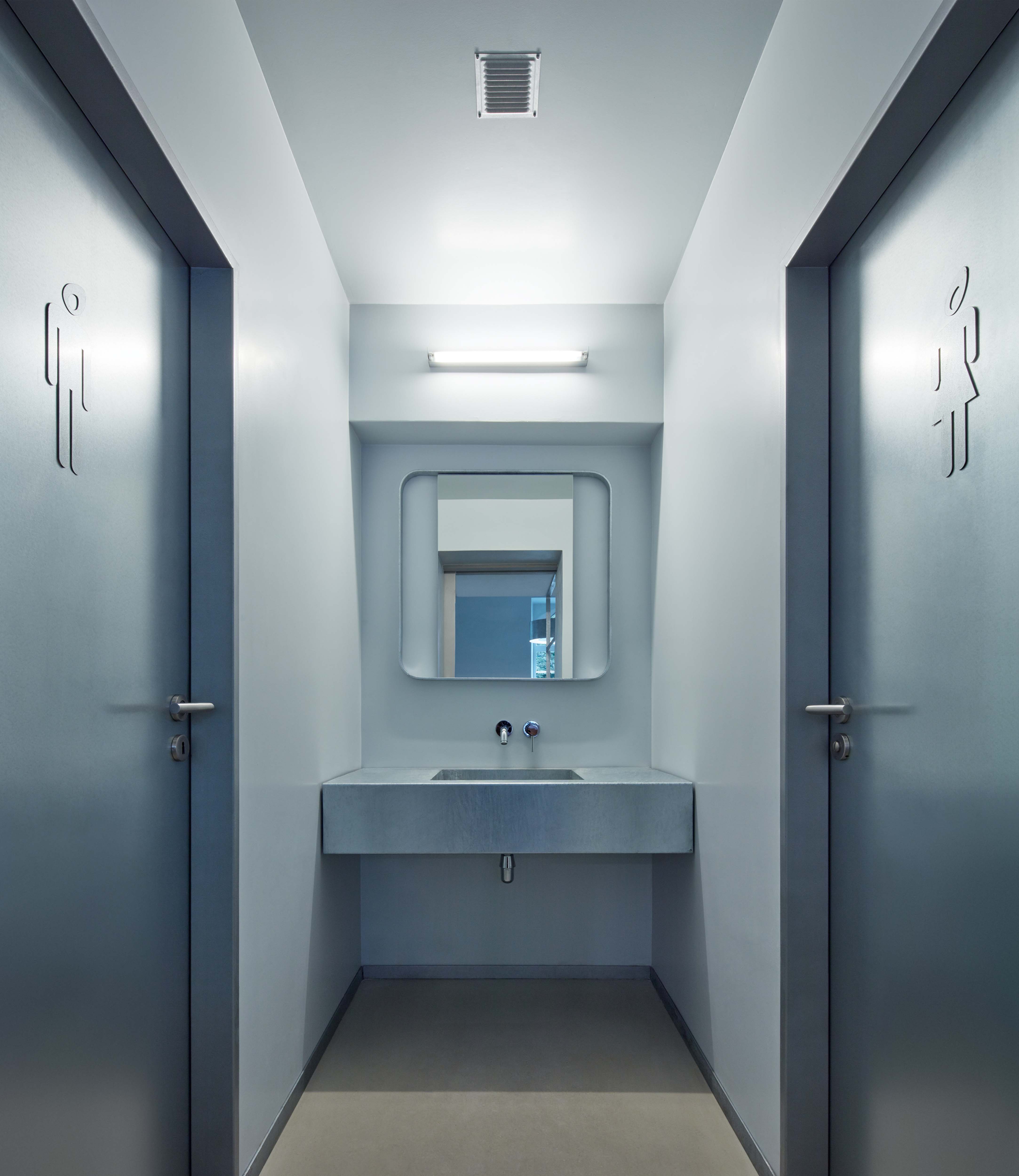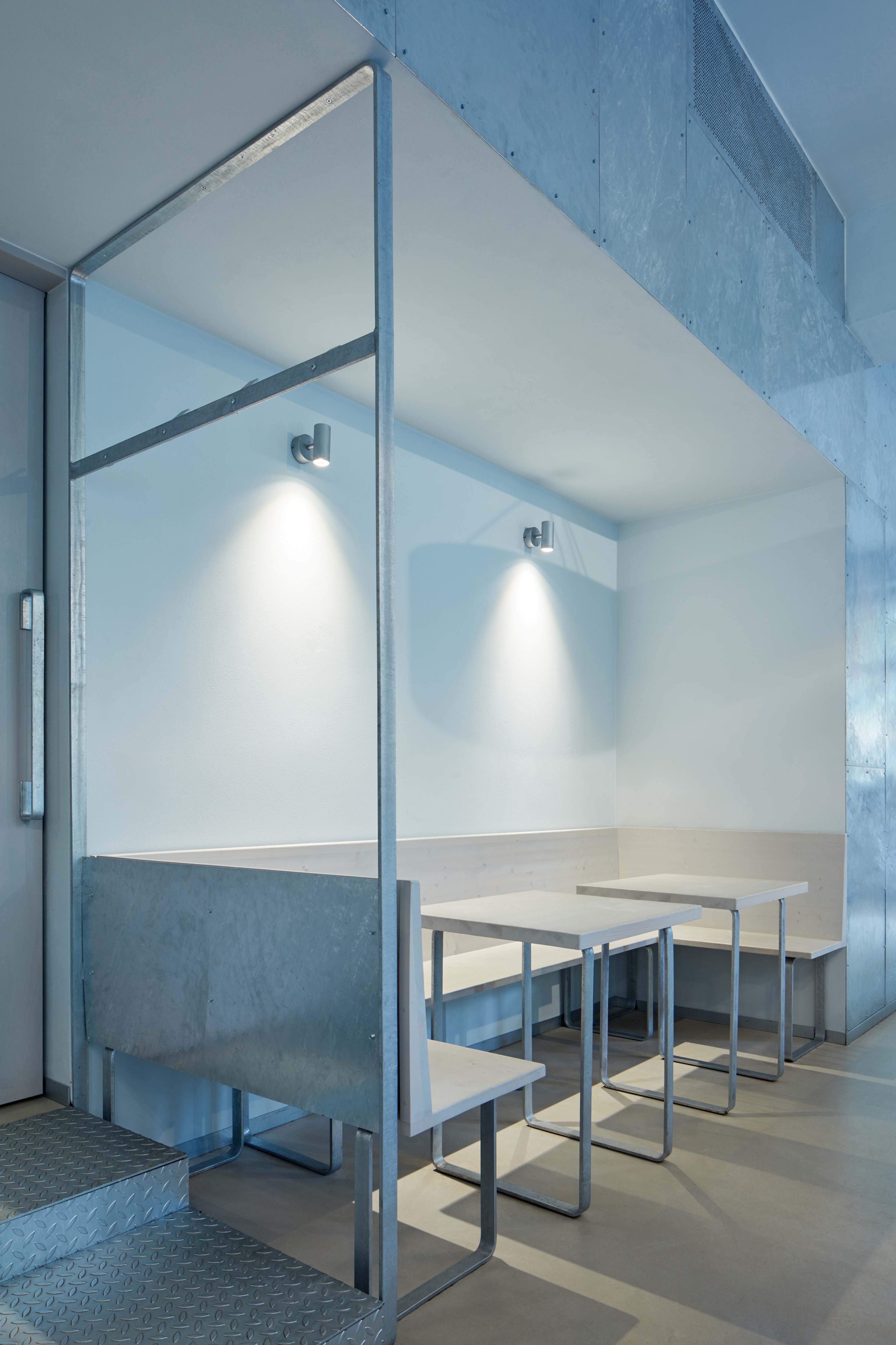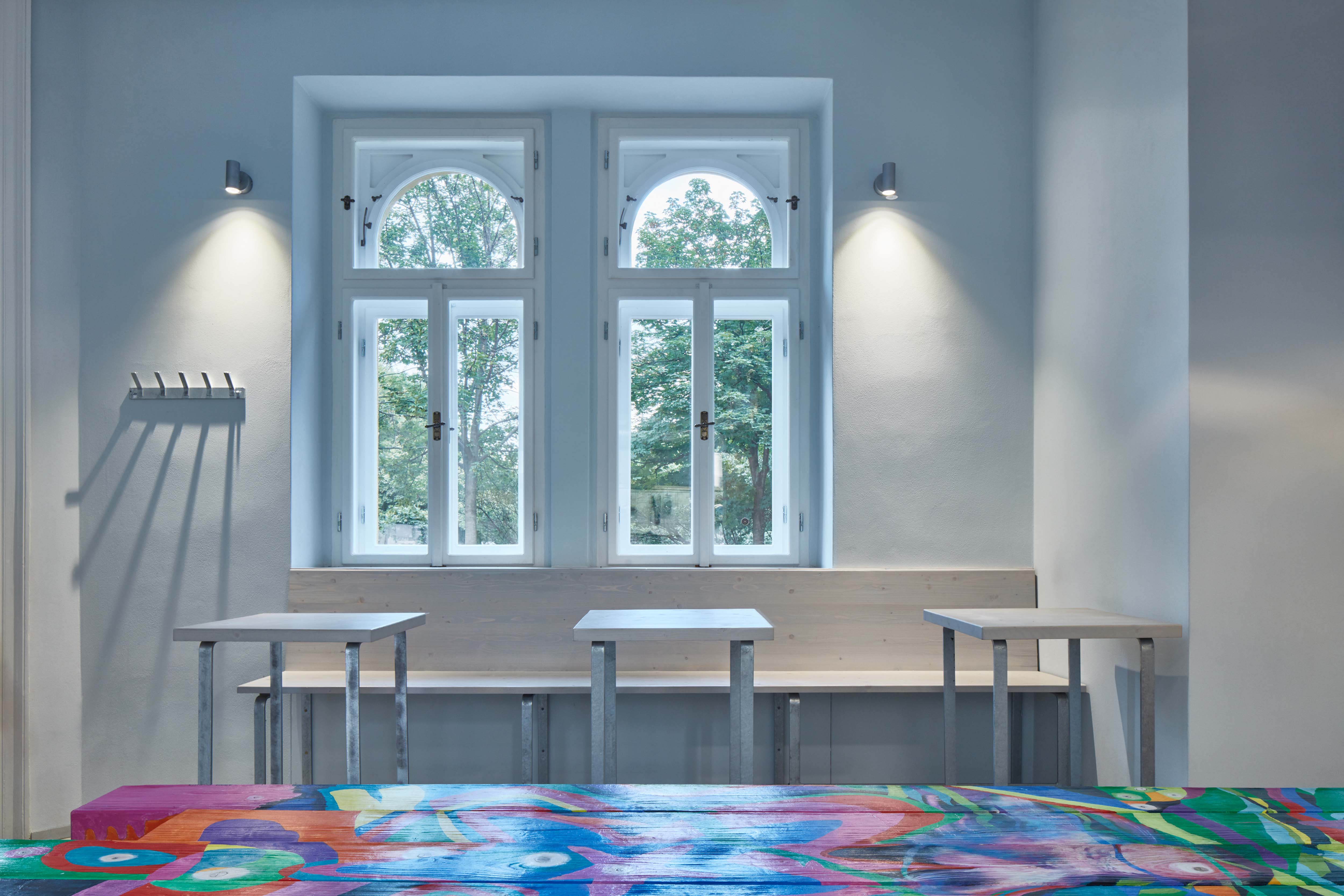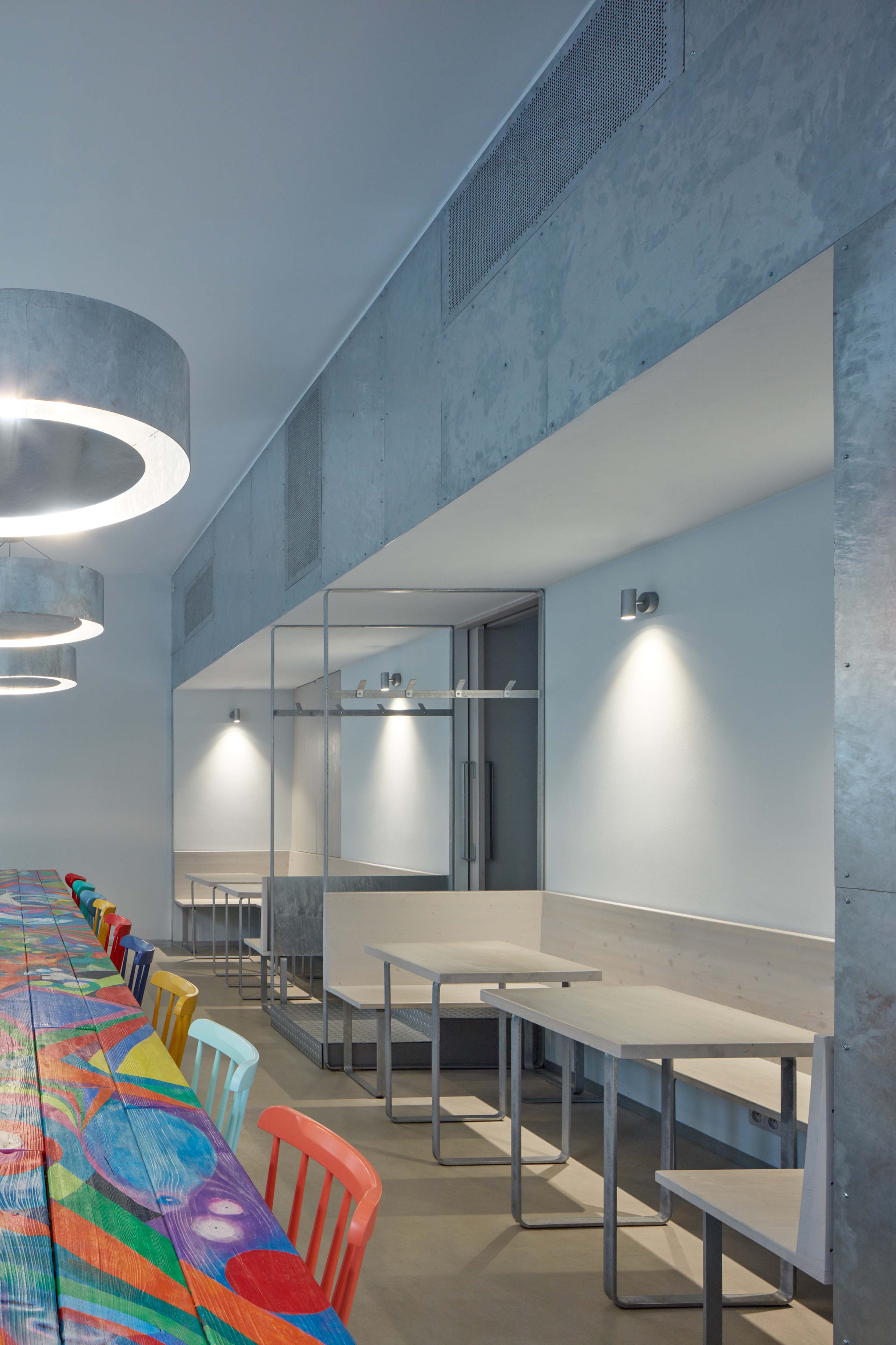 Doska stola je vyskladaná z masívnych smrekových hranolov s prierezom 160 x 100mm, ktoré nesie podnož zvarená z pozinkovaných oceľových profilov. Smrekové drevo sa v interiéri objavuje aj v podobe lazúrovanej biodosky, pozinkovanú oceľ nájdeme aj na rámoch ďalších stolov a stoličiek, na svietidlách, umývadlách, alebo obklade steny oddeľujúcej odbytovú časť a zázemie reštaurácie. Celok dopĺňa cementová podlahová stierka a jemná svetlosivá grafika. "Dost prostoru každopádně zůstává pro avokádo samotné - ať už v očekávatelné podobě guacamole nebo avokádových lívanců se slaninou," dodávajú s nadhľadom autori.