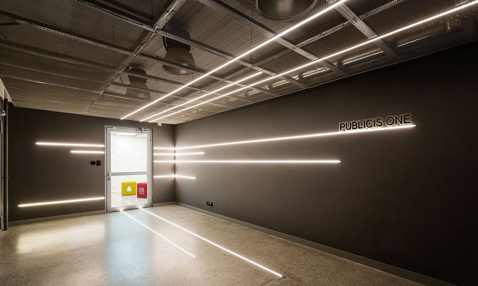 Po otevření dveří výtahu vás světelné linie tmavých stěn navedou tím správným směrem, na jednání se společností Publicis One.