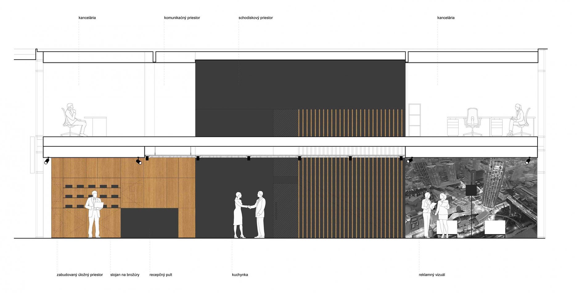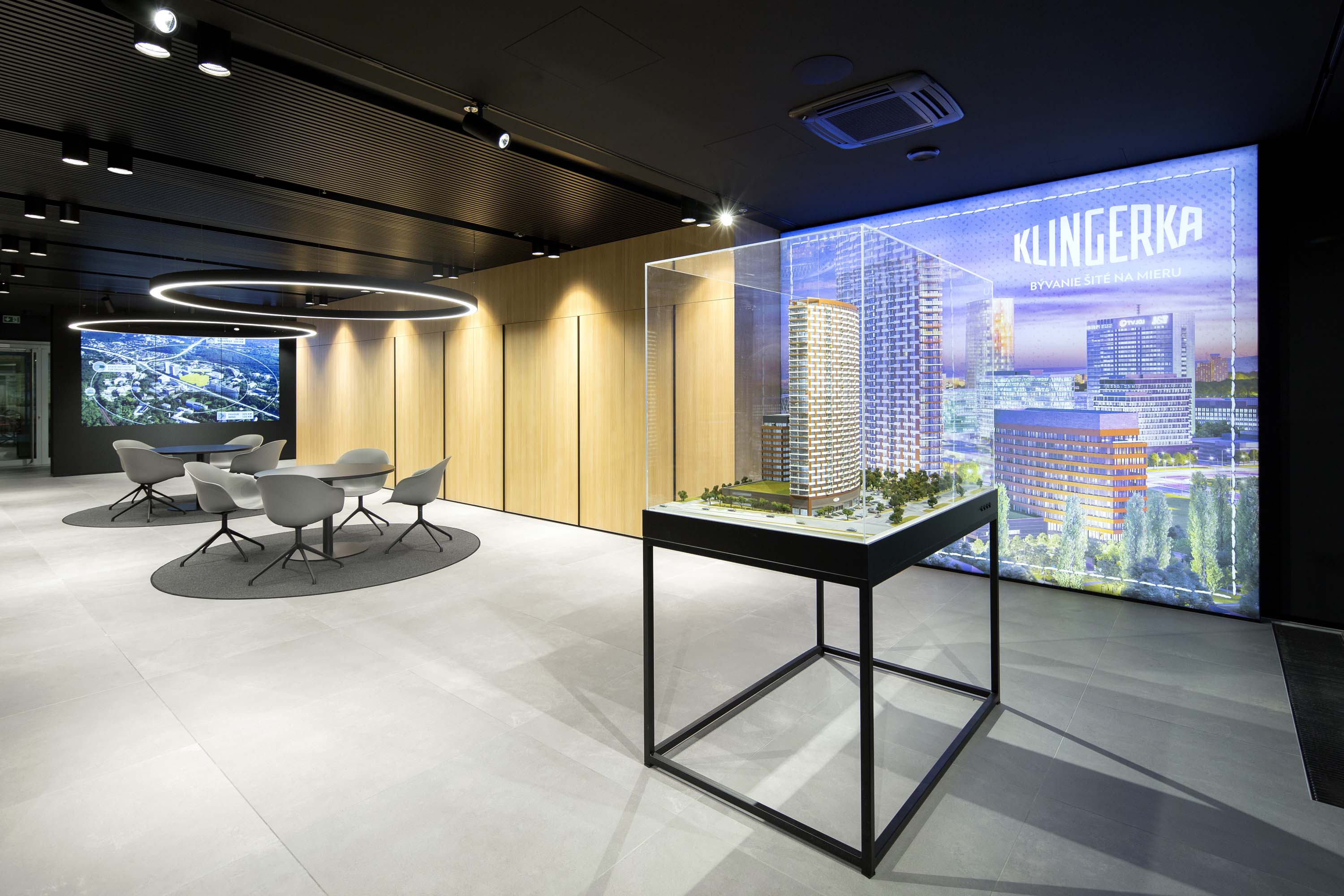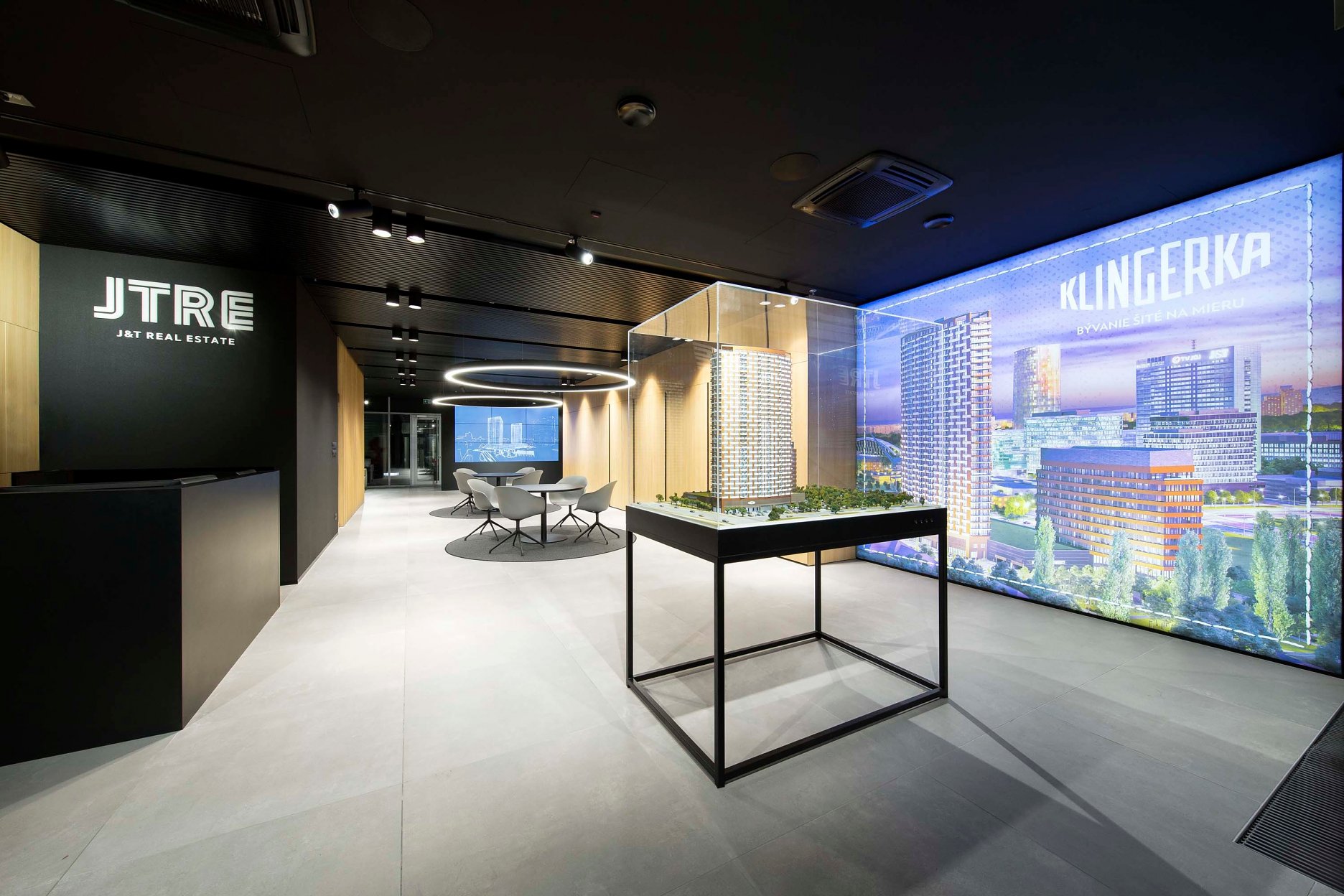 Po vstupe do priestorov klient "narazí" na zámerne nenápadnú recepciu. Recepčný pult je tvarovo minimálny a čierny ako väčšia časť stien a stropov. Čierna farba vytvára scénickú atmosféru, kde je všetko nepodstatné vizuálne potlačené. Prezentačné plochy a modely sú osvetlené a smerovo nasvietené. Pútajú pozornosť a vystupujú do popredia. Zadnú plochu viditeľnú už od vstupu definuje LED stena. Na tejto ploche sa vo forme slučky dynamicky premieta prezentácia developera. Zároveň slúži obchodníkom na interaktívne zobrazenie projektov. Dve konzultačné pracoviská sú v priestore vymedzené osvetlením.