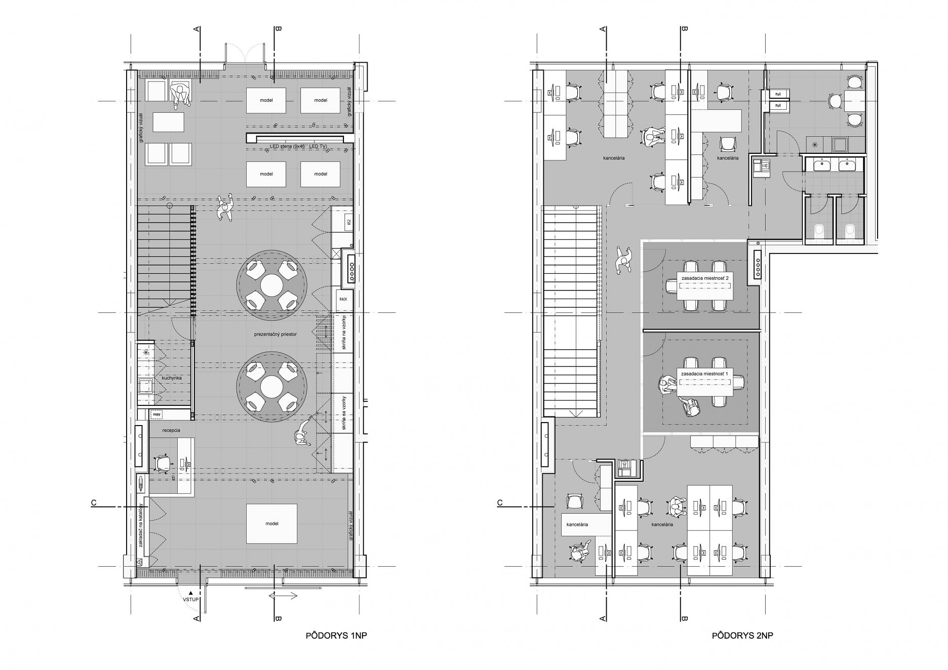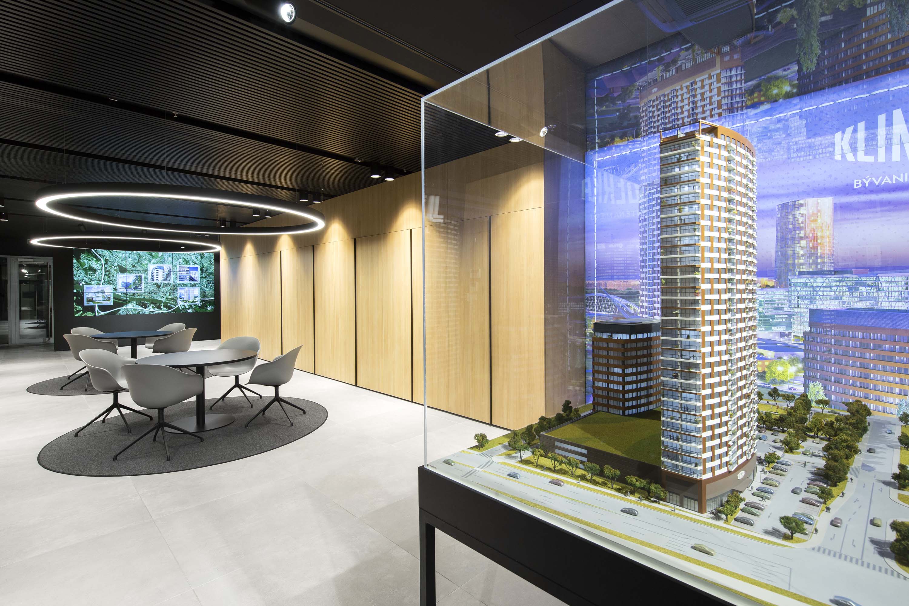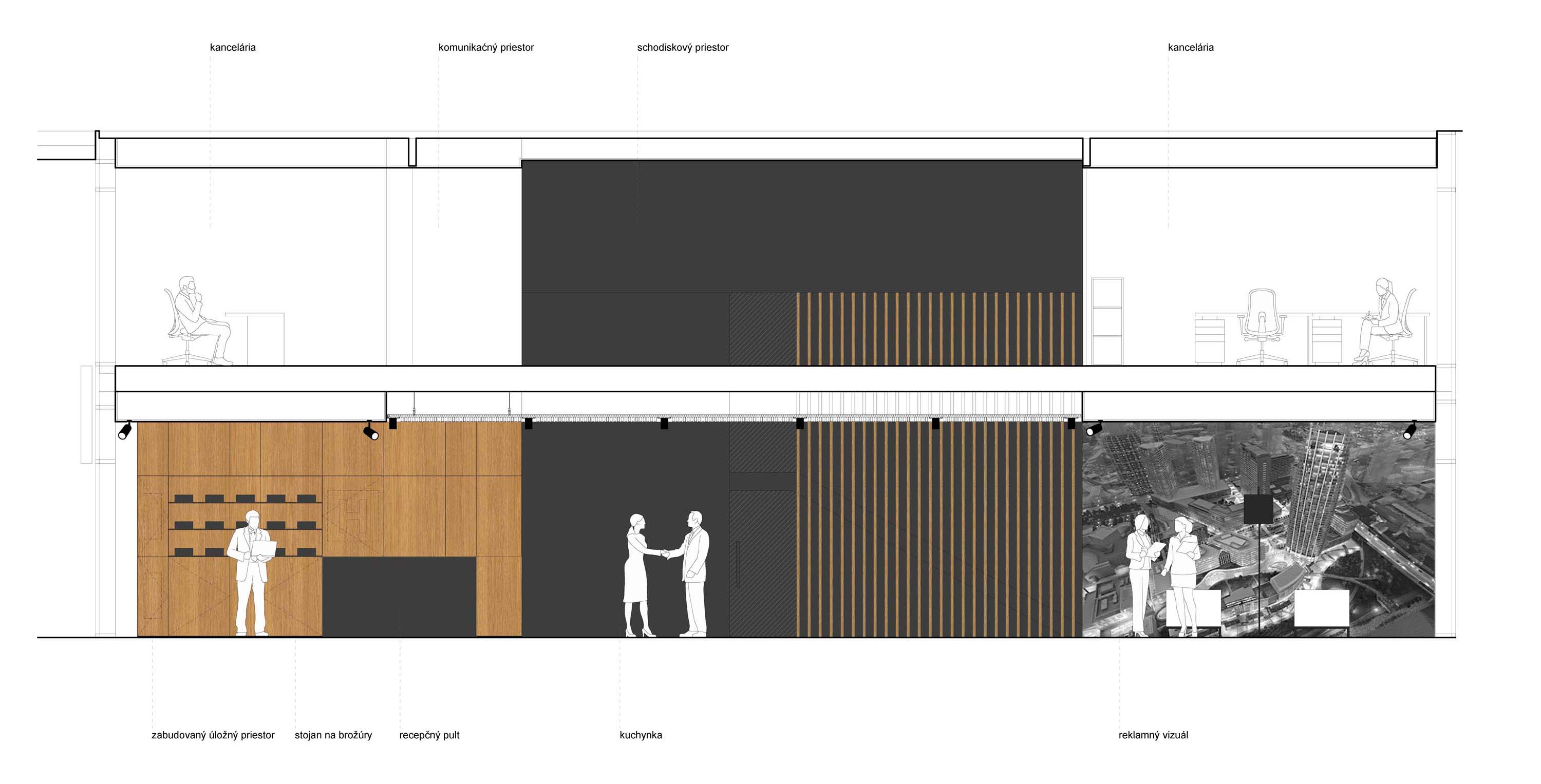 Po vstupe do priestorov klient "narazí" na zámerne nenápadnú recepciu. Recepčný pult je tvarovo minimálny a čierny ako väčšia časť stien a stropov. Čierna farba vytvára scénickú atmosféru, kde je všetko nepodstatné vizuálne potlačené. Prezentačné plochy a modely sú osvetlené a smerovo nasvietené. Pútajú pozornosť a vystupujú do popredia. Zadnú plochu viditeľnú už od vstupu definuje LED stena. Na tejto ploche sa vo forme slučky dynamicky premieta prezentácia developera. Zároveň slúži obchodníkom na interaktívne zobrazenie projektov. Dve konzultačné pracoviská sú v priestore vymedzené osvetlením.