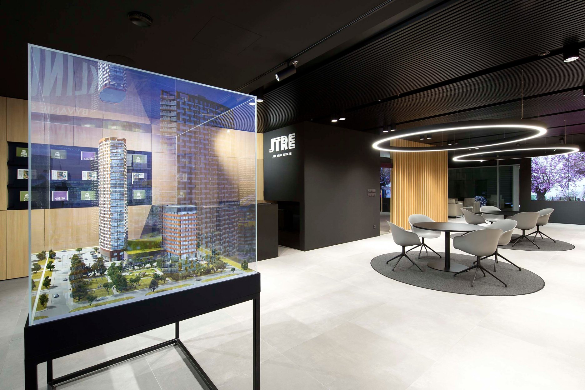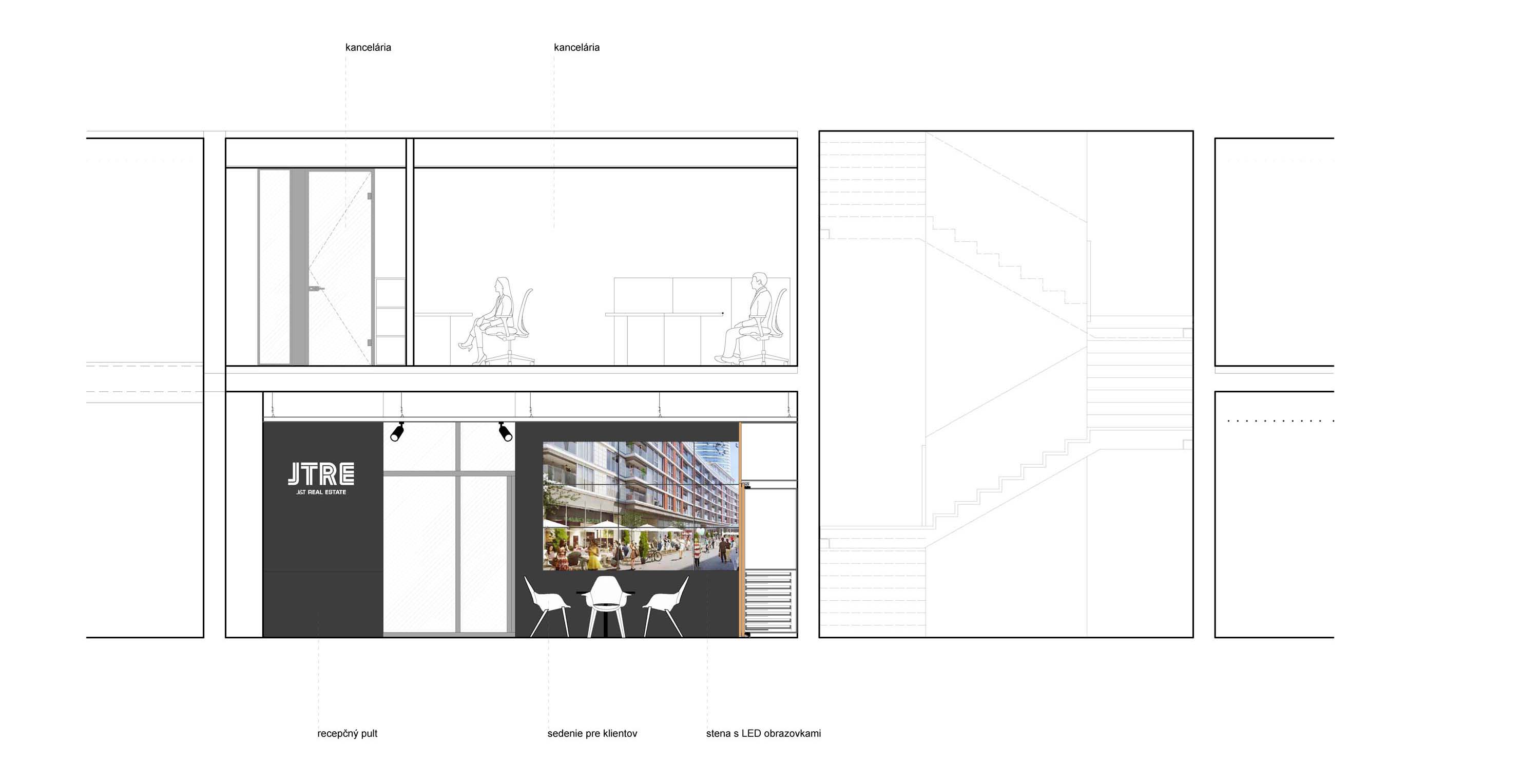Tým sa podčiarklo vertikálne funkčné členenie dvojpodlažného priestoru na dve funkcie. Prízemie je riešené ako informačný, komunikačný a prezentačný priestor pre predaj a prenájom rezidenčných projektov z portfólia JTRE. Na poschodí sú umiestnené kancelárske priestory a zasadačky zamestnancov showroomu.