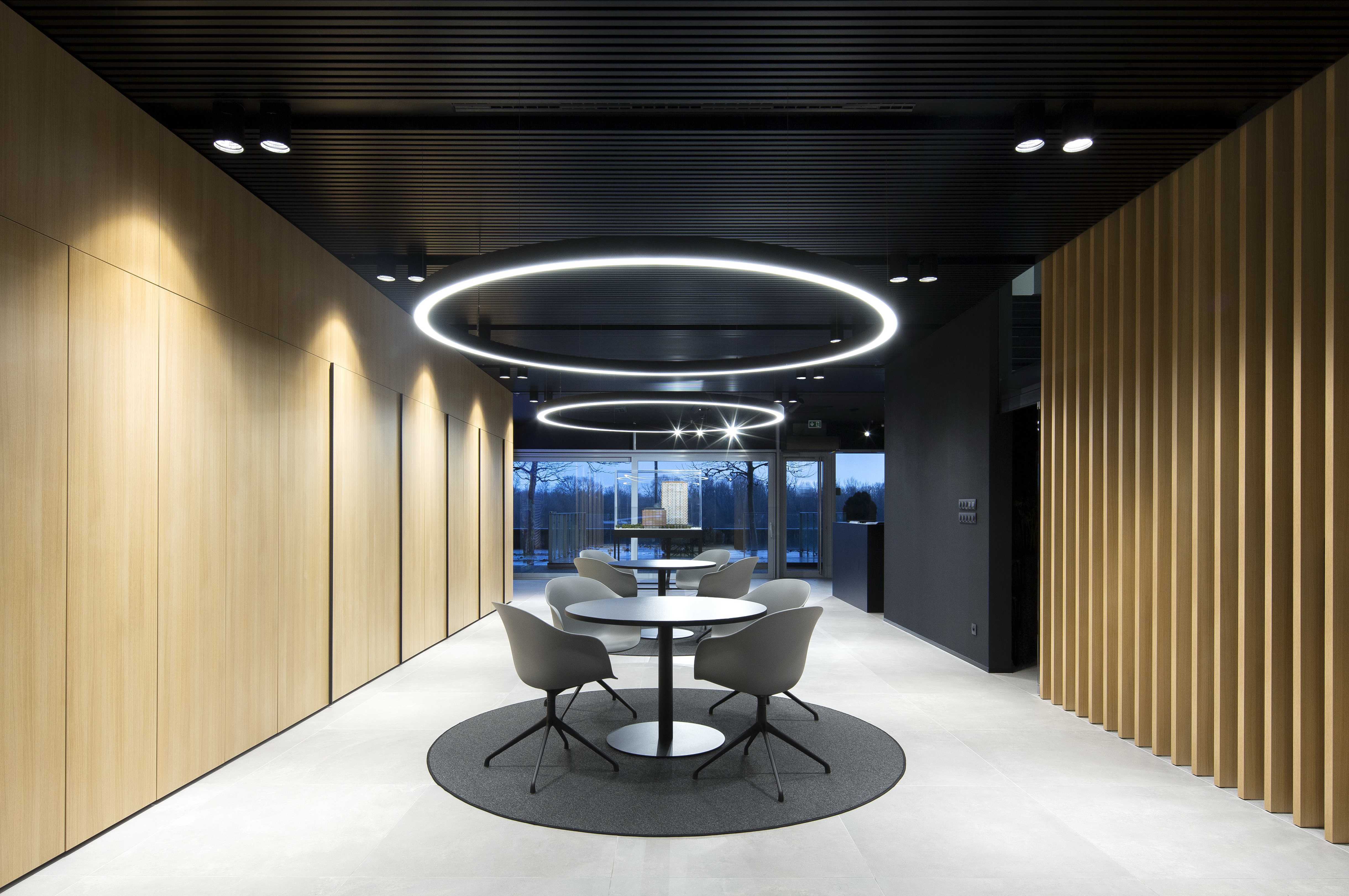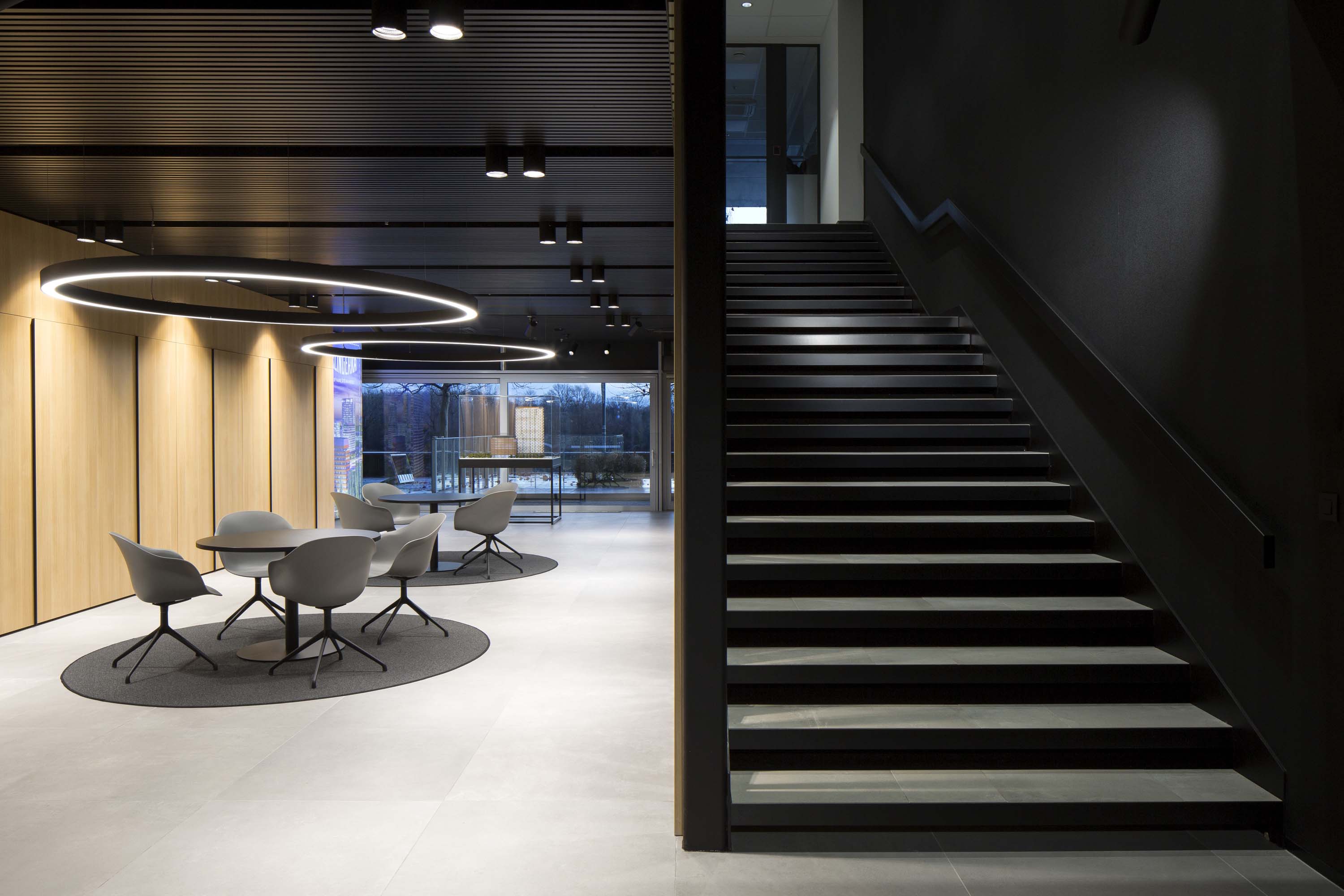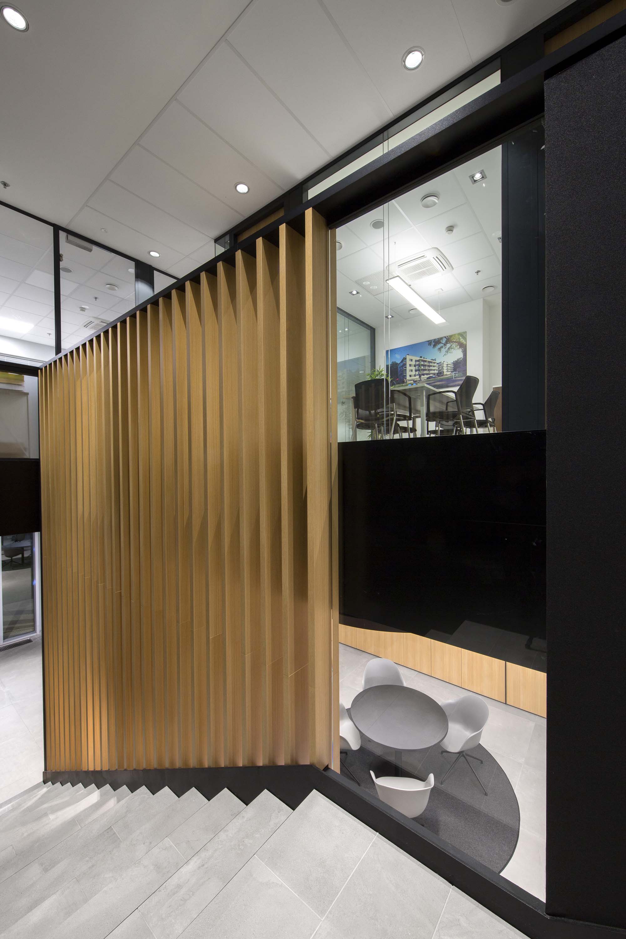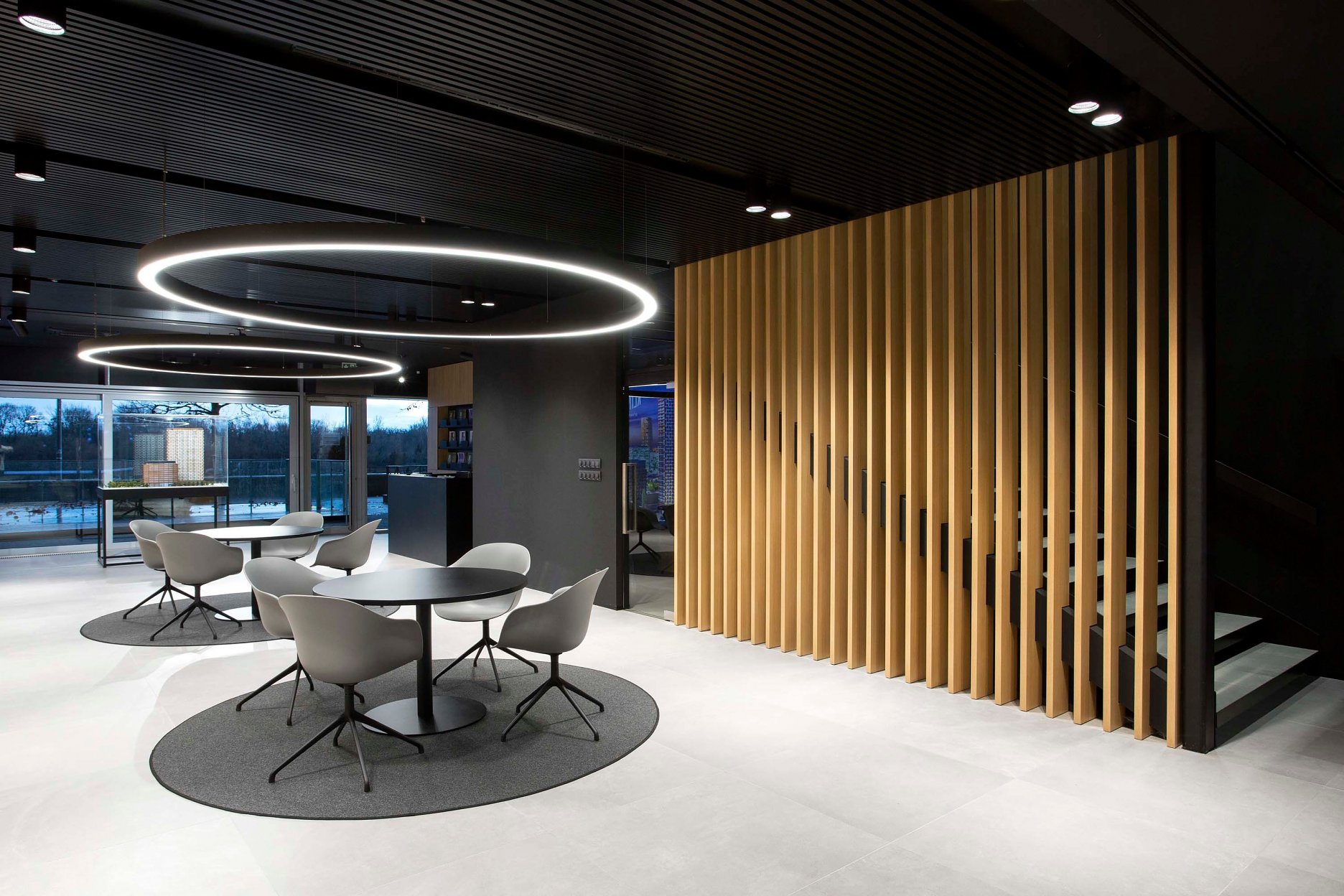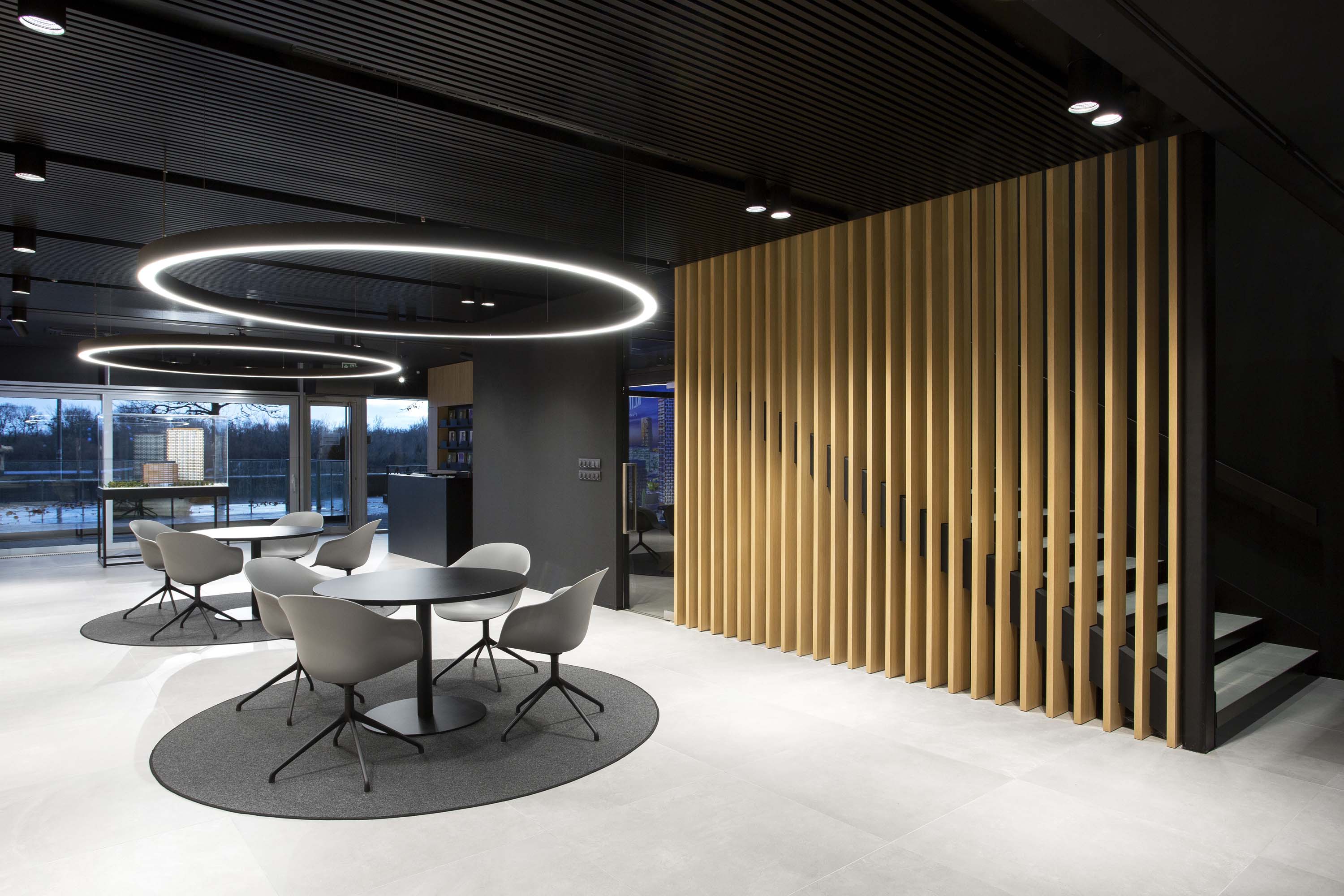 Prehľadný a reprezentatívny interiér. Transparentná fasáda orientovaná na promenádu smeruje pohľady do útrob otvoreného priestoru. Čierna "kulisa" a scénická práca s osvetlením upriamujú pozornosť na prezentované projekty.
