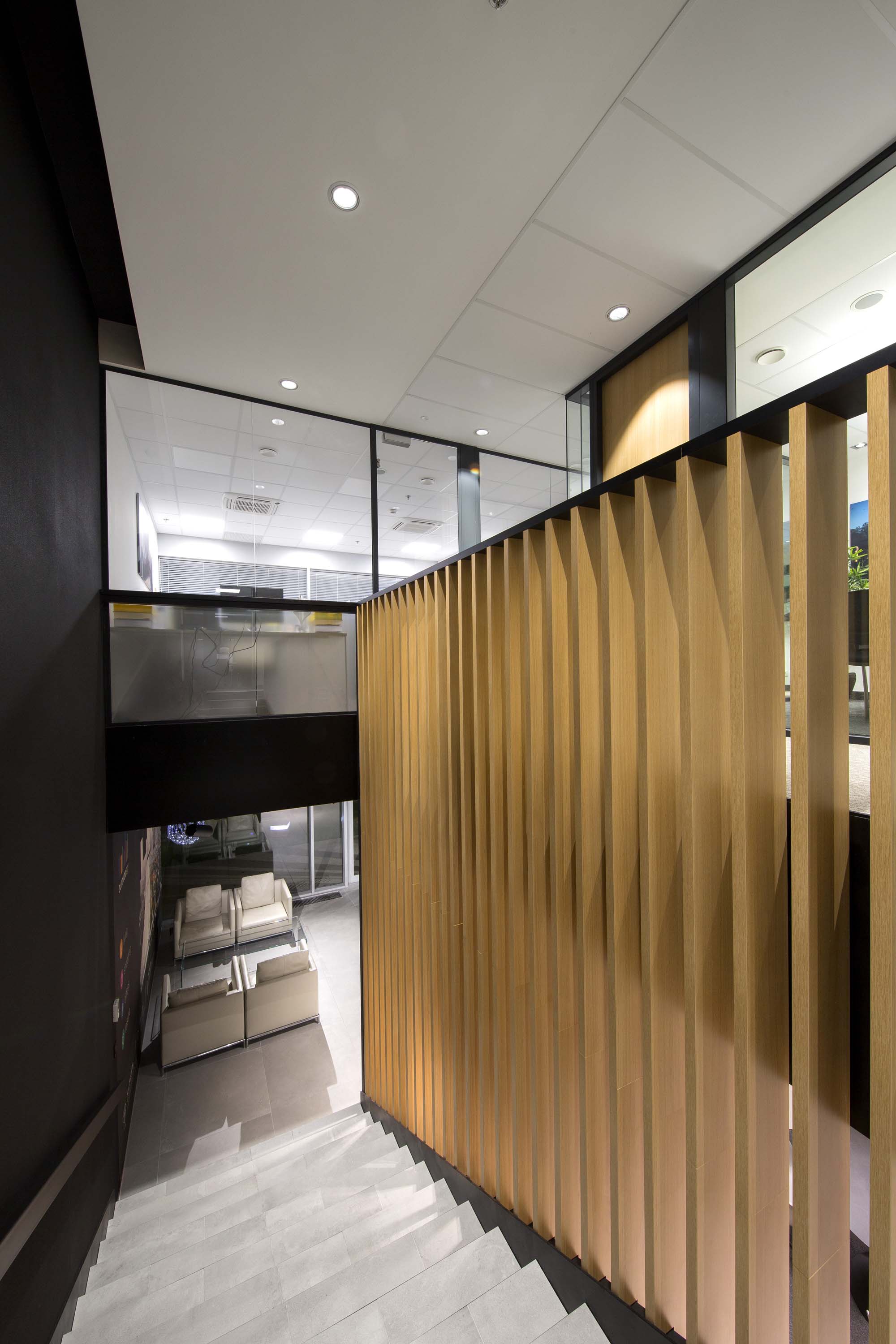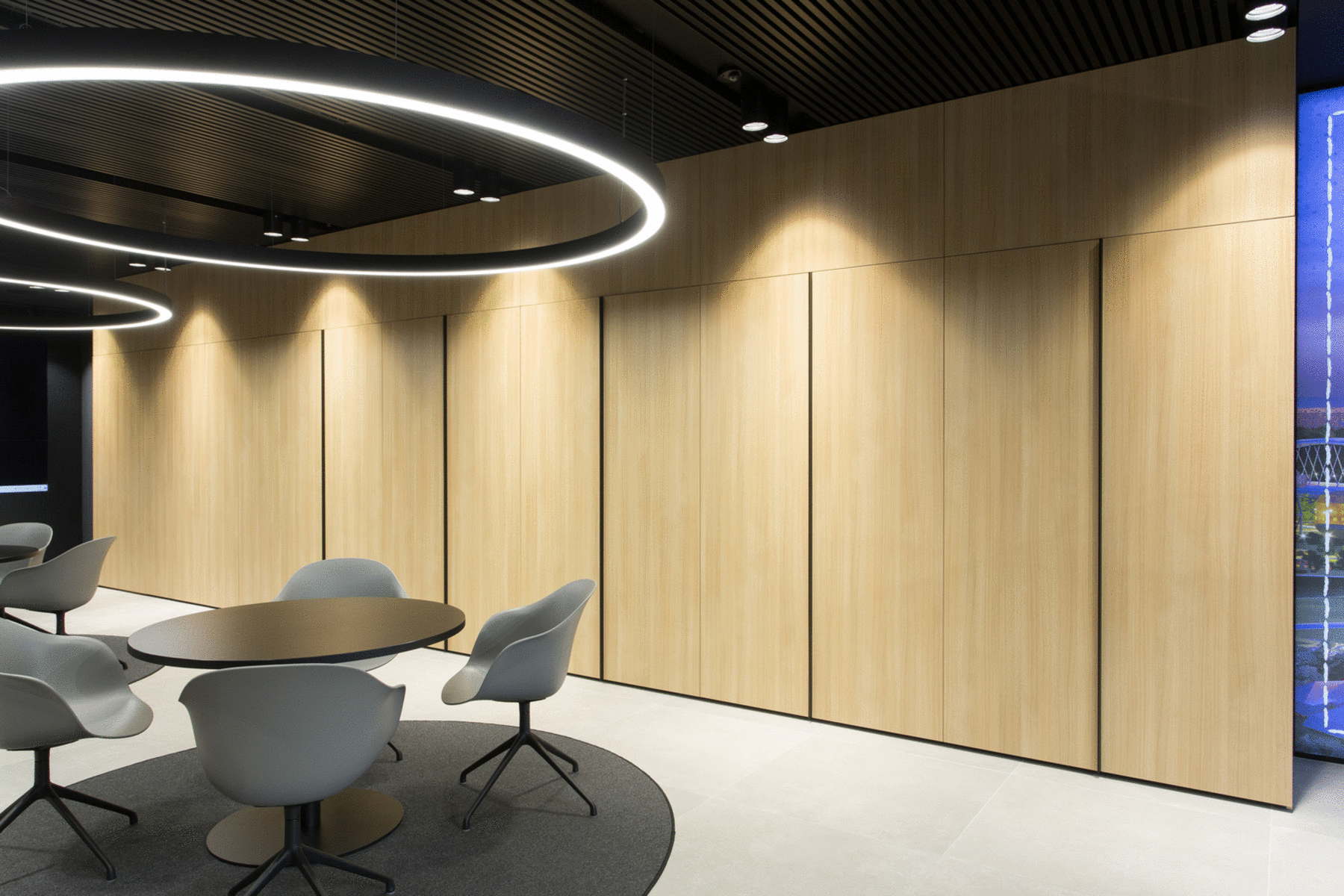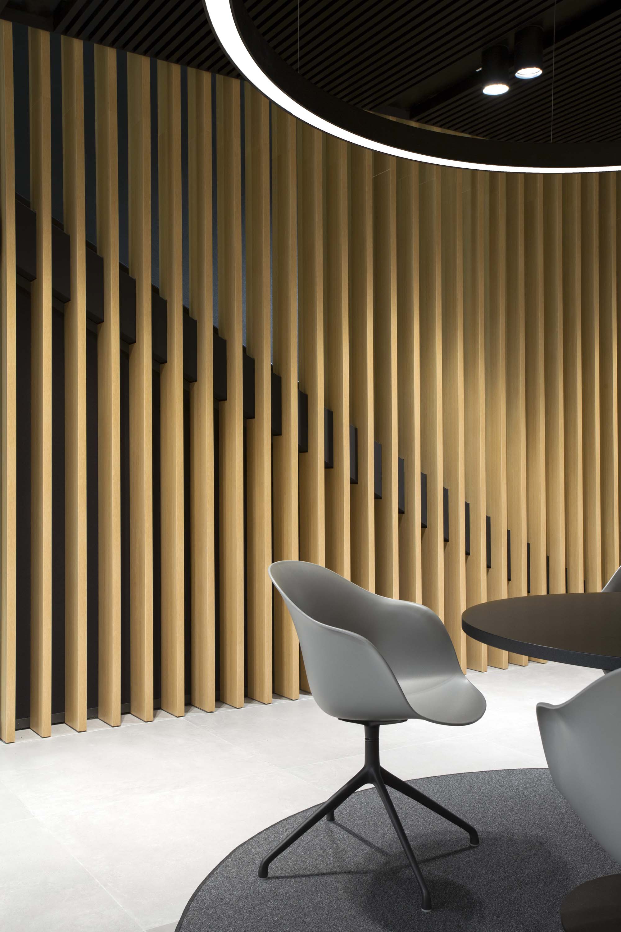 Priestorové ohraničenie je tvorené stenami s dubovým dekórom. Na jednej strane je skriňa s variabilným systémom prezentácie vzoriek. Tá sa dá otvoriť na šírku takmer šesť metrov a umožňuje formou výsuvov a drážkových panelov umiestňovať a prezentovať vzorky k aktuálnym projektom.