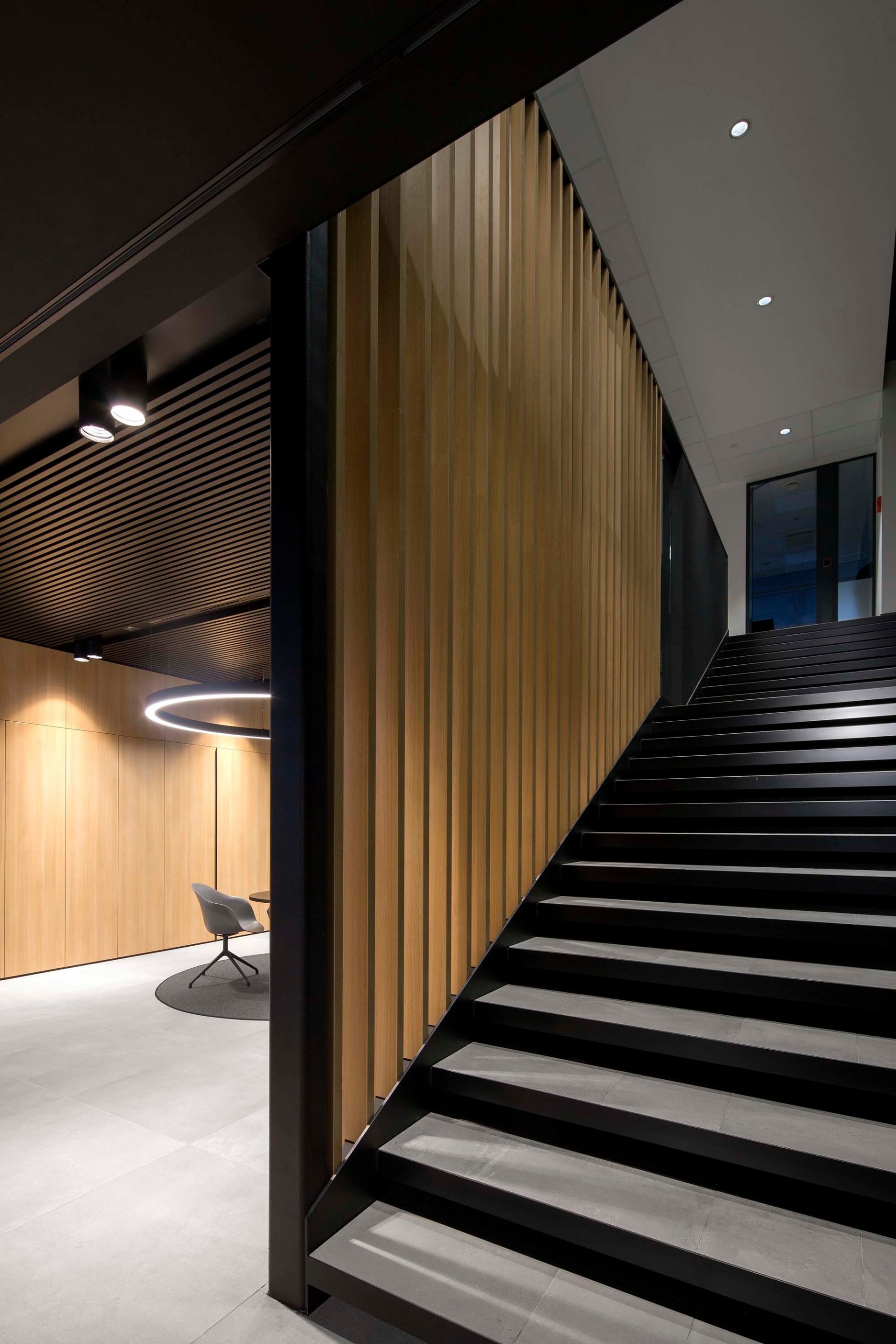 Na druhej strane je stena riešená formou lamiel, ktoré priestor ohraničujú a zároveň umožňujú vnímanie schodiska vedúceho na poschodie. Schodiskové lamely a čierna stena pokračujú na poschodie a vizuálne prepájajú priestory s prízemím.